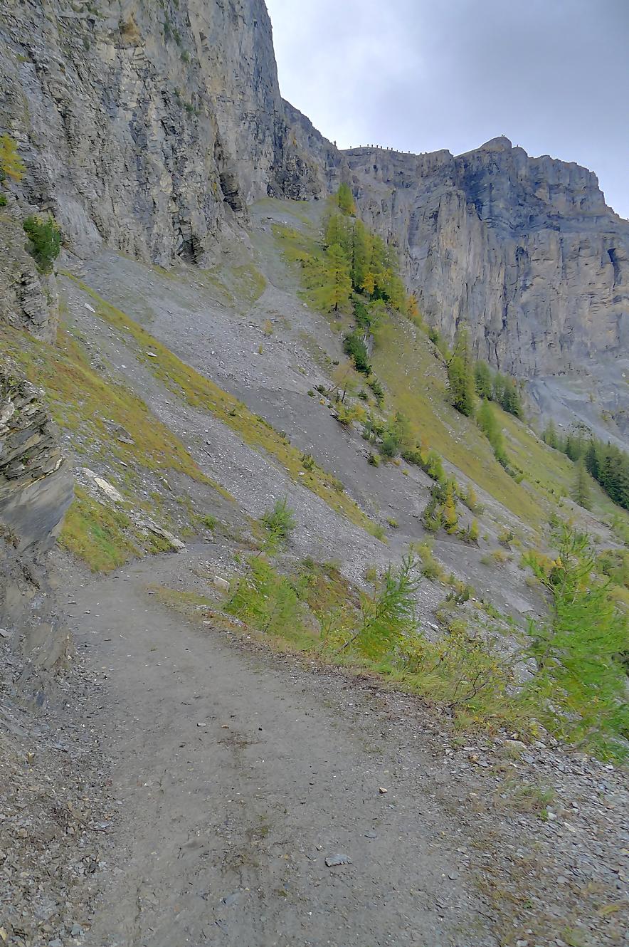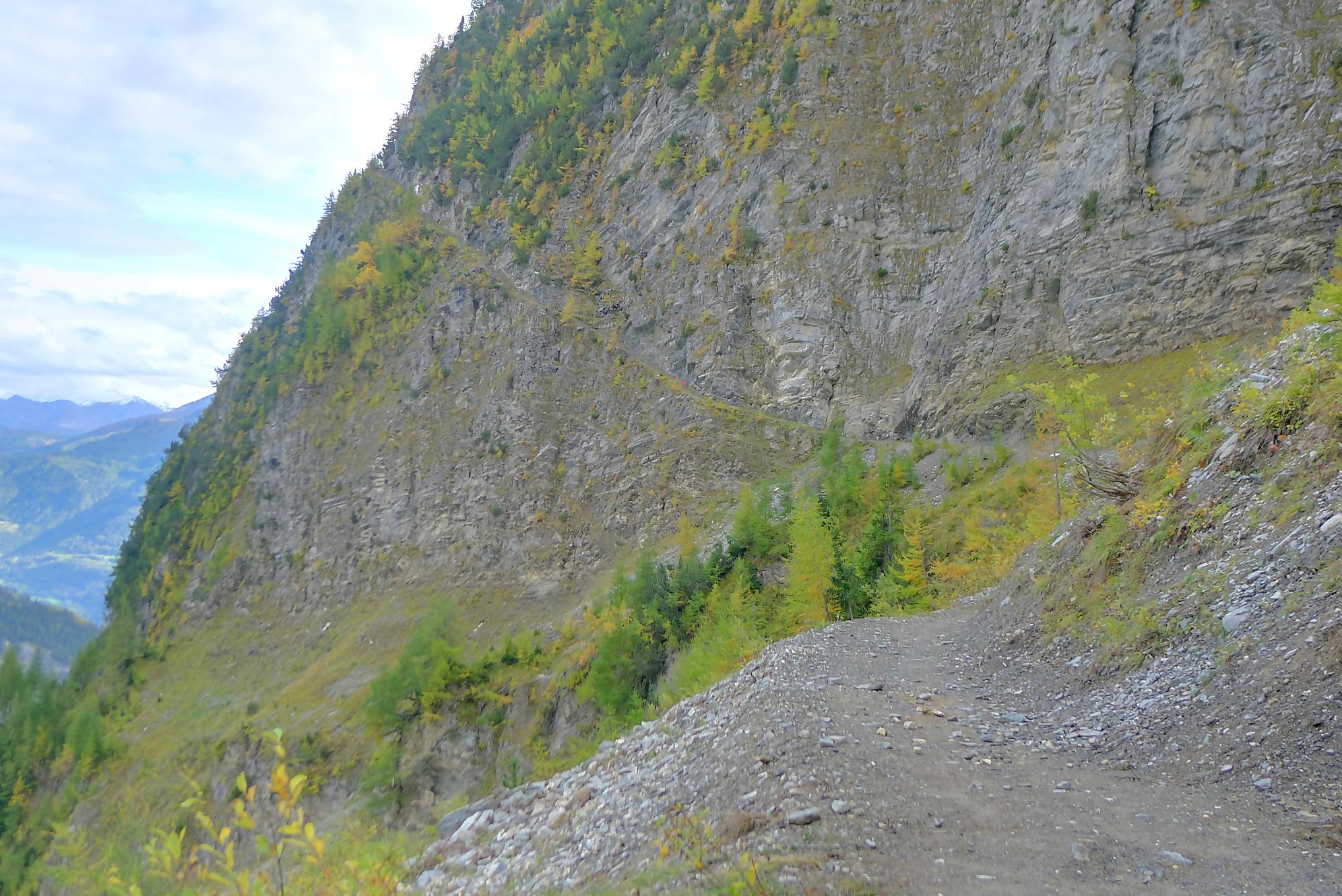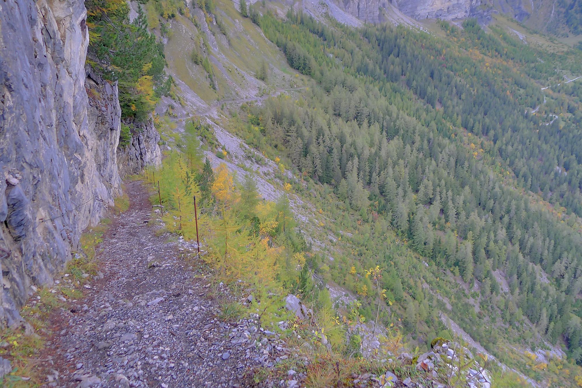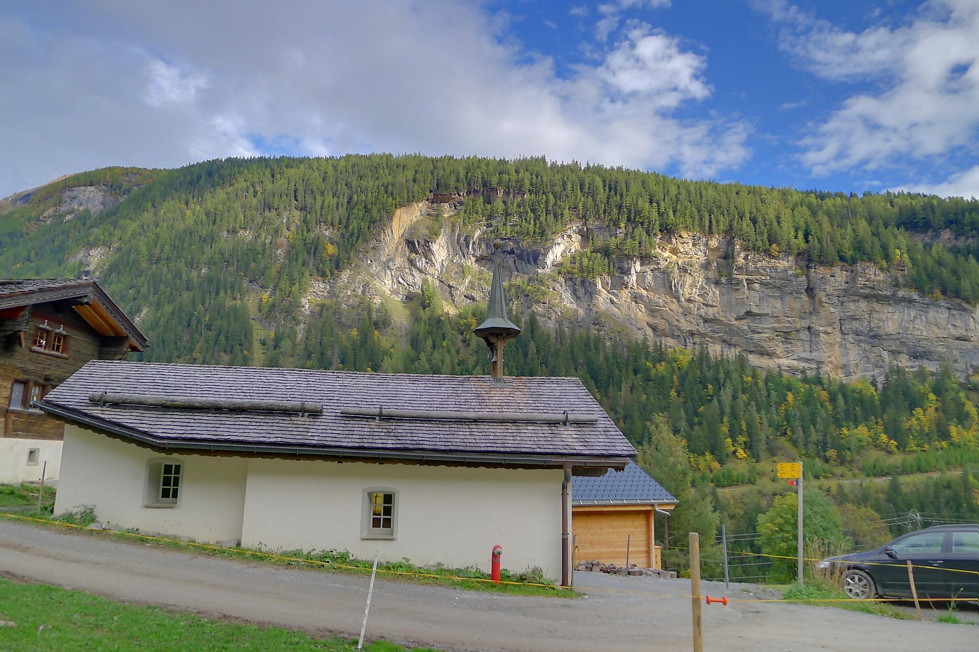Puis je reprends la route, par un chemin doux, pour Varneralp E, Plammis. Joli parcours dominant une petite falaise et après Plammis descente pentue jusqu’à Pfarschong (~1800m) et son joli chalet. Au-dessus, visite de la chapelle de Chäller (St. Théodule-Kapelle). Après un passage en forêt, mon coeur a chaviré en voyant le chemin arraché à la falaise de Chällerflue : quel fin de parcours magnifique ! C’est un passage assez pentu, presque aérien (le chemin doit faire 2.50m de large), sécurisé par un vieux filin et à droite par … rien du tout ! Exceptionnel ! Par temps de pluie, l’ambiance doit être moins drôle car il y a bien du rocher ! Au fond Leukerbad en vue.