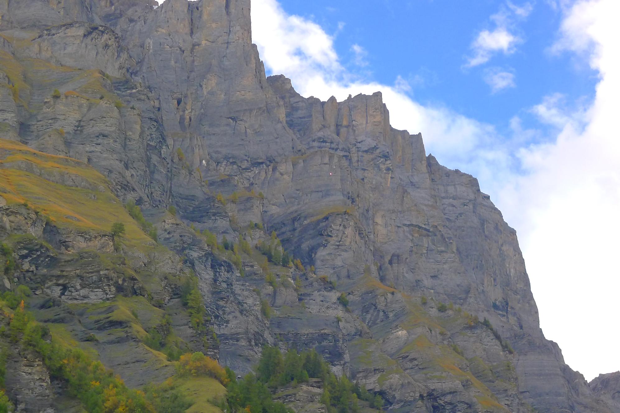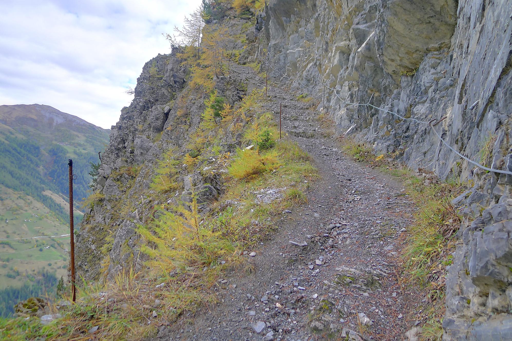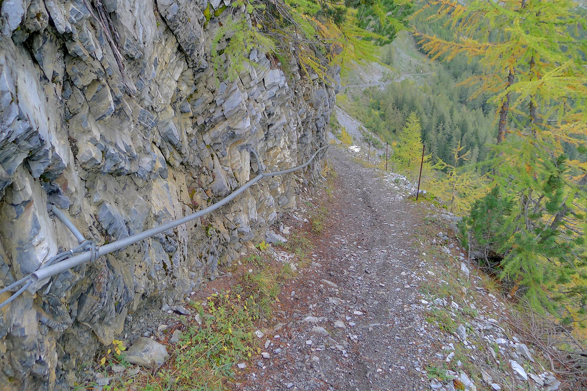 Puis je reprends la route, par un chemin doux, pour Varneralp E, Plammis. Joli parcours dominant une petite falaise et après Plammis descente pentue jusqu’à Pfarschong (~1800m) et son joli chalet. Au-dessus, visite de la chapelle de Chäller (St. Théodule-Kapelle). Après un passage en forêt, mon coeur a chaviré en voyant le chemin arraché à la falaise de Chällerflue : quel fin de parcours magnifique ! C’est un passage assez pentu, presque aérien (le chemin doit faire 2.50m de large), sécurisé par un vieux filin et à droite par … rien du tout ! Exceptionnel ! Par temps de pluie, l’ambiance doit être moins drôle car il y a bien du rocher ! Au fond Leukerbad en vue.
