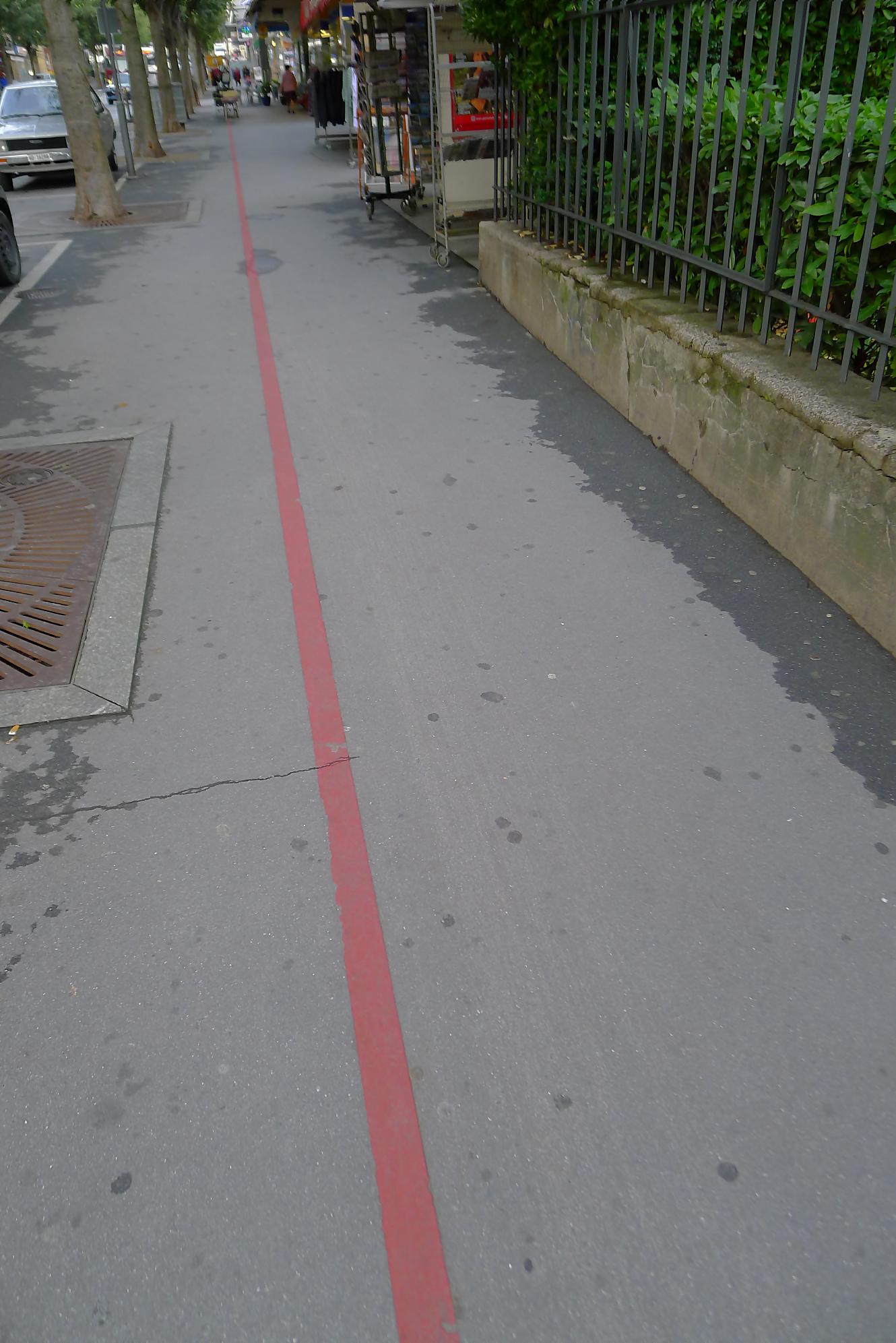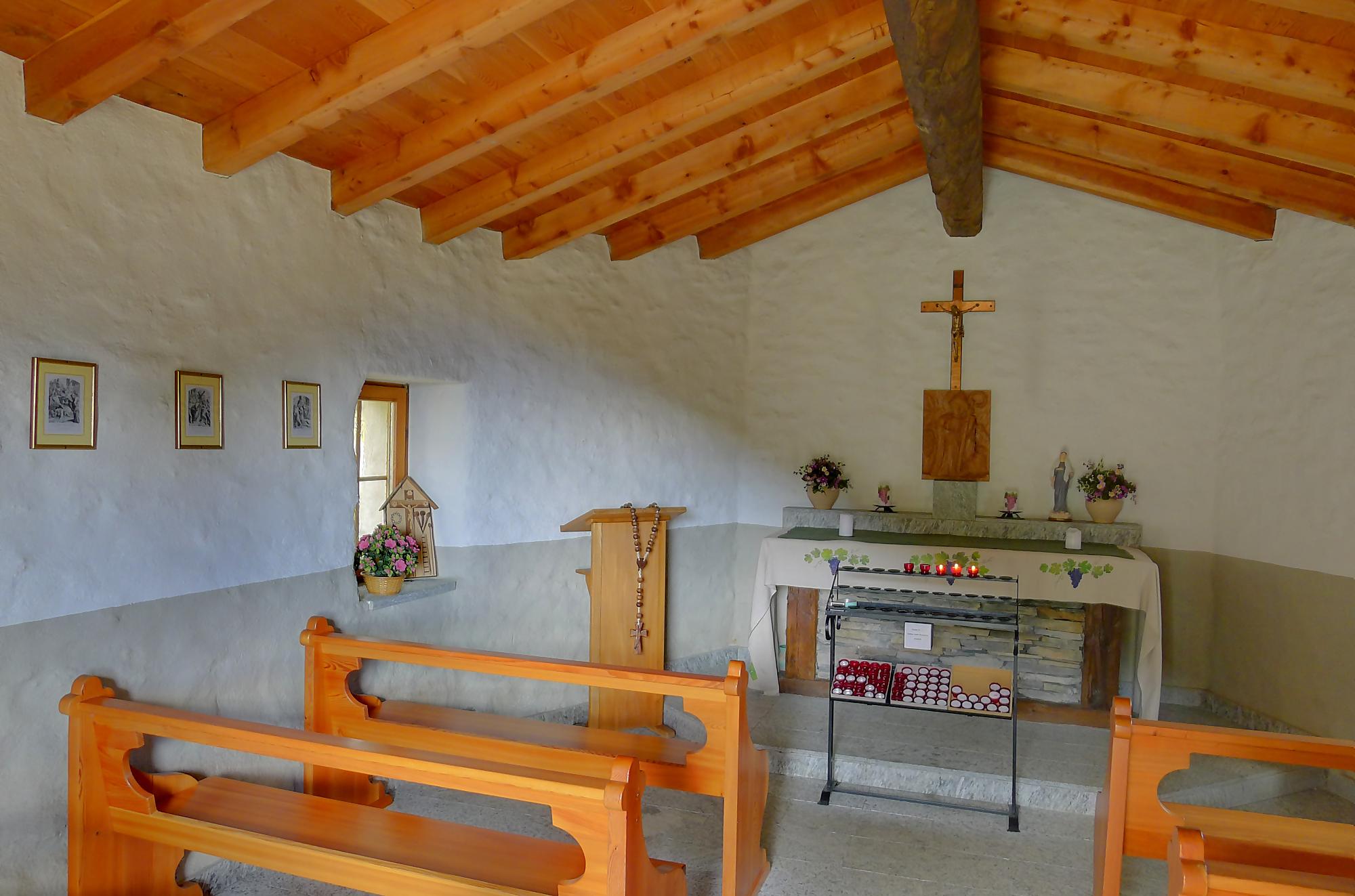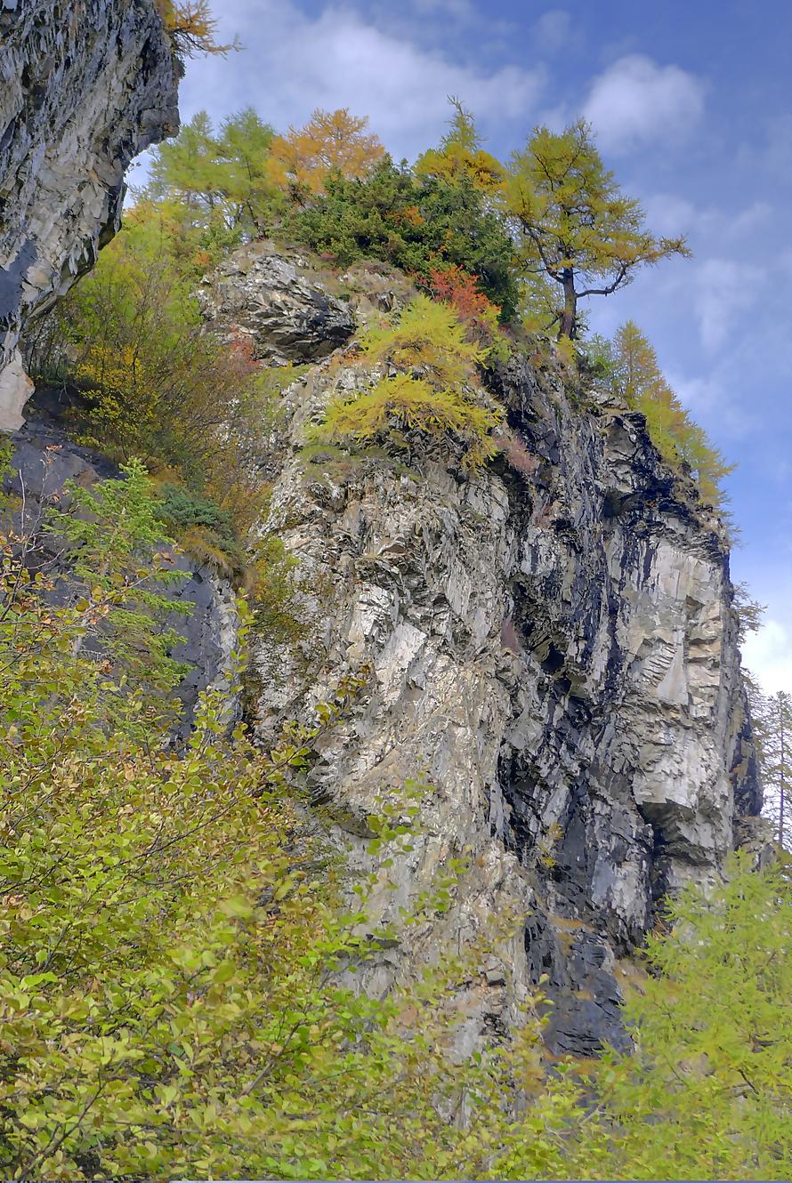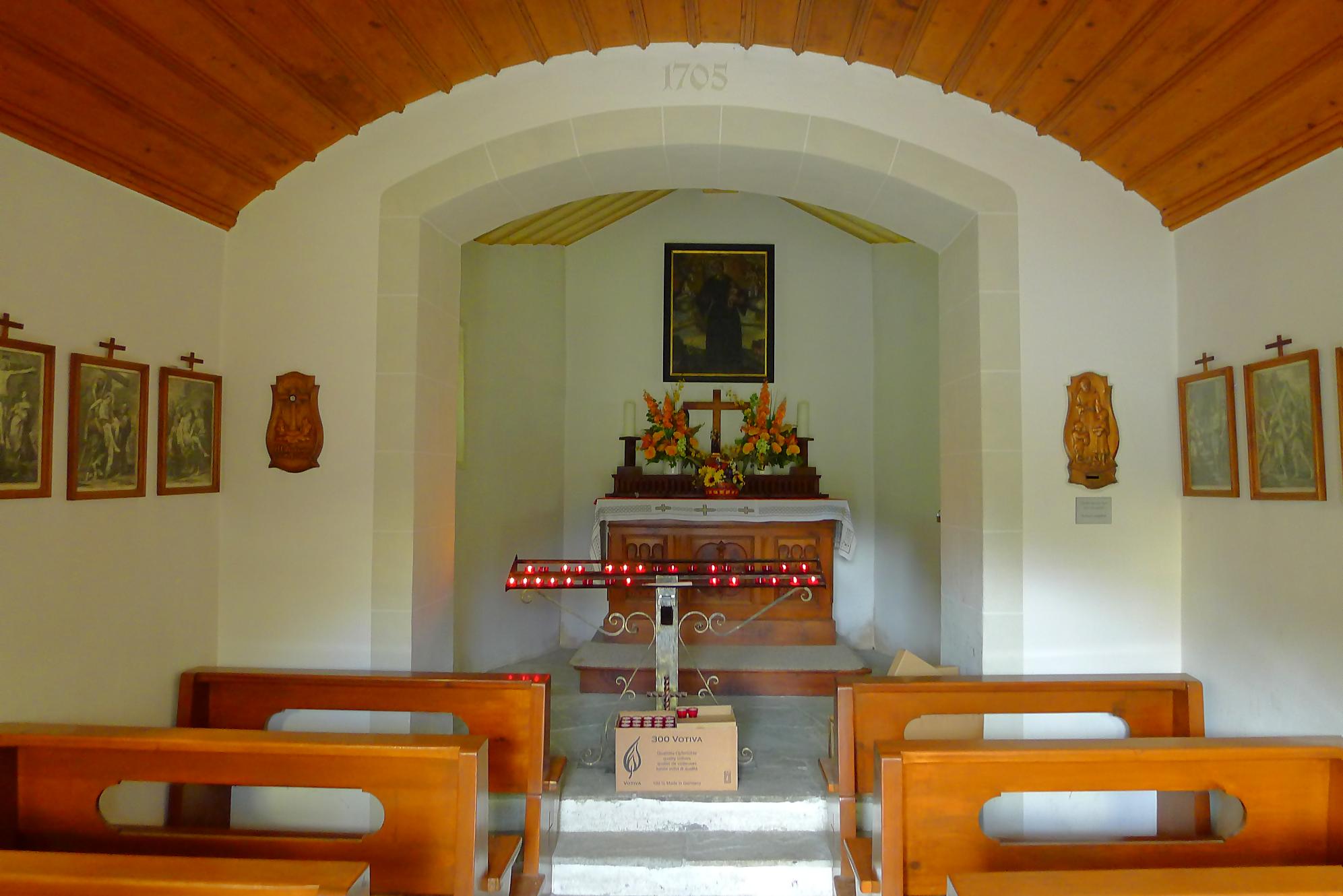 Puis je reprends la route, par un chemin doux, pour Varneralp E, Plammis. Joli parcours dominant une petite falaise et après Plammis descente pentue jusqu’à Pfarschong (~1800m) et son joli chalet. Au-dessus, visite de la chapelle de Chäller (St. Théodule-Kapelle). Après un passage en forêt, mon coeur a chaviré en voyant le chemin arraché à la falaise de Chällerflue : quel fin de parcours magnifique ! C’est un passage assez pentu, presque aérien (le chemin doit faire 2.50m de large), sécurisé par un vieux filin et à droite par … rien du tout ! Exceptionnel ! Par temps de pluie, l’ambiance doit être moins drôle car il y a bien du rocher ! Au fond Leukerbad en vue.