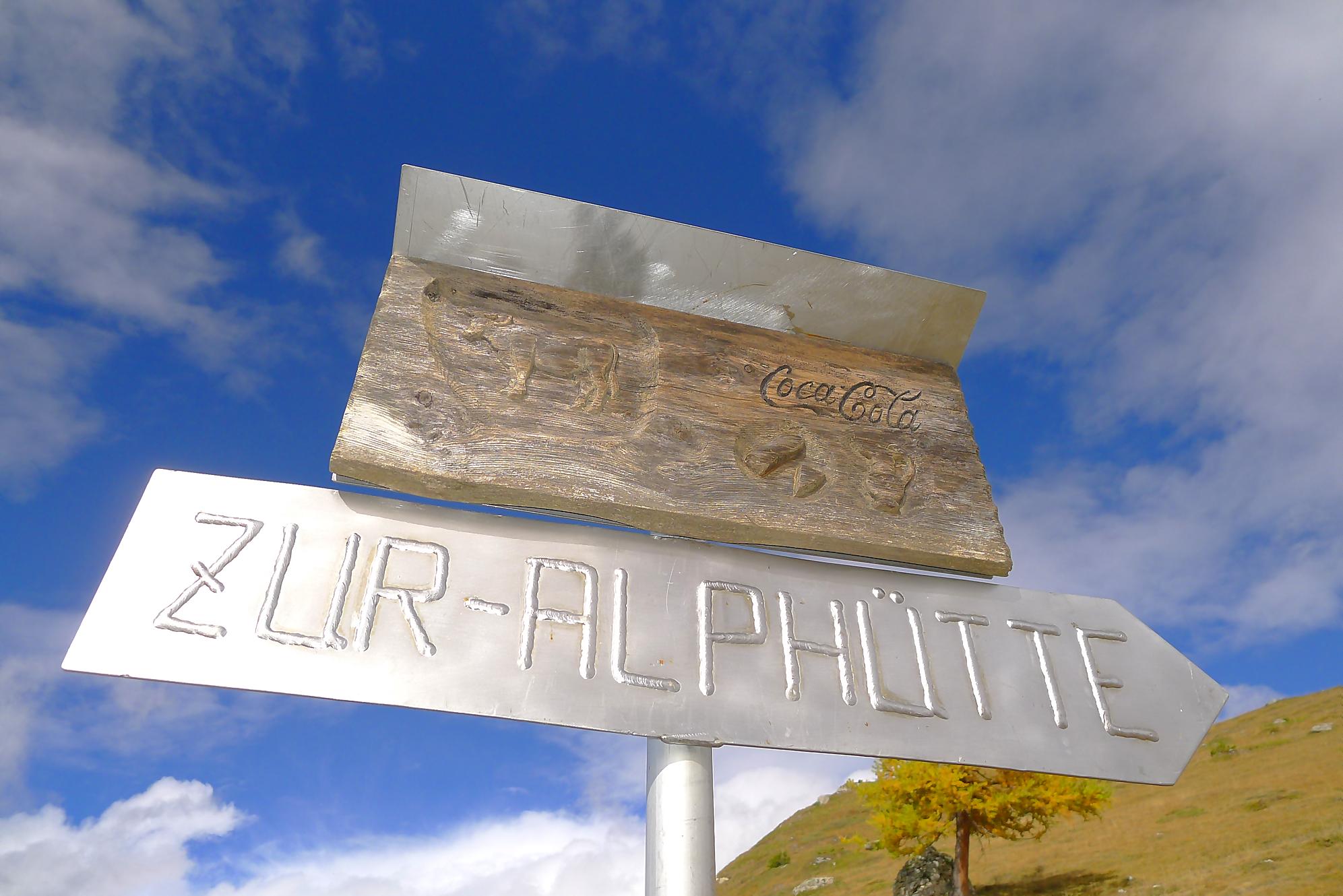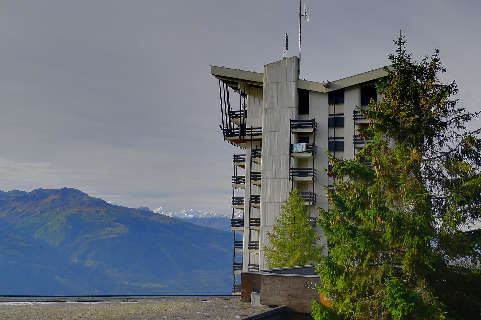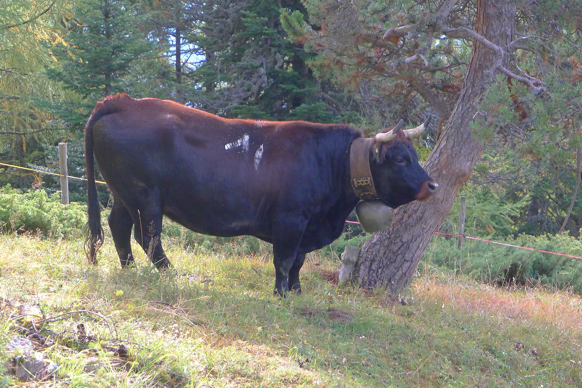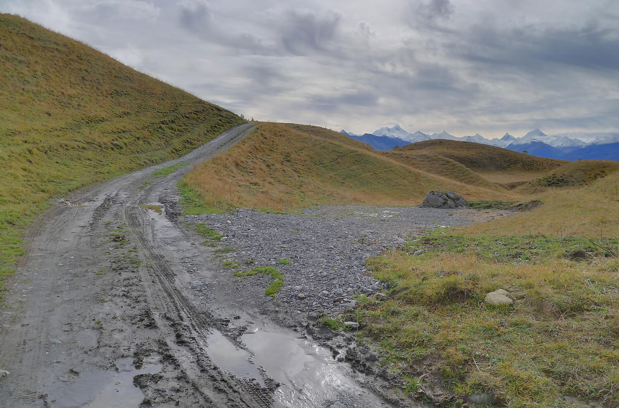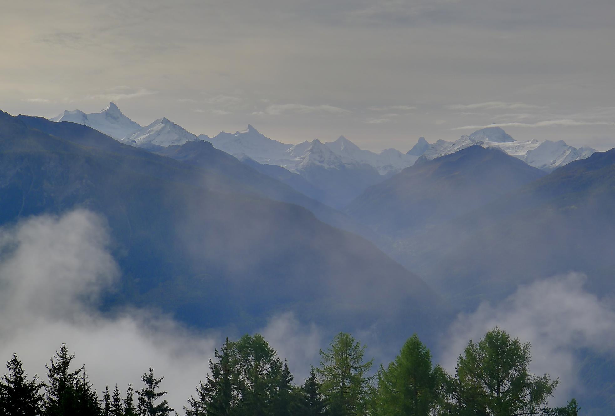Puis, par la route, je pars pour La Tièche. Section un peu monotone où il faut se pousser pour laisser passer ces valaisans pressés en voiture, seul divertissement le restaurant à 1600m (Café de la Cure) qui offre un joli panorama. Au Pt1640, on emprunte un chemin pédestre qui coupe la route (et les pâturages !) et file vers la ferme/buvette de Cave du Sex (1878m). La vue est superbe et les 4000m valaisans s’offrent à nos yeux (Bisshorn, Weisshorn, Cervin, Dent Blanche, …). Des voiles nuageux (altostratus) rendent le ciel gris-blanc, mais les sommets restent visibles. Dans l’après-midi, le ciel s’éclaircira, mais les cumulus s’agripperont aux sommets, les bougres !