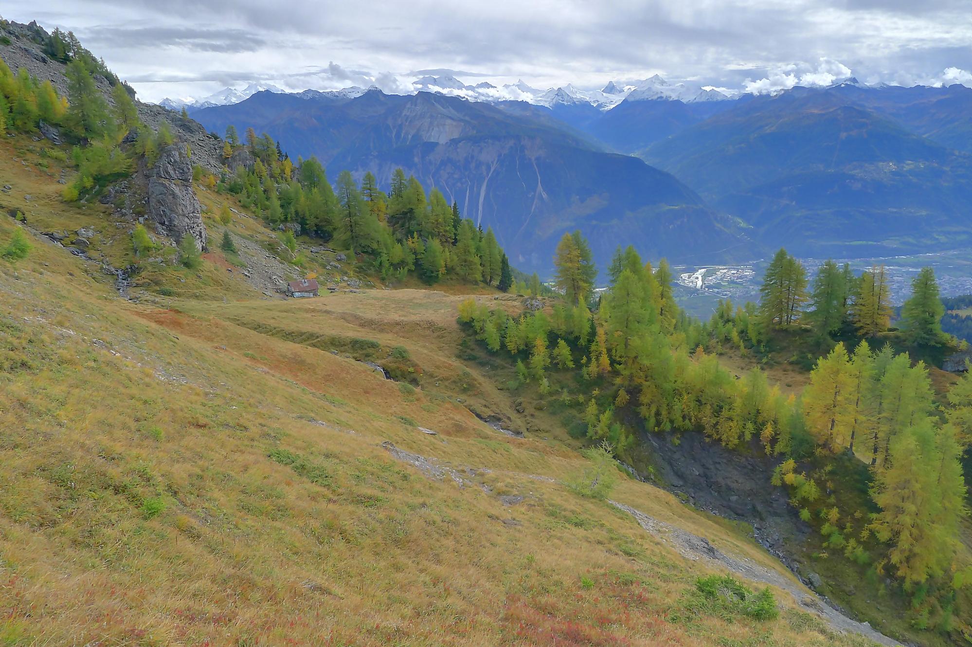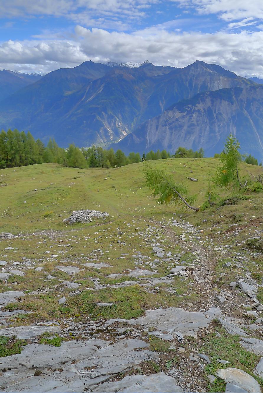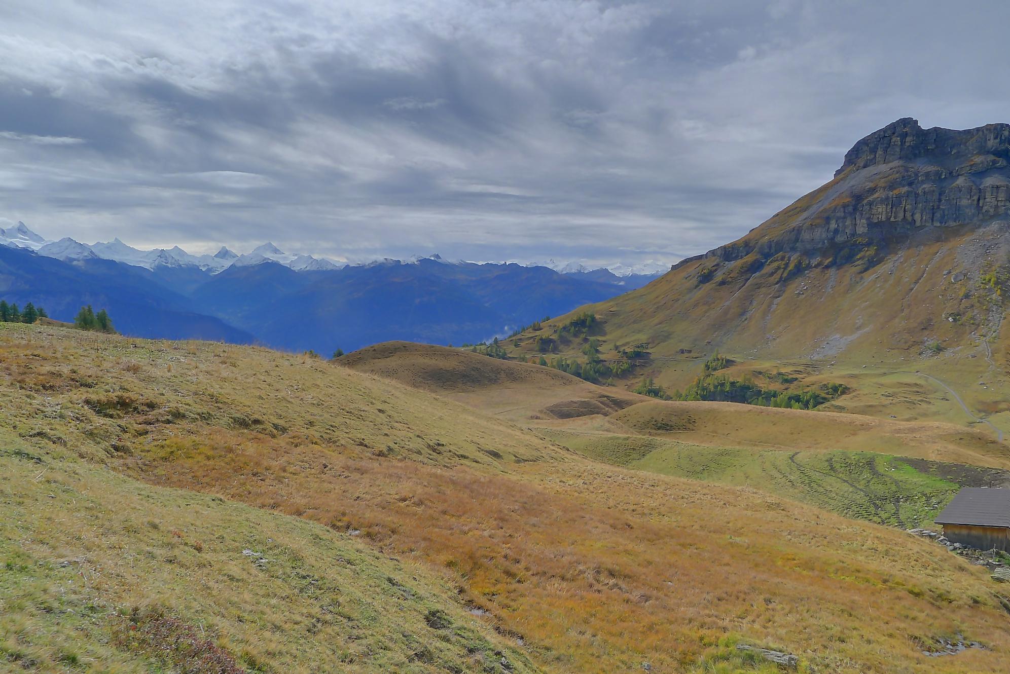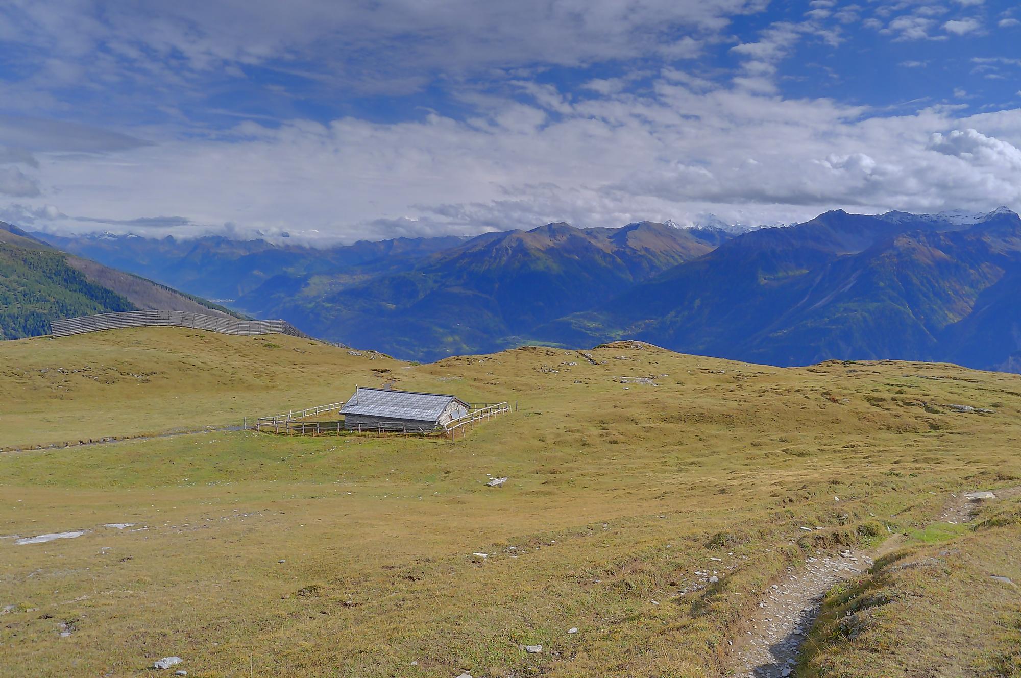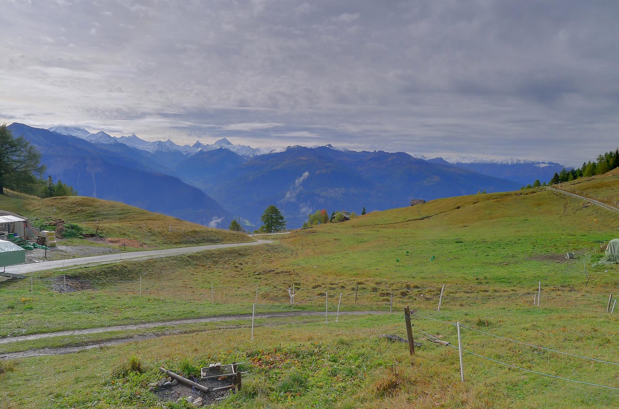 Avec un certain bonheur, j’arrive sur le plat où se trouve la ruine de Roti Hittu. Peu après je rejoins la jolie ferme de Nüschelet où un large sentier à travers la falaise permet d’arriver sur le plateau de Varneralp. C’est le plus beau secteur de la balade et Varnelalp est magnifique, la vue aussi. J’ai le soleil, mais les sommets sont prisonniers des cumulus, mais sinon le panorama ratisse large : sur la gauche le Bietschhorn, au-délà de la vallée du Rhône, le Monte Leone, toute la ribambelle des 4000m valaisans déjà cités, le Grand Combin et pour finir le Mont-Blanc en m’excusant auprès de ceux que je ne peux pas cités, la liste étant trop longue ! Je fais donc là ma pause casse-croute, en me disant qu’il faut revenir par temps dégagé !