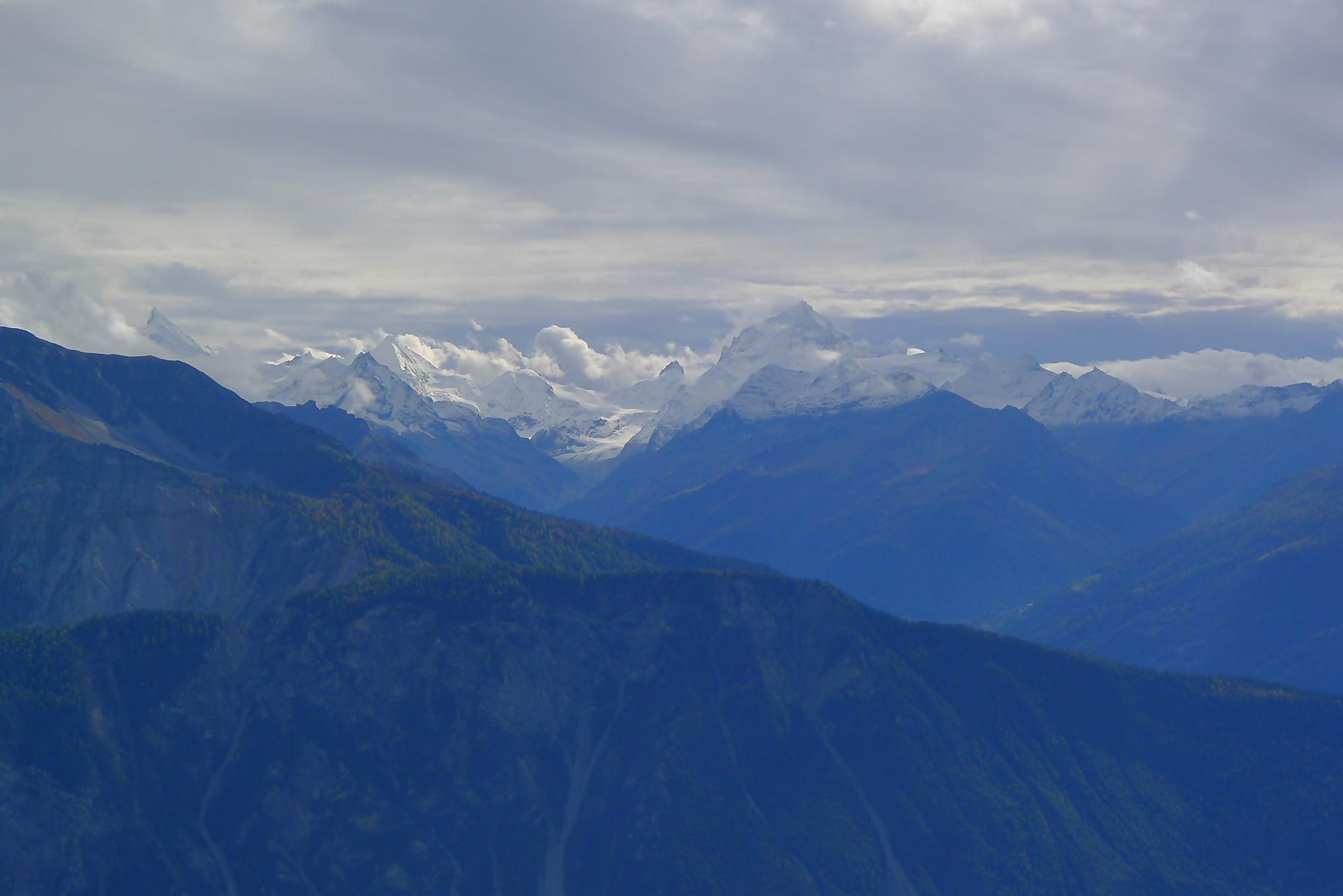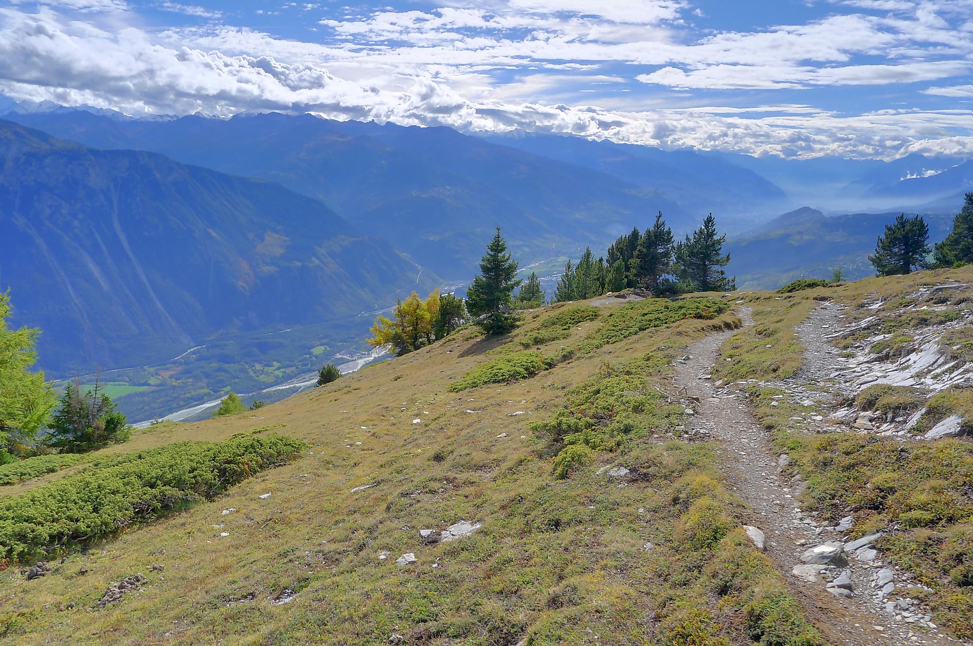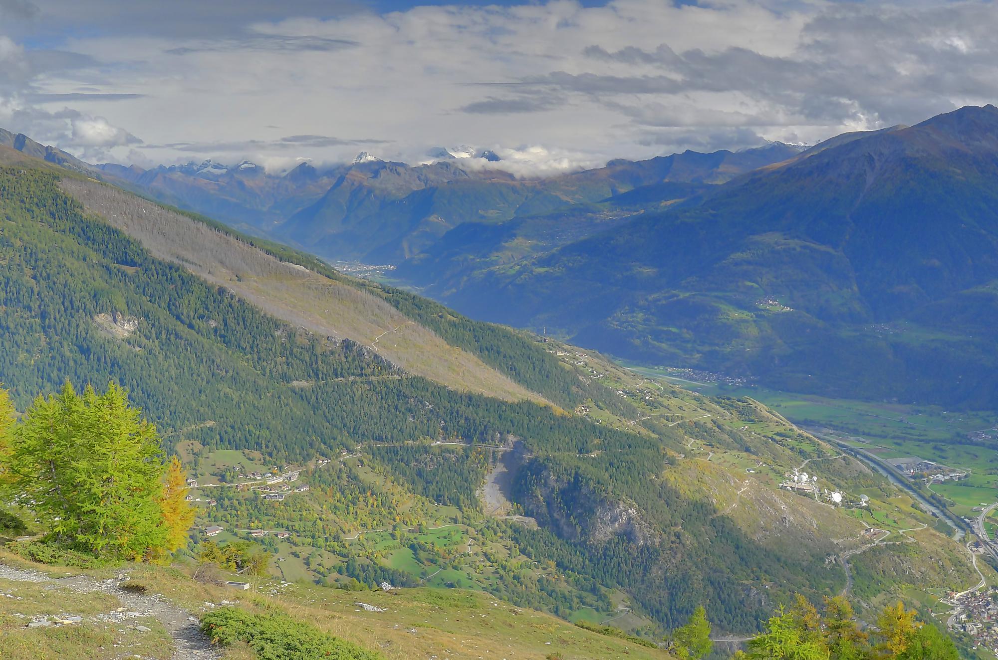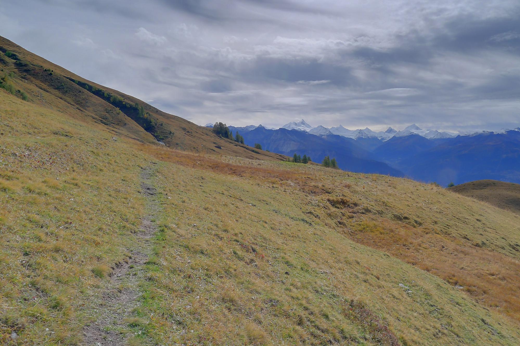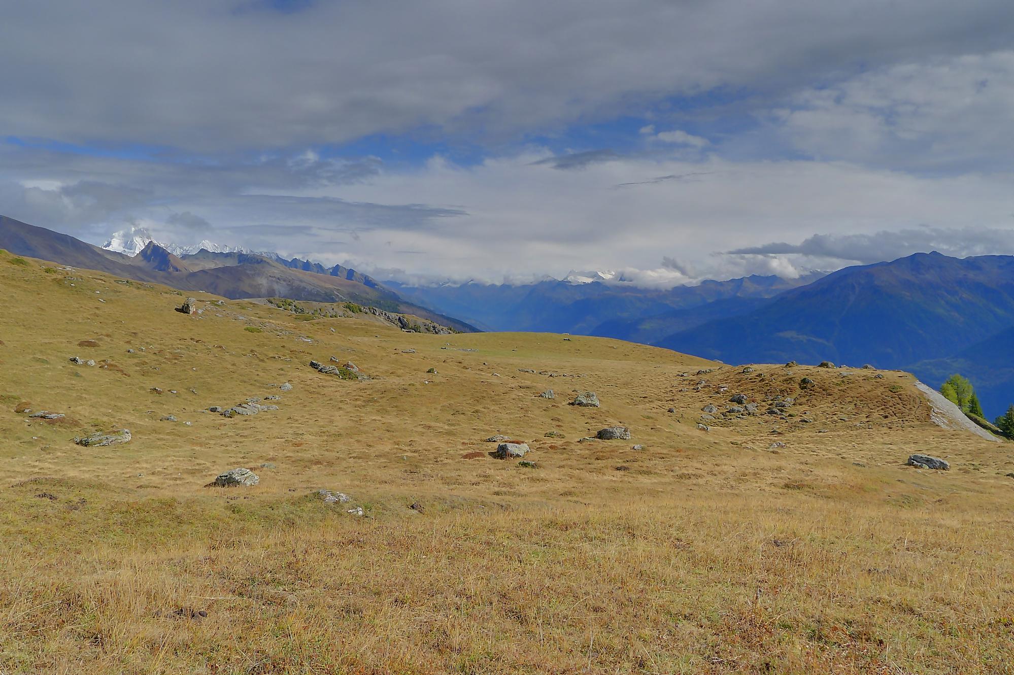 Avec un certain bonheur, j’arrive sur le plat où se trouve la ruine de Roti Hittu. Peu après je rejoins la jolie ferme de Nüschelet où un large sentier à travers la falaise permet d’arriver sur le plateau de Varneralp. C’est le plus beau secteur de la balade et Varnelalp est magnifique, la vue aussi. J’ai le soleil, mais les sommets sont prisonniers des cumulus, mais sinon le panorama ratisse large : sur la gauche le Bietschhorn, au-délà de la vallée du Rhône, le Monte Leone, toute la ribambelle des 4000m valaisans déjà cités, le Grand Combin et pour finir le Mont-Blanc en m’excusant auprès de ceux que je ne peux pas cités, la liste étant trop longue ! Je fais donc là ma pause casse-croute, en me disant qu’il faut revenir par temps dégagé !