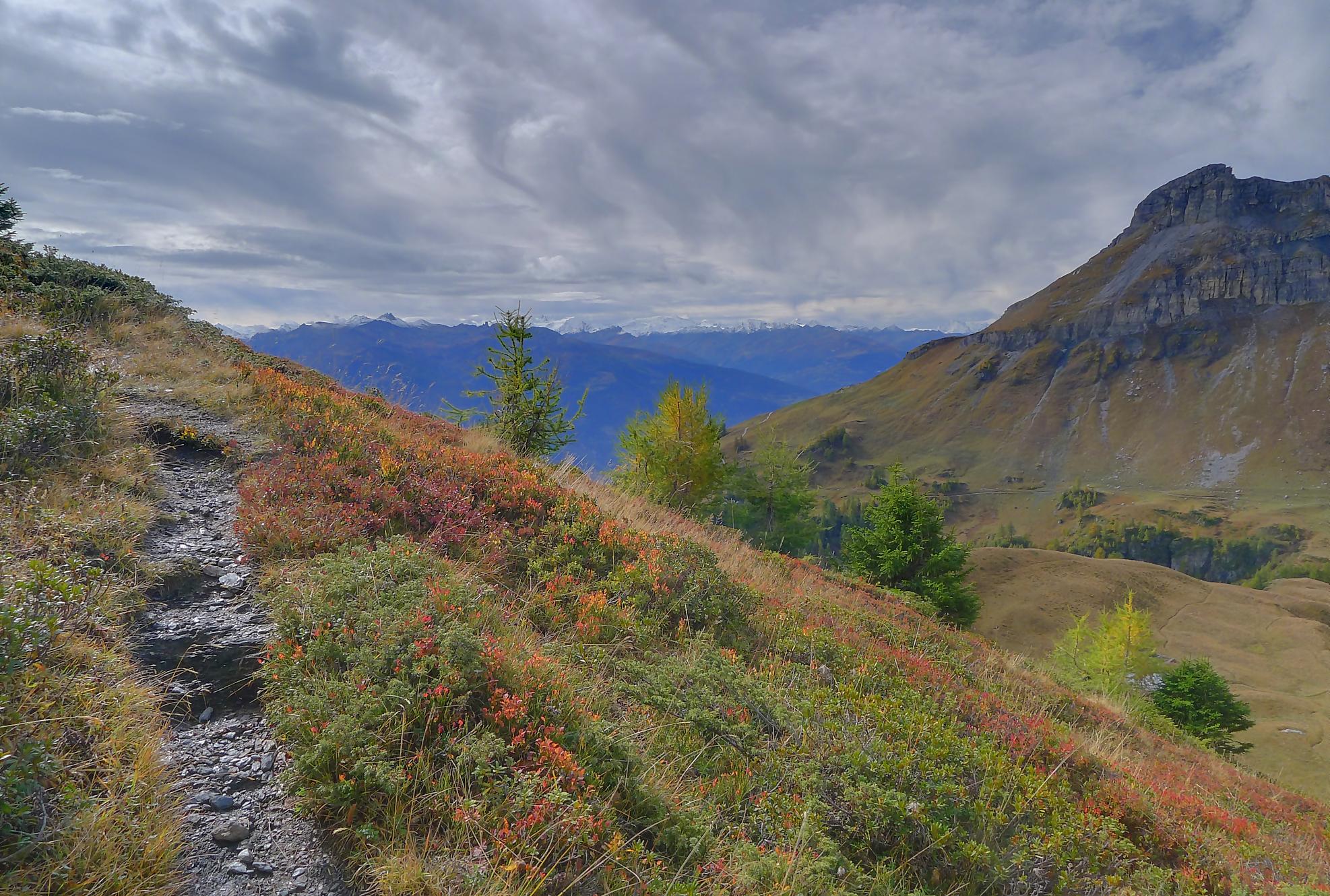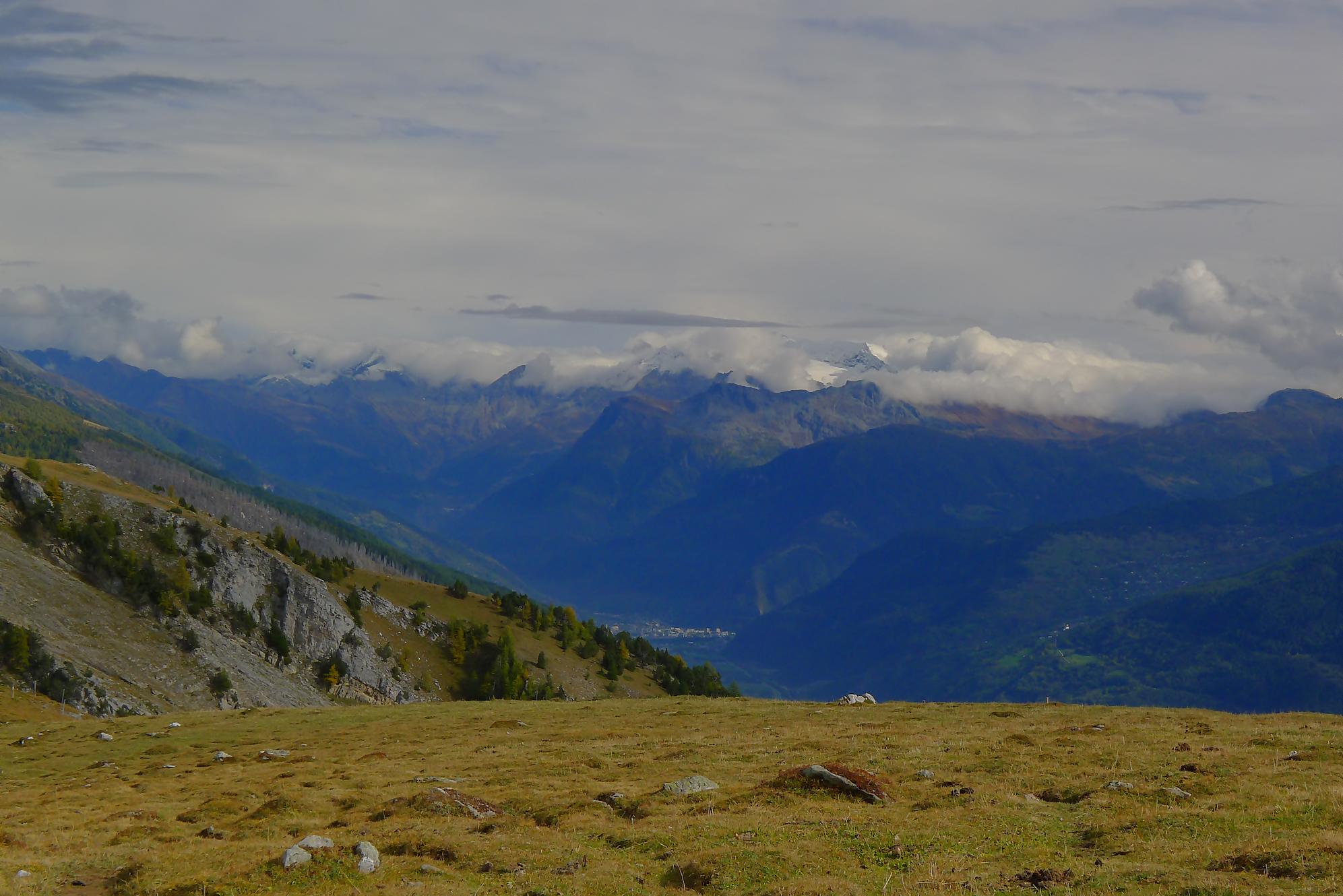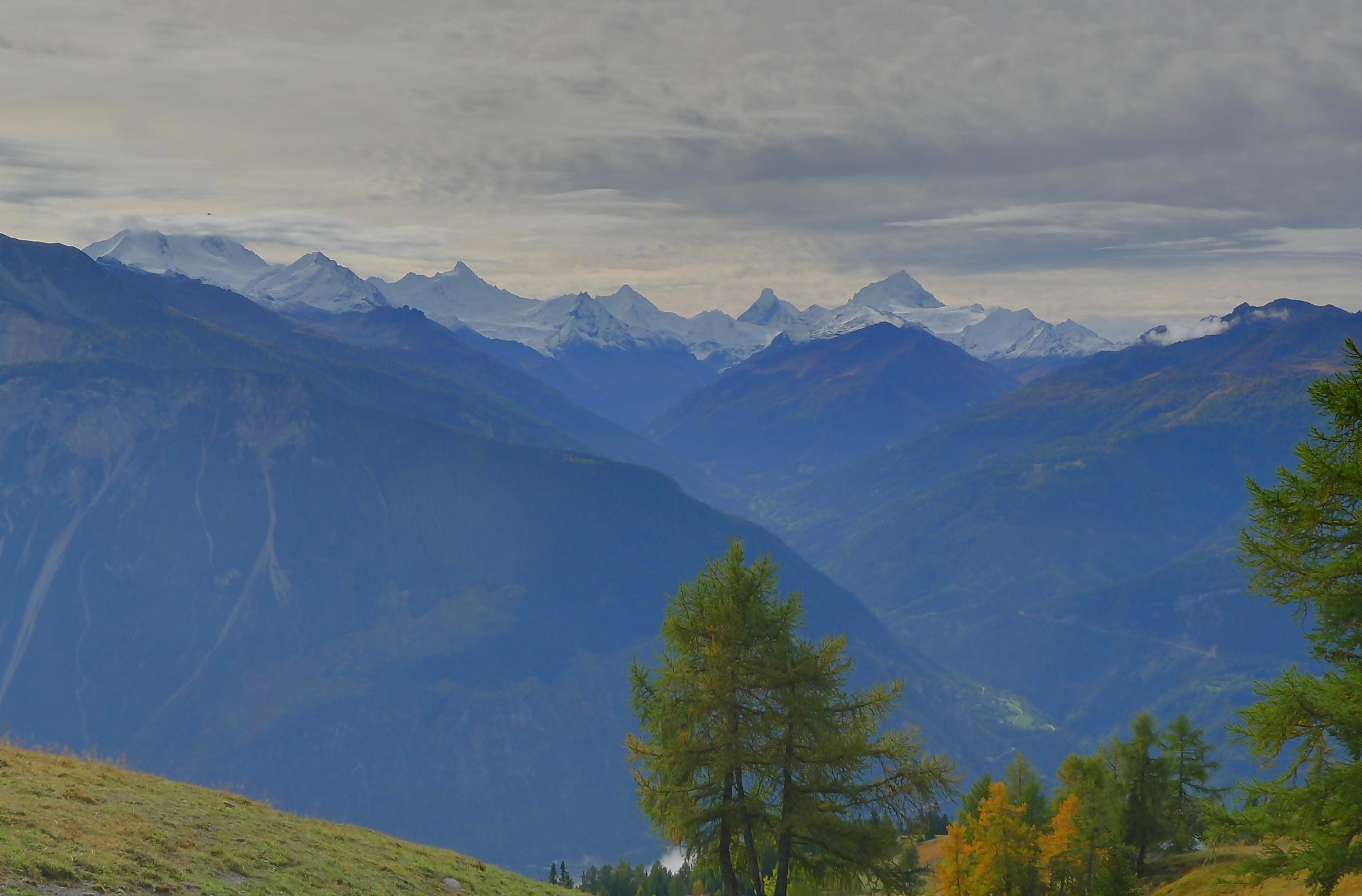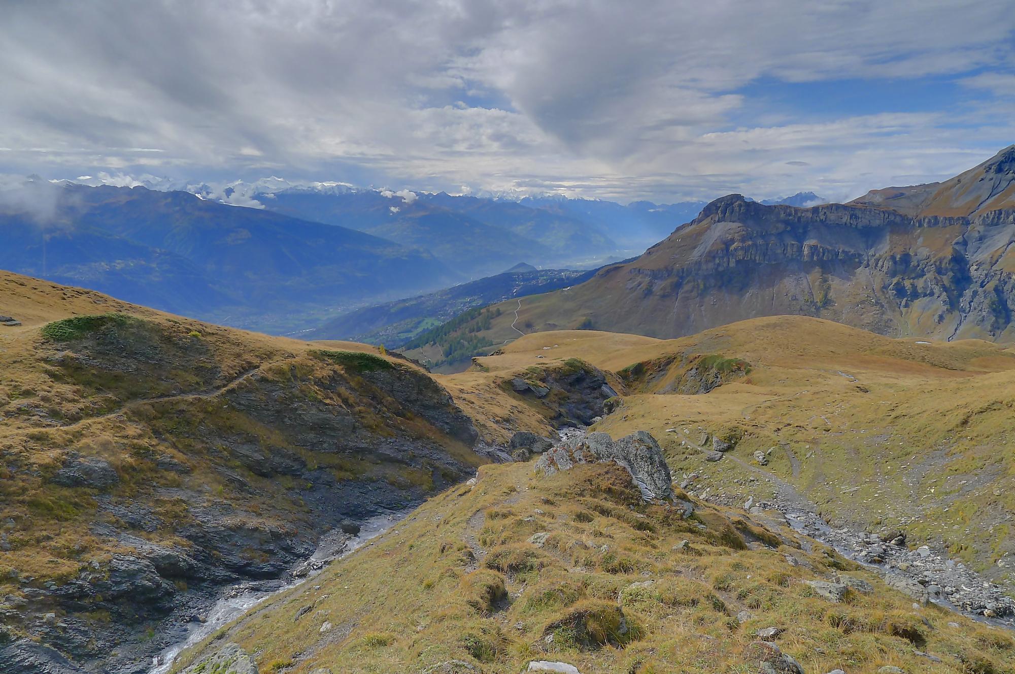 Avec un certain bonheur, j’arrive sur le plat où se trouve la ruine de Roti Hittu. Peu après je rejoins la jolie ferme de Nüschelet où un large sentier à travers la falaise permet d’arriver sur le plateau de Varneralp. C’est le plus beau secteur de la balade et Varnelalp est magnifique, la vue aussi. J’ai le soleil, mais les sommets sont prisonniers des cumulus, mais sinon le panorama ratisse large : sur la gauche le Bietschhorn, au-délà de la vallée du Rhône, le Monte Leone, toute la ribambelle des 4000m valaisans déjà cités, le Grand Combin et pour finir le Mont-Blanc en m’excusant auprès de ceux que je ne peux pas cités, la liste étant trop longue ! Je fais donc là ma pause casse-croute, en me disant qu’il faut revenir par temps dégagé !
