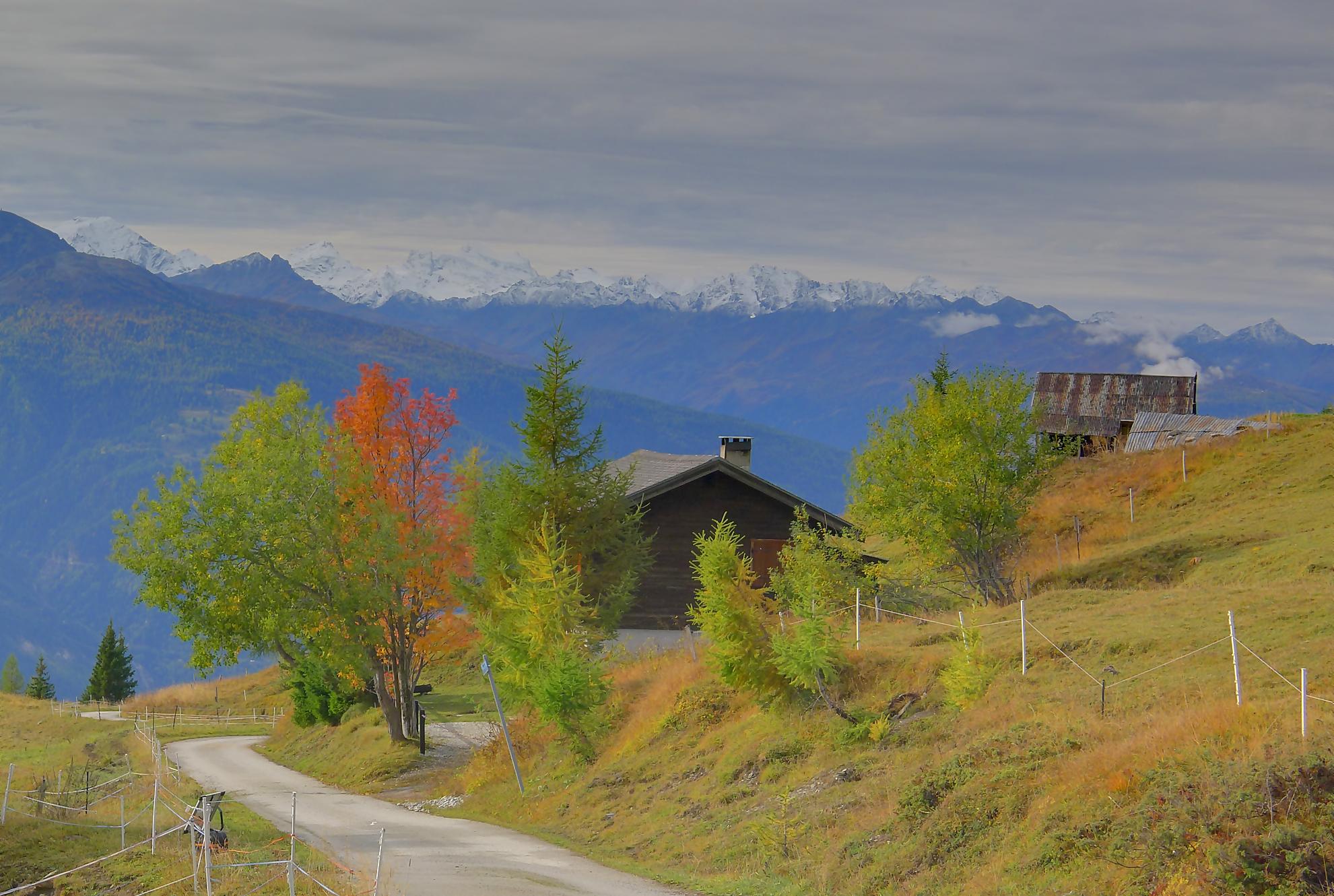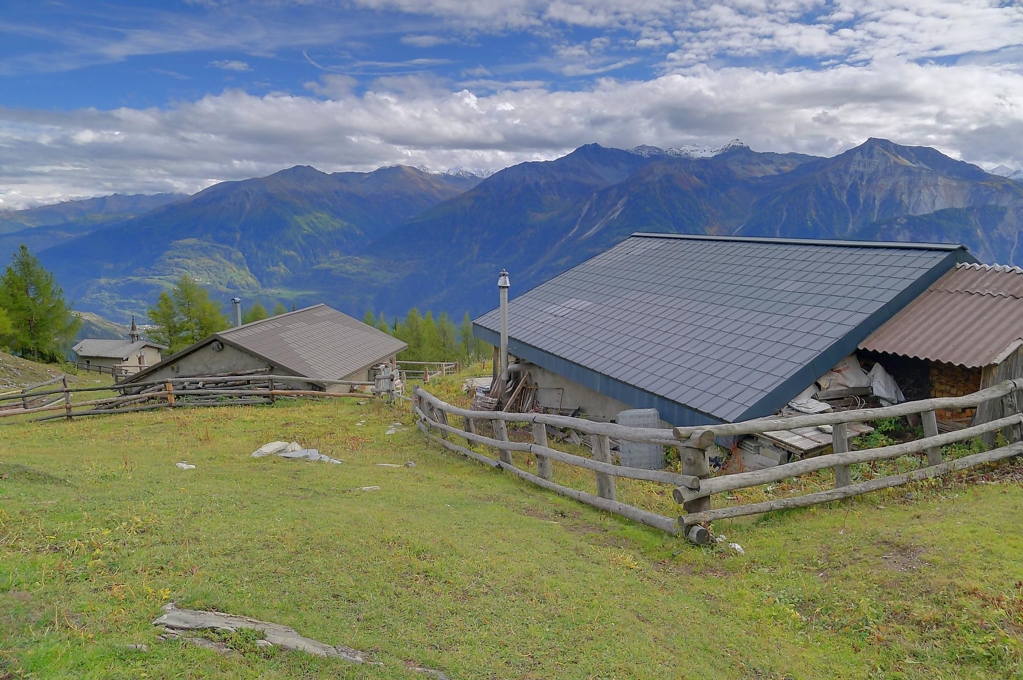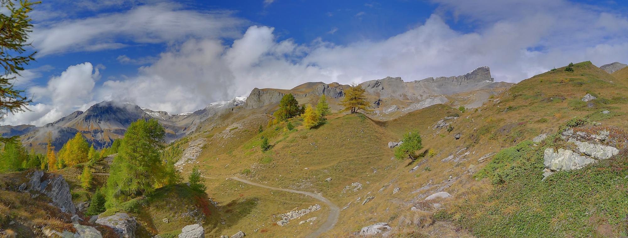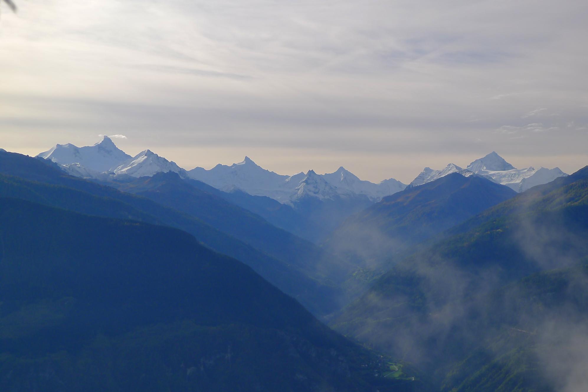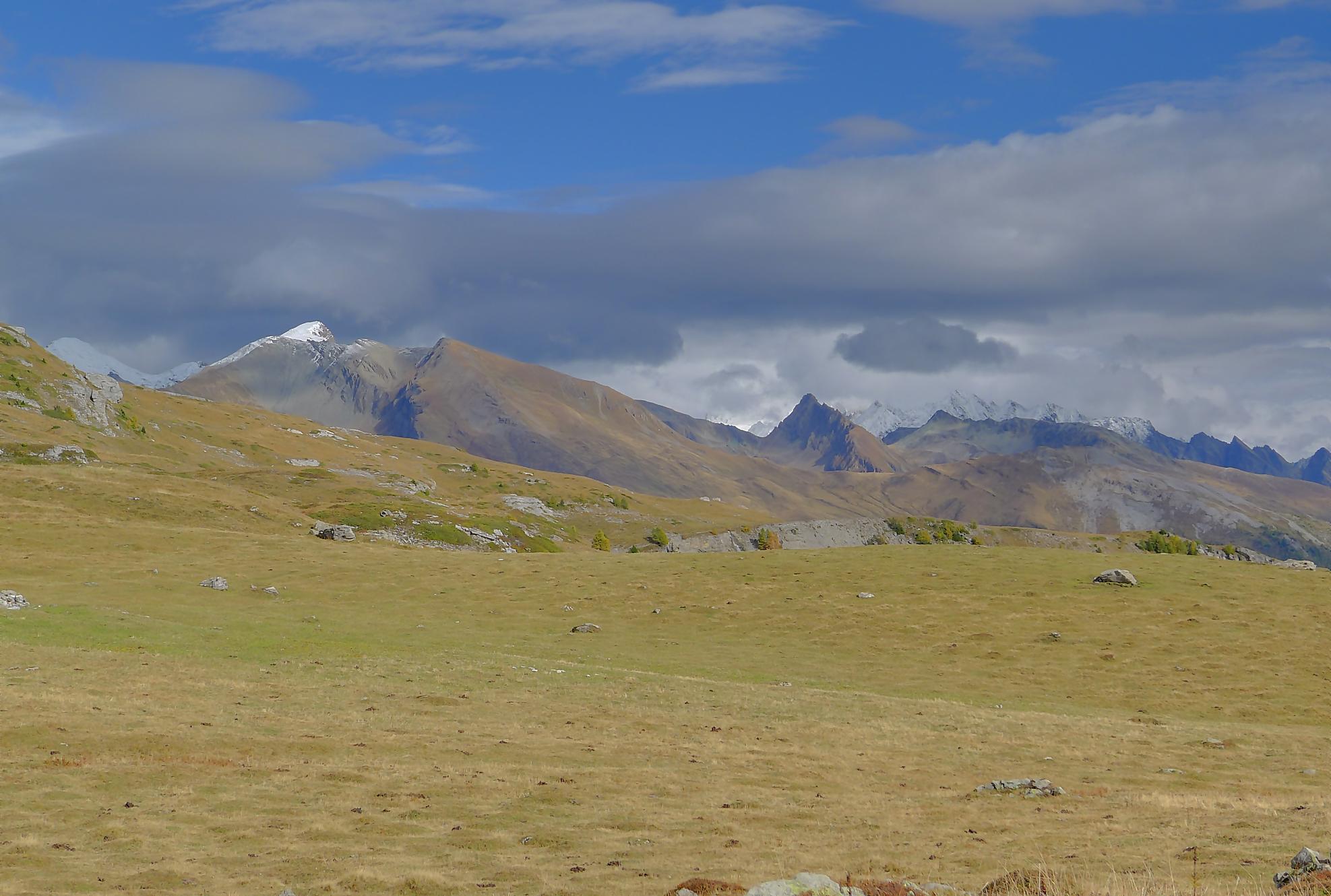 Avec un certain bonheur, j’arrive sur le plat où se trouve la ruine de Roti Hittu. Peu après je rejoins la jolie ferme de Nüschelet où un large sentier à travers la falaise permet d’arriver sur le plateau de Varneralp. C’est le plus beau secteur de la balade et Varnelalp est magnifique, la vue aussi. J’ai le soleil, mais les sommets sont prisonniers des cumulus, mais sinon le panorama ratisse large : sur la gauche le Bietschhorn, au-délà de la vallée du Rhône, le Monte Leone, toute la ribambelle des 4000m valaisans déjà cités, le Grand Combin et pour finir le Mont-Blanc en m’excusant auprès de ceux que je ne peux pas cités, la liste étant trop longue ! Je fais donc là ma pause casse-croute, en me disant qu’il faut revenir par temps dégagé !