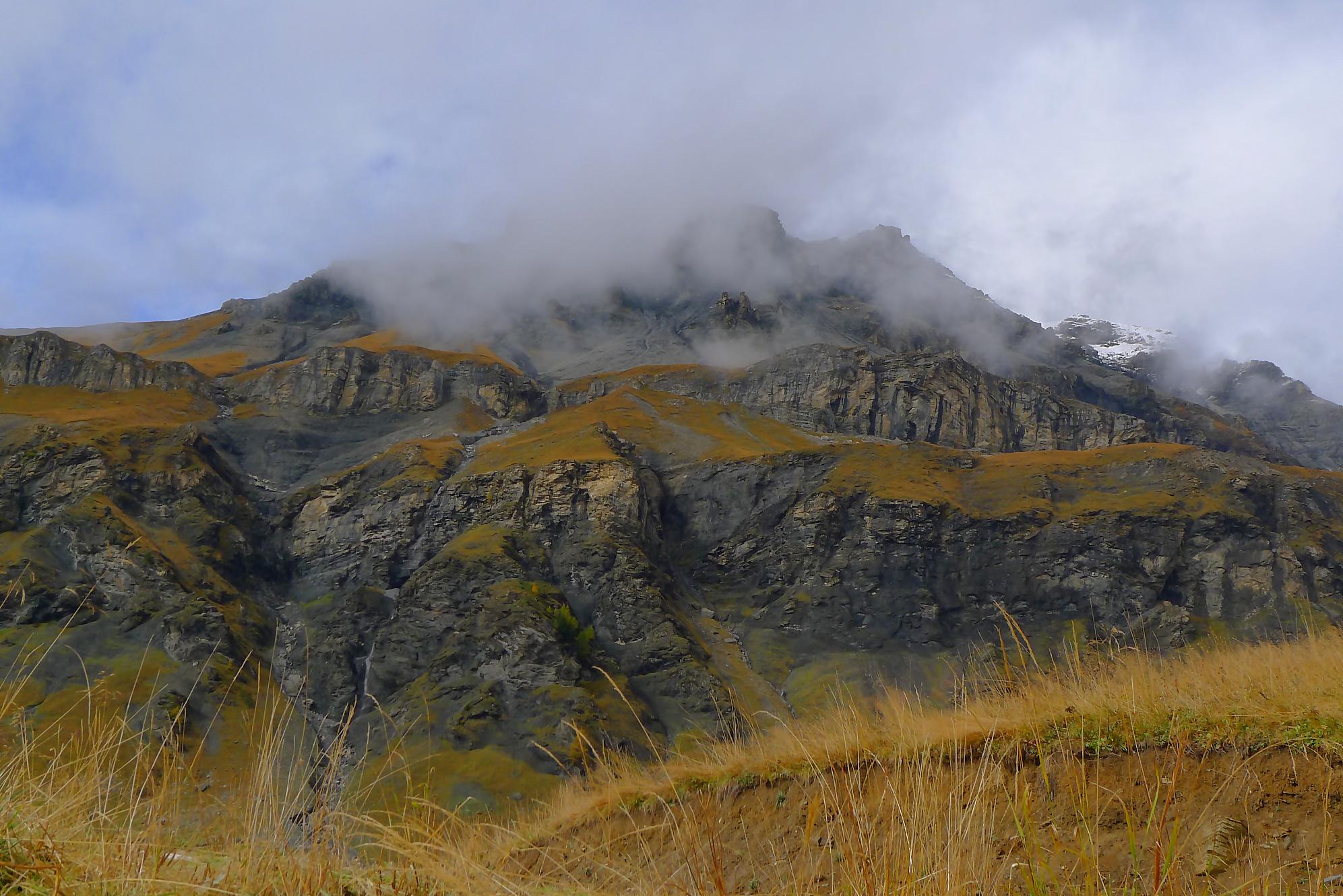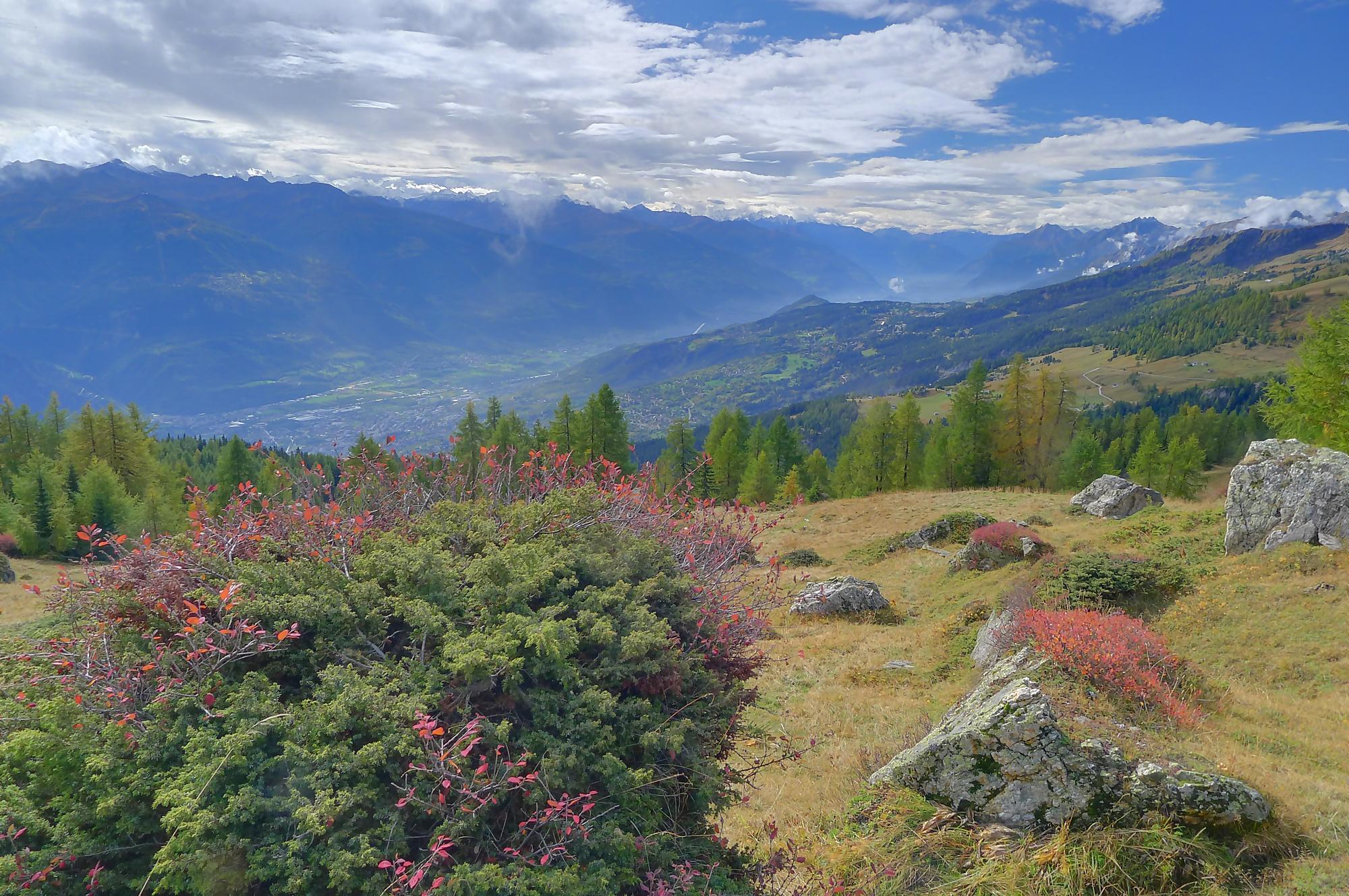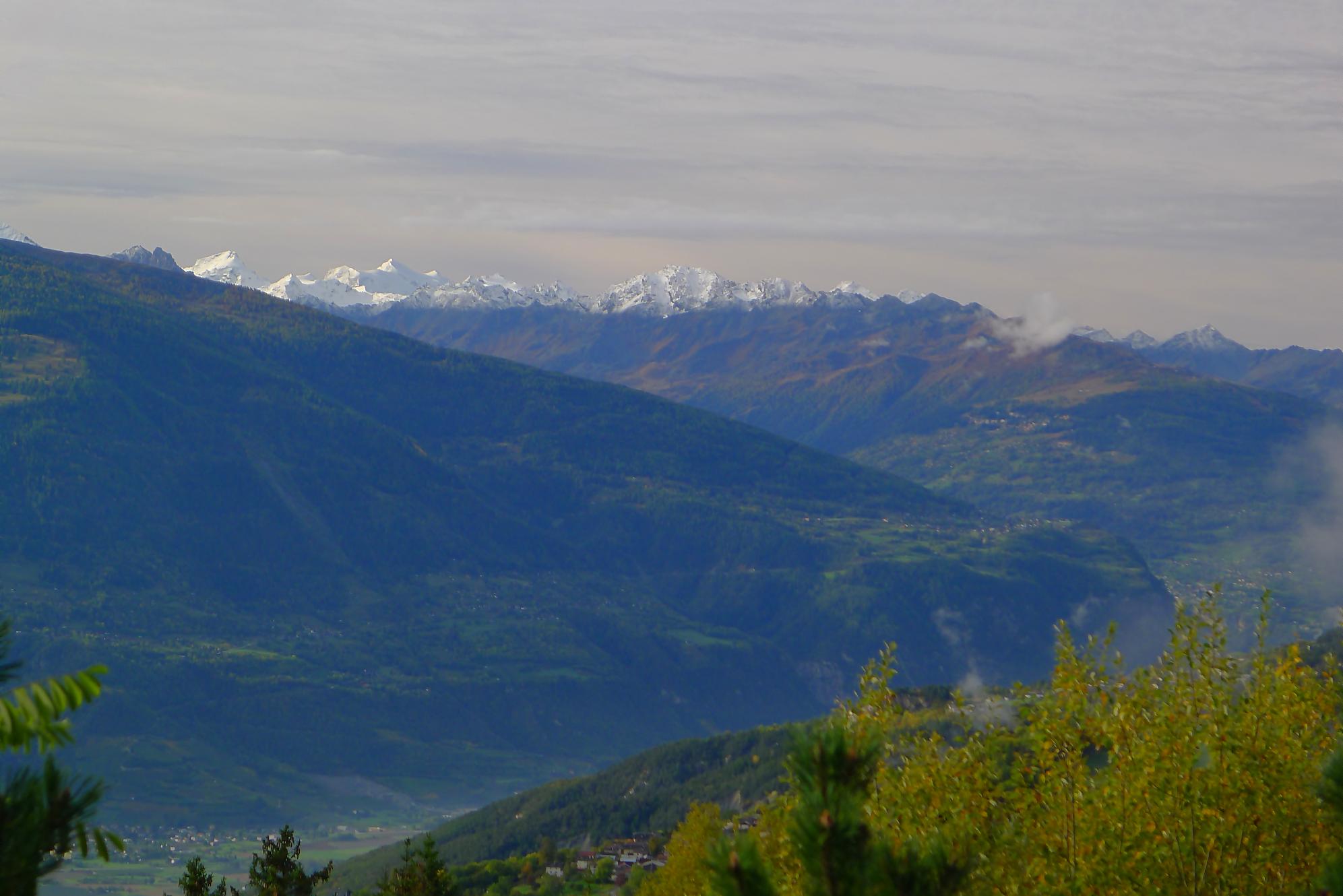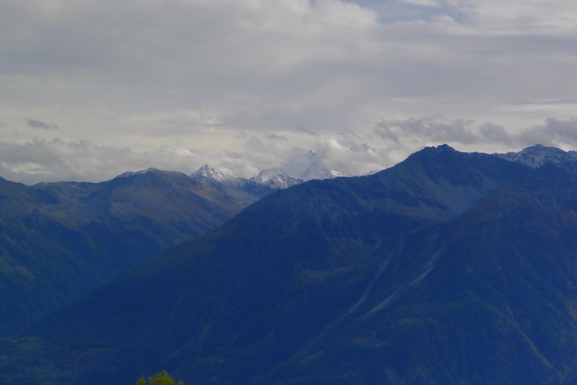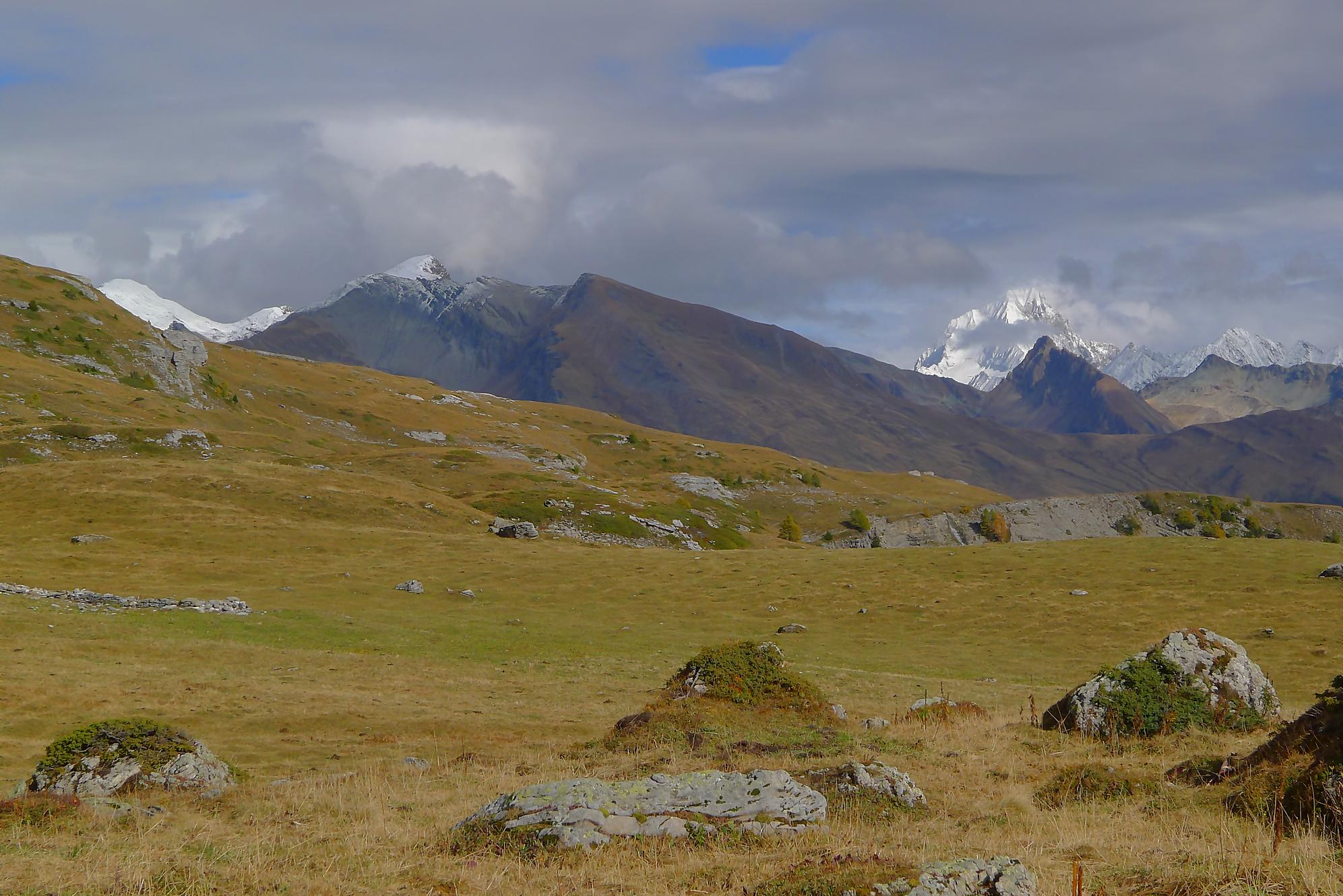 Avec un certain bonheur, j’arrive sur le plat où se trouve la ruine de Roti Hittu. Peu après je rejoins la jolie ferme de Nüschelet où un large sentier à travers la falaise permet d’arriver sur le plateau de Varneralp. C’est le plus beau secteur de la balade et Varnelalp est magnifique, la vue aussi. J’ai le soleil, mais les sommets sont prisonniers des cumulus, mais sinon le panorama ratisse large : sur la gauche le Bietschhorn, au-délà de la vallée du Rhône, le Monte Leone, toute la ribambelle des 4000m valaisans déjà cités, le Grand Combin et pour finir le Mont-Blanc en m’excusant auprès de ceux que je ne peux pas cités, la liste étant trop longue ! Je fais donc là ma pause casse-croute, en me disant qu’il faut revenir par temps dégagé !
