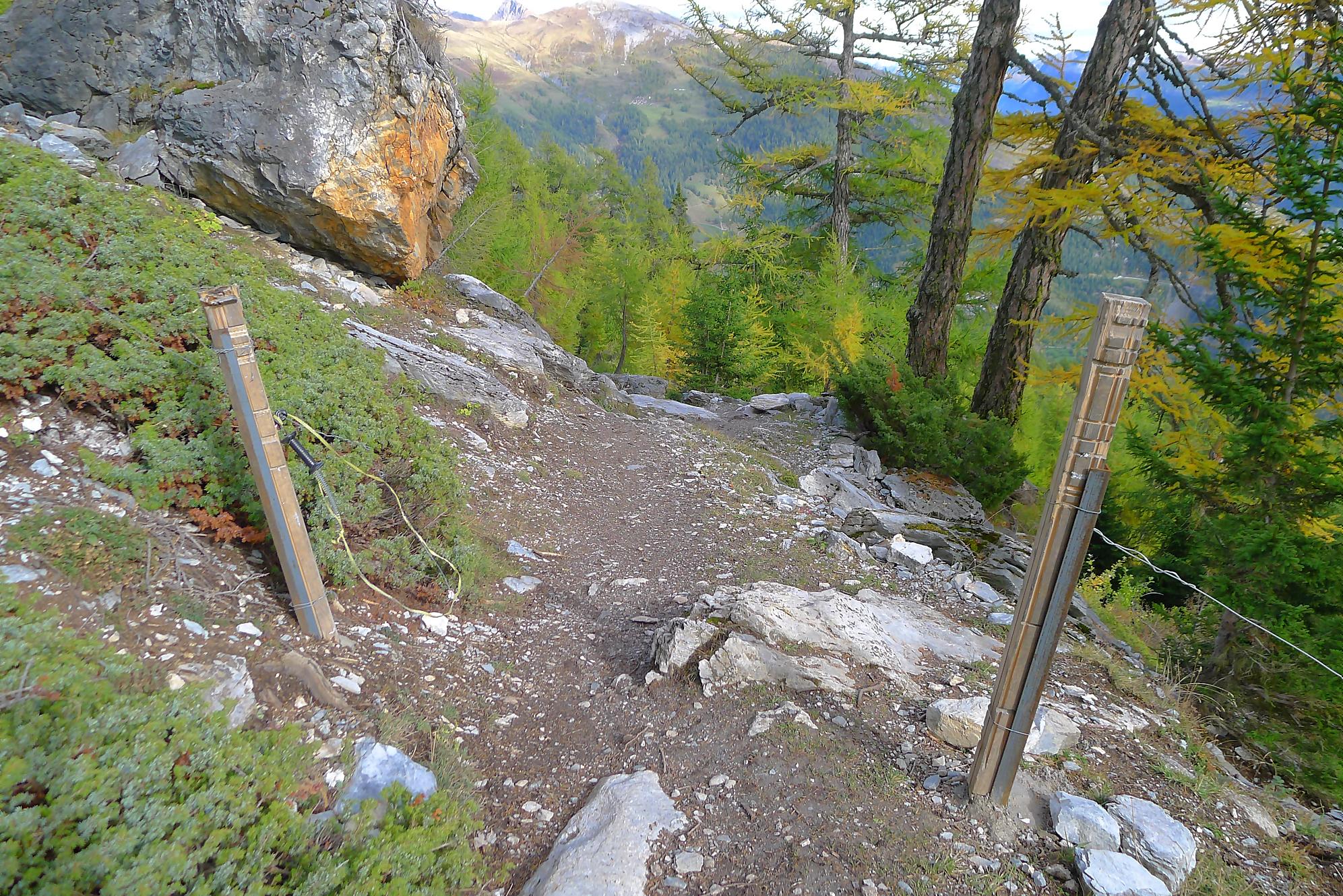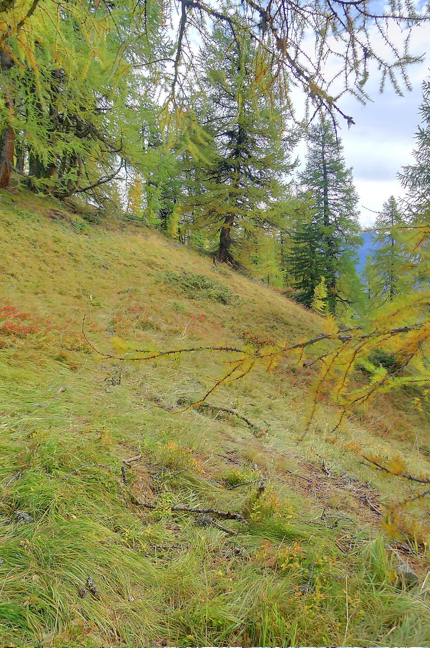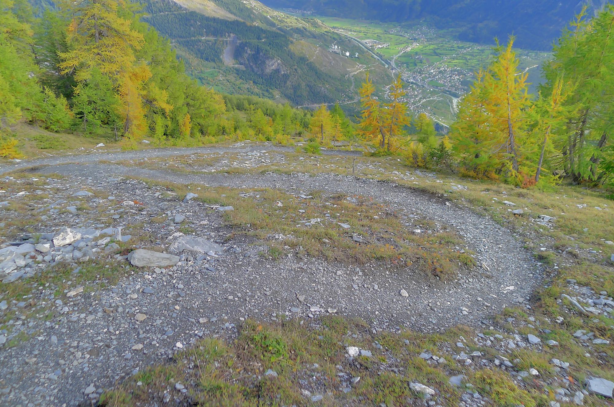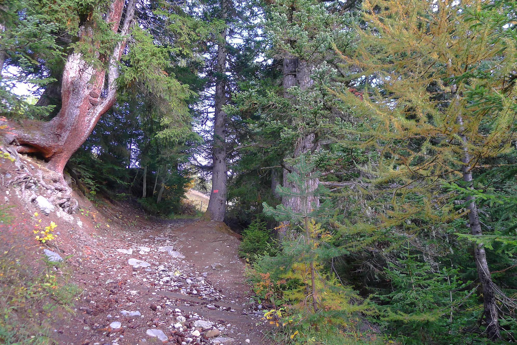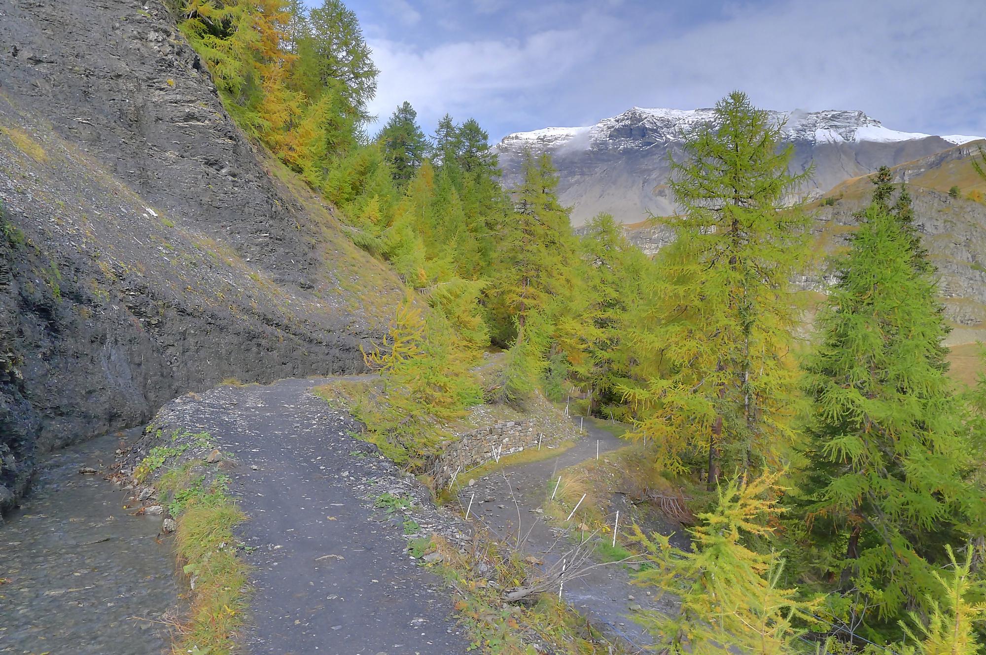 Ce chemin n’est pas très confortable, bien des mélèzes gênent la progression, bien que cela soit très joli. Puis dans le secteur de Bévron, le sentier se fait discret et difficile parfois à suivre. En sortant de la forêt, il devient peu lisible et inconfortable (on se tord les pieds). Sur la carte, il n’est d’ailleurs plus tracé ! C’est pourquoi je conseille le chemin inférieur !