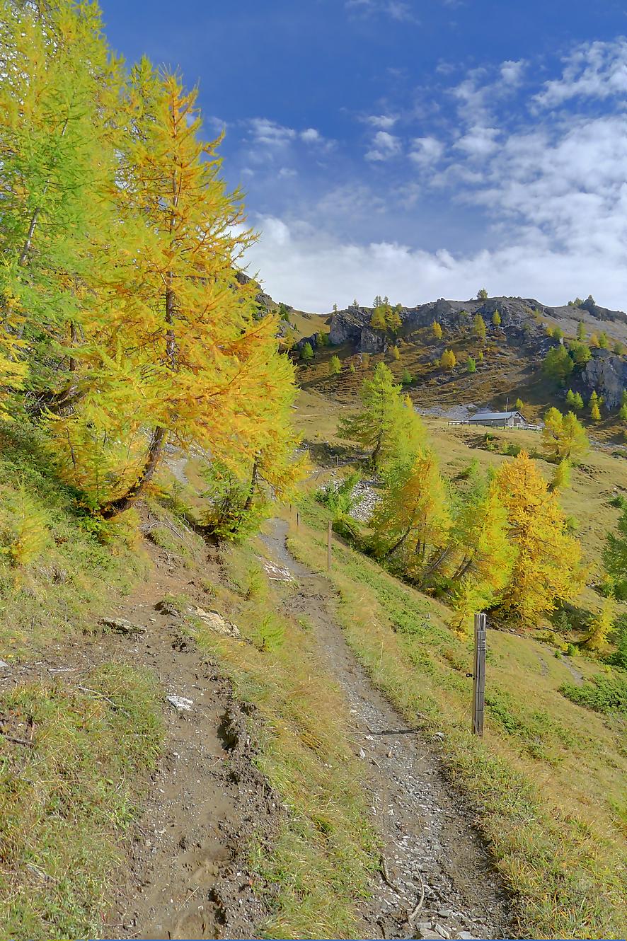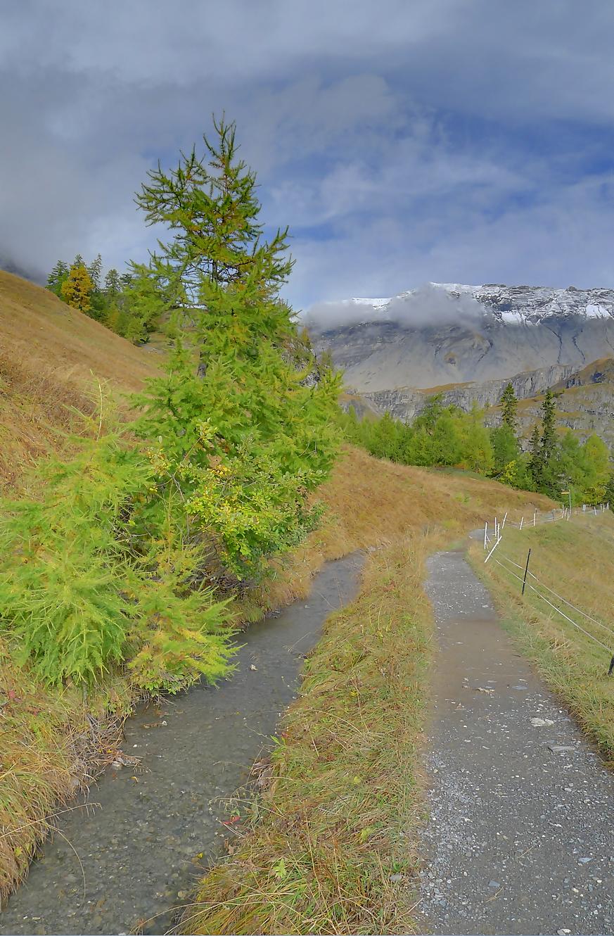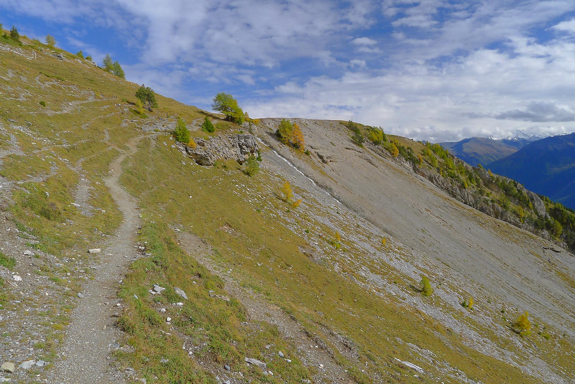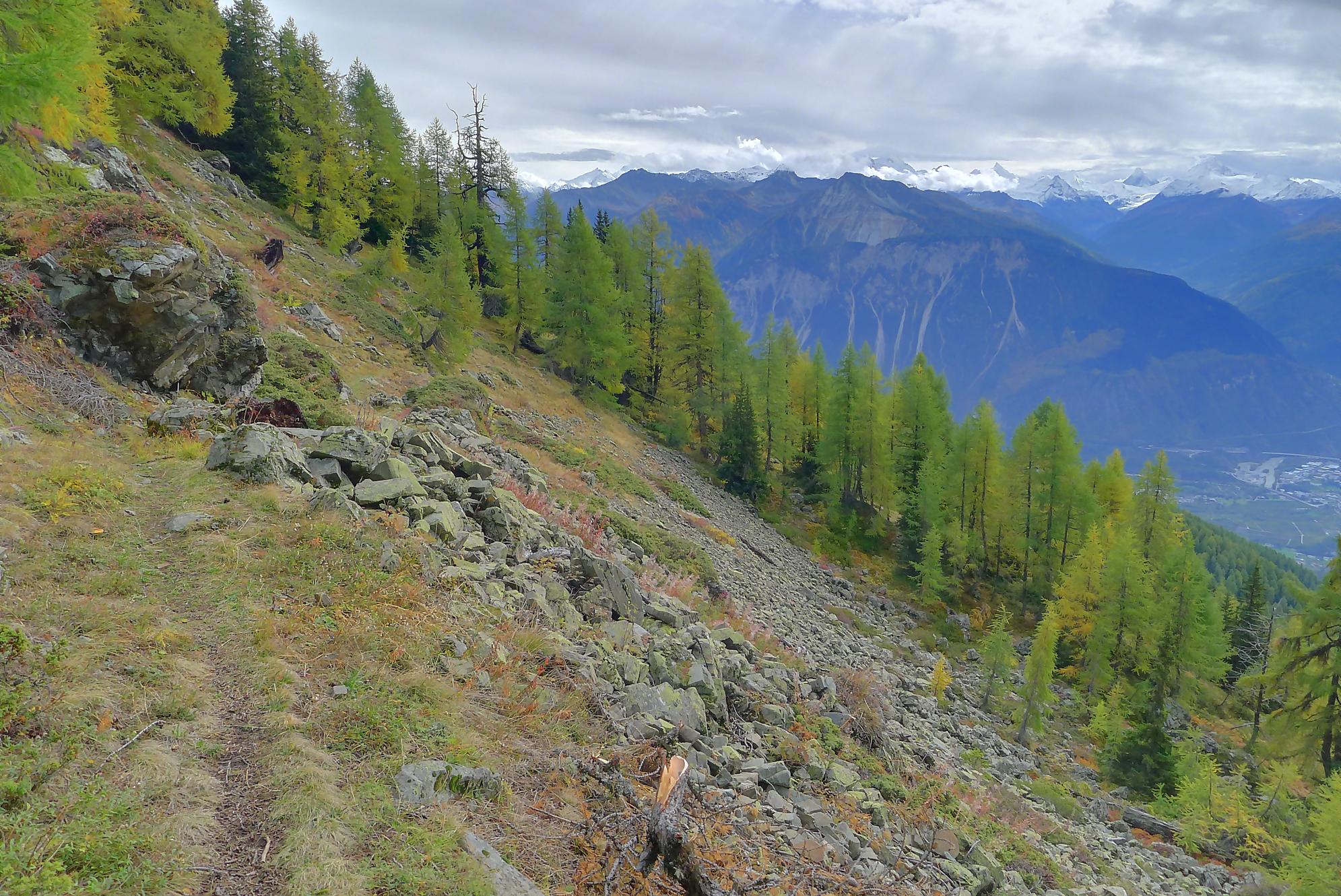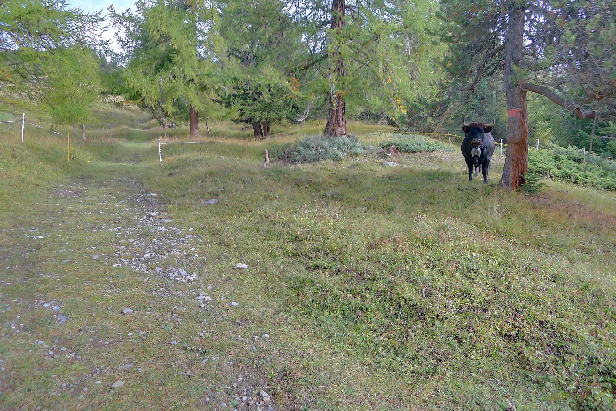 Ce chemin n’est pas très confortable, bien des mélèzes gênent la progression, bien que cela soit très joli. Puis dans le secteur de Bévron, le sentier se fait discret et difficile parfois à suivre. En sortant de la forêt, il devient peu lisible et inconfortable (on se tord les pieds). Sur la carte, il n’est d’ailleurs plus tracé ! C’est pourquoi je conseille le chemin inférieur !