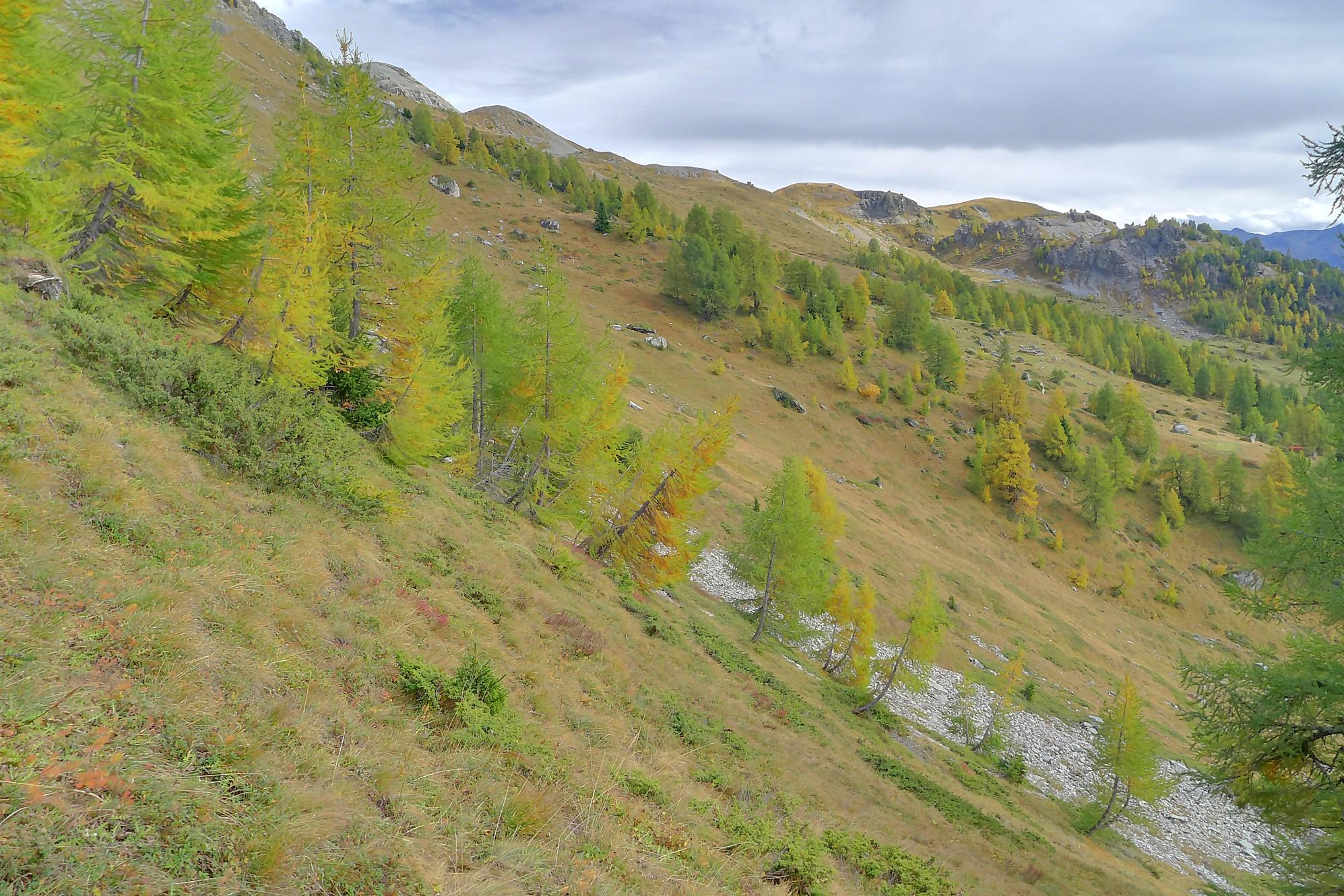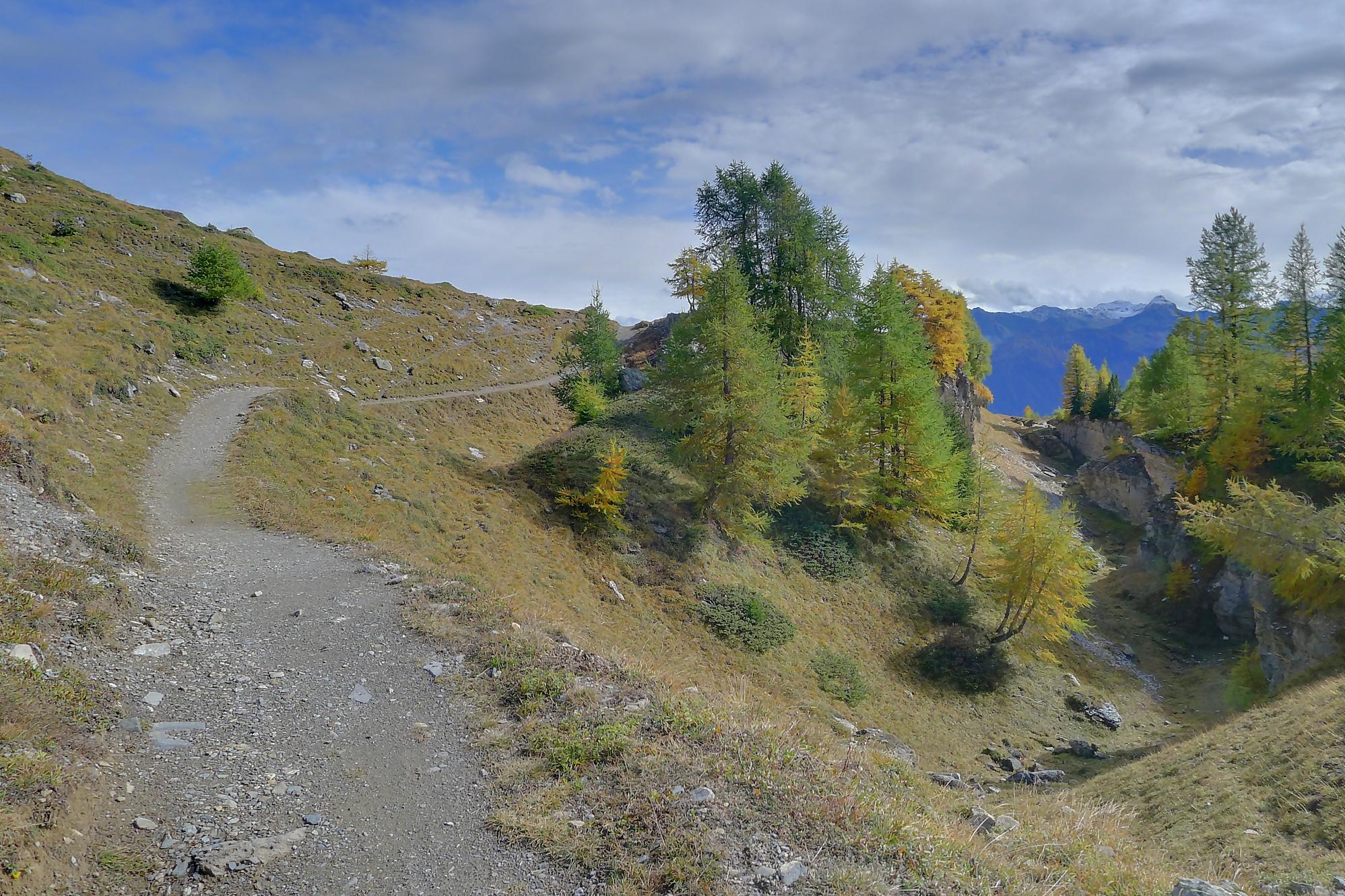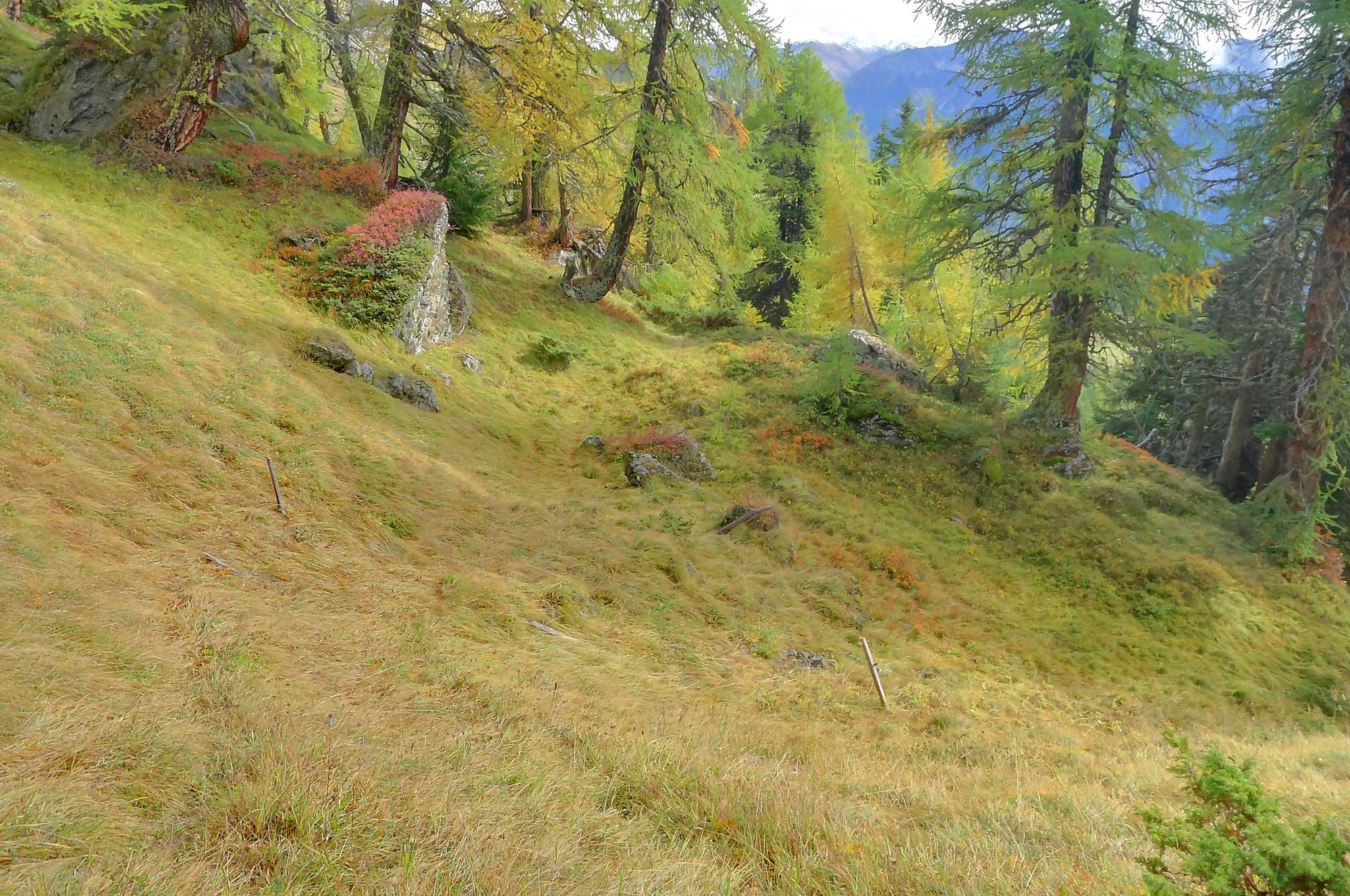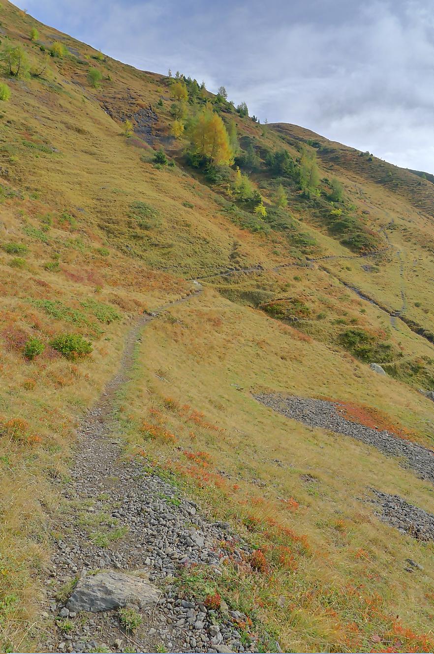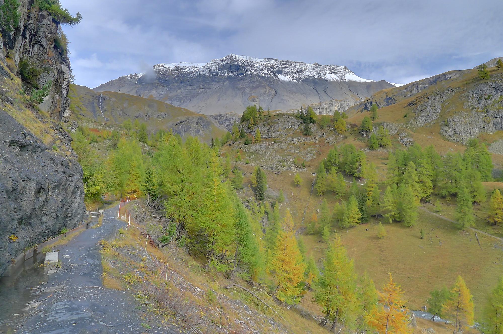 Ce chemin n’est pas très confortable, bien des mélèzes gênent la progression, bien que cela soit très joli. Puis dans le secteur de Bévron, le sentier se fait discret et difficile parfois à suivre. En sortant de la forêt, il devient peu lisible et inconfortable (on se tord les pieds). Sur la carte, il n’est d’ailleurs plus tracé ! C’est pourquoi je conseille le chemin inférieur !