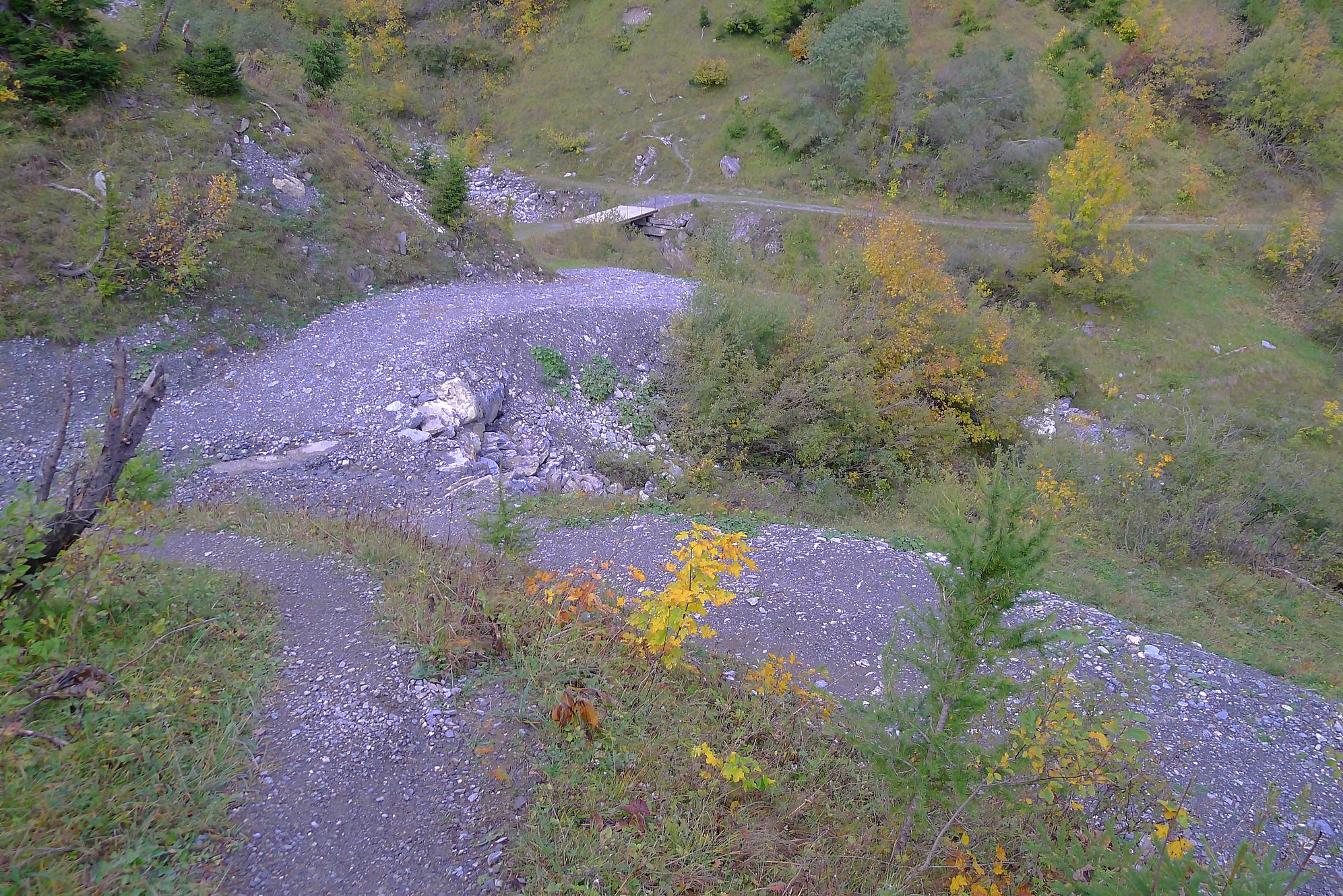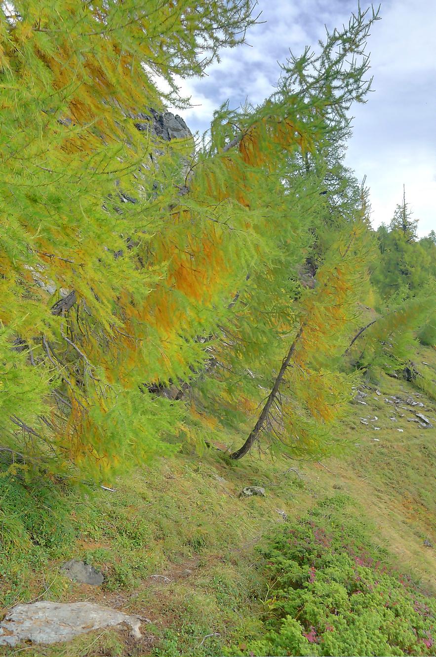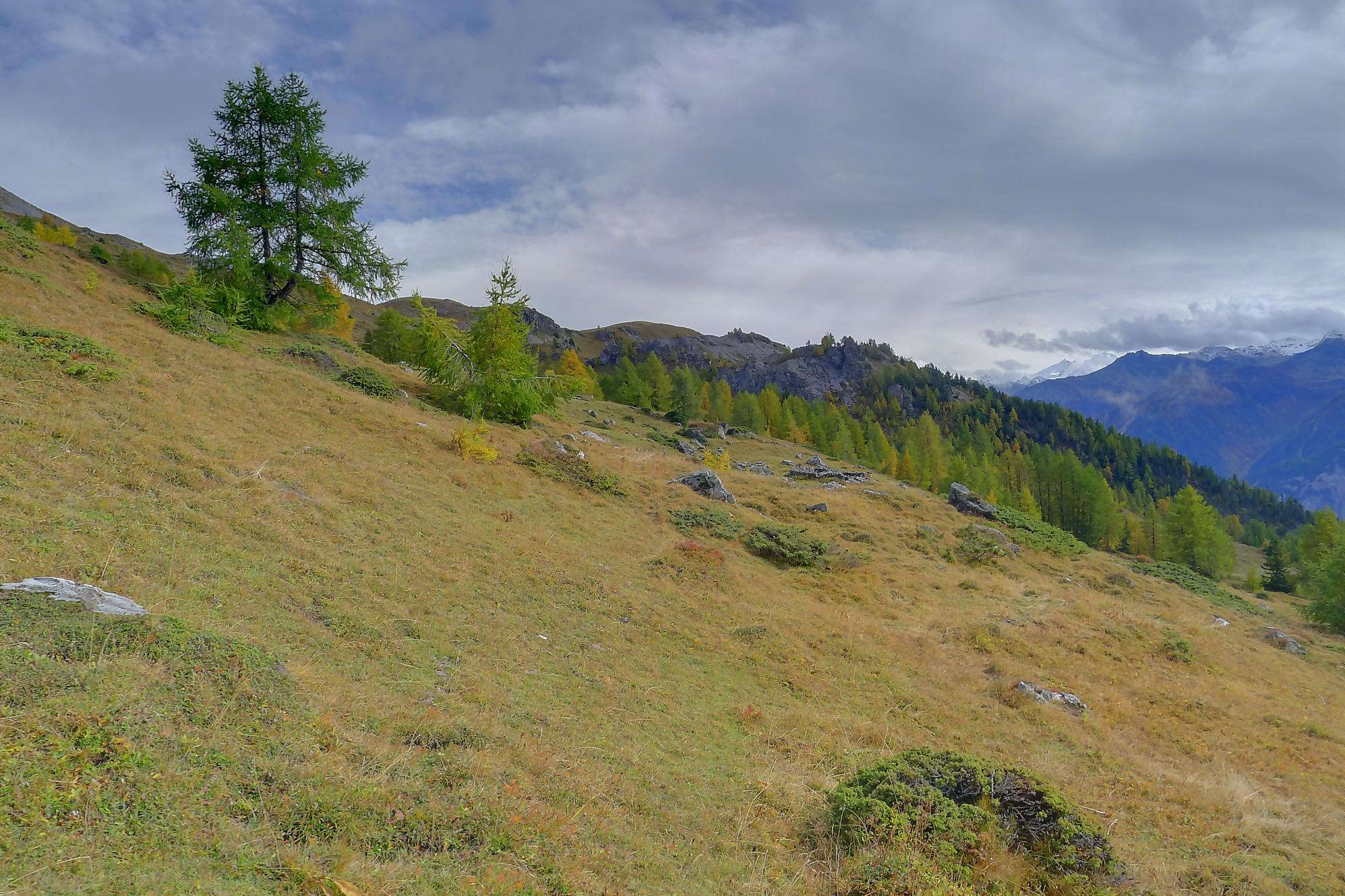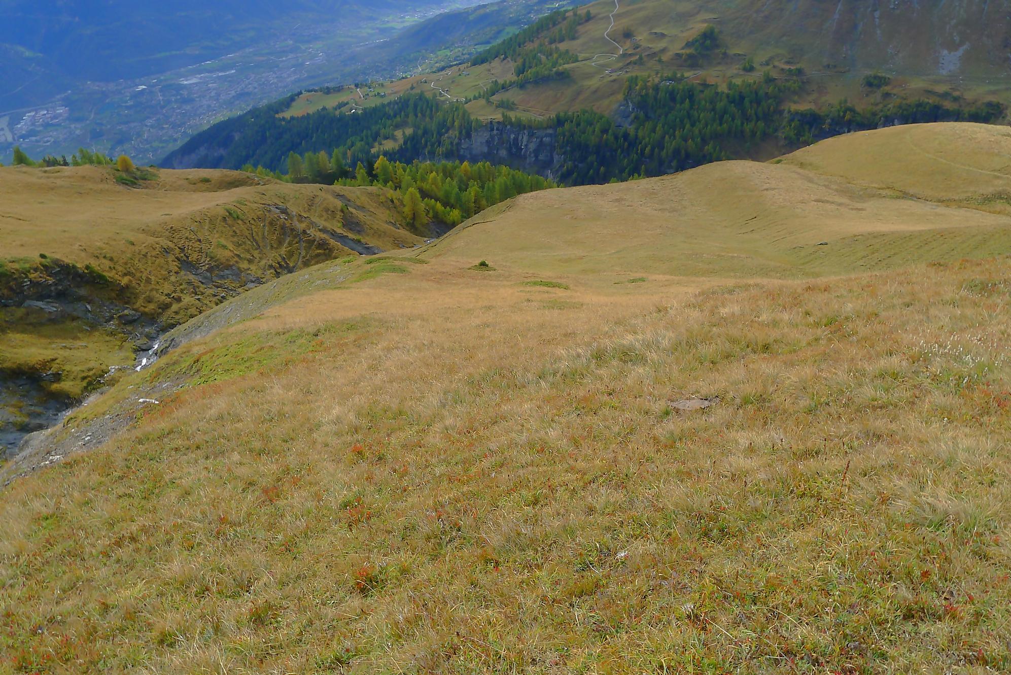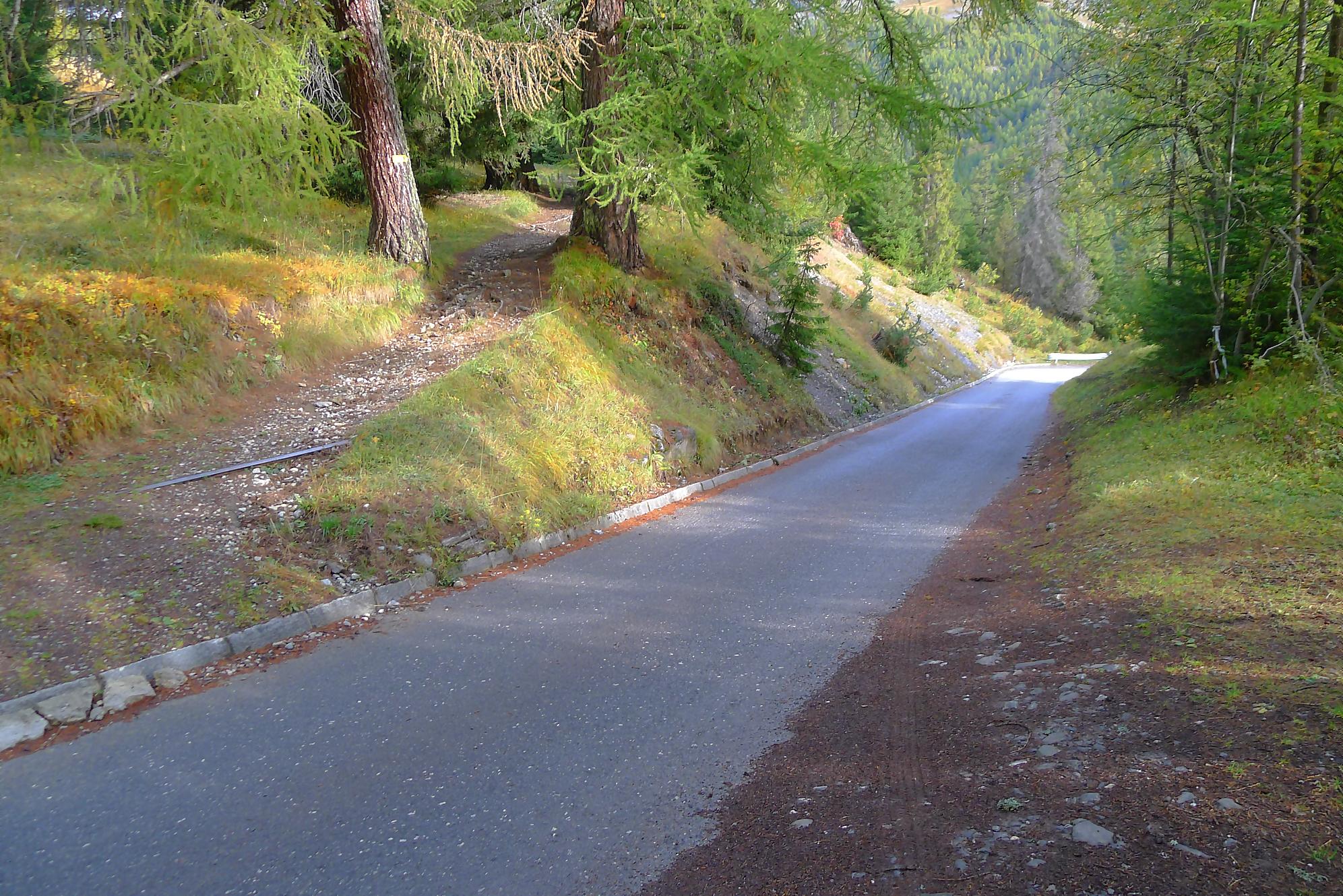 Ce chemin n’est pas très confortable, bien des mélèzes gênent la progression, bien que cela soit très joli. Puis dans le secteur de Bévron, le sentier se fait discret et difficile parfois à suivre. En sortant de la forêt, il devient peu lisible et inconfortable (on se tord les pieds). Sur la carte, il n’est d’ailleurs plus tracé ! C’est pourquoi je conseille le chemin inférieur !