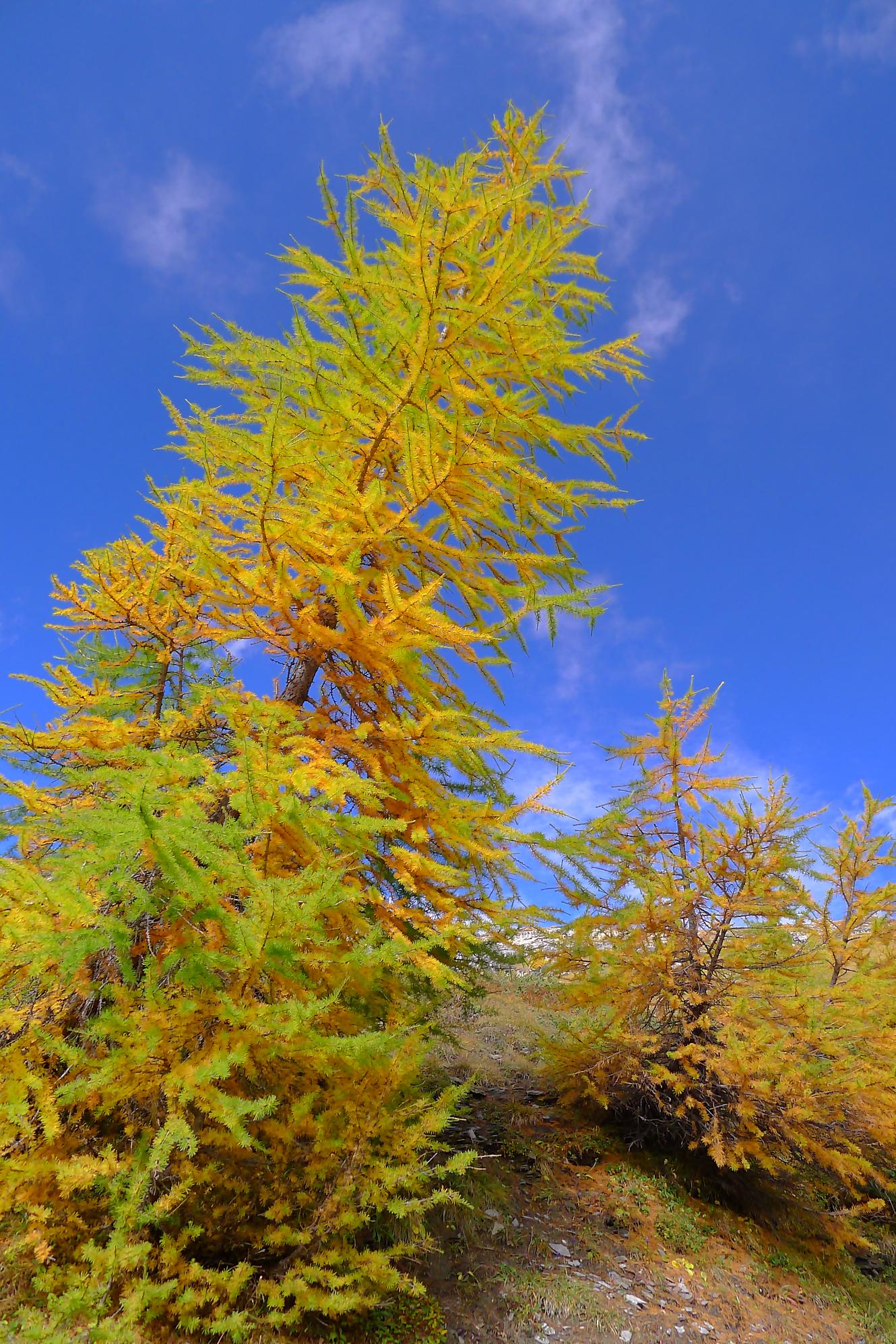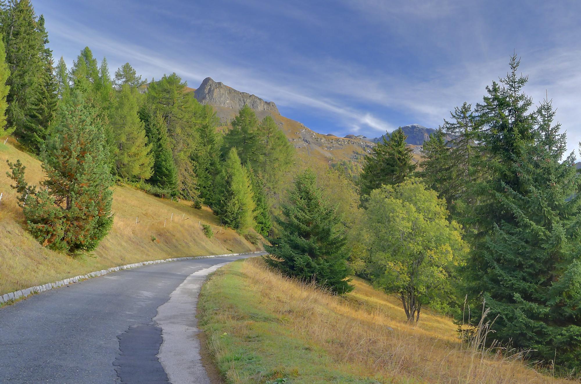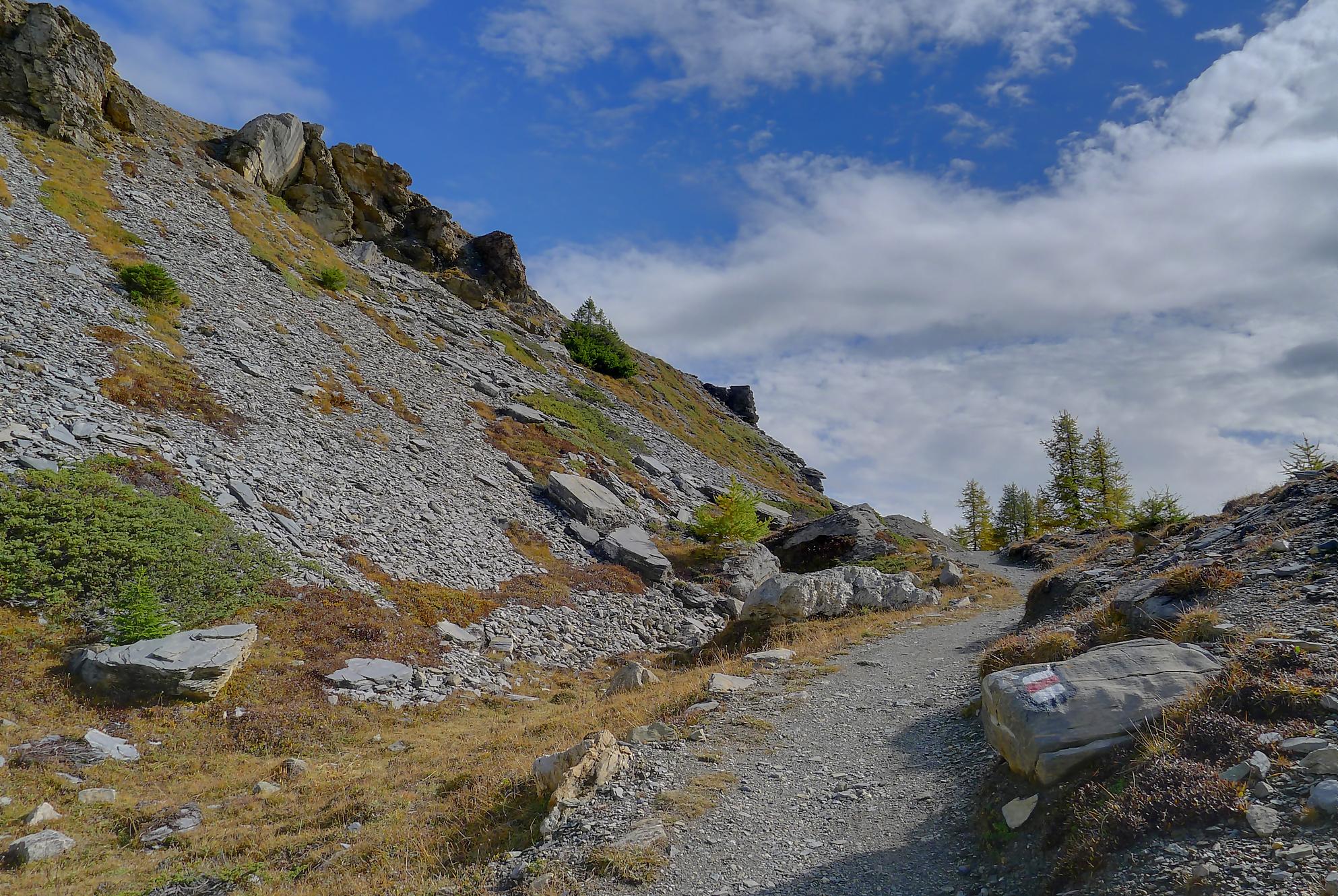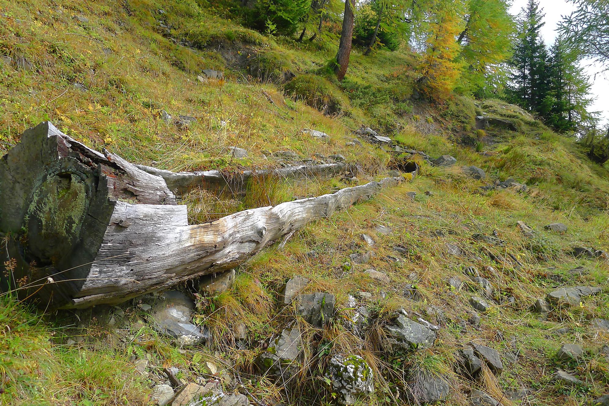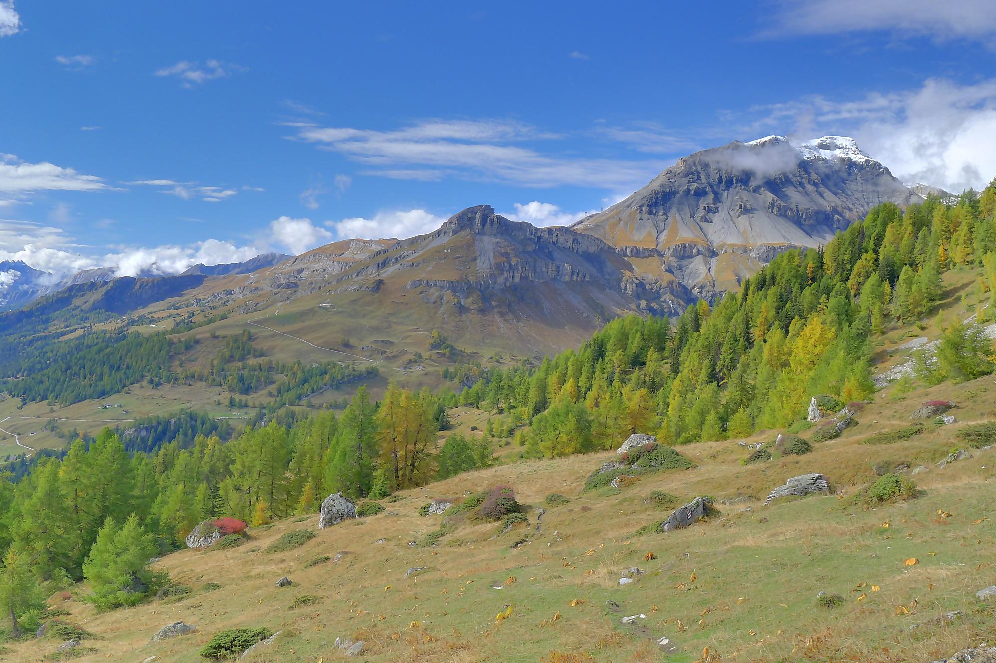 Ce chemin n’est pas très confortable, bien des mélèzes gênent la progression, bien que cela soit très joli. Puis dans le secteur de Bévron, le sentier se fait discret et difficile parfois à suivre. En sortant de la forêt, il devient peu lisible et inconfortable (on se tord les pieds). Sur la carte, il n’est d’ailleurs plus tracé ! C’est pourquoi je conseille le chemin inférieur !