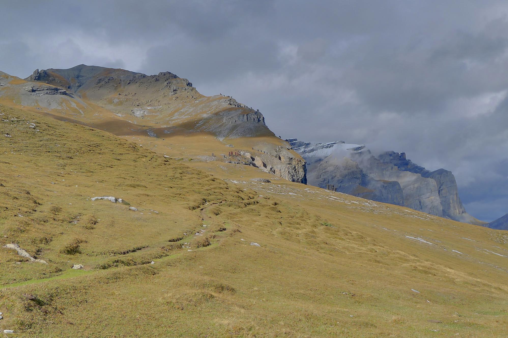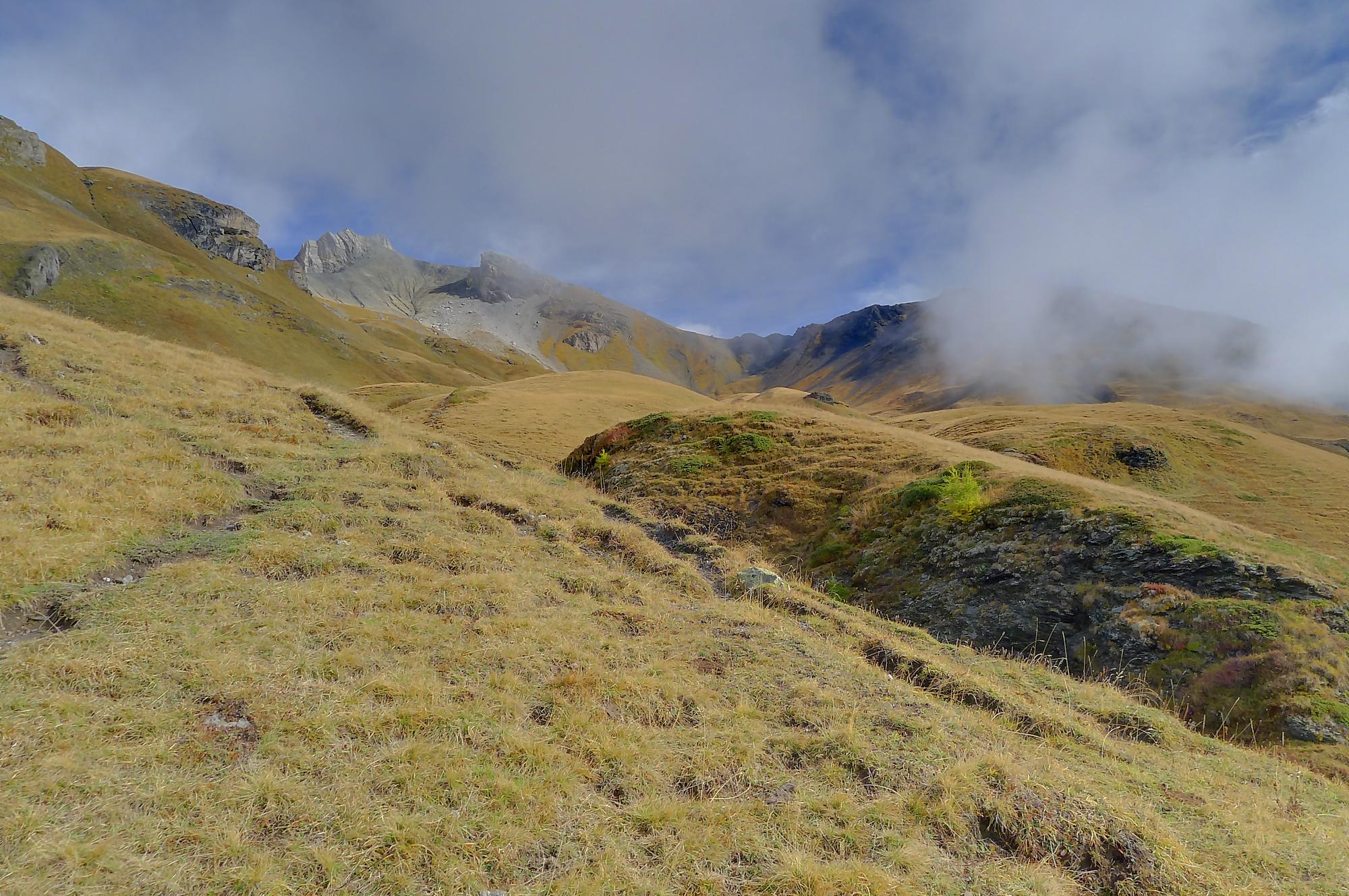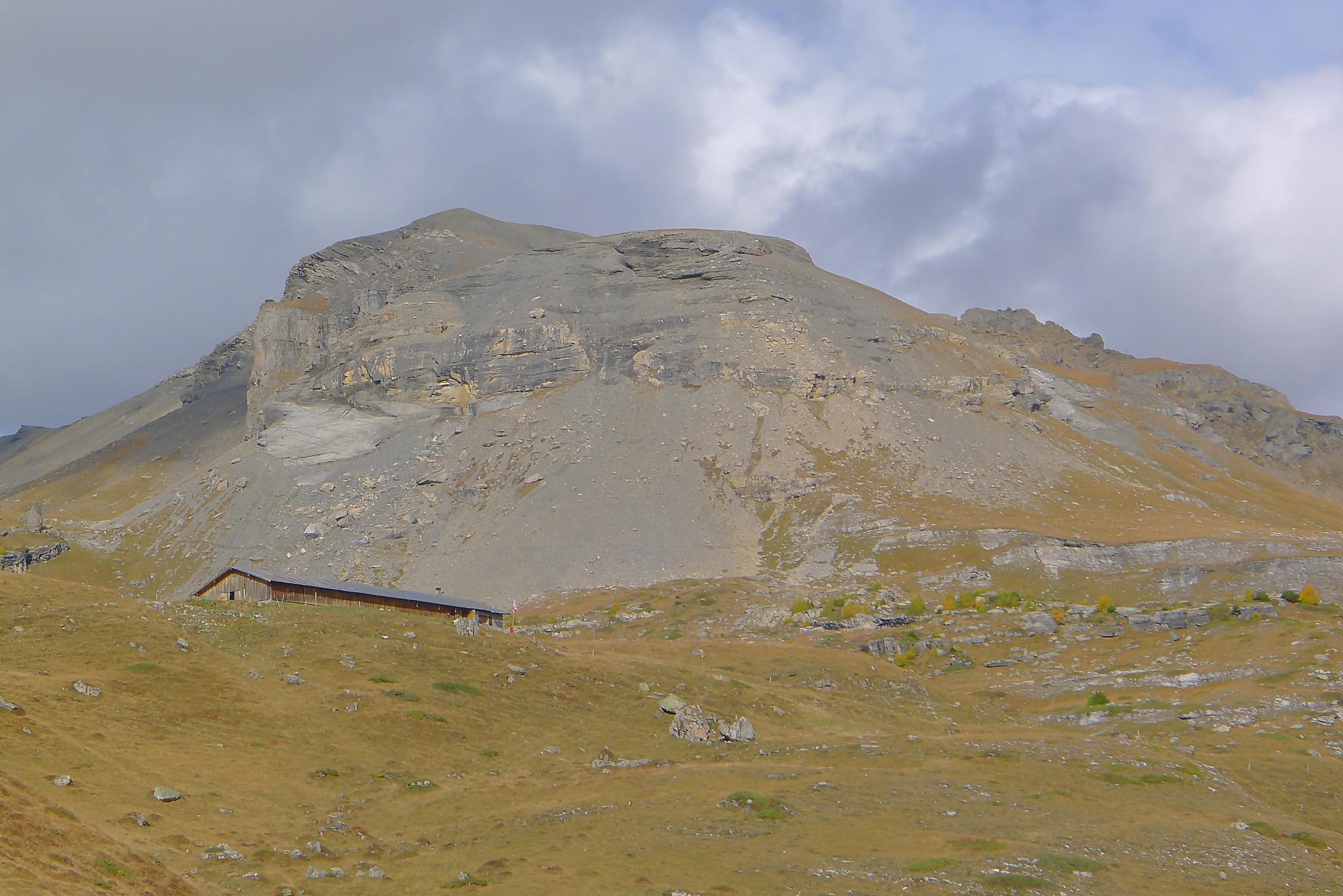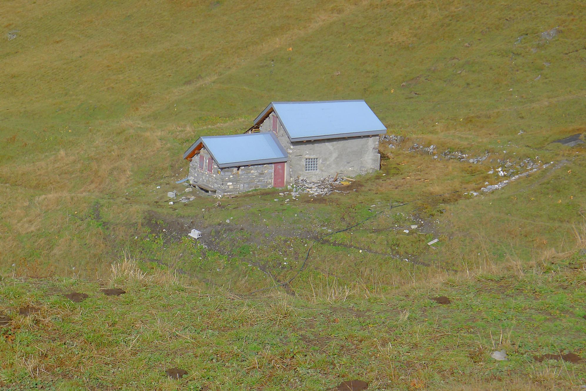 A la Montagne du Sex et son chalet, je pars à droite, suivant le marquage rouge-blanc, difficile à trouver à cause des sentes à vaches. Ici j’ai fait une erreur, car j’ai emprunté le chemin pour le Trubelstock (il n’y a pas de panneau le long du parcours). Ce sentier est très joli, mais je me suis rendu compte tardivement de cette erreur, vers le Pt2412 de Remoinste du Plan. Prenant conscience de cette erreur, j’ai hésité à rejoindre le Trubelstock, mais sur la carte il n’existe pas de chemin pour rejoindre Varneralp et n’ayant pas de topo sous la main, j’ai abdiqué ! Donc une descente en hors piste, plutôt confortable, en naviguant à vue pour éviter les falaises. Cela m’a permis de voir de jolis abris de bergers. A 2100m, je rejoins le chemin que j’aurais dû prendre depuis la Montagne du Plan.