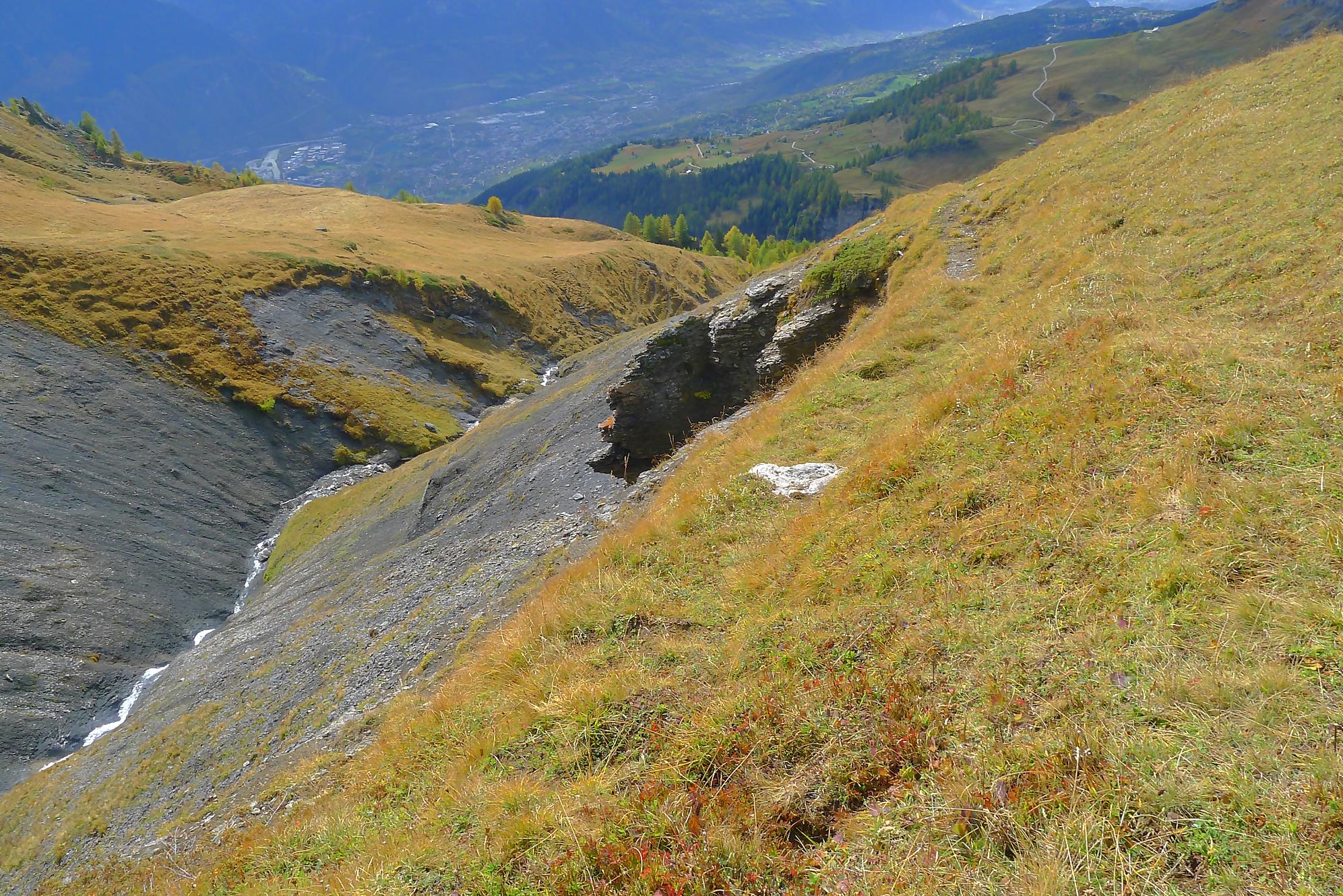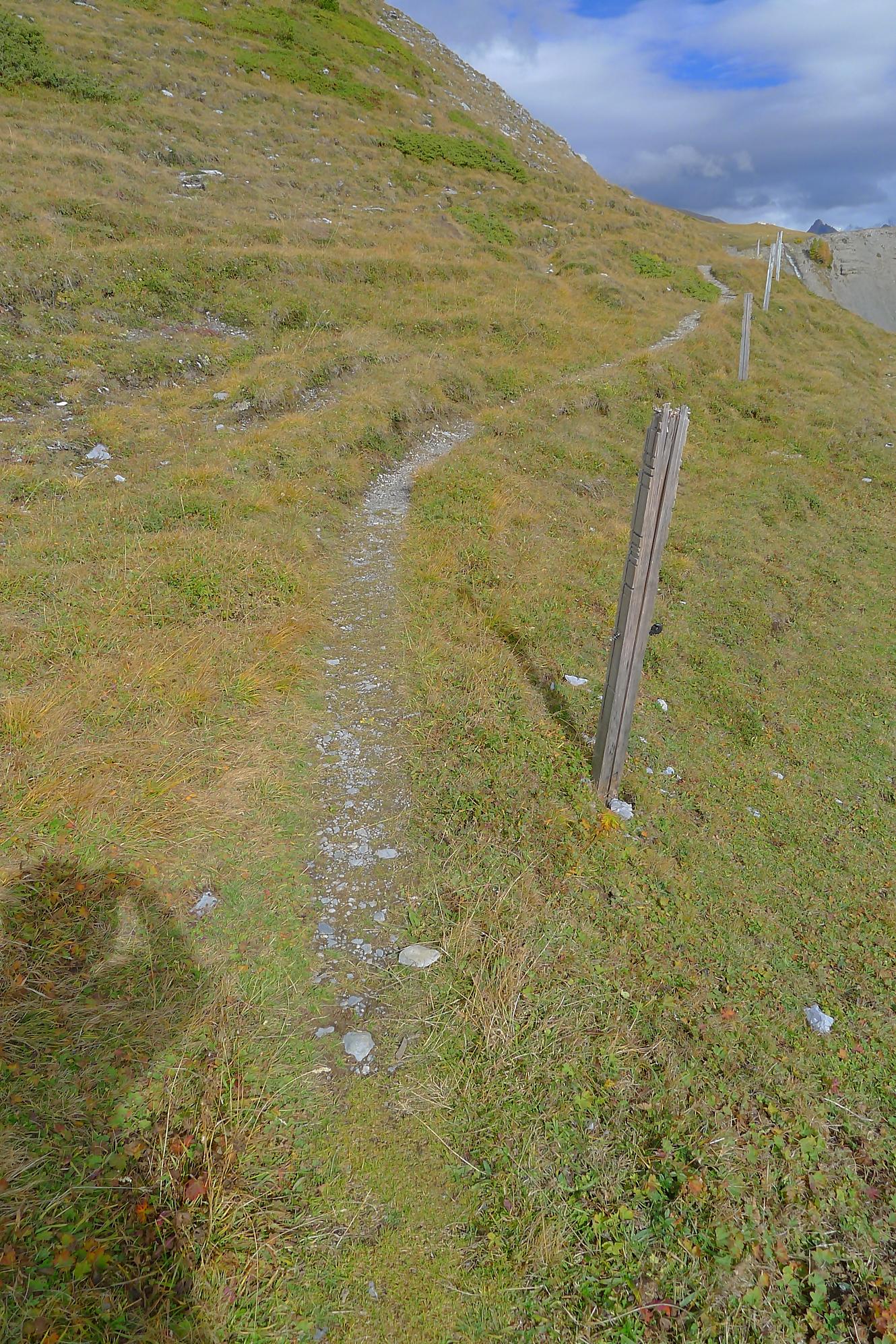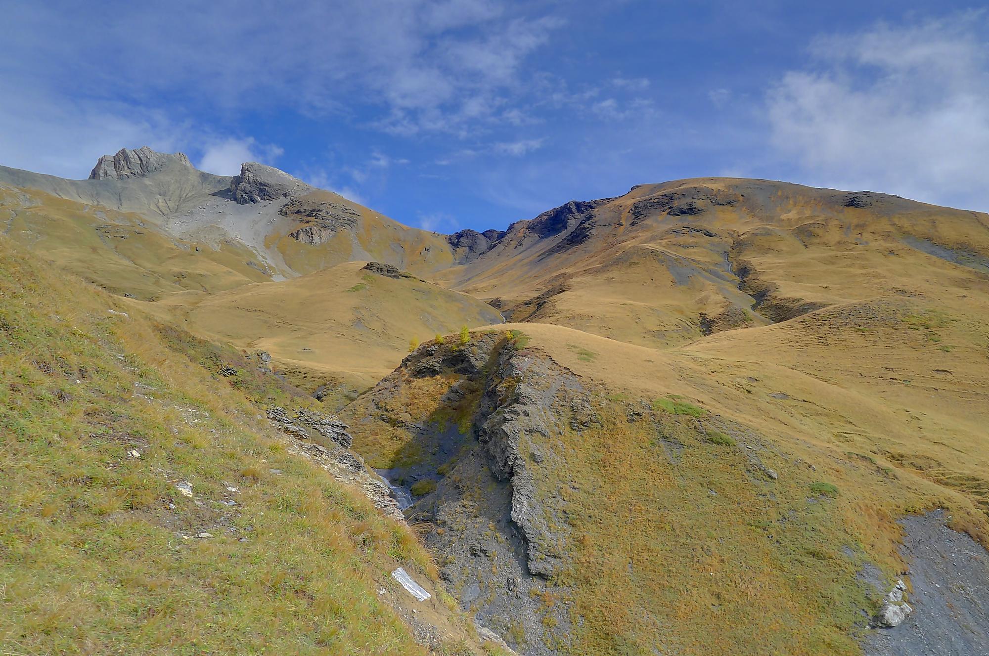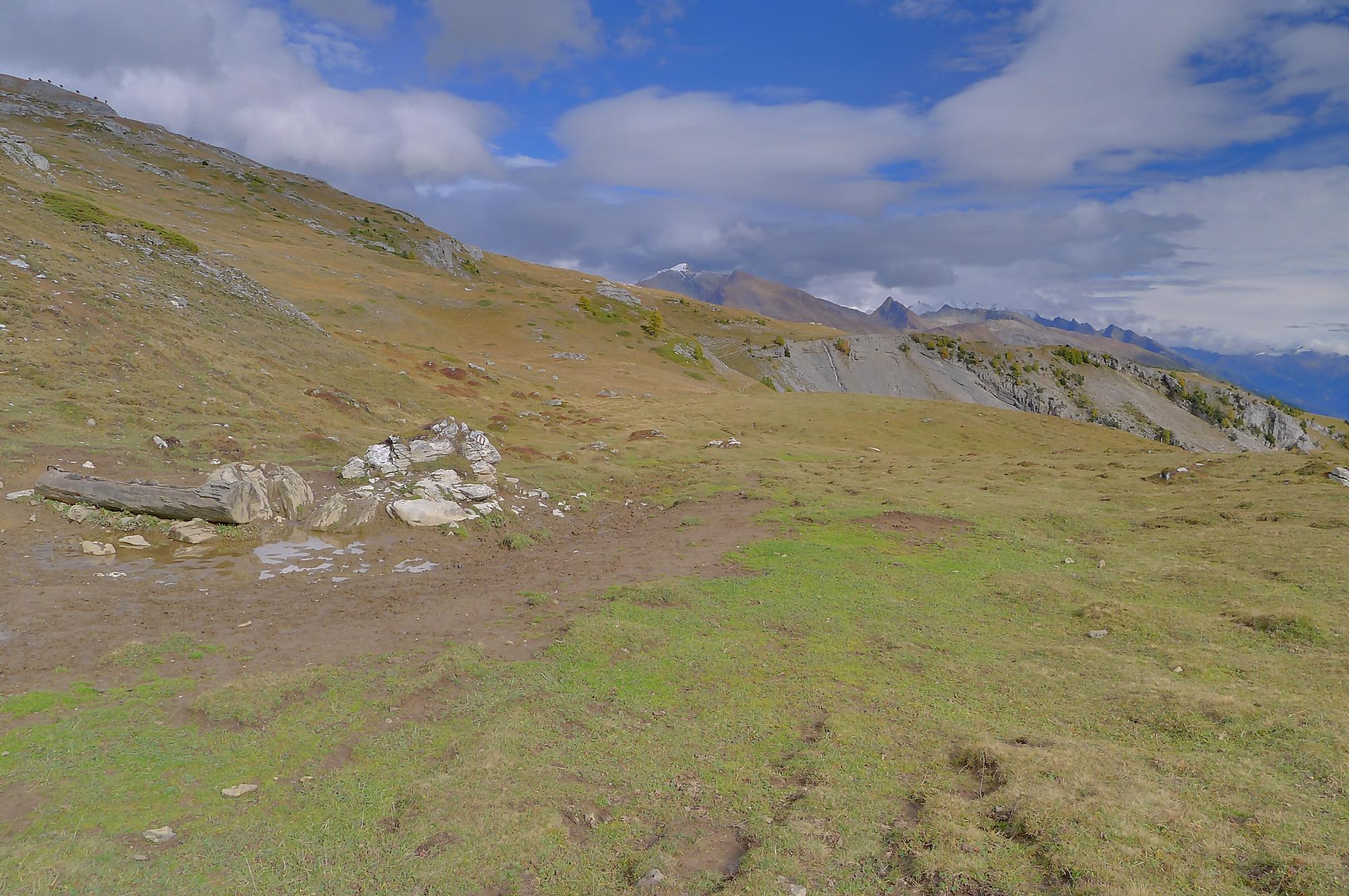 A la Montagne du Sex et son chalet, je pars à droite, suivant le marquage rouge-blanc, difficile à trouver à cause des sentes à vaches. Ici j’ai fait une erreur, car j’ai emprunté le chemin pour le Trubelstock (il n’y a pas de panneau le long du parcours). Ce sentier est très joli, mais je me suis rendu compte tardivement de cette erreur, vers le Pt2412 de Remoinste du Plan. Prenant conscience de cette erreur, j’ai hésité à rejoindre le Trubelstock, mais sur la carte il n’existe pas de chemin pour rejoindre Varneralp et n’ayant pas de topo sous la main, j’ai abdiqué ! Donc une descente en hors piste, plutôt confortable, en naviguant à vue pour éviter les falaises. Cela m’a permis de voir de jolis abris de bergers. A 2100m, je rejoins le chemin que j’aurais dû prendre depuis la Montagne du Plan.