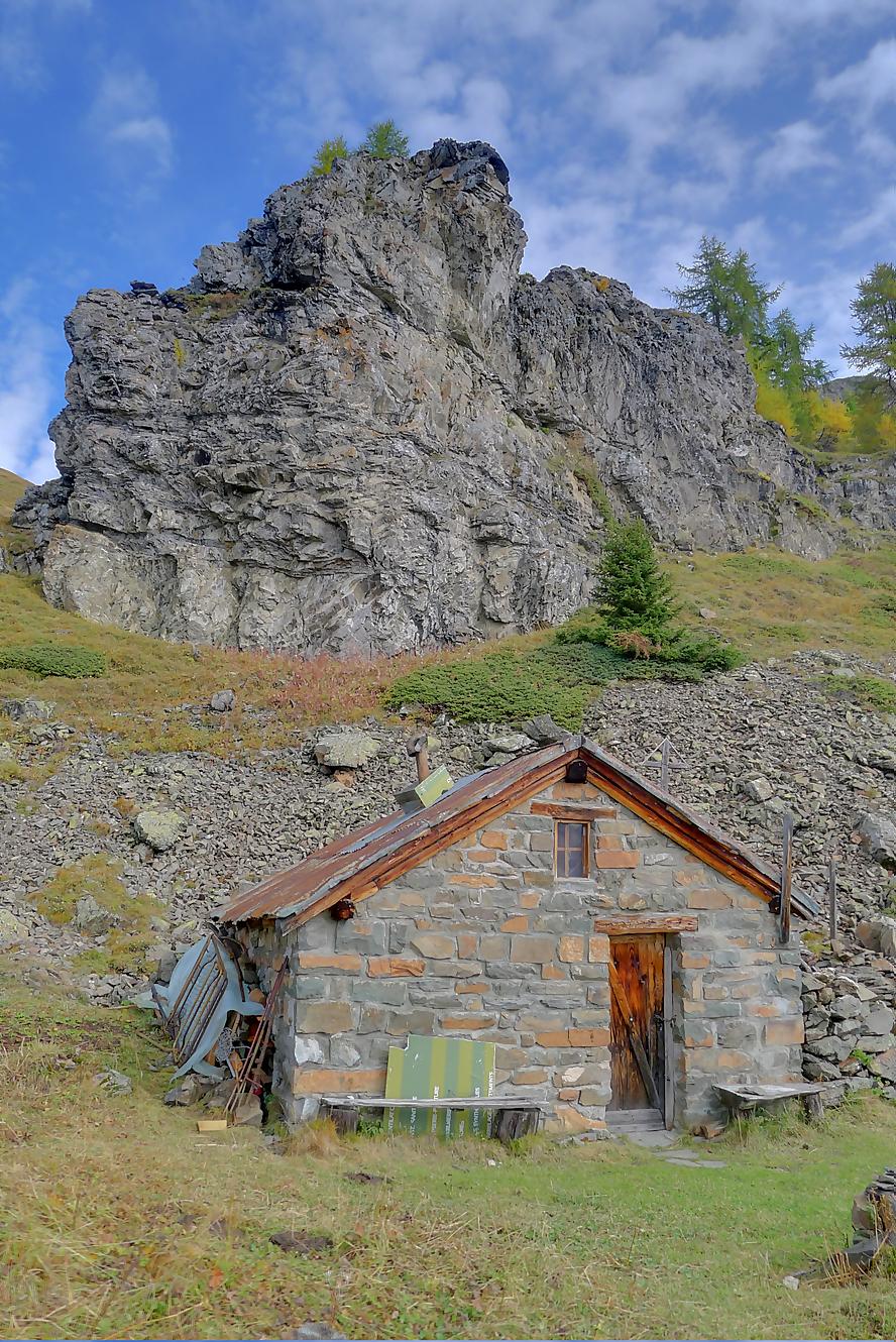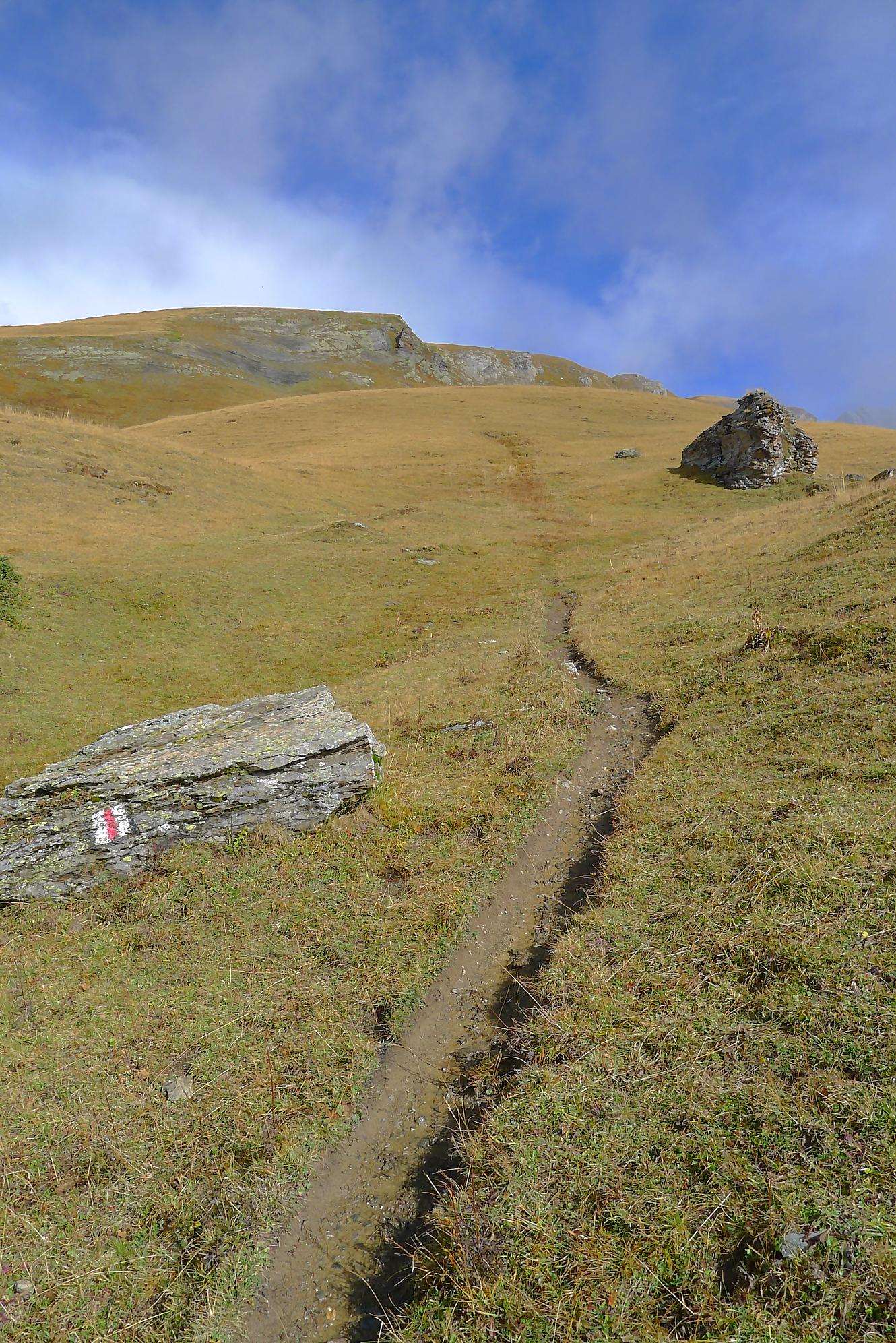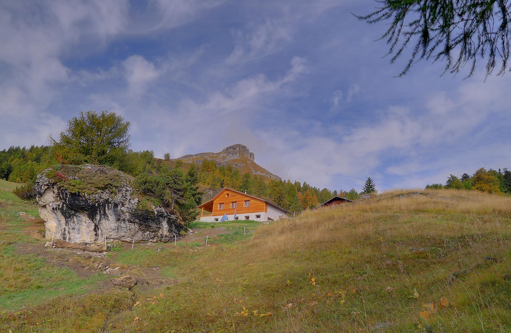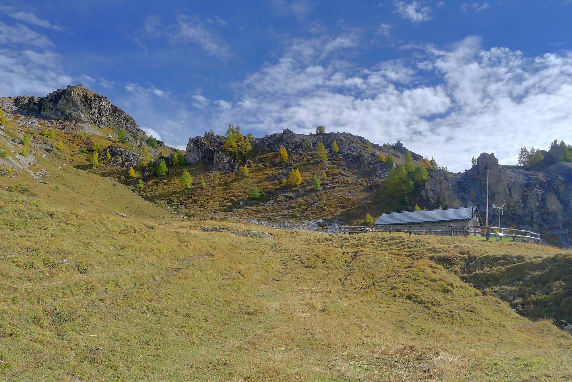 A la Montagne du Sex et son chalet, je pars à droite, suivant le marquage rouge-blanc, difficile à trouver à cause des sentes à vaches. Ici j’ai fait une erreur, car j’ai emprunté le chemin pour le Trubelstock (il n’y a pas de panneau le long du parcours). Ce sentier est très joli, mais je me suis rendu compte tardivement de cette erreur, vers le Pt2412 de Remoinste du Plan. Prenant conscience de cette erreur, j’ai hésité à rejoindre le Trubelstock, mais sur la carte il n’existe pas de chemin pour rejoindre Varneralp et n’ayant pas de topo sous la main, j’ai abdiqué ! Donc une descente en hors piste, plutôt confortable, en naviguant à vue pour éviter les falaises. Cela m’a permis de voir de jolis abris de bergers. A 2100m, je rejoins le chemin que j’aurais dû prendre depuis la Montagne du Plan.