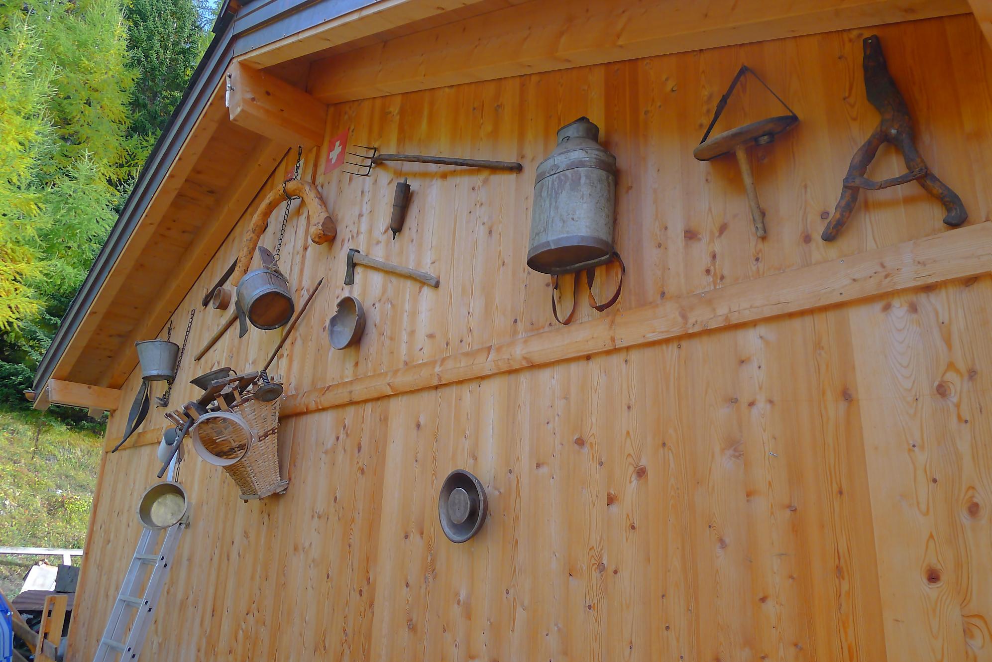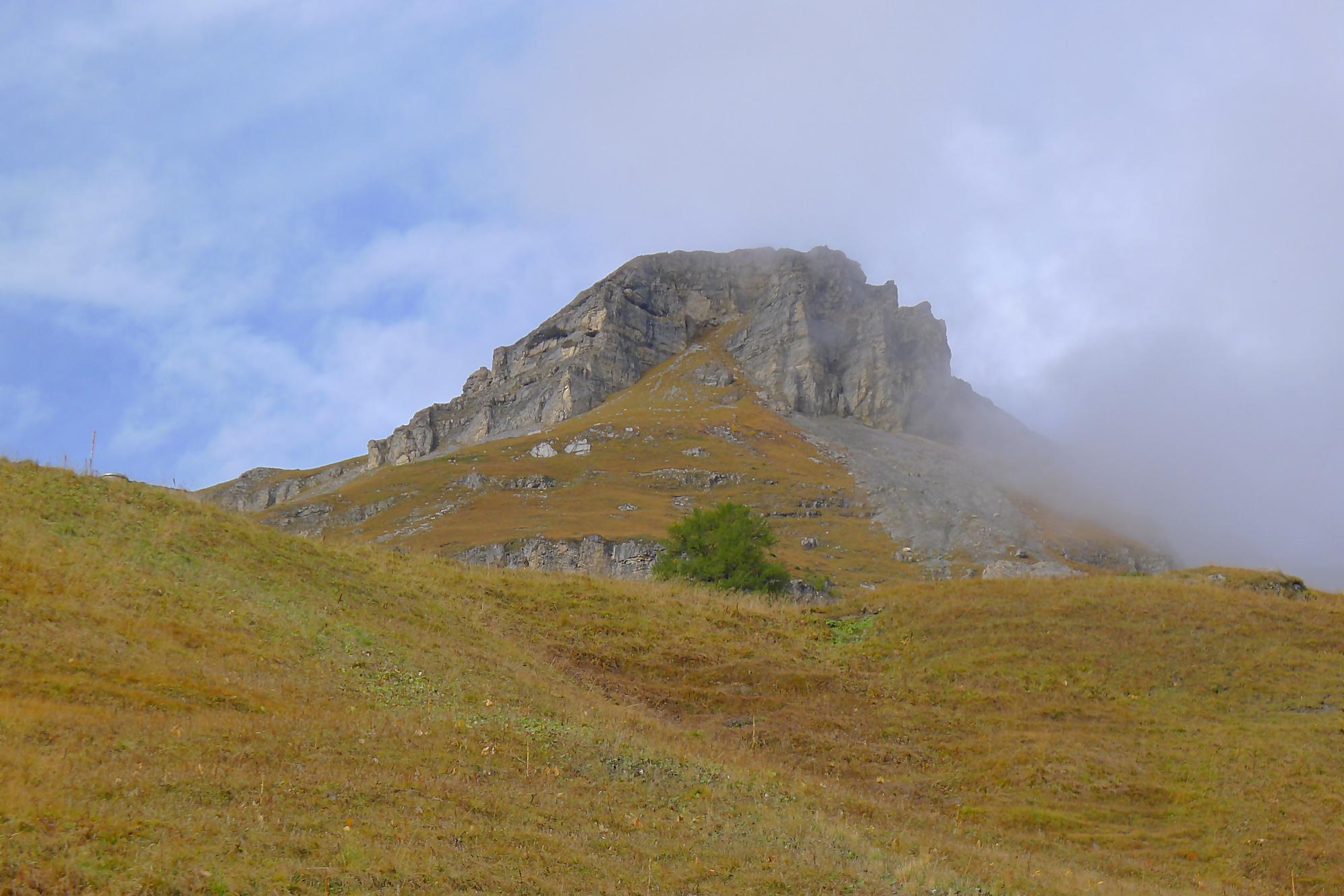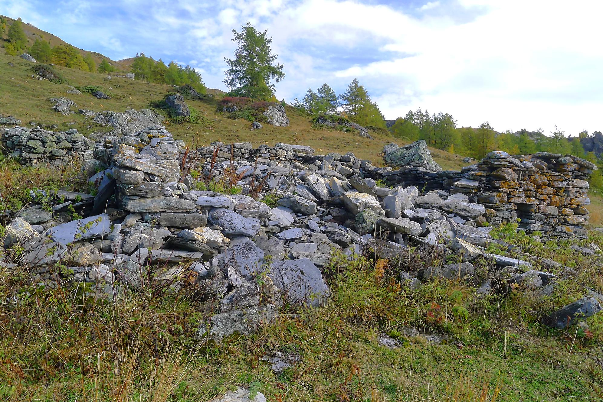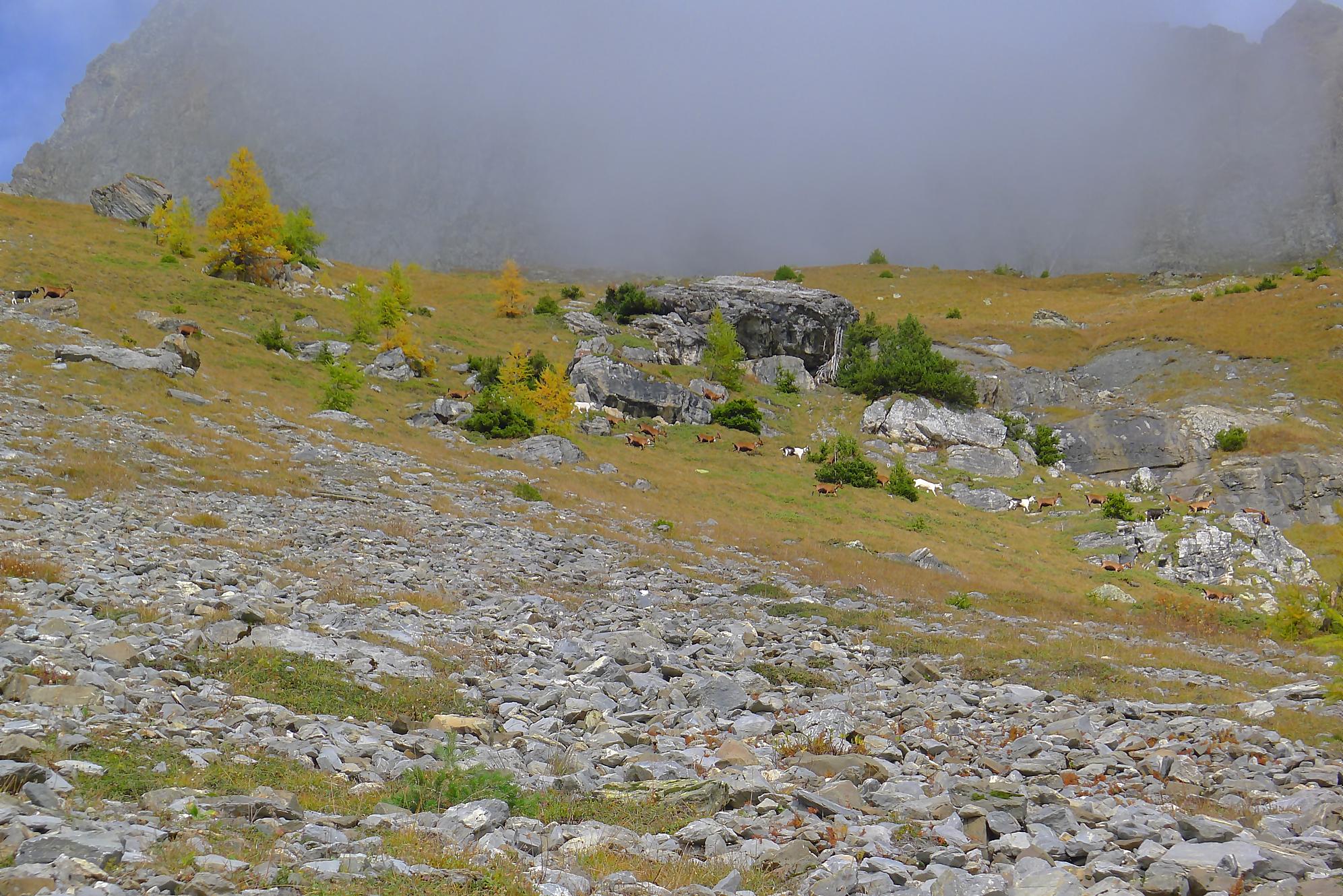 A la Montagne du Sex et son chalet, je pars à droite, suivant le marquage rouge-blanc, difficile à trouver à cause des sentes à vaches. Ici j’ai fait une erreur, car j’ai emprunté le chemin pour le Trubelstock (il n’y a pas de panneau le long du parcours). Ce sentier est très joli, mais je me suis rendu compte tardivement de cette erreur, vers le Pt2412 de Remoinste du Plan. Prenant conscience de cette erreur, j’ai hésité à rejoindre le Trubelstock, mais sur la carte il n’existe pas de chemin pour rejoindre Varneralp et n’ayant pas de topo sous la main, j’ai abdiqué ! Donc une descente en hors piste, plutôt confortable, en naviguant à vue pour éviter les falaises. Cela m’a permis de voir de jolis abris de bergers. A 2100m, je rejoins le chemin que j’aurais dû prendre depuis la Montagne du Plan.