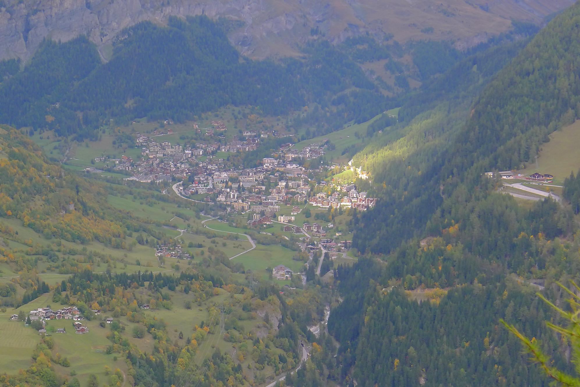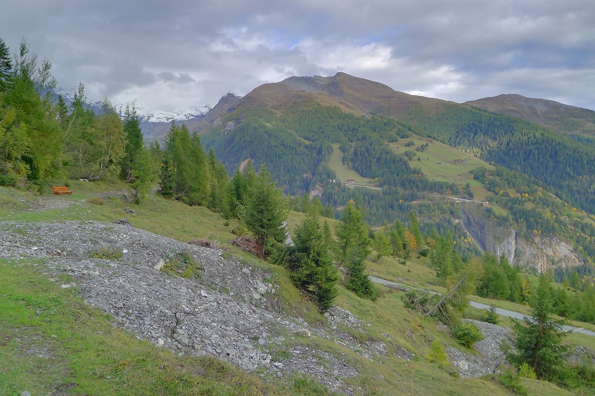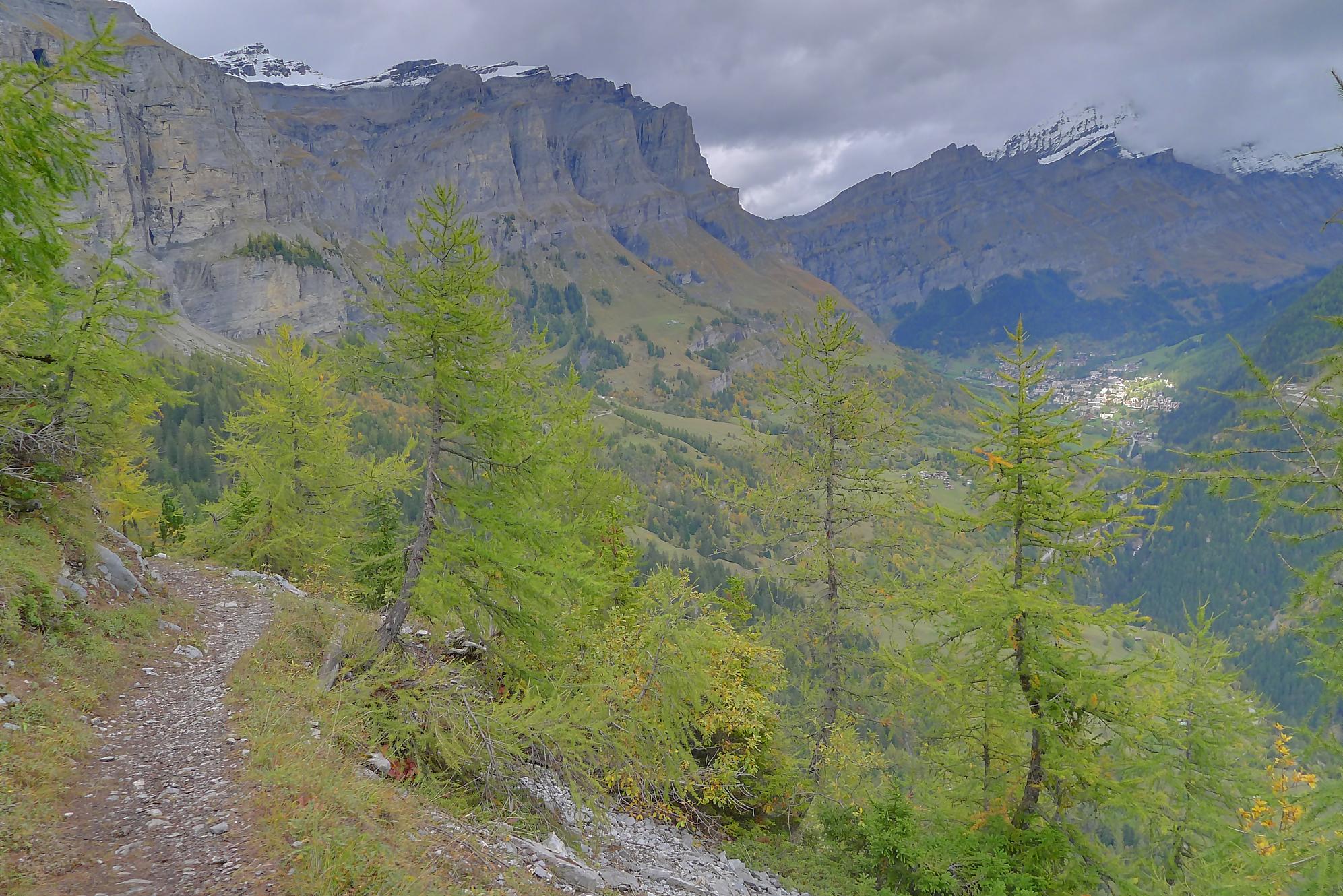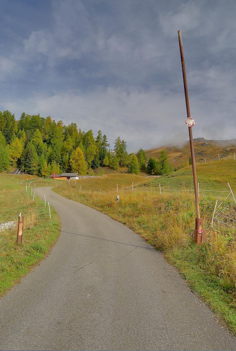 Après ce passage, suffisamment long pour l’apprécier, une longue section, style route forestière en pente très douce et vite à travers la forêt. Les mélèzes cèdent la place aux feuillus, parés de leurs couleurs automnales. Belle variété. Mon idée était de descendre par Birchen pour rejoindre l’arrêt du bus (Leukerbad-Birchen), repéré au Pt1318 sur Google Map. En arrivant à ce point (un pont de la route), aucun arrêt de bus, merci Google Map. Donc il me reste 20 min pour rejoindre Leukerbad à travers champ et à l’entrée du village (ville même), je trouve l’arrêt Leukerbad – Briggu, 6 min avant le passage du bus.