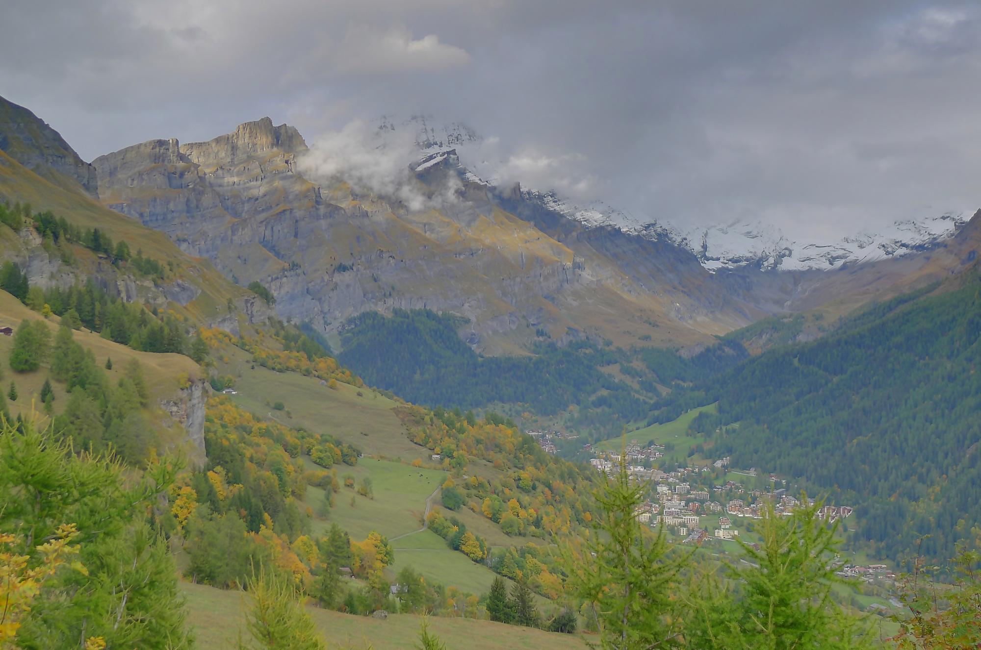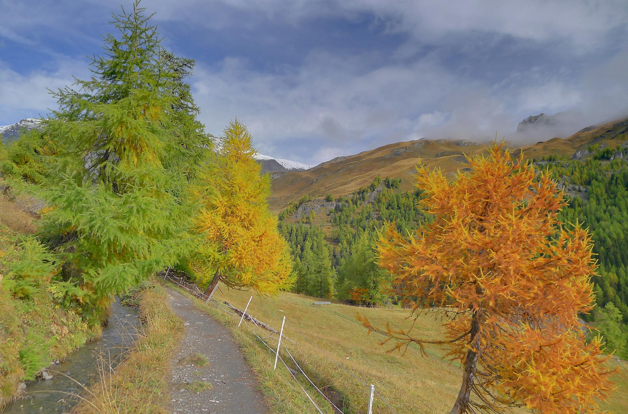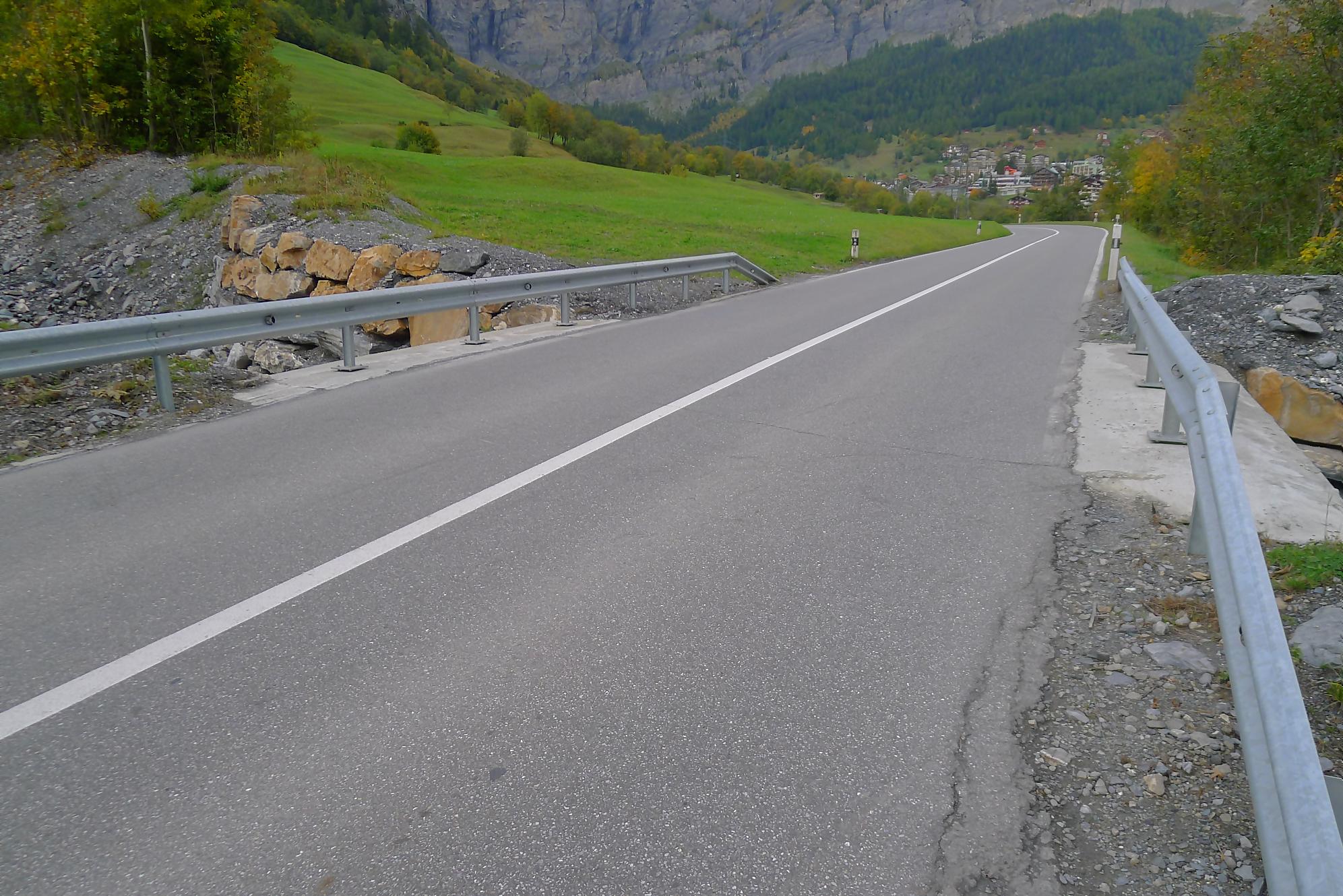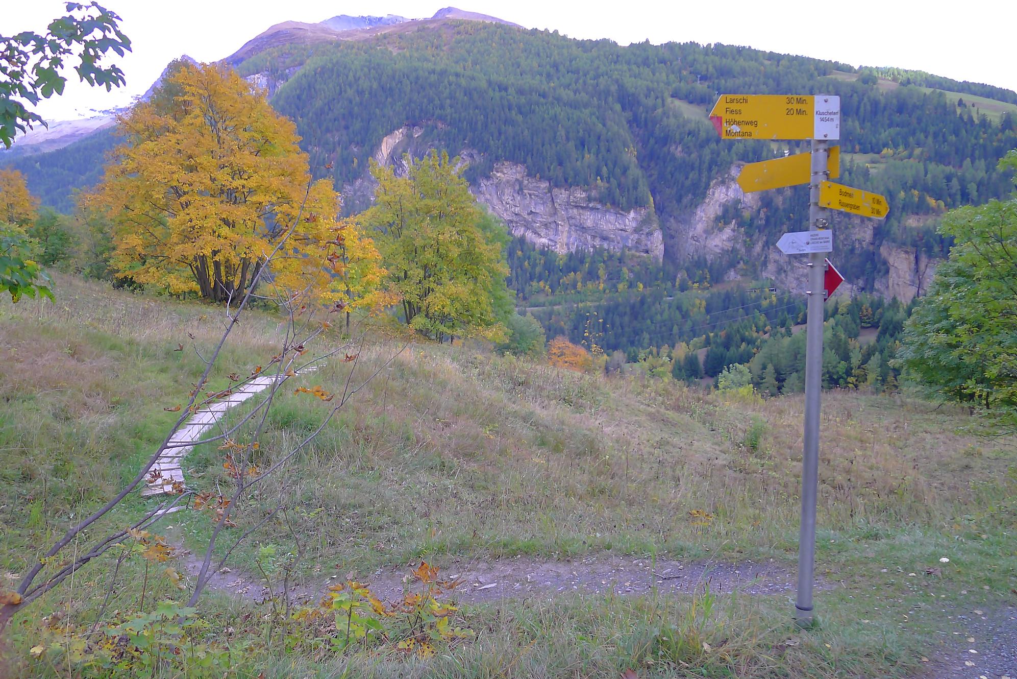 Après ce passage, suffisamment long pour l’apprécier, une longue section, style route forestière en pente très douce et vite à travers la forêt. Les mélèzes cèdent la place aux feuillus, parés de leurs couleurs automnales. Belle variété. Mon idée était de descendre par Birchen pour rejoindre l’arrêt du bus (Leukerbad-Birchen), repéré au Pt1318 sur Google Map. En arrivant à ce point (un pont de la route), aucun arrêt de bus, merci Google Map. Donc il me reste 20 min pour rejoindre Leukerbad à travers champ et à l’entrée du village (ville même), je trouve l’arrêt Leukerbad – Briggu, 6 min avant le passage du bus.