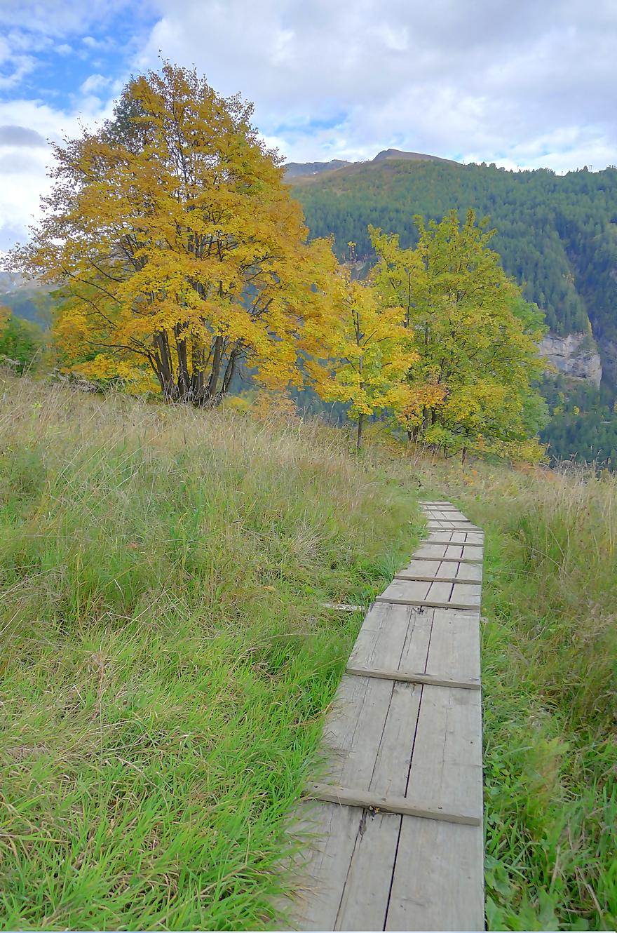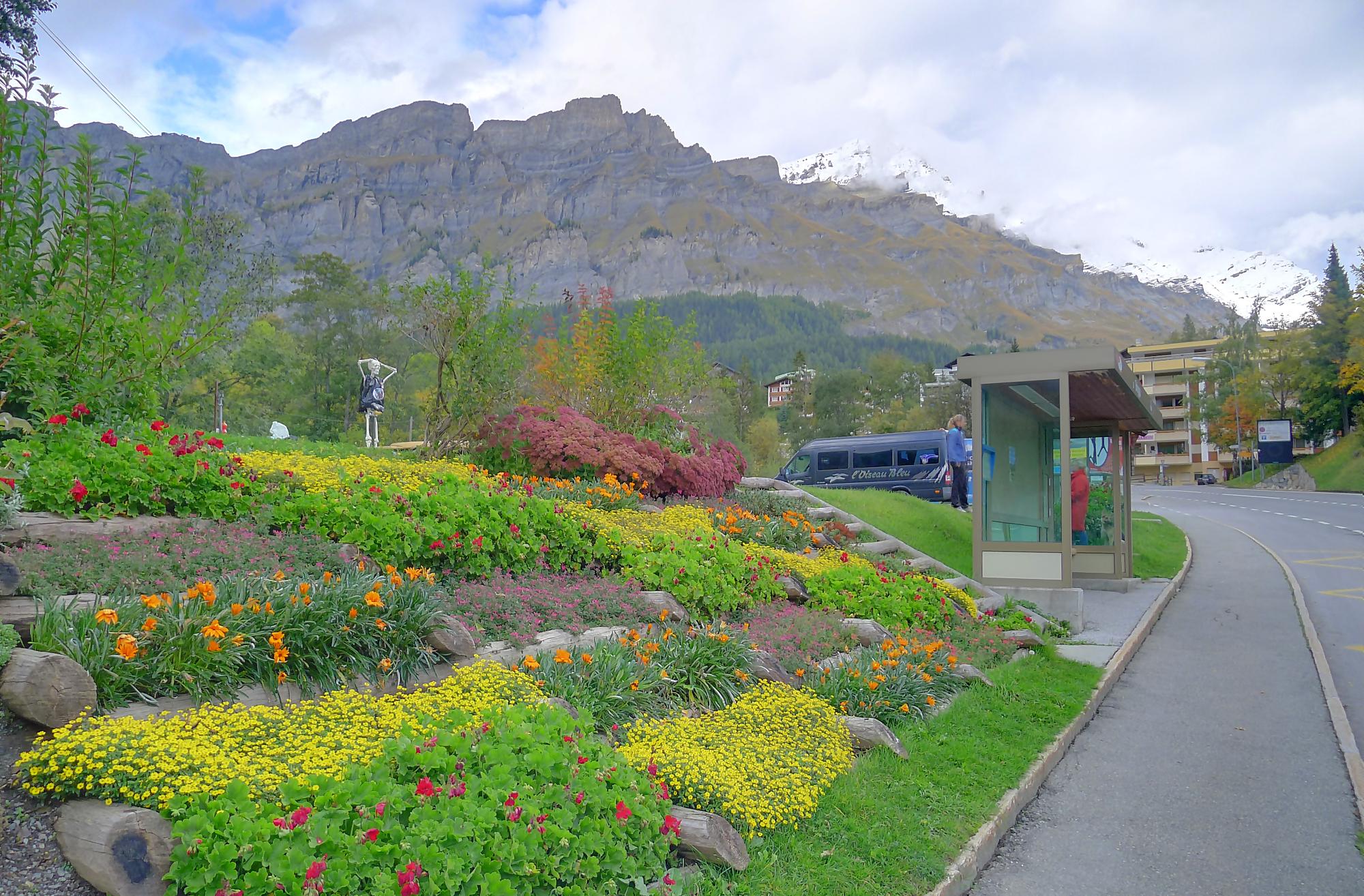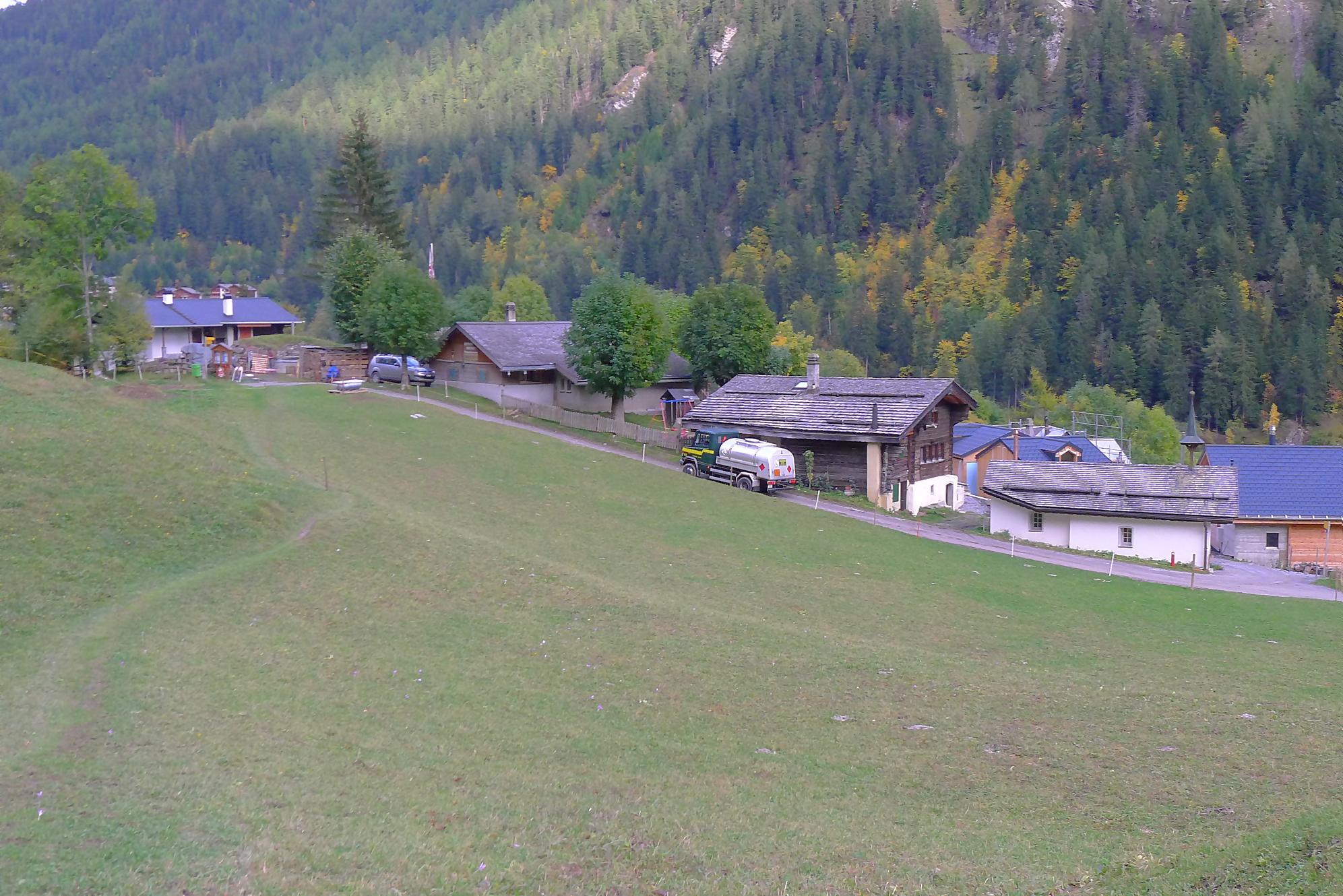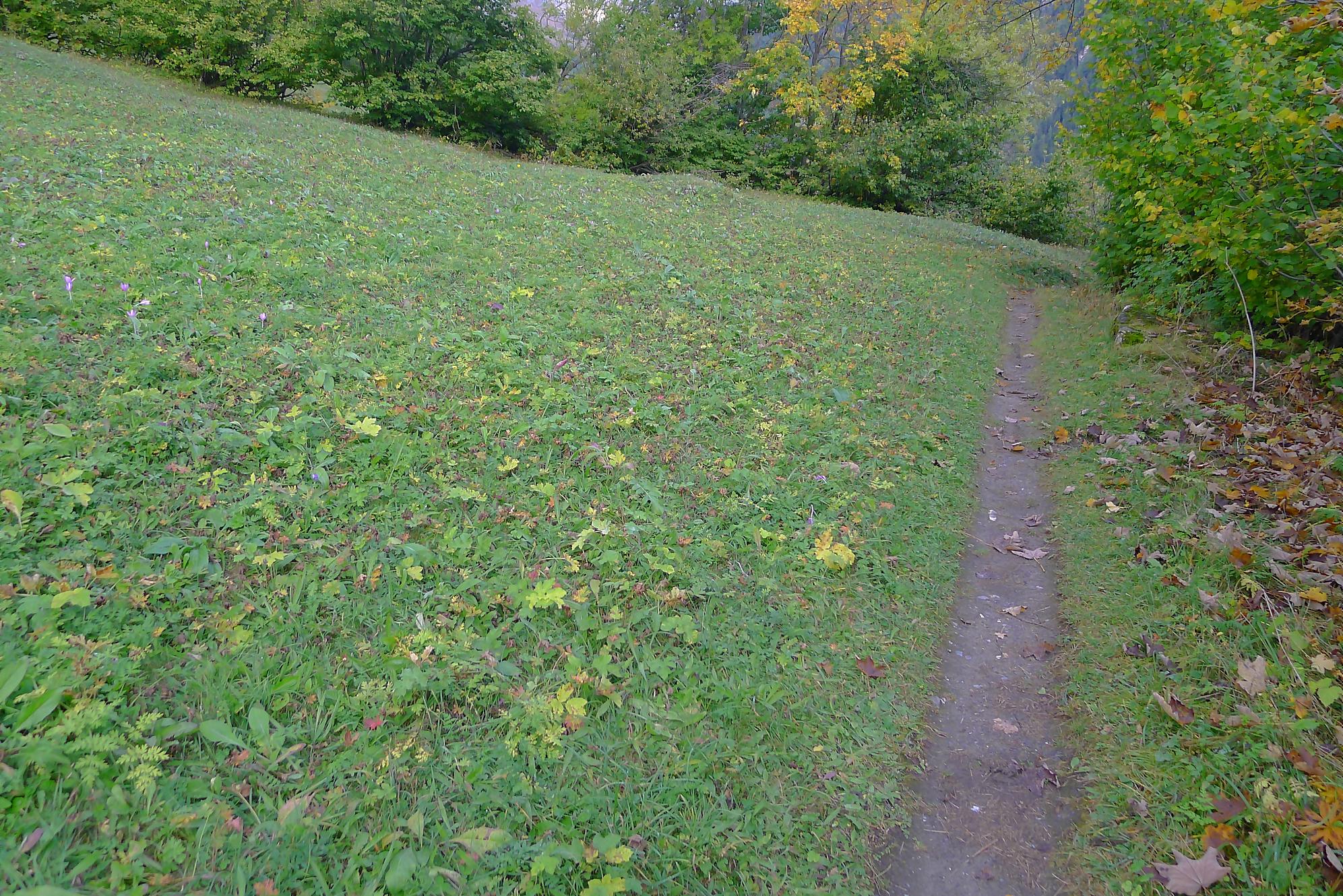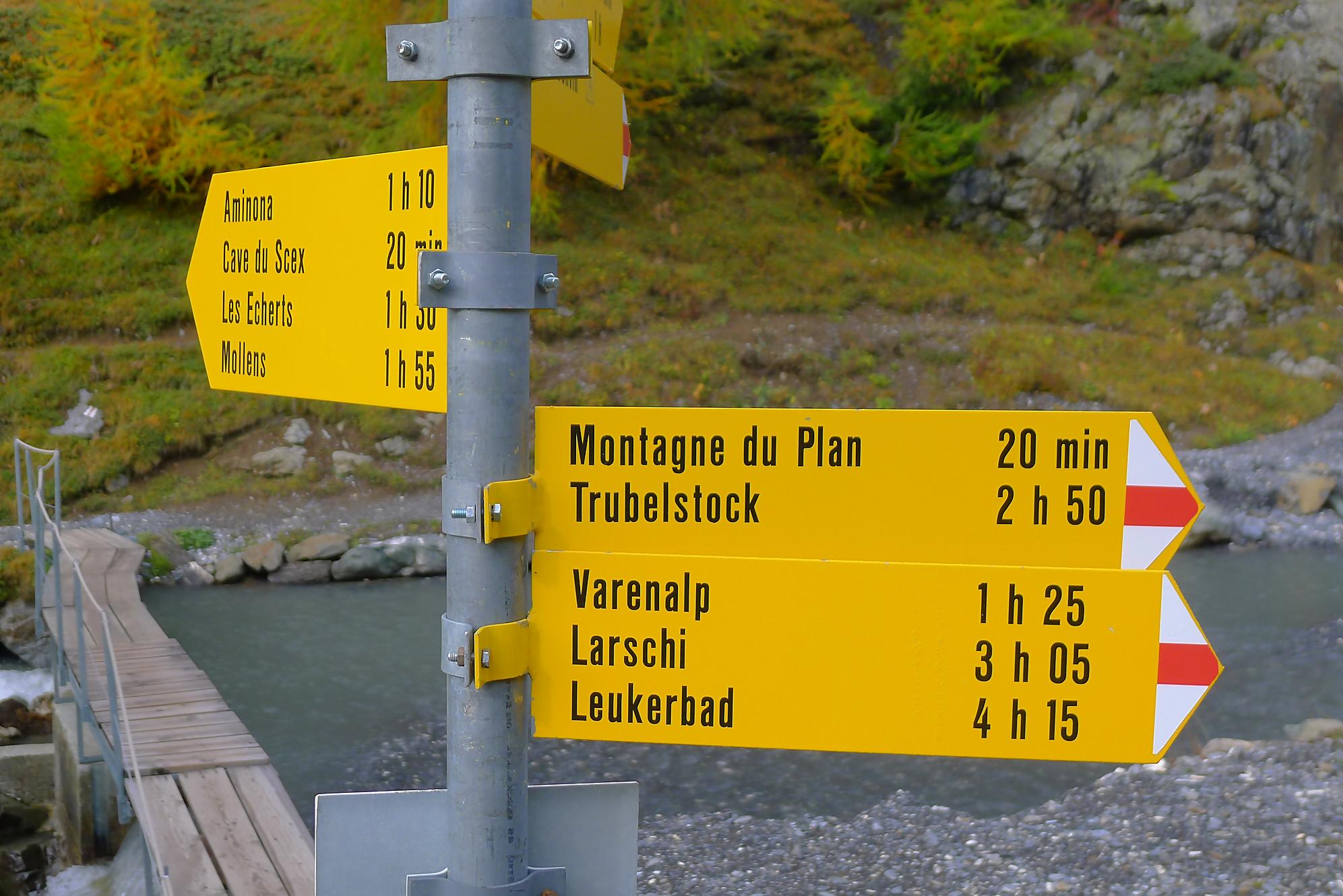 Après ce passage, suffisamment long pour l’apprécier, une longue section, style route forestière en pente très douce et vite à travers la forêt. Les mélèzes cèdent la place aux feuillus, parés de leurs couleurs automnales. Belle variété. Mon idée était de descendre par Birchen pour rejoindre l’arrêt du bus (Leukerbad-Birchen), repéré au Pt1318 sur Google Map. En arrivant à ce point (un pont de la route), aucun arrêt de bus, merci Google Map. Donc il me reste 20 min pour rejoindre Leukerbad à travers champ et à l’entrée du village (ville même), je trouve l’arrêt Leukerbad – Briggu, 6 min avant le passage du bus.