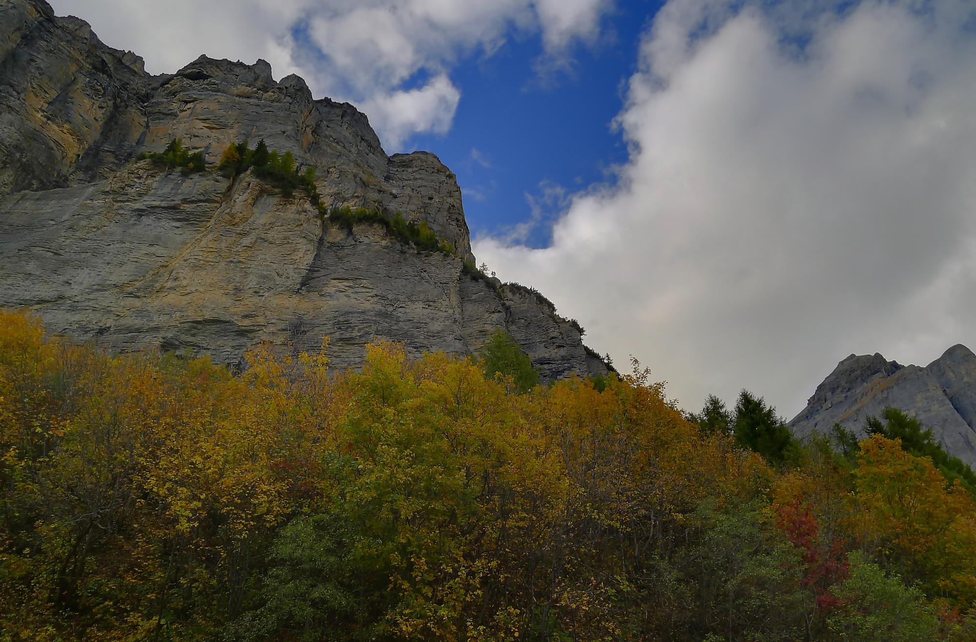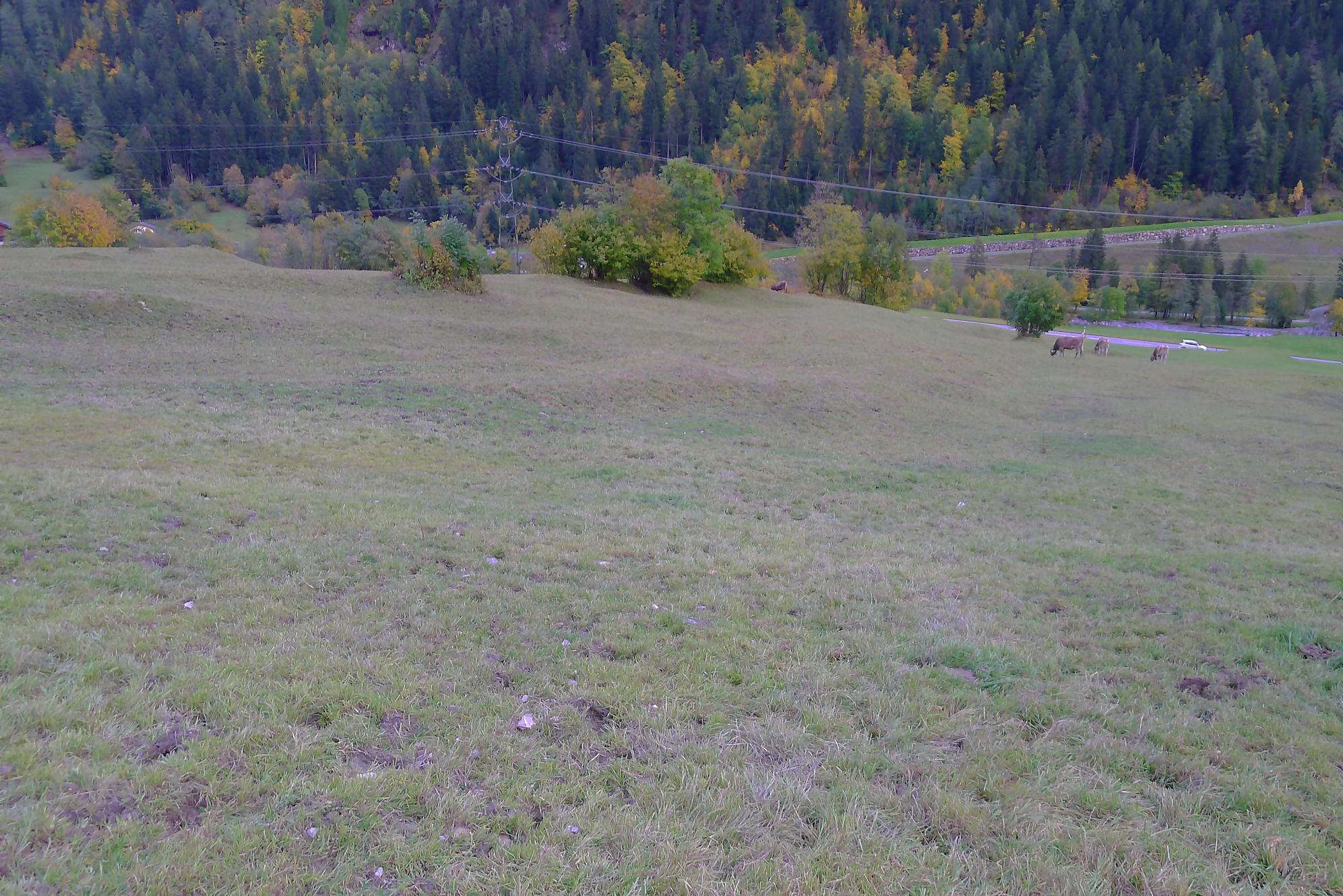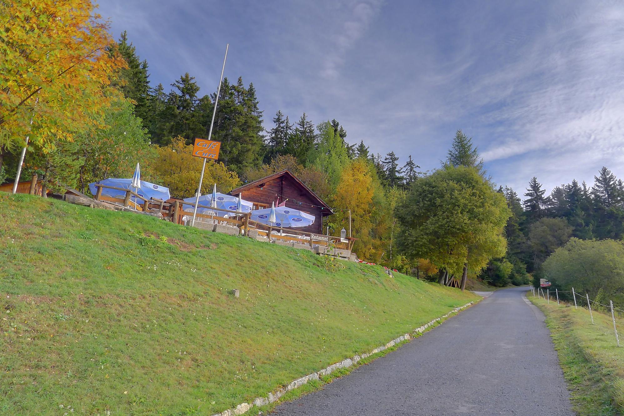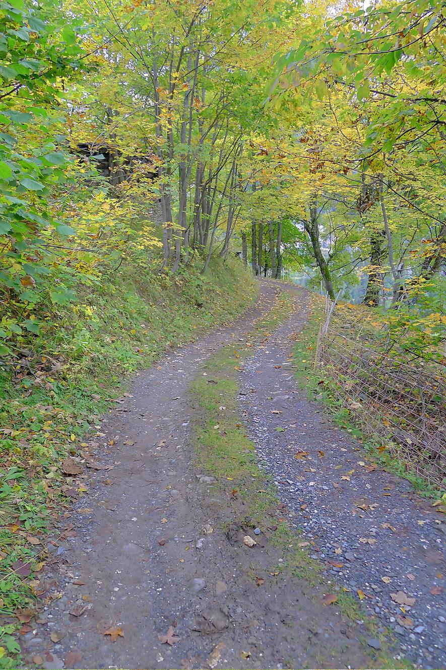 Après ce passage, suffisamment long pour l’apprécier, une longue section, style route forestière en pente très douce et vite à travers la forêt. Les mélèzes cèdent la place aux feuillus, parés de leurs couleurs automnales. Belle variété. Mon idée était de descendre par Birchen pour rejoindre l’arrêt du bus (Leukerbad-Birchen), repéré au Pt1318 sur Google Map. En arrivant à ce point (un pont de la route), aucun arrêt de bus, merci Google Map. Donc il me reste 20 min pour rejoindre Leukerbad à travers champ et à l’entrée du village (ville même), je trouve l’arrêt Leukerbad – Briggu, 6 min avant le passage du bus.