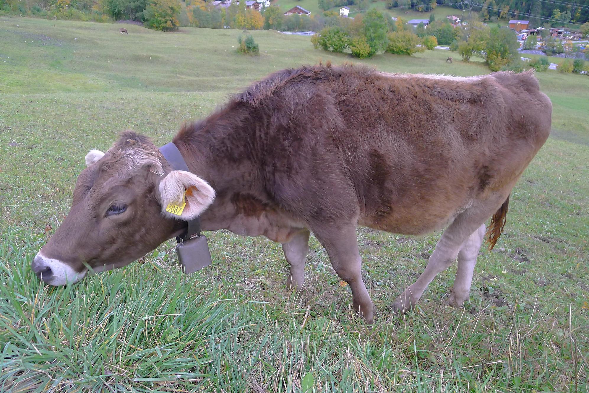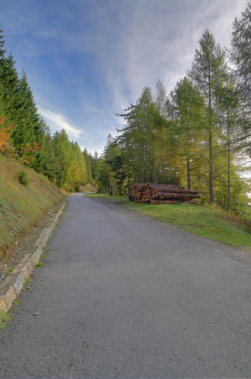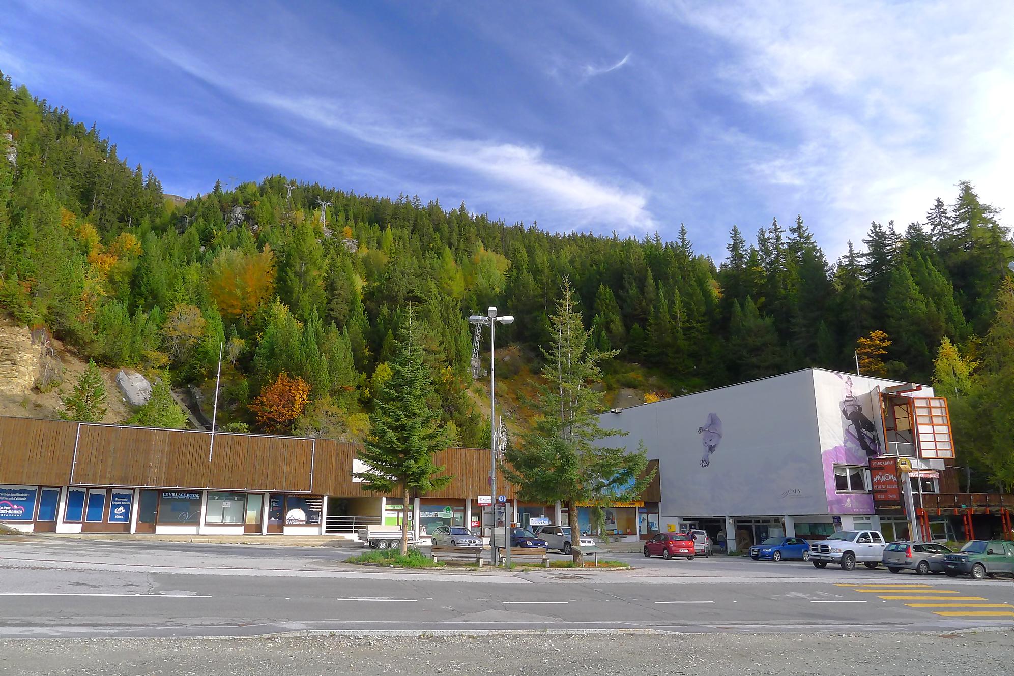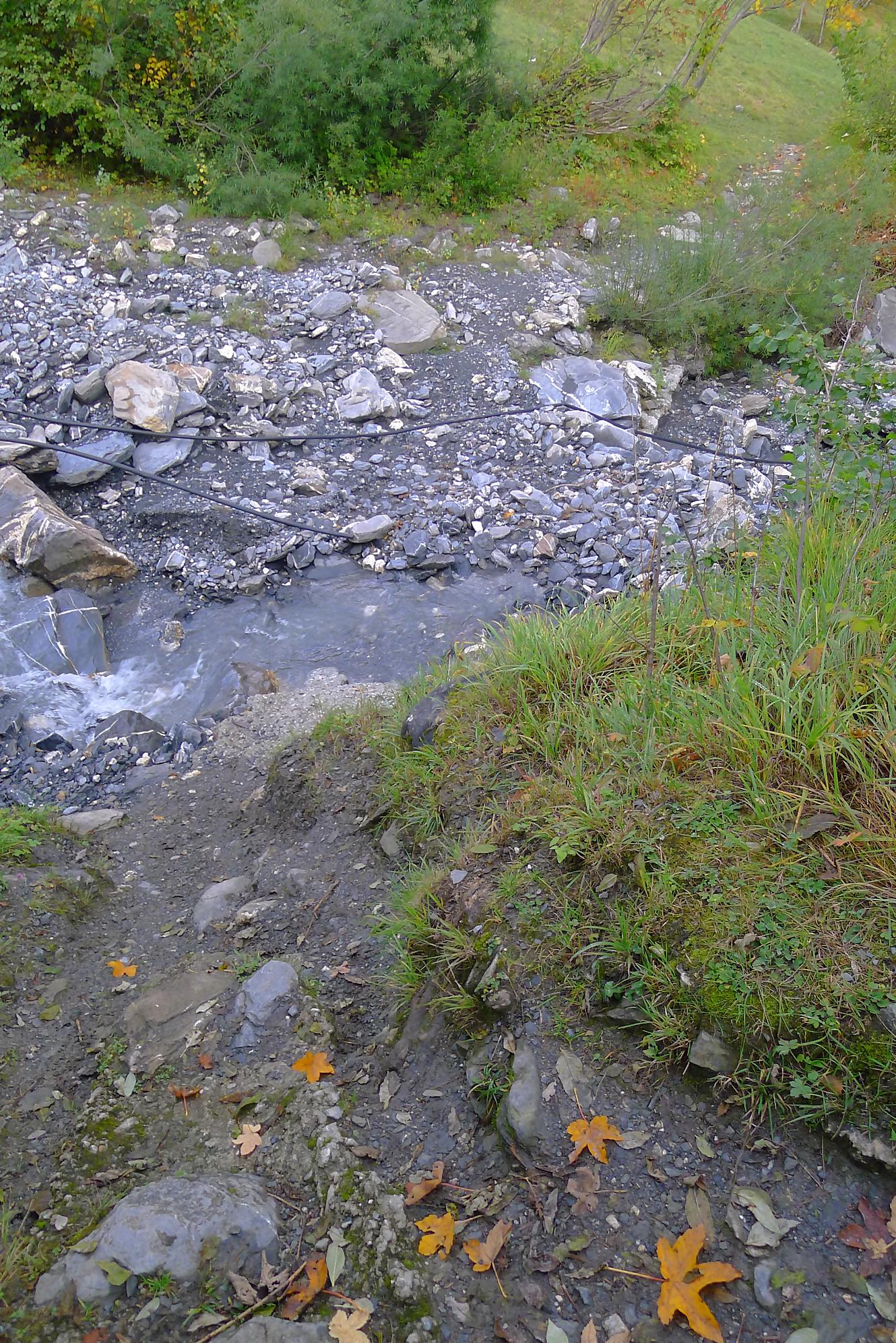 Après ce passage, suffisamment long pour l’apprécier, une longue section, style route forestière en pente très douce et vite à travers la forêt. Les mélèzes cèdent la place aux feuillus, parés de leurs couleurs automnales. Belle variété. Mon idée était de descendre par Birchen pour rejoindre l’arrêt du bus (Leukerbad-Birchen), repéré au Pt1318 sur Google Map. En arrivant à ce point (un pont de la route), aucun arrêt de bus, merci Google Map. Donc il me reste 20 min pour rejoindre Leukerbad à travers champ et à l’entrée du village (ville même), je trouve l’arrêt Leukerbad – Briggu, 6 min avant le passage du bus.
