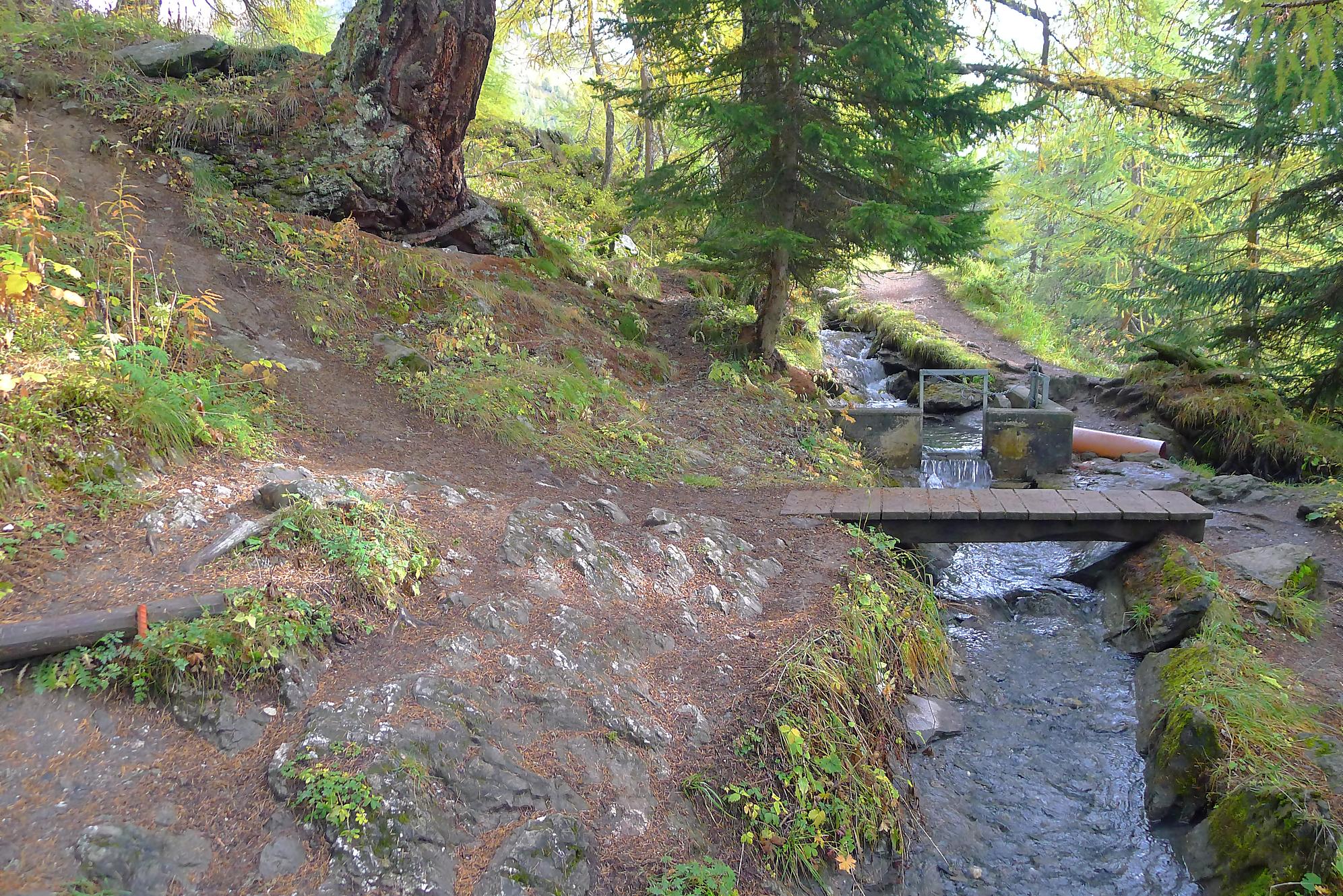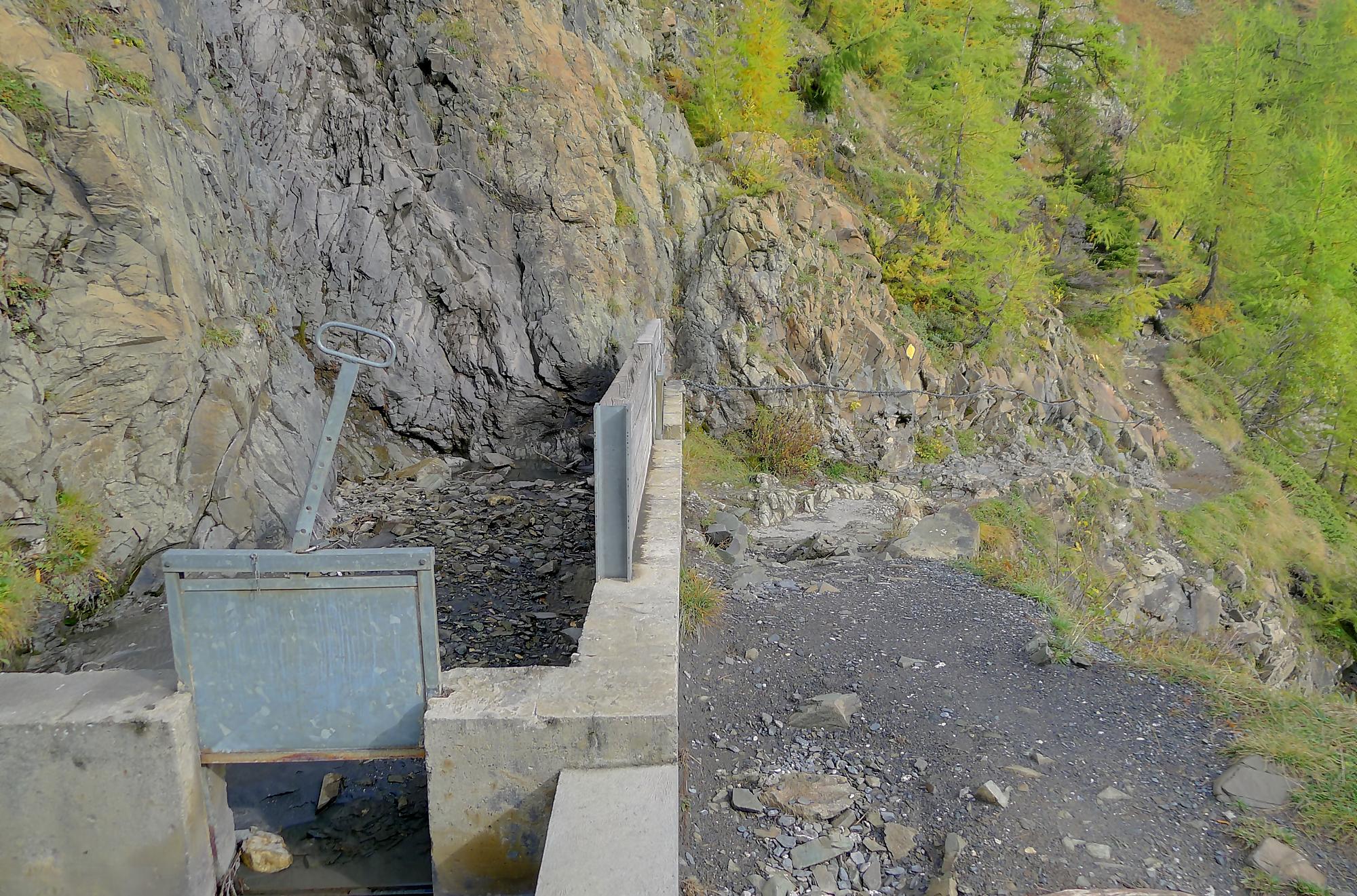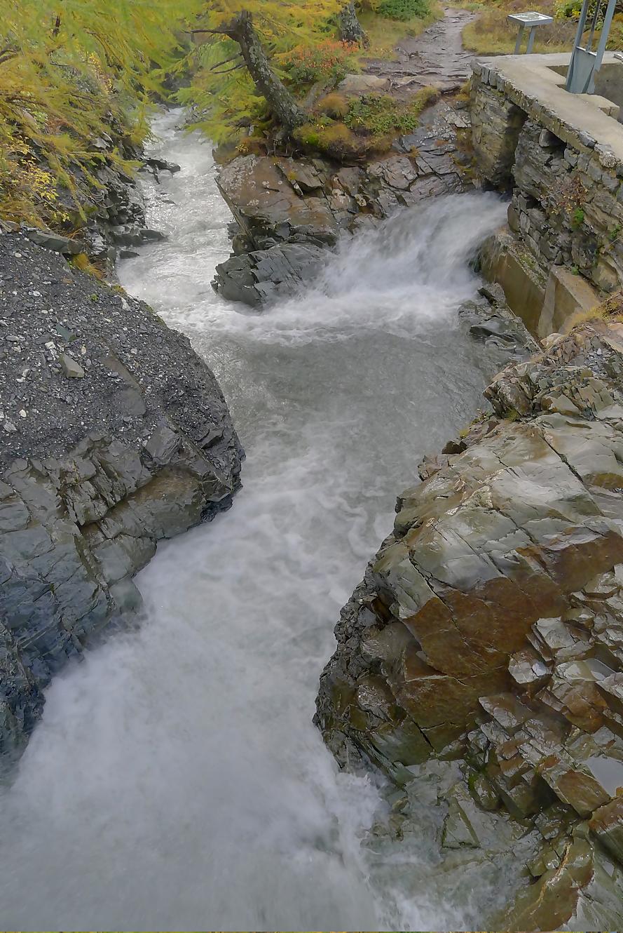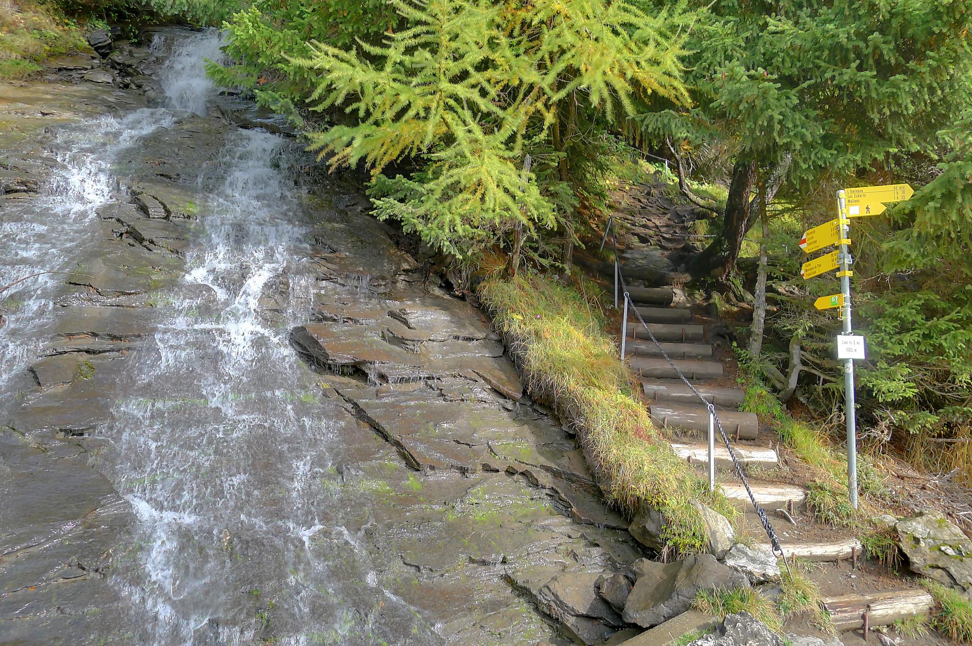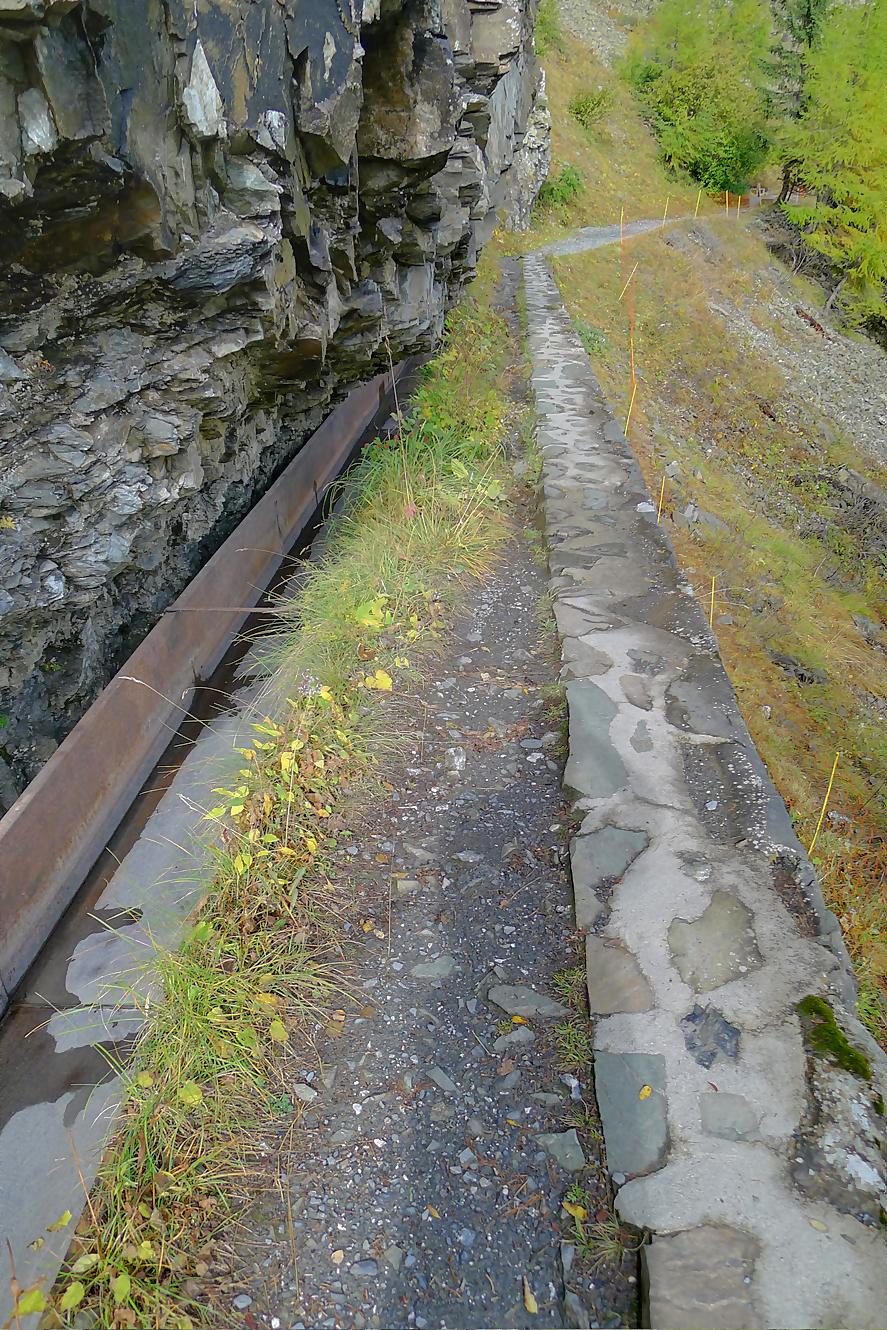 Après Cave du Sex, je suis la fin (ou début) du Bisse du Tsitorret, donc passage doux, excepté la montée finale, pentue, via des escaliers en bois, le long de la gorge de La Tièche (très jolie). Ce cours d’eau marque la frontière linguistique et me voilà en suisse-allemande !