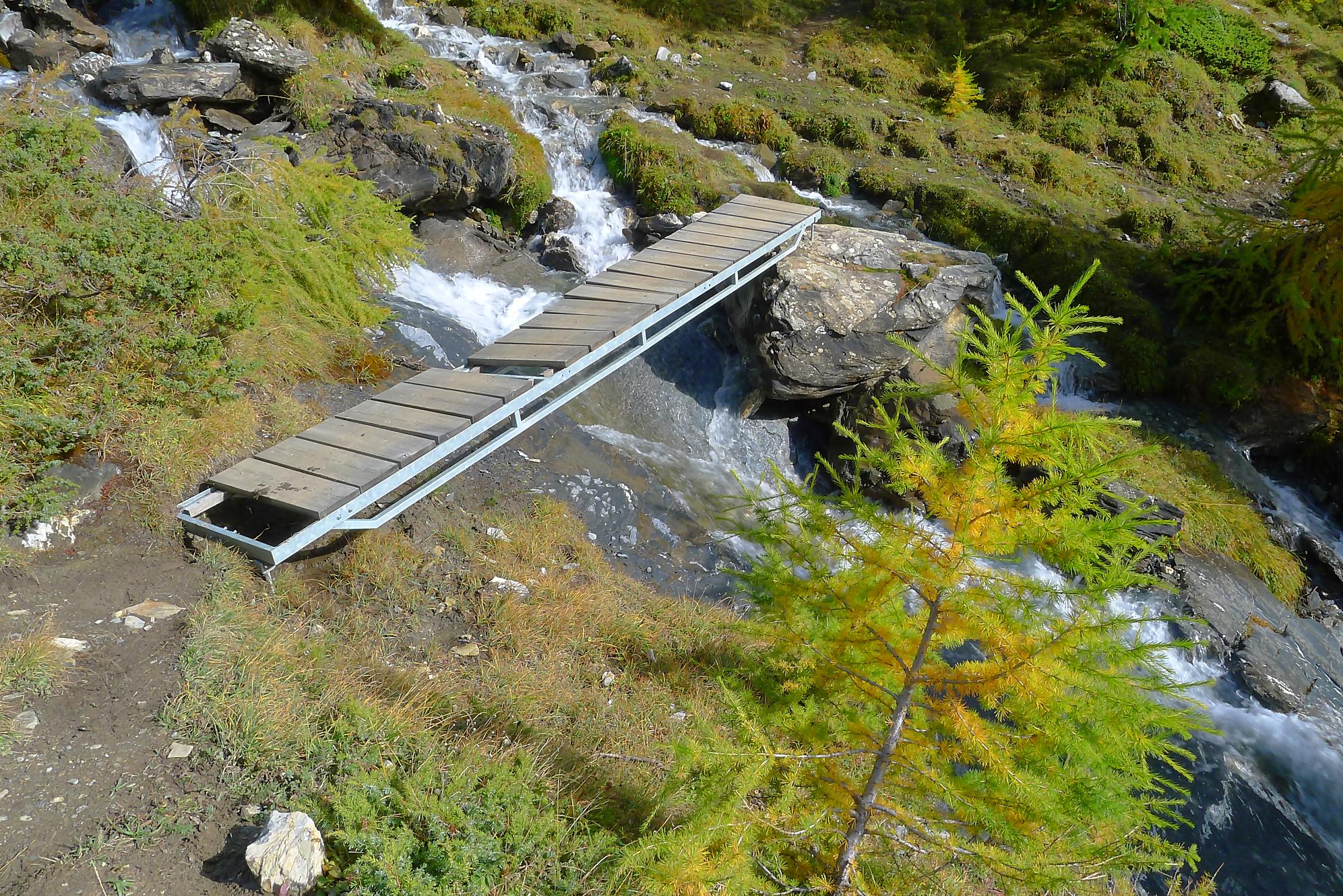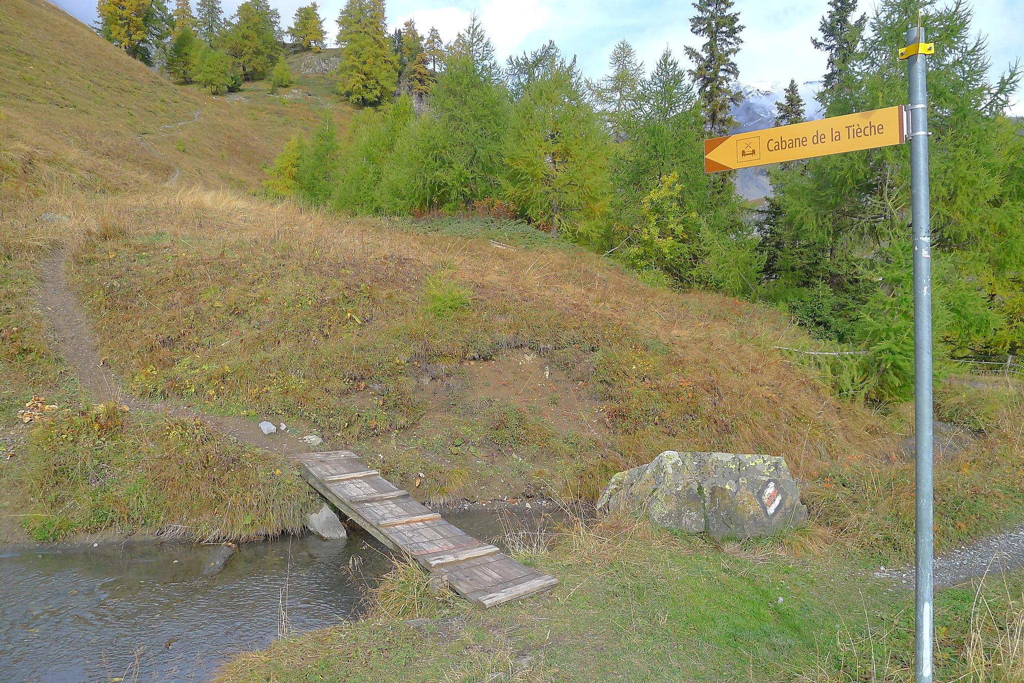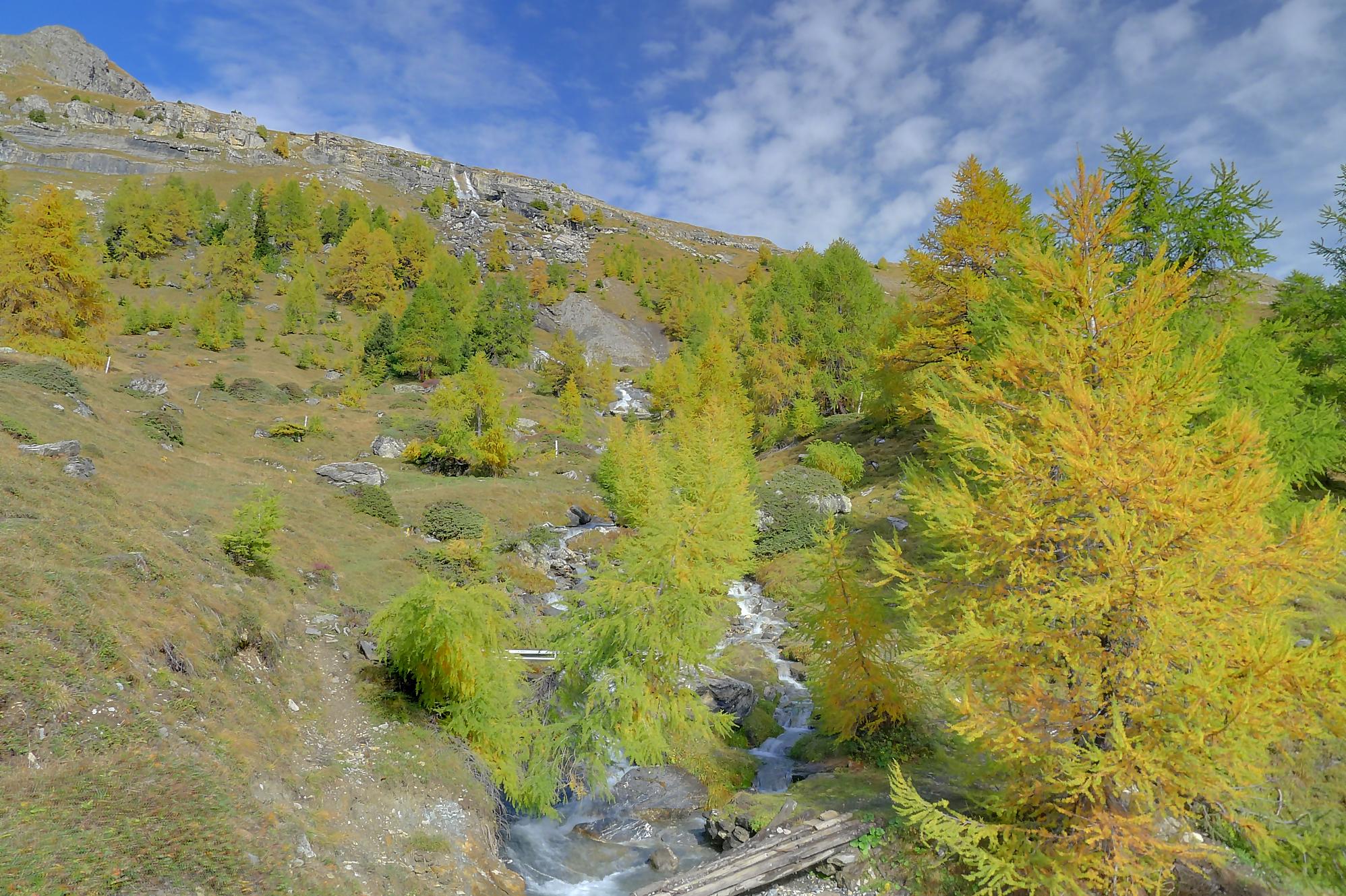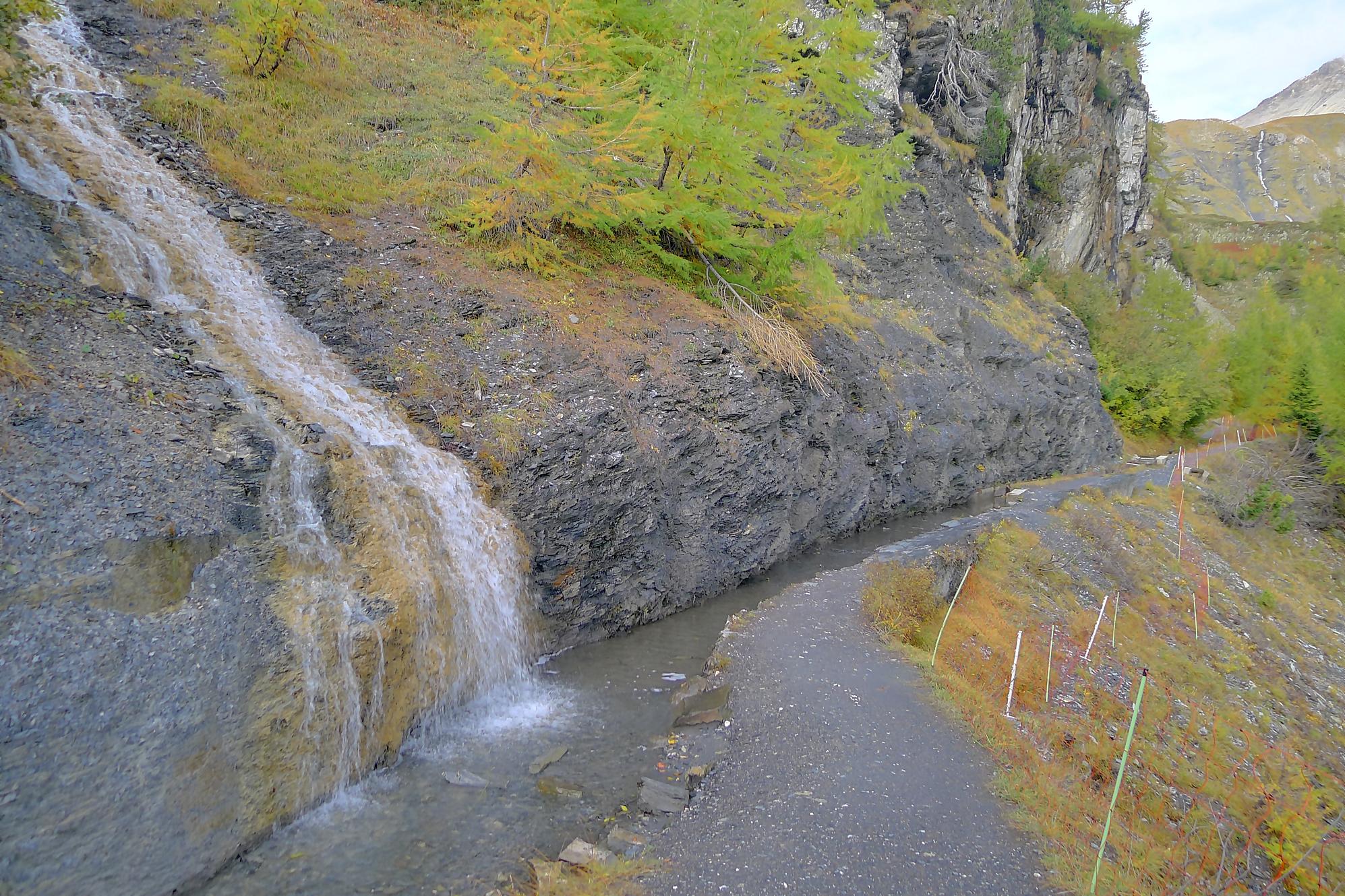 Après Cave du Sex, je suis la fin (ou début) du Bisse du Tsitorret, donc passage doux, excepté la montée finale, pentue, via des escaliers en bois, le long de la gorge de La Tièche (très jolie). Ce cours d’eau marque la frontière linguistique et me voilà en suisse-allemande !