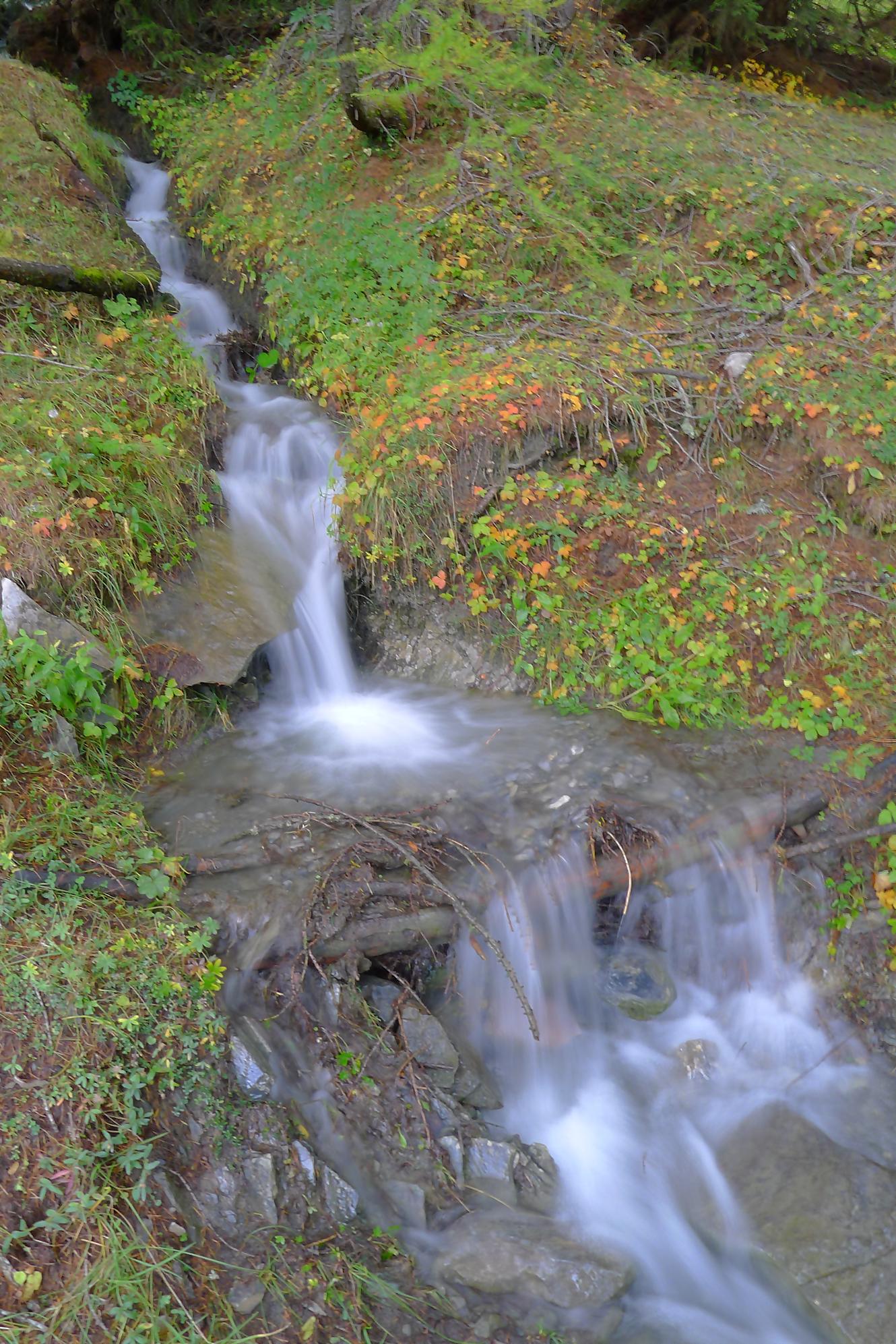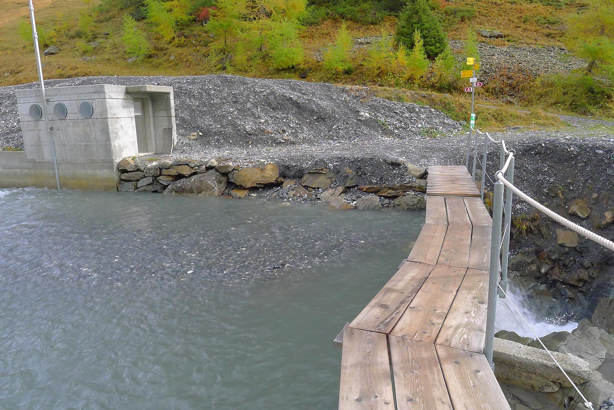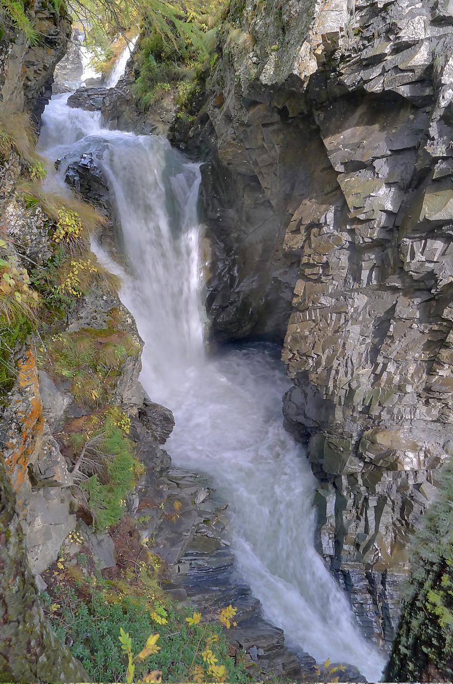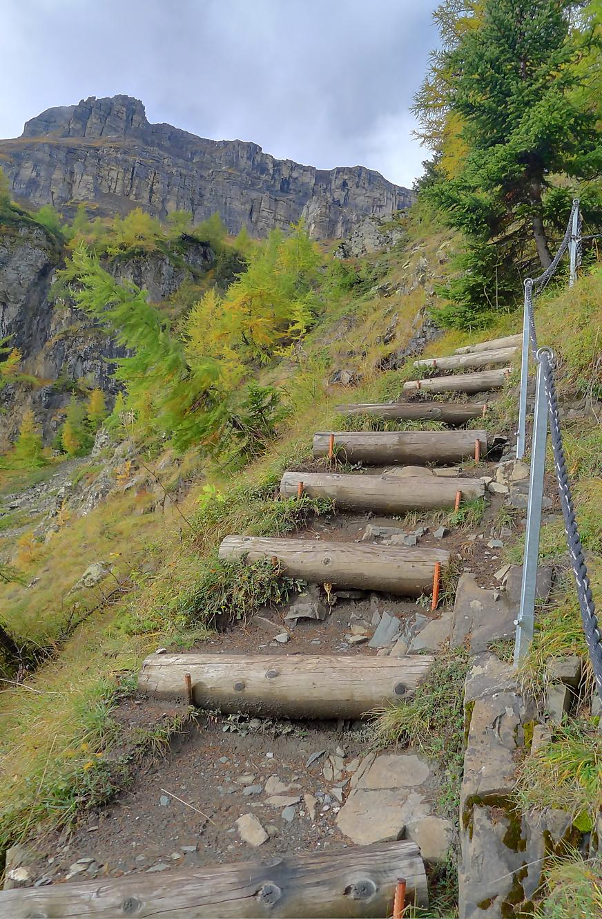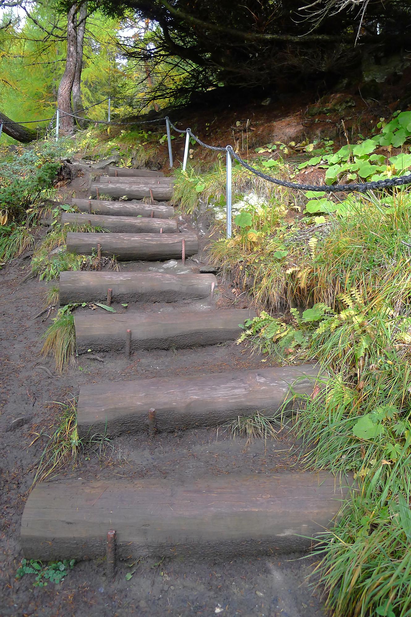 Après Cave du Sex, je suis la fin (ou début) du Bisse du Tsitorret, donc passage doux, excepté la montée finale, pentue, via des escaliers en bois, le long de la gorge de La Tièche (très jolie). Ce cours d’eau marque la frontière linguistique et me voilà en suisse-allemande !