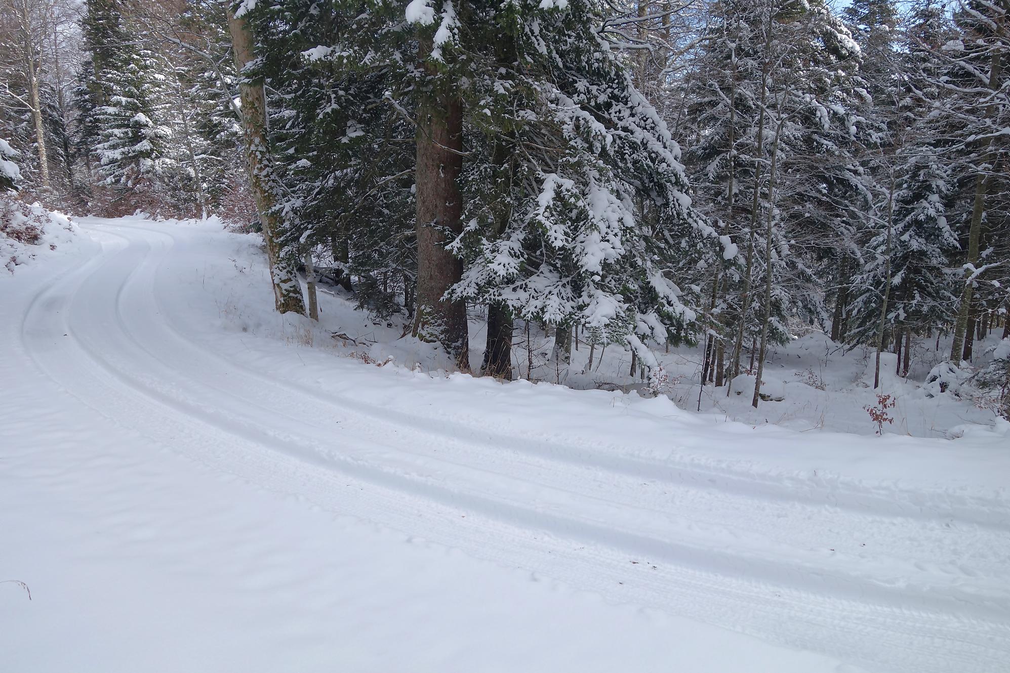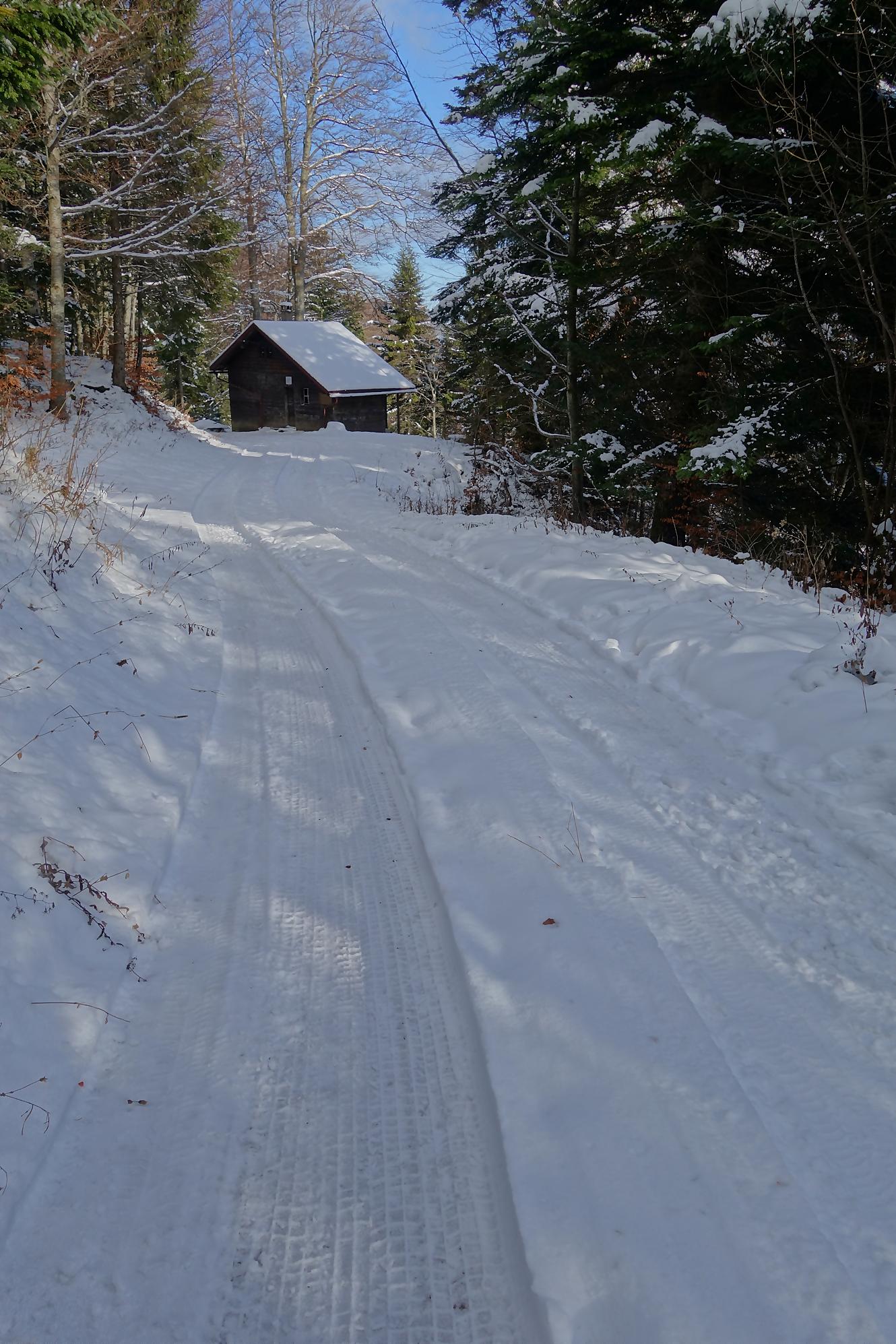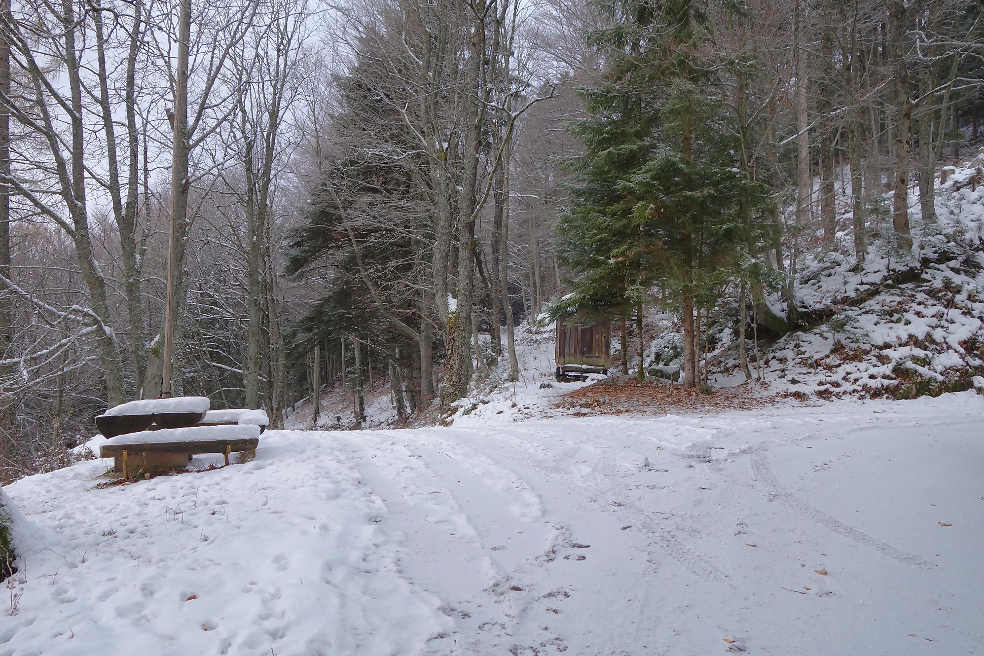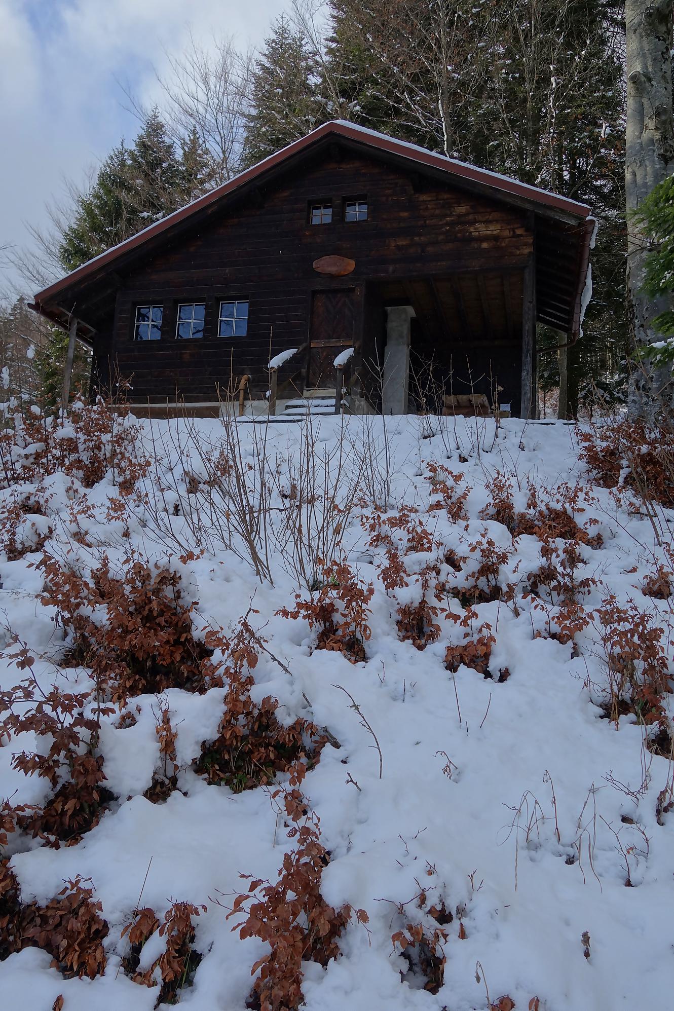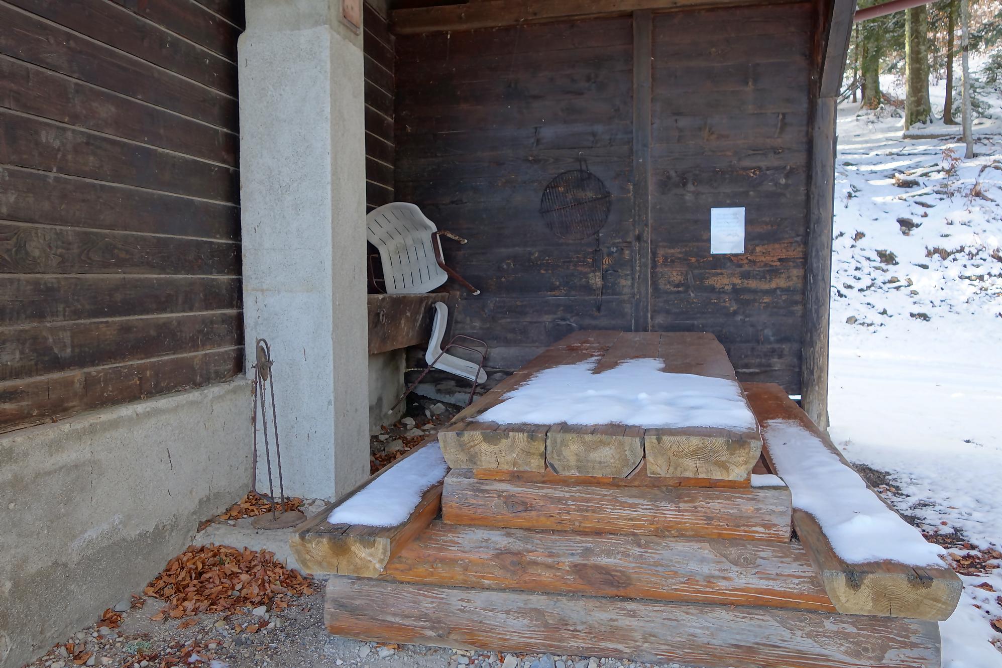 Pour la descente, voyant l’heure tourner, je prends la décision de couper court la route qui serpente trop à mon gout. Après un peu de hors piste, je fus surpris de trouver un chemin forestier droit en bas. En raquettes, ce fut un plaisir … et rapide ! A la route, vers 1150m, je file voir le Refuge Bon Accueil au Pt1112. Un porche avec une table et des bancs m’offrent une pause. J’enlève les raquettes et poursuis par la route. Au Contour du Quévrat, 1032m, je cherche un moyen de couper court, peu engageant, il faut poursuivre un brin la route et une section raide permet de retrouver un chemin plus bas.