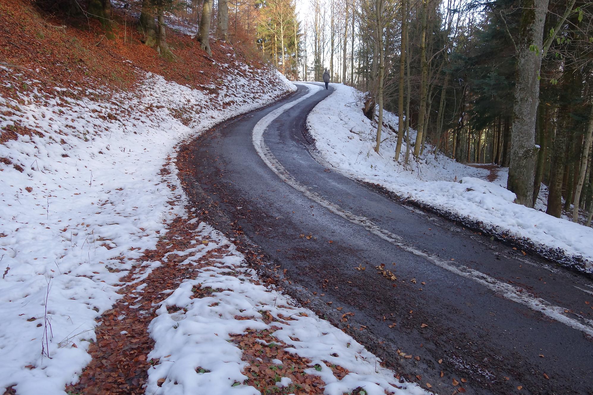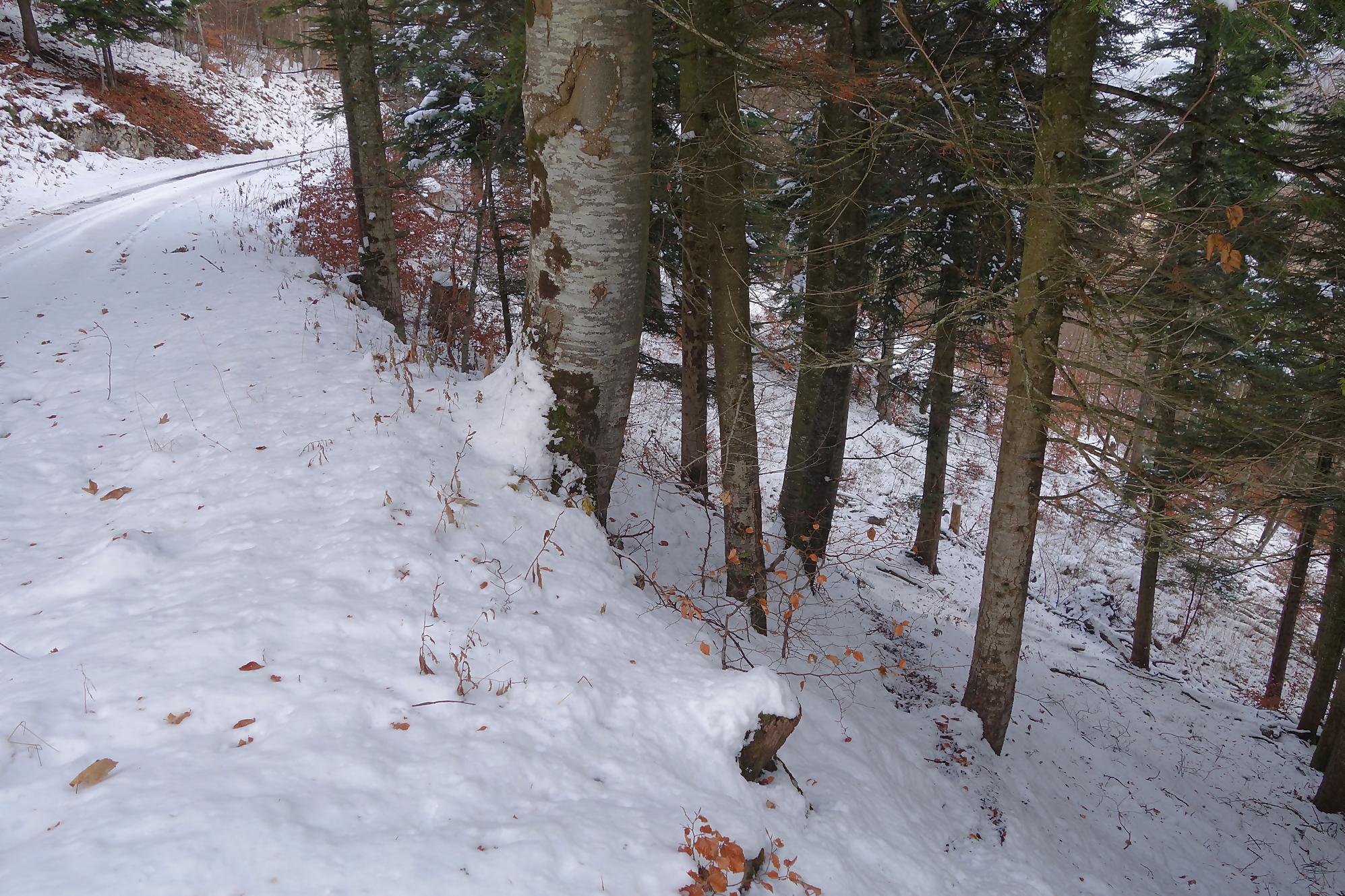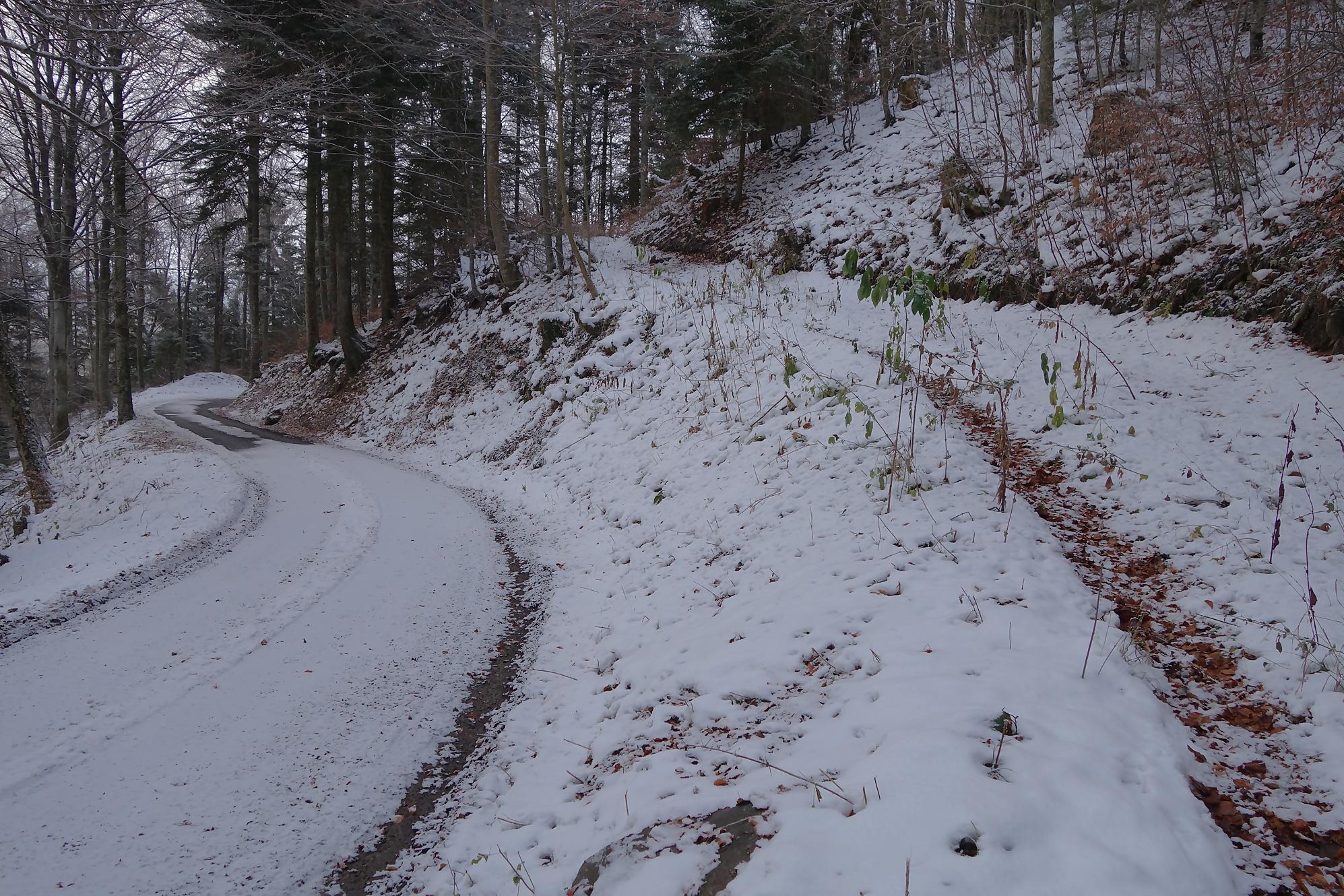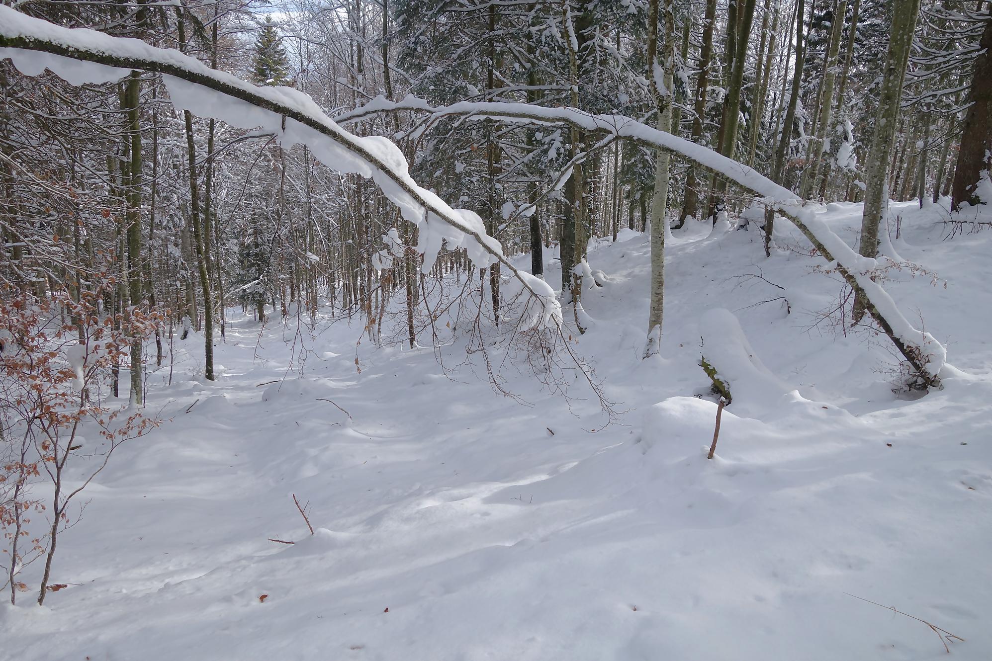 Pour la descente, voyant l’heure tourner, je prends la décision de couper court la route qui serpente trop à mon gout. Après un peu de hors piste, je fus surpris de trouver un chemin forestier droit en bas. En raquettes, ce fut un plaisir … et rapide ! A la route, vers 1150m, je file voir le Refuge Bon Accueil au Pt1112. Un porche avec une table et des bancs m’offrent une pause. J’enlève les raquettes et poursuis par la route. Au Contour du Quévrat, 1032m, je cherche un moyen de couper court, peu engageant, il faut poursuivre un brin la route et une section raide permet de retrouver un chemin plus bas.