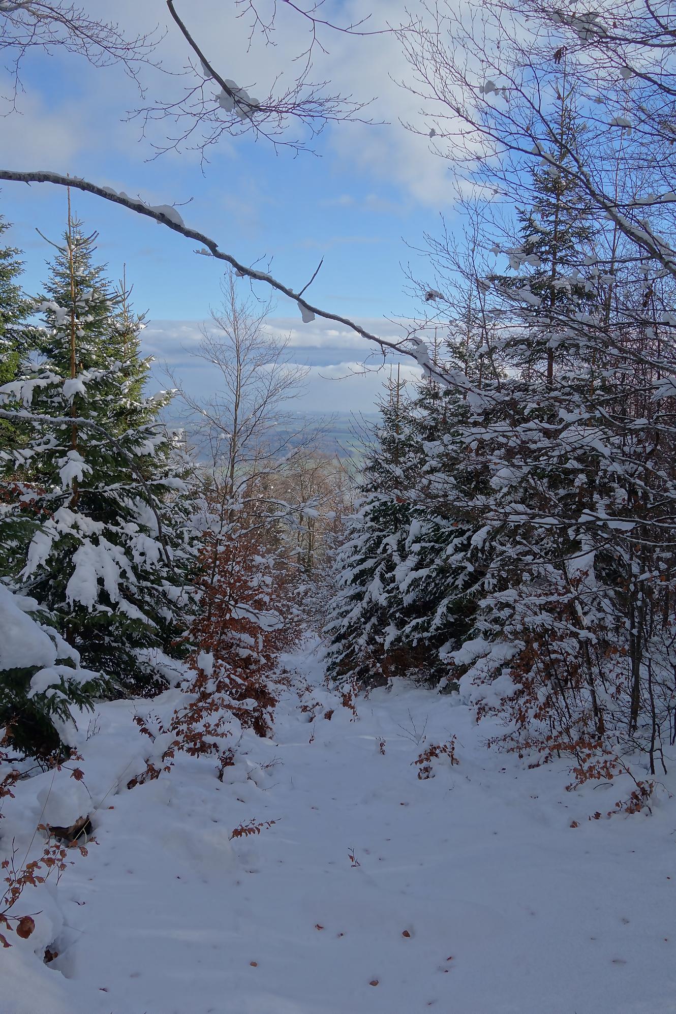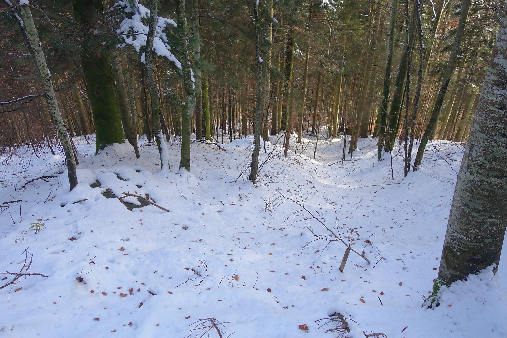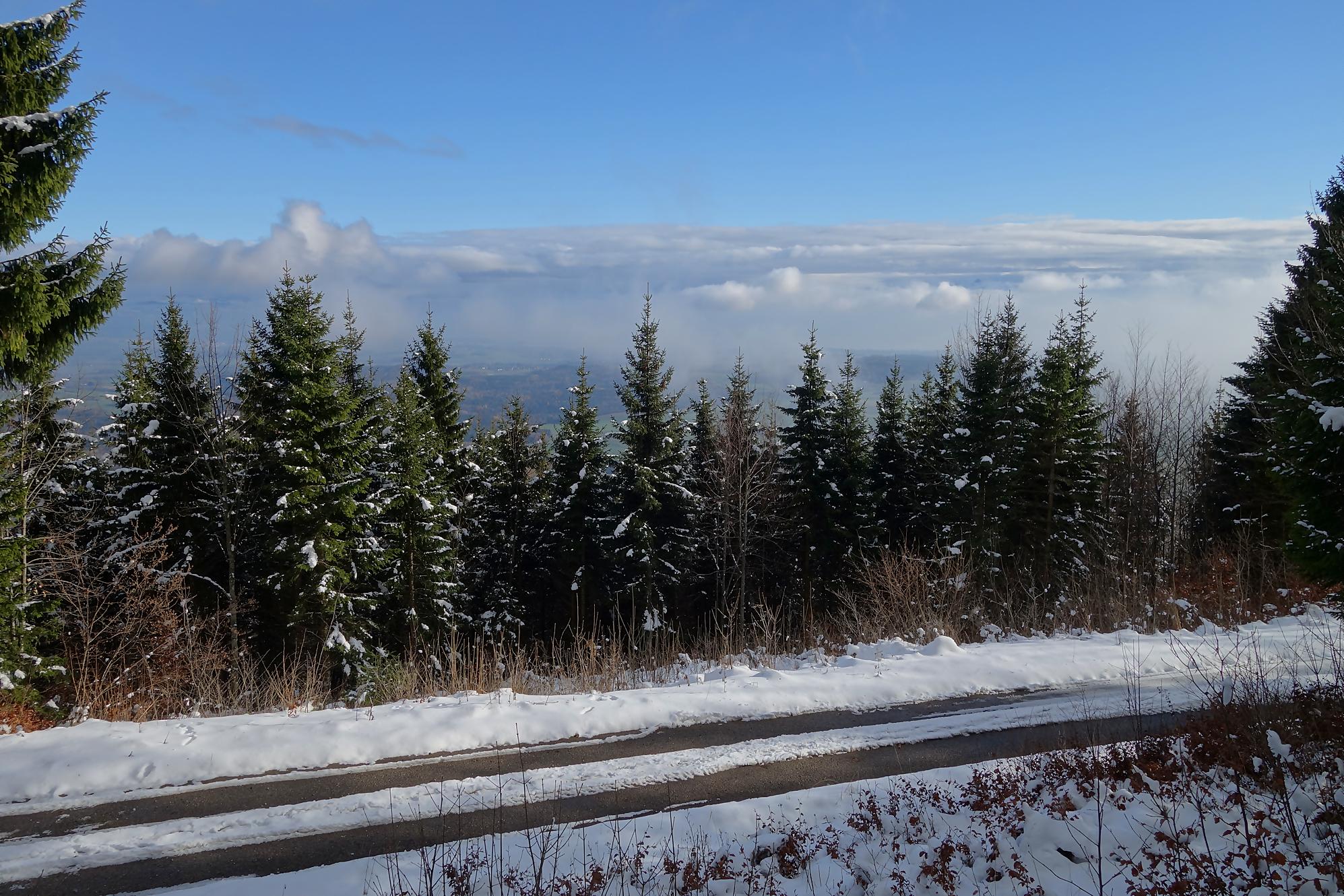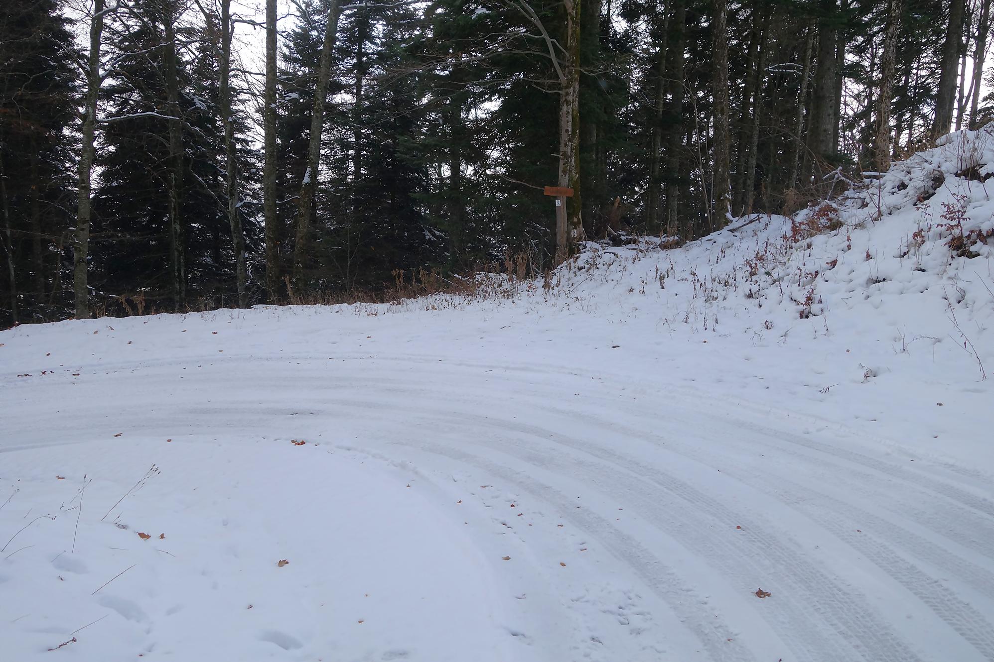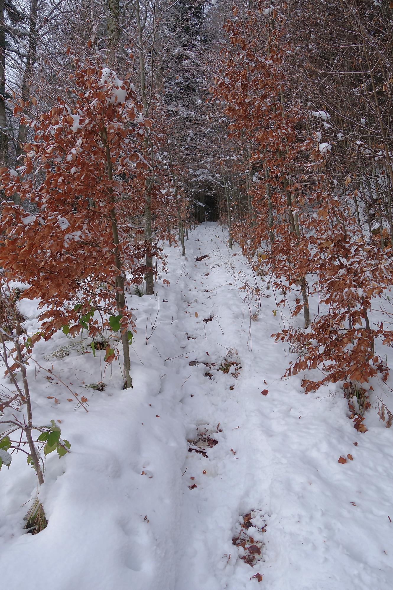 Pour la descente, voyant l’heure tourner, je prends la décision de couper court la route qui serpente trop à mon gout. Après un peu de hors piste, je fus surpris de trouver un chemin forestier droit en bas. En raquettes, ce fut un plaisir … et rapide ! A la route, vers 1150m, je file voir le Refuge Bon Accueil au Pt1112. Un porche avec une table et des bancs m’offrent une pause. J’enlève les raquettes et poursuis par la route. Au Contour du Quévrat, 1032m, je cherche un moyen de couper court, peu engageant, il faut poursuivre un brin la route et une section raide permet de retrouver un chemin plus bas.