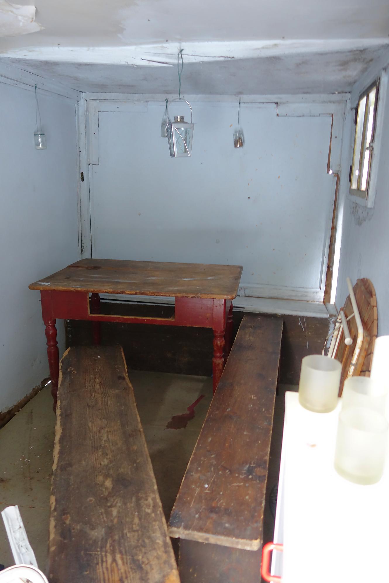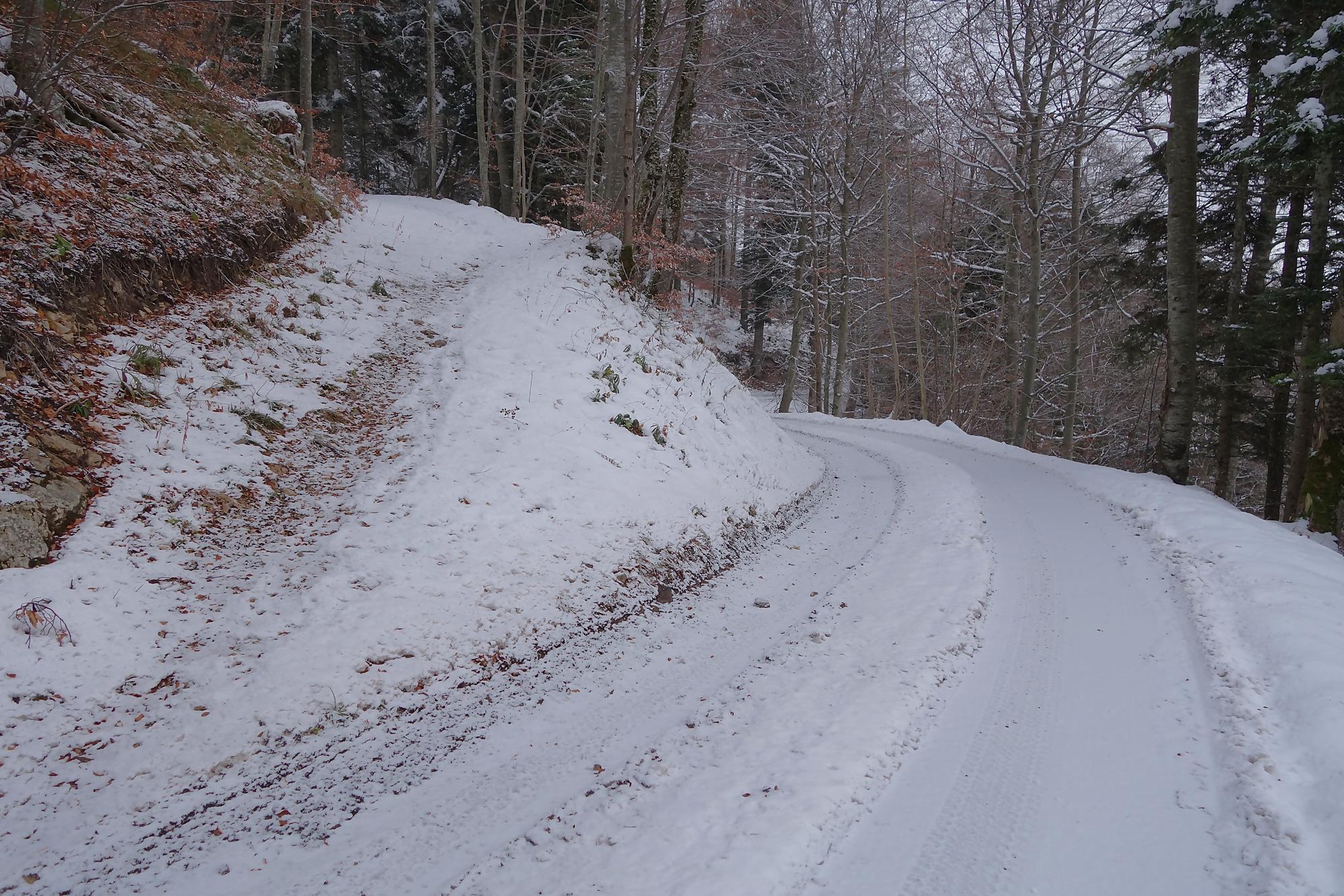 Par contre, je suis surpris du peu de neige, je mets donc les raquettes sur le sac et entame le début de la montée par la route, plutôt que par le chemin que je garde pour le retour. Je rejoins le chemin vers 880m et le suit. Au virage du Pt951 (Chemin de la Noyère), je découvre une jolie roulotte en bois où il est possible d’ouvrir la porte (en forçant un peu !). Sobre, mais mignon. Je profite de faire le tour, la route est creusé dans du calcaire, ce qui permet de voir les strates et plissements géologiques.
