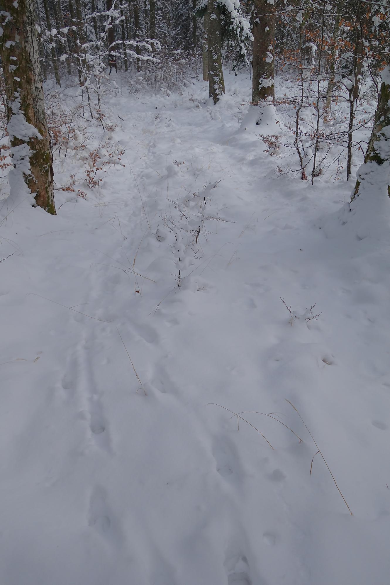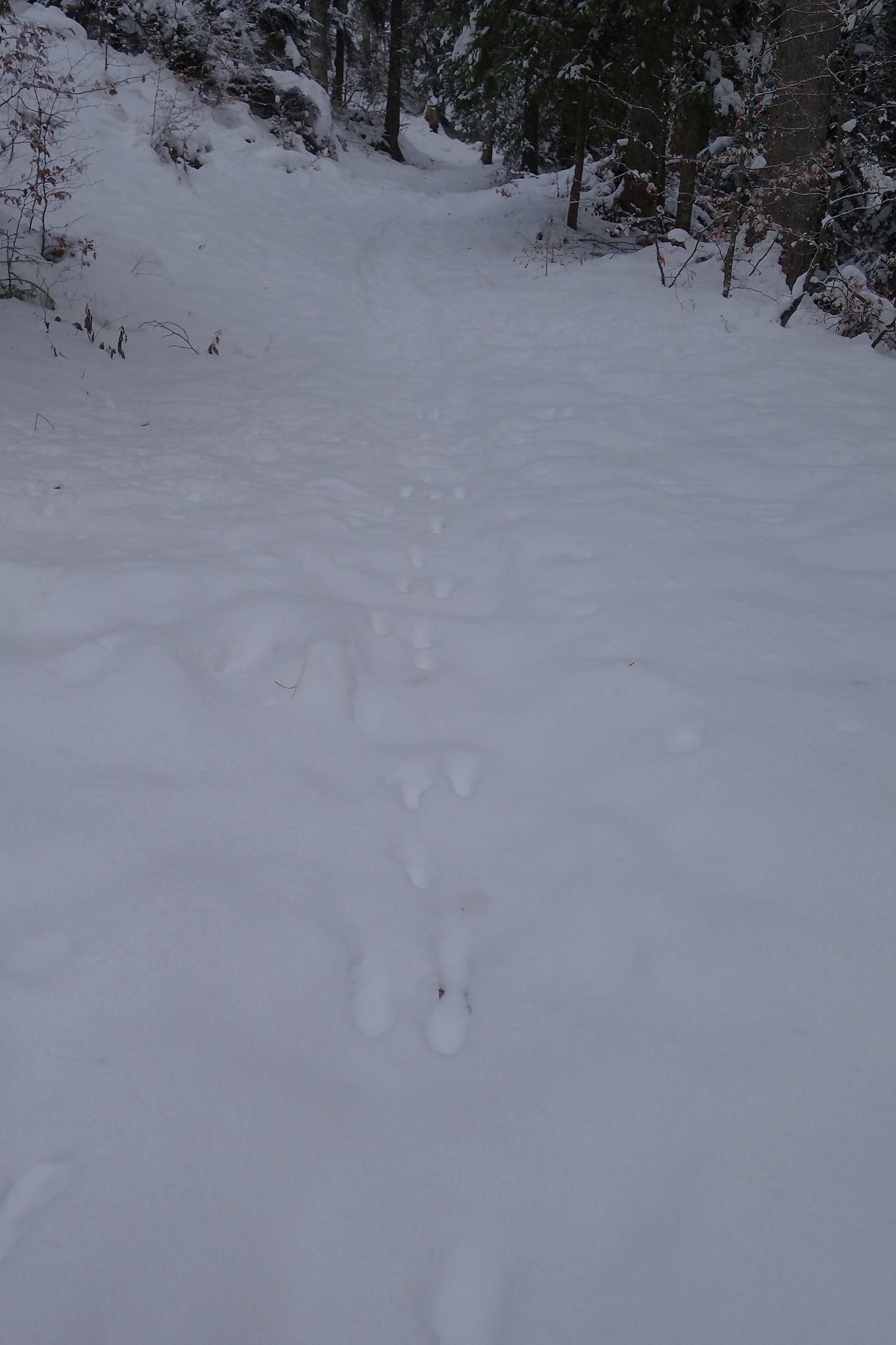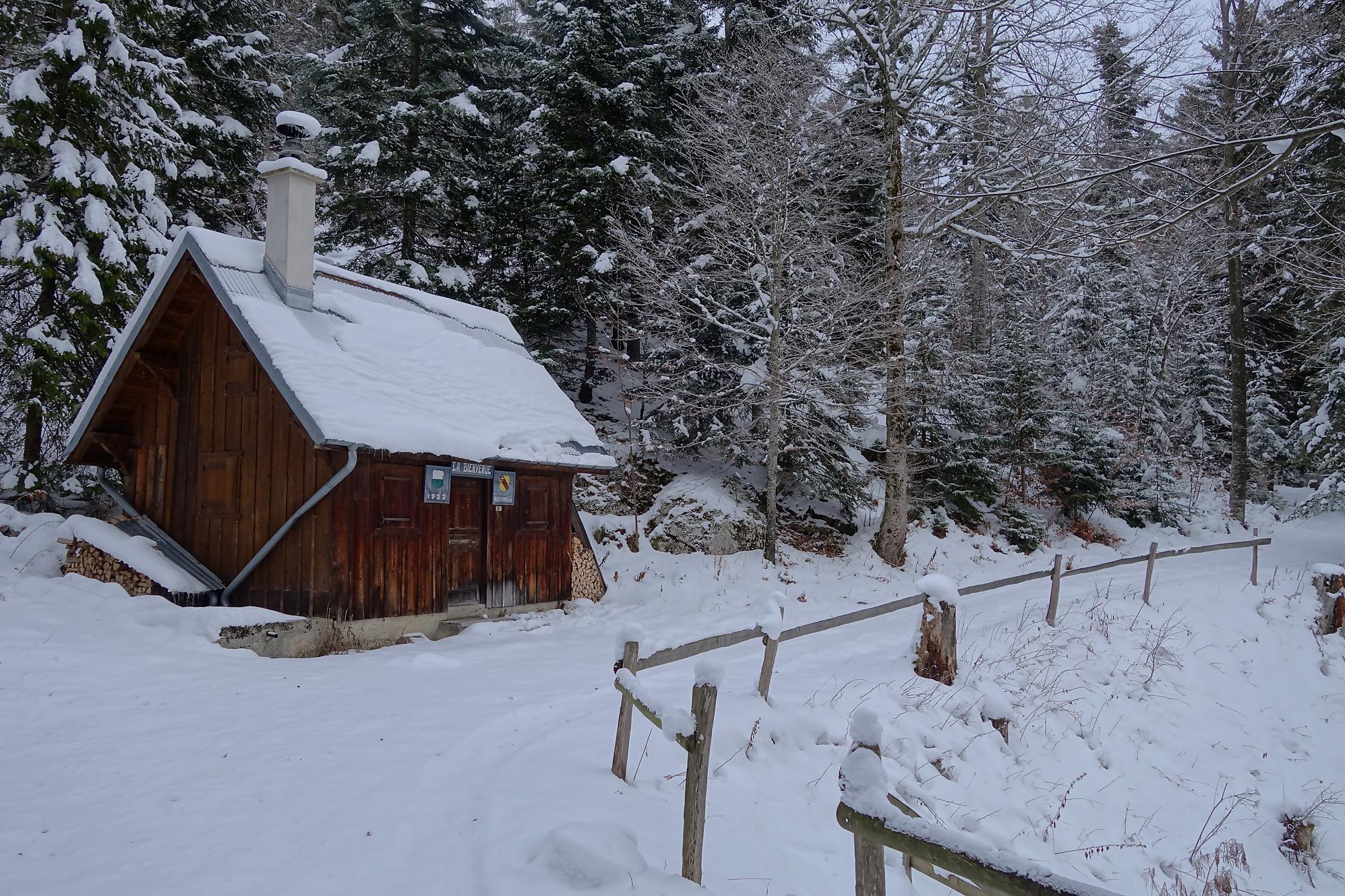 Le chemin croise bien des fois la route. Je rencontre une cavalière sur son franche-montagnes, nous babillons comme des filles. Surpris de voir que le cheval tienne sur la neige, mais avec des chaussons devant tout s’explique. Les traces d’animaux sont bien présentes, le lièvre en tête, un écureuil et au retour bien des traces de chevreuils et cerfs. A 1180, je passe devant le joli refuge nommé La Bienvenue … qui est fermé et réservé aux habitants de Ballens seulement !