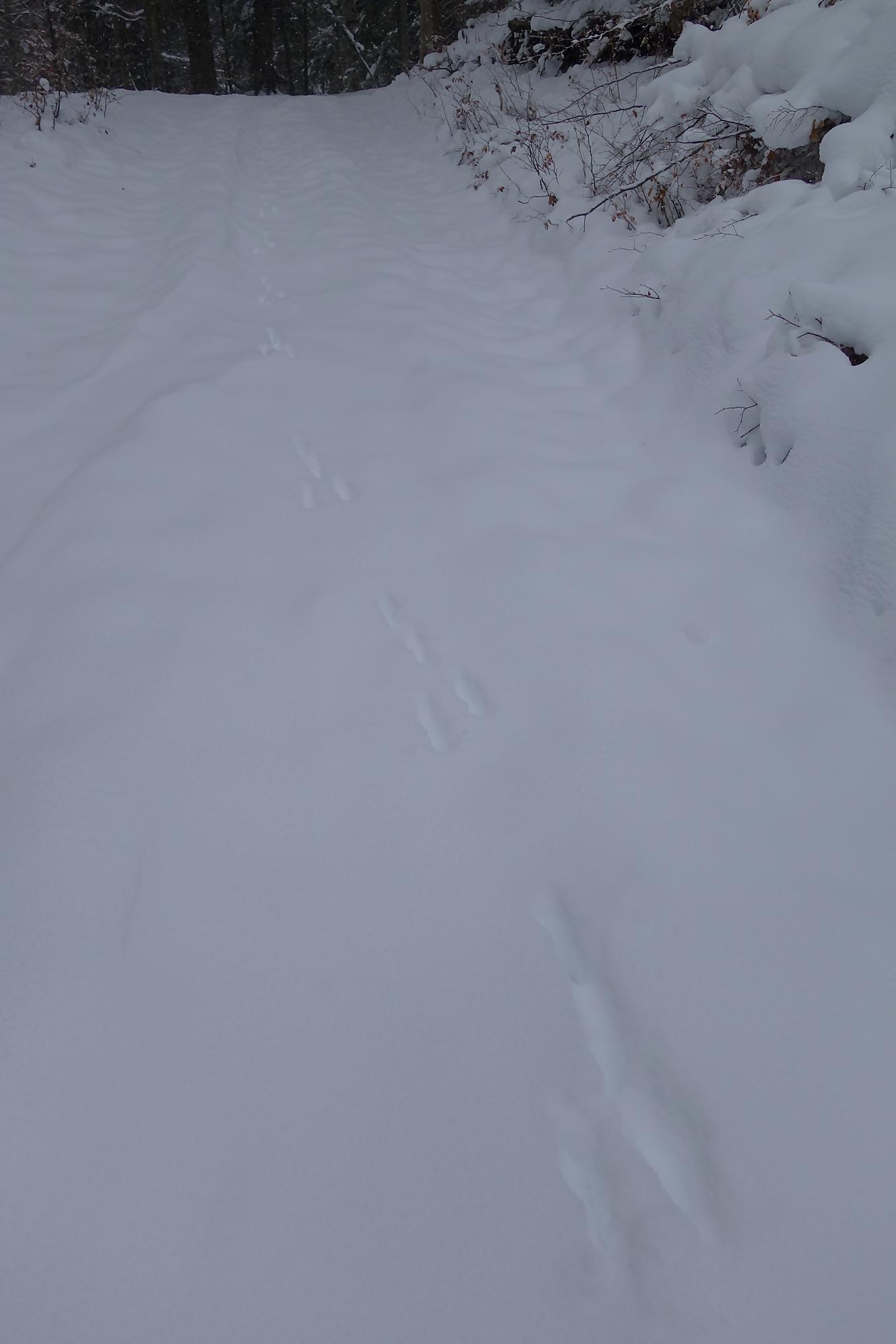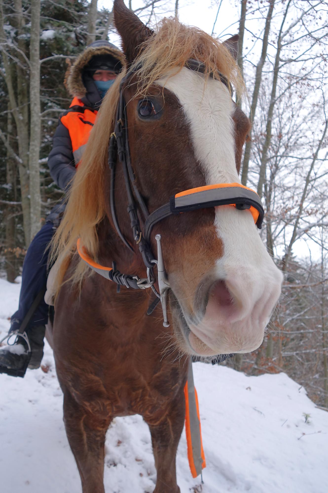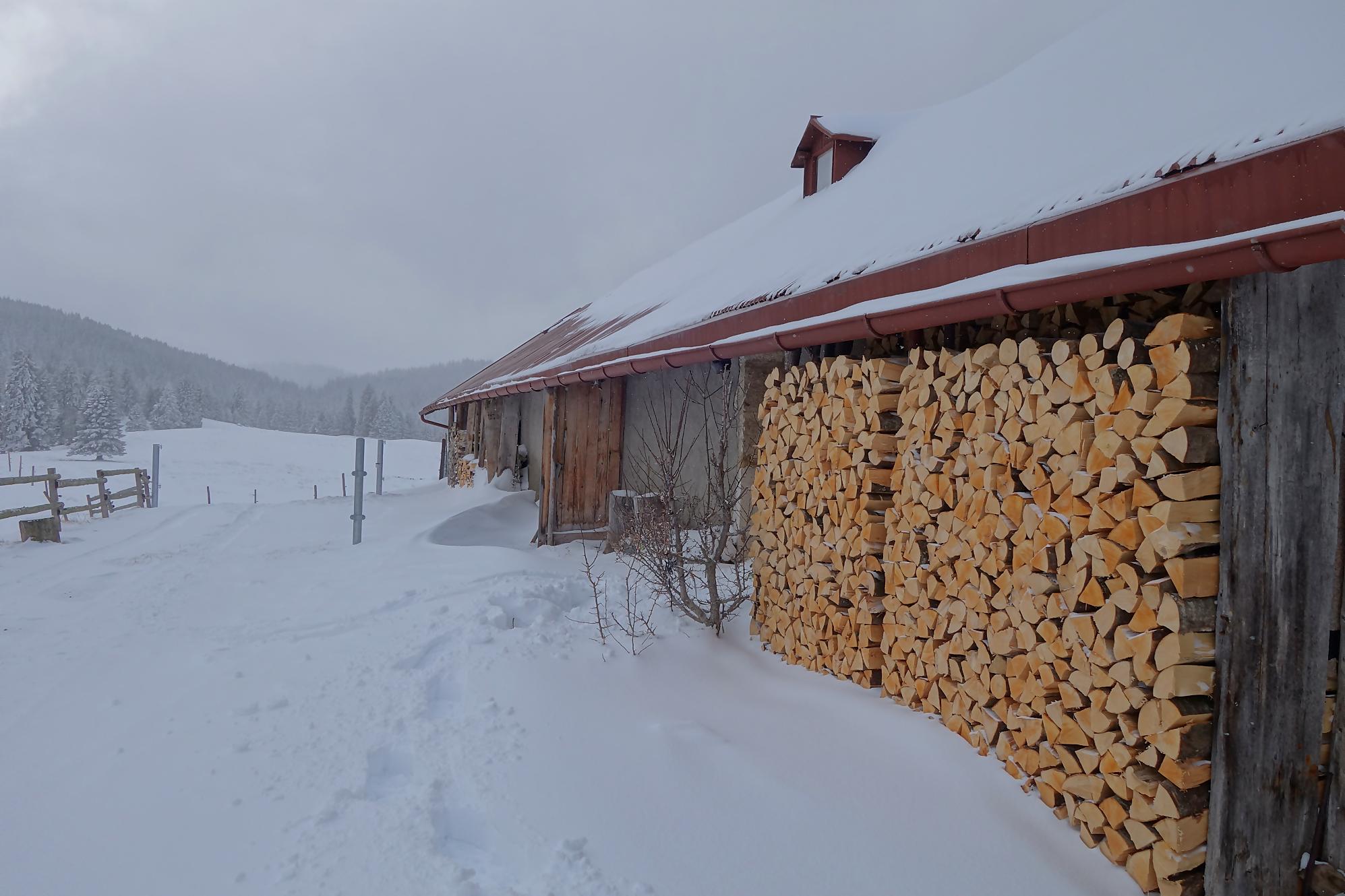 Le chemin croise bien des fois la route. Je rencontre une cavalière sur son franche-montagnes, nous babillons comme des filles. Surpris de voir que le cheval tienne sur la neige, mais avec des chaussons devant tout s’explique. Les traces d’animaux sont bien présentes, le lièvre en tête, un écureuil et au retour bien des traces de chevreuils et cerfs. A 1180, je passe devant le joli refuge nommé La Bienvenue … qui est fermé et réservé aux habitants de Ballens seulement !