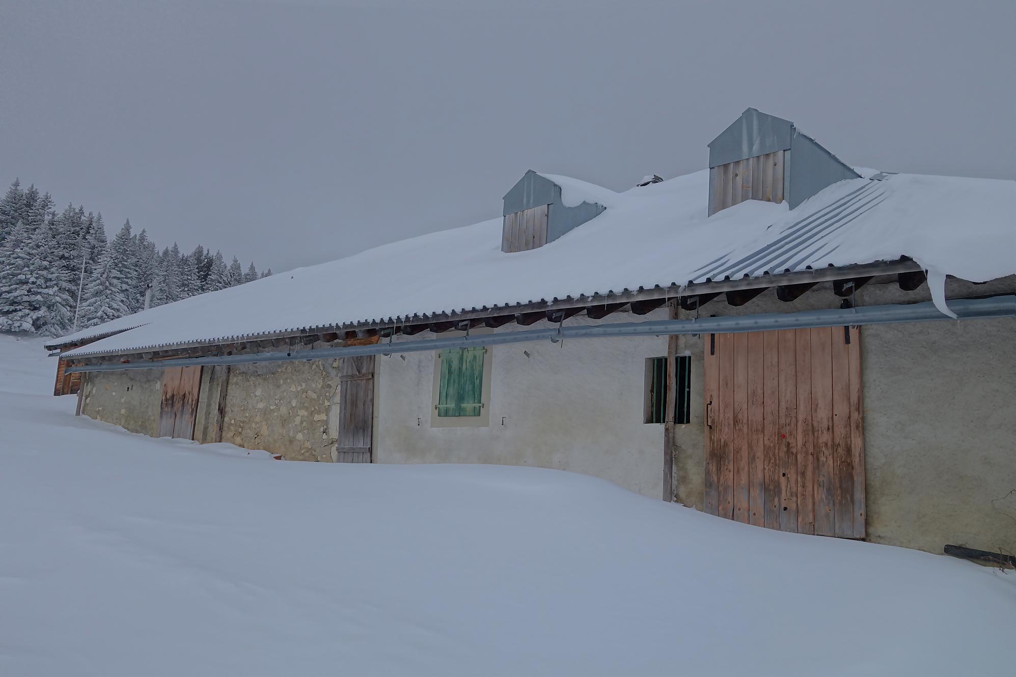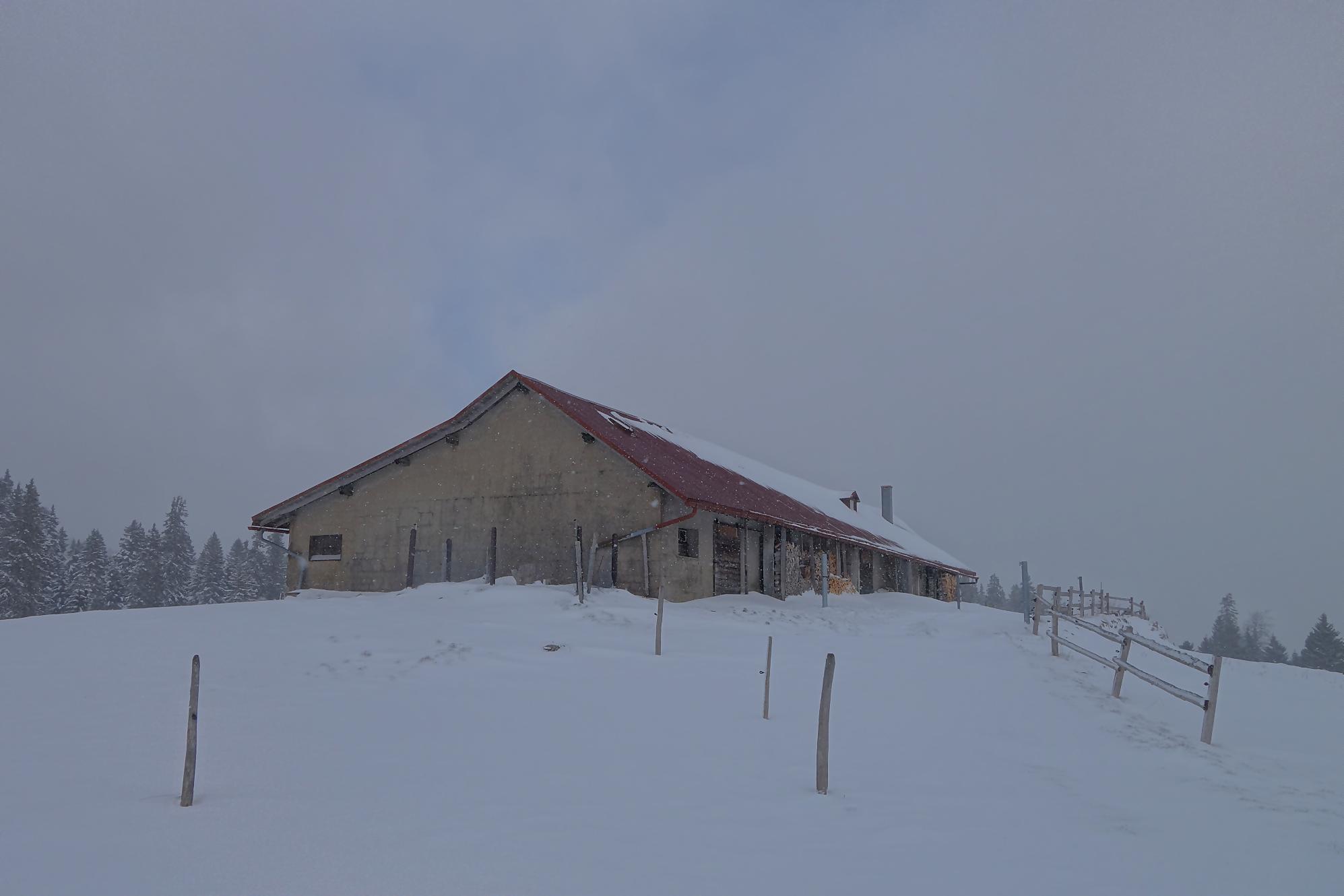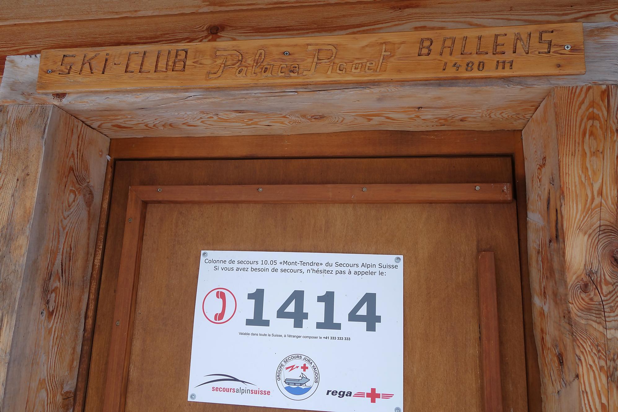 La montée se poursuit, la neige est un peu plus présente, mais je continue à pied. Après une marche plus douce, je rejoins aisément par la route le pâturage Pré de Ballens où je mets enfin les raquettes. Je navigue à vue et passe devant un joli chalet, sans nom. Je fais le tour et file ensuite vers la ferme du Pré de Ballens. Excepté l’étable, tout est fermé à clef. Tiens il y a un abri du ski-club de Ballens, nommé Palace Piguet … fermé et réservé aux membres (décidément la région est réservée aux gens du cru !).