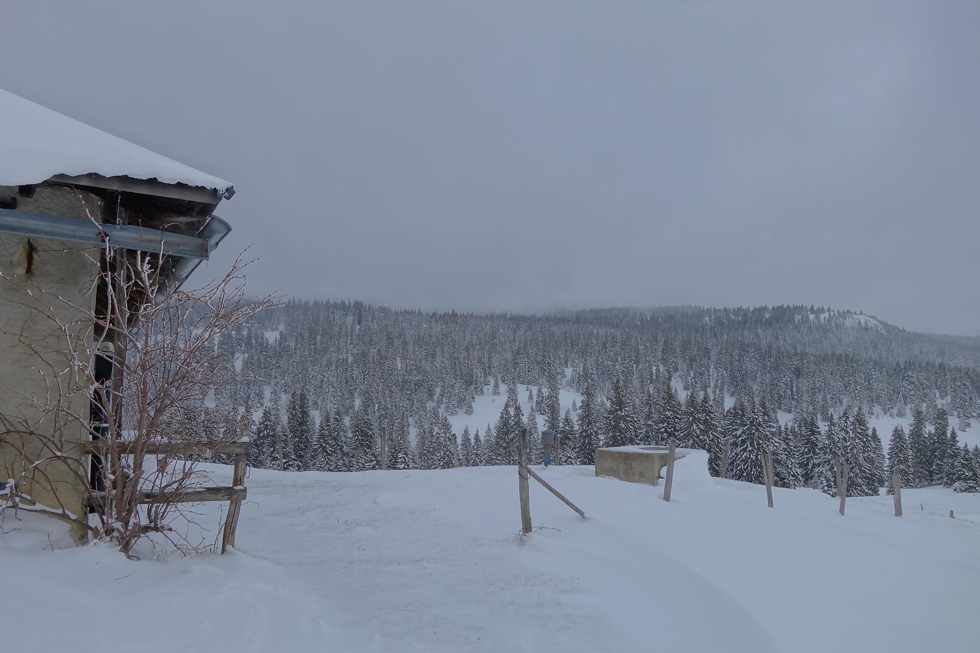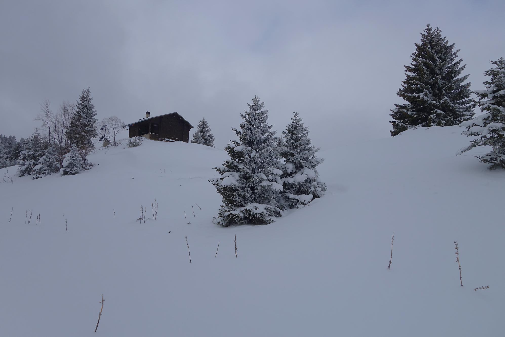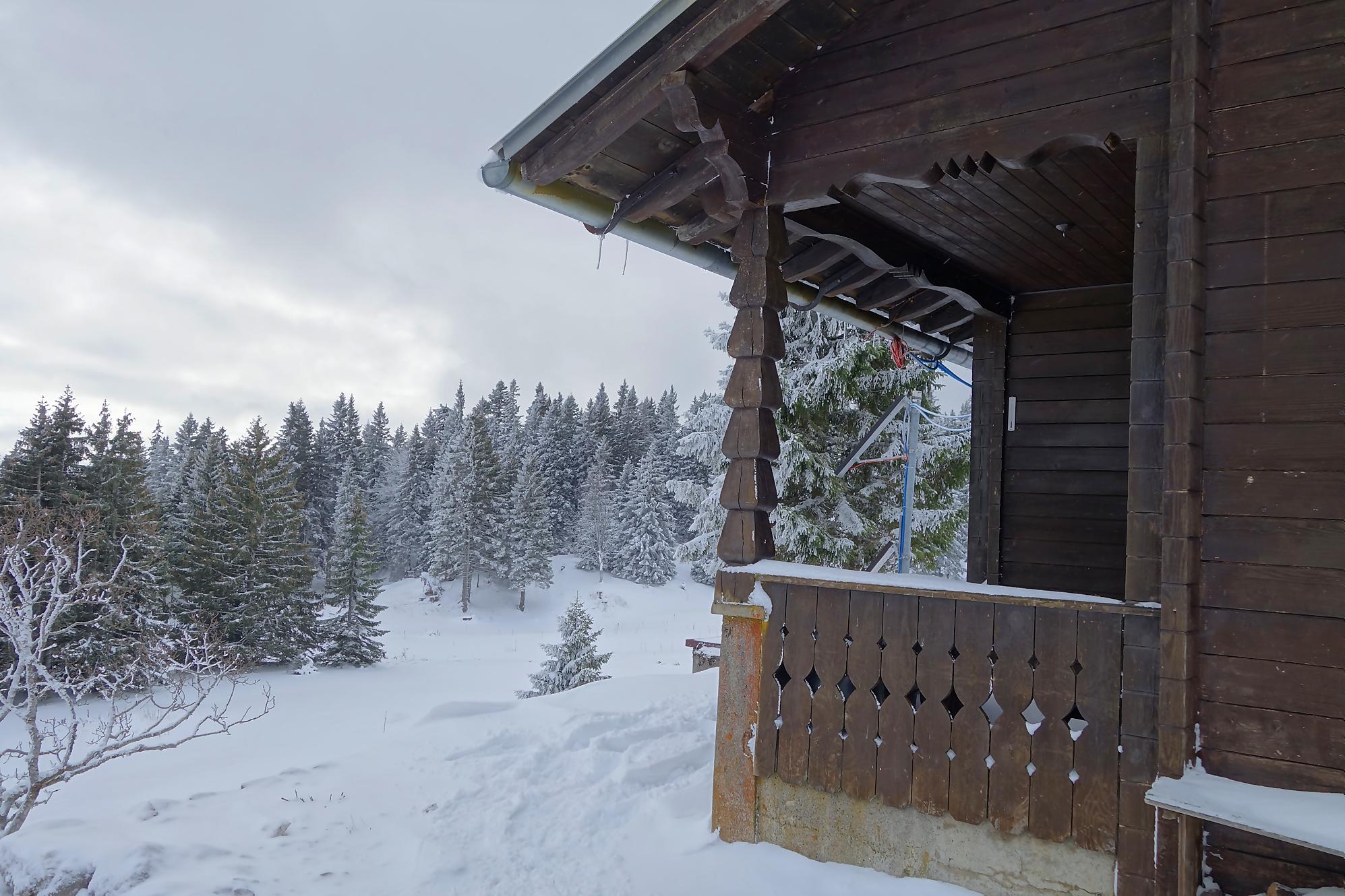 La montée se poursuit, la neige est un peu plus présente, mais je continue à pied. Après une marche plus douce, je rejoins aisément par la route le pâturage Pré de Ballens où je mets enfin les raquettes. Je navigue à vue et passe devant un joli chalet, sans nom. Je fais le tour et file ensuite vers la ferme du Pré de Ballens. Excepté l’étable, tout est fermé à clef. Tiens il y a un abri du ski-club de Ballens, nommé Palace Piguet … fermé et réservé aux membres (décidément la région est réservée aux gens du cru !).