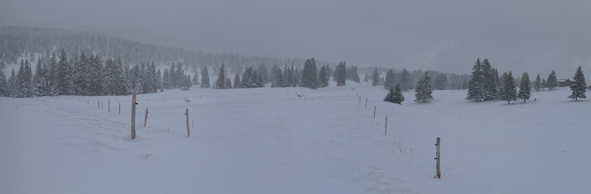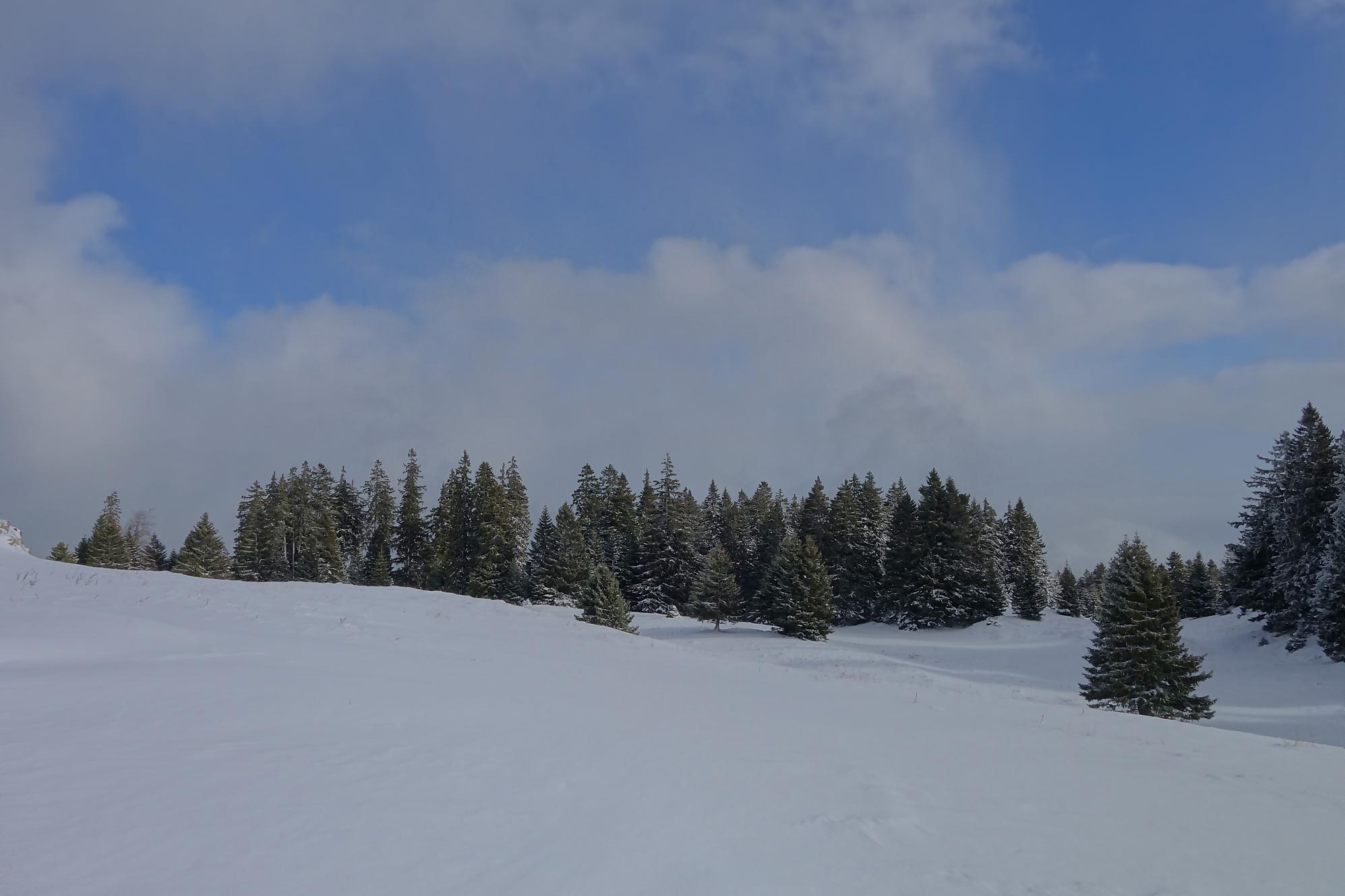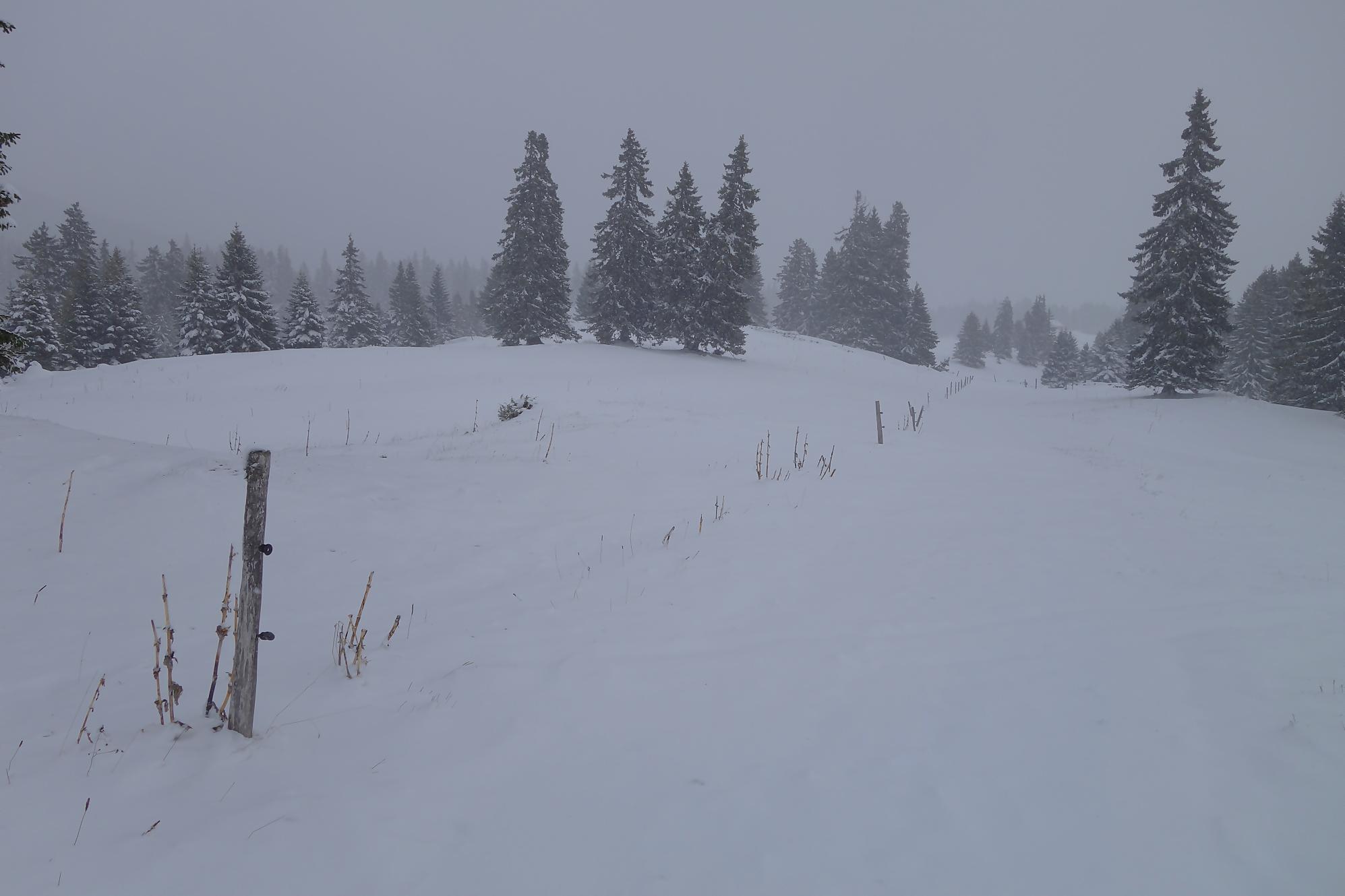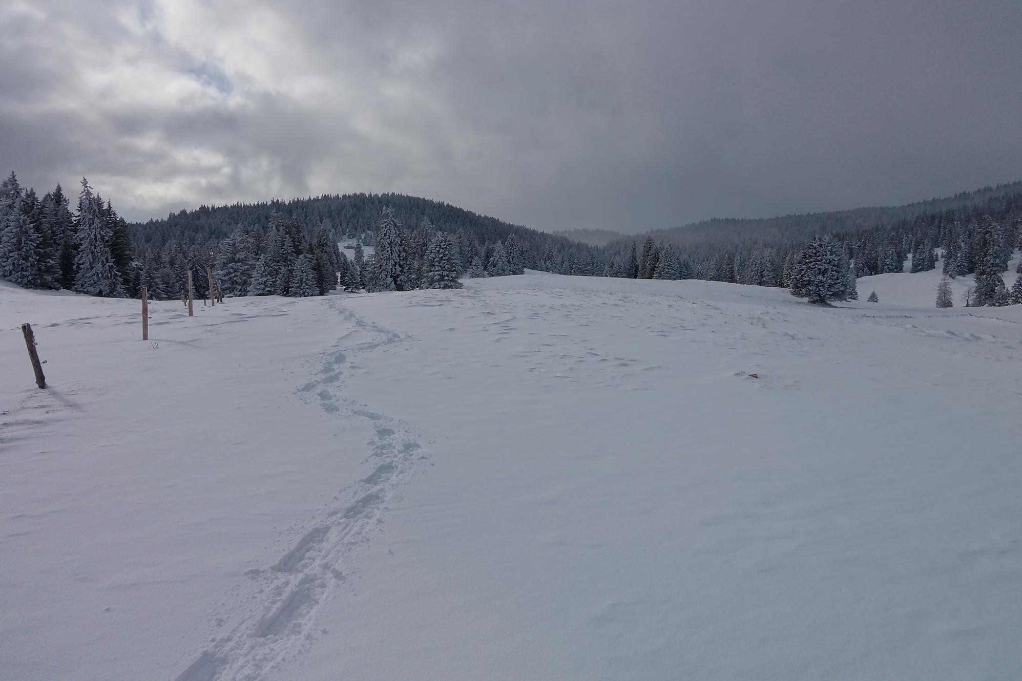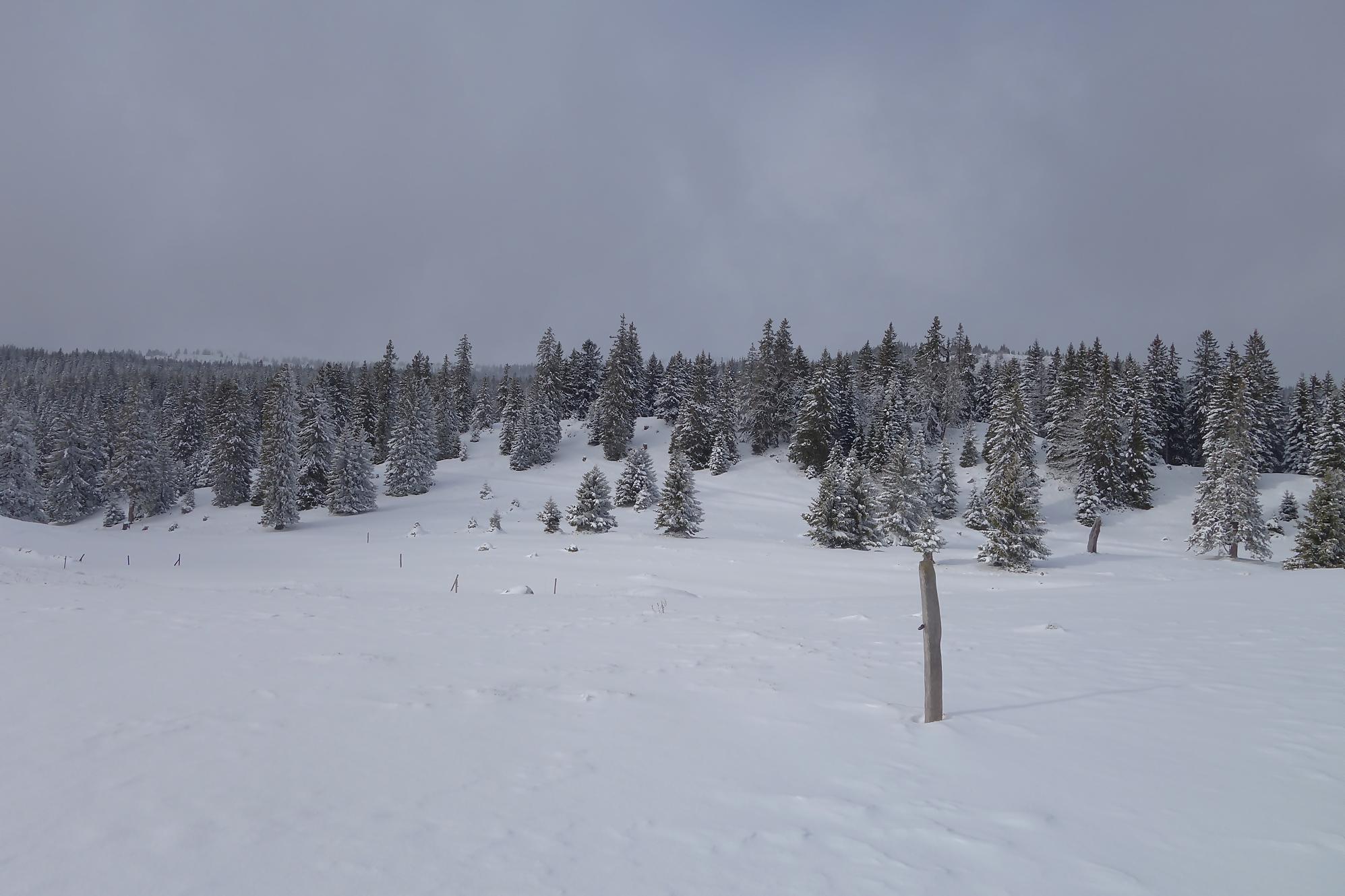 Un samedi annoncé gris et j’ai un impératif en fin d’après-midi dans la région. Je me trouve donc une randonnée modeste (comprendre 5h avec les pauses !) dans la région du Mont-Tendre. Je prends mes raquettes, première sortie de ce début de saison et file vers Berolle, lieu-dit La Verrière, Pt800. Un parking est disponible devant le panneau d’interdiction de circuler (peu respectée, une trace de 4×4 monte jusqu’au Pré de Ballens !).