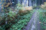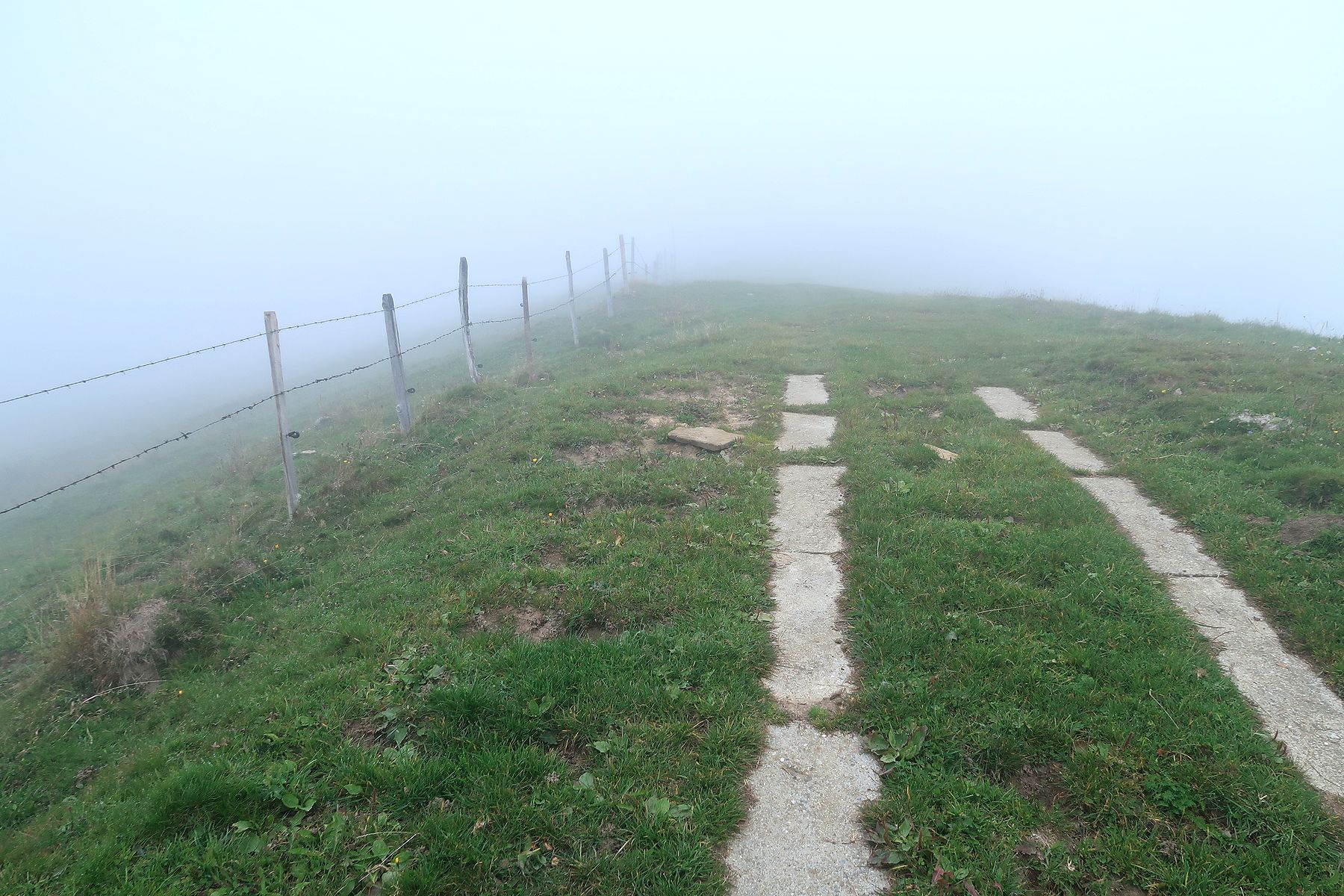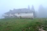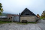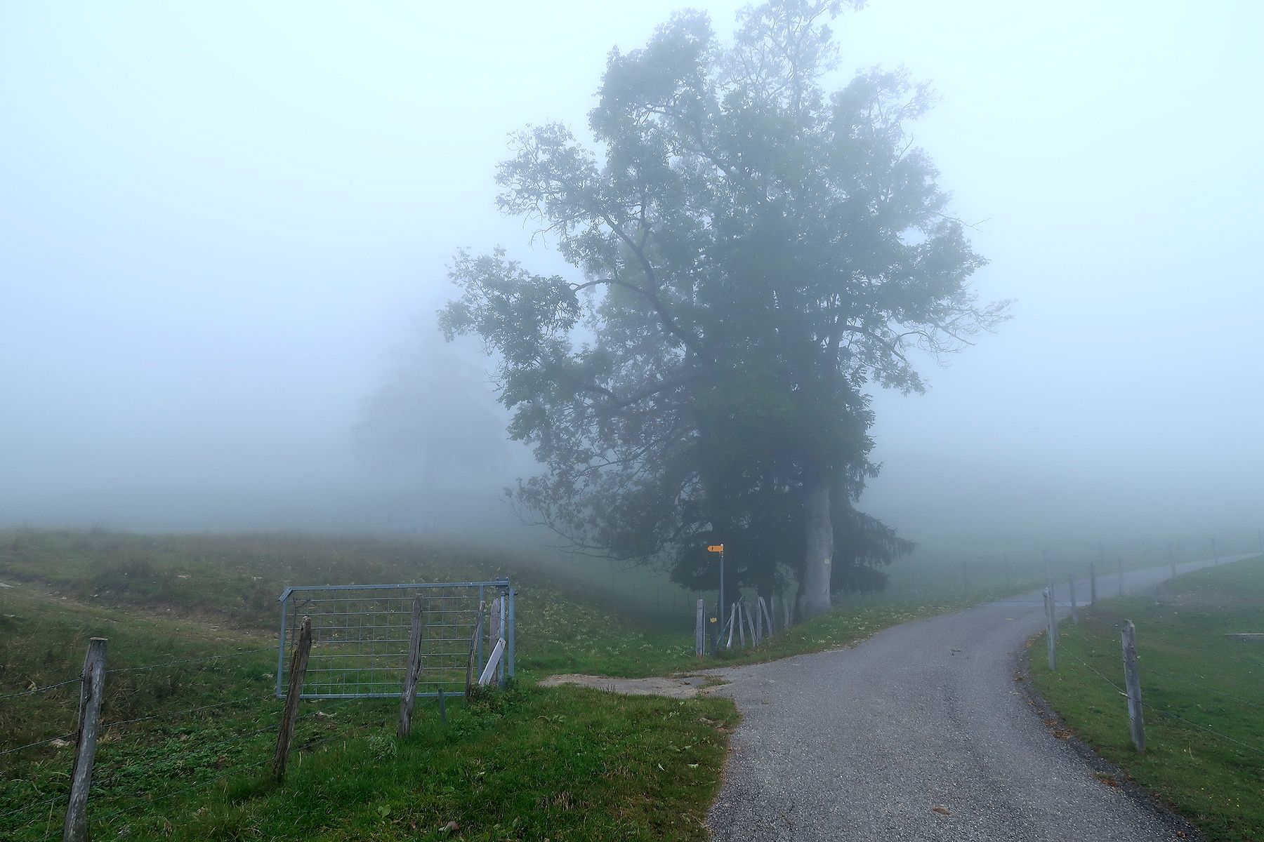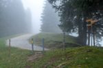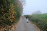 Le passage en forêt est assez court et nous revoilà sur une route. La couche de stratus est bien épaisse et nous devinons tardivement les bâtiments.