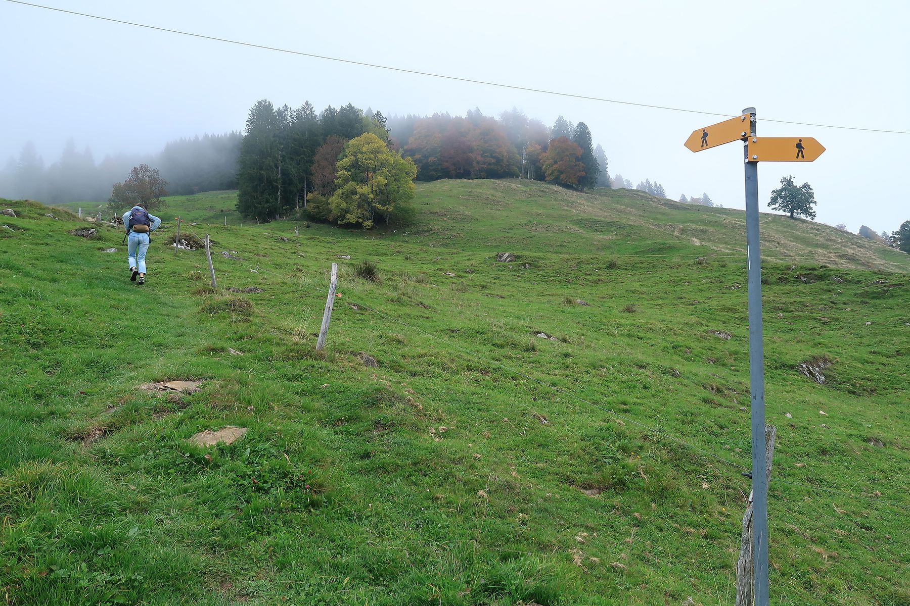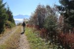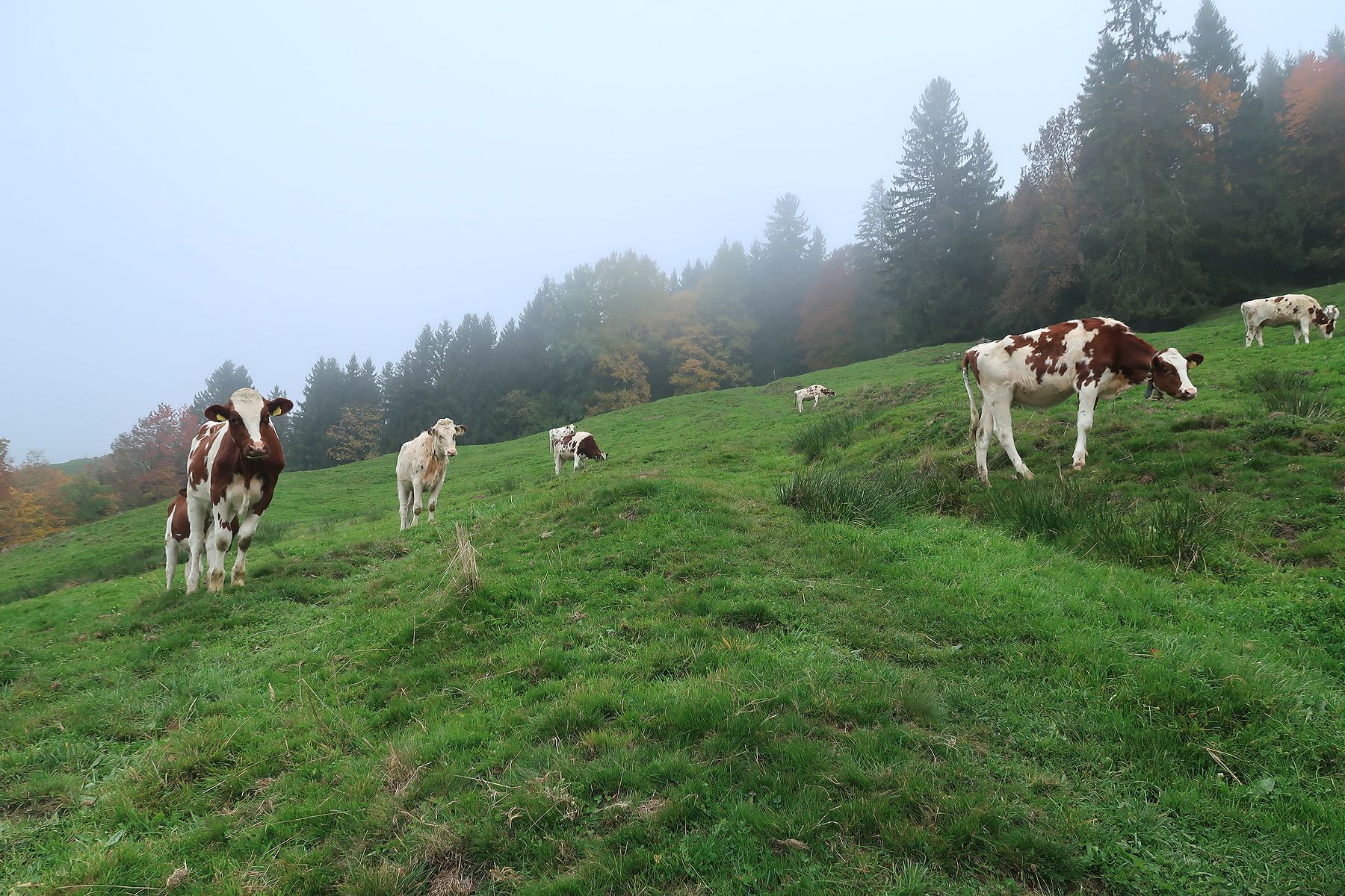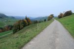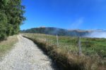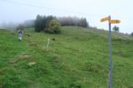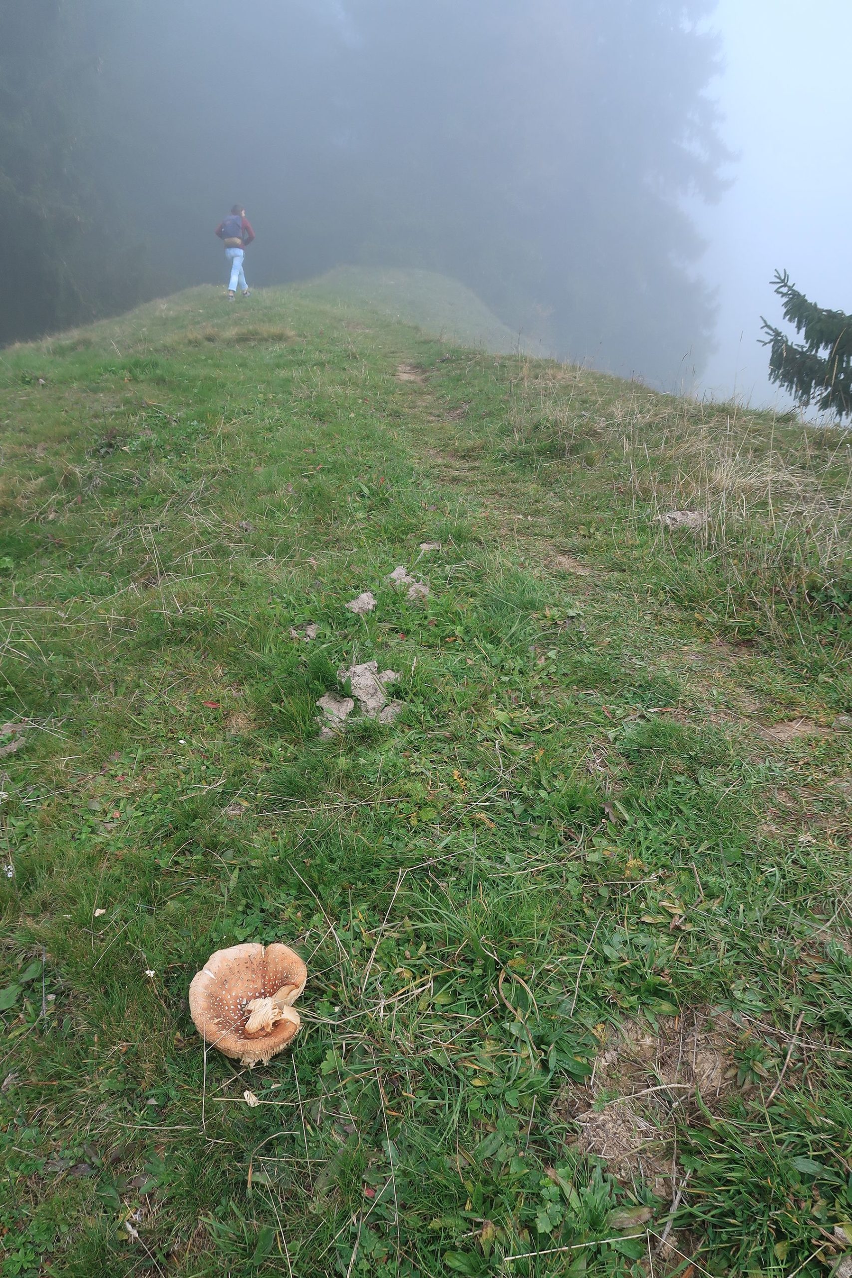 Retour dans un pâturage avec un sentier qui monte en pente régulière, toujours avec le brouillard. Cela a son charme. Nous passons dans un bosquet, l’attraction locale est la quantité de champignons, aux formes parfois curieuses. Cela met de l’animation. Nous retrouvons une route en lisière de forêt. Au loin, des tronçonneuses se font entendre. Et nous sortons enfin du stratus, ah quel plaisir. Le soleil nous réchauffe très vite. Pas à dire, le soleil fait du bien au corps et au moral.