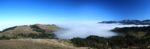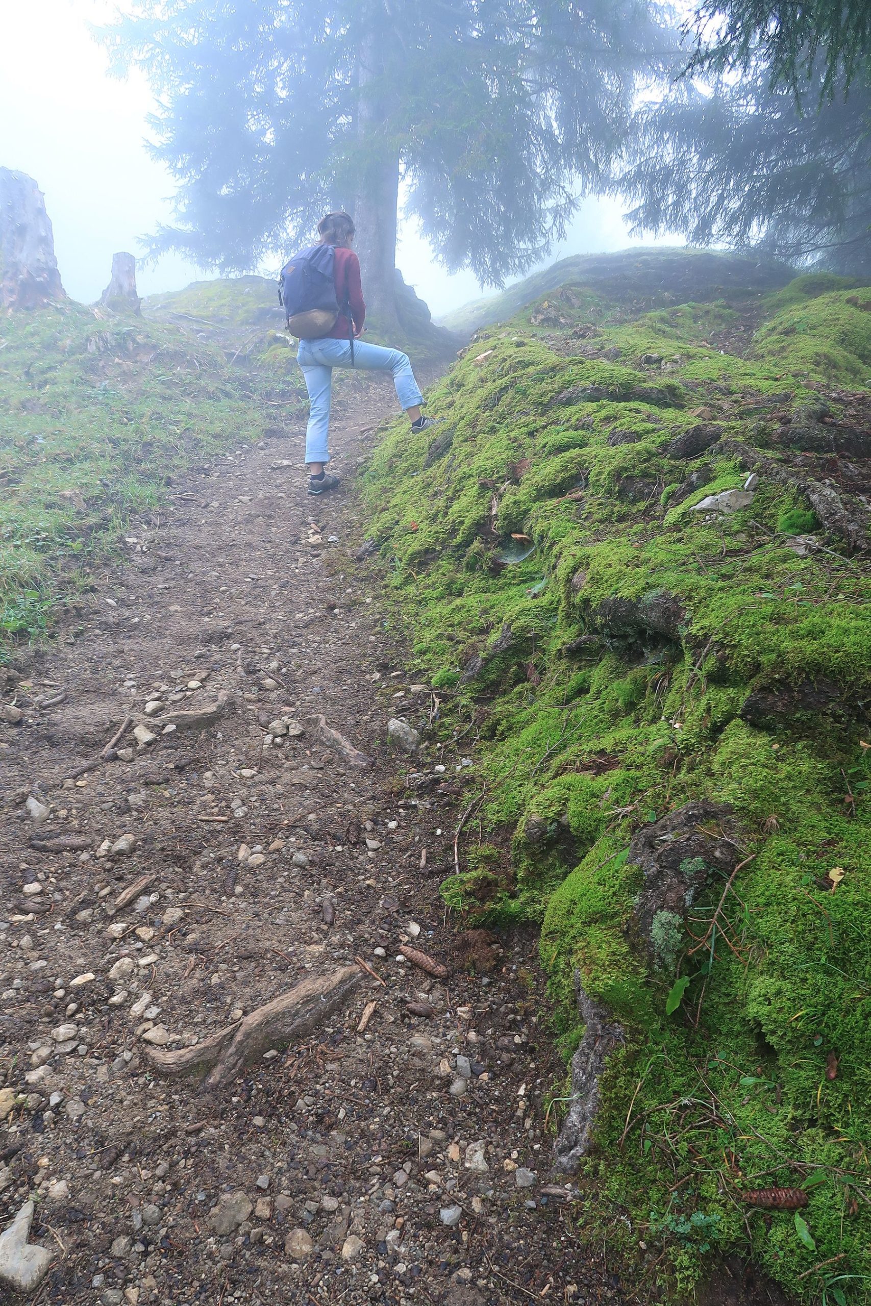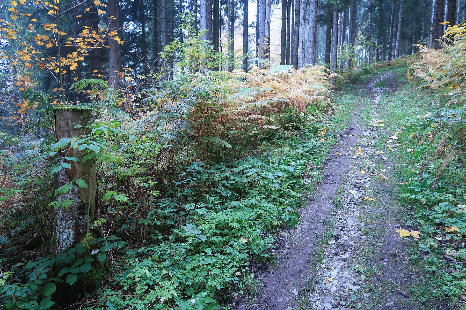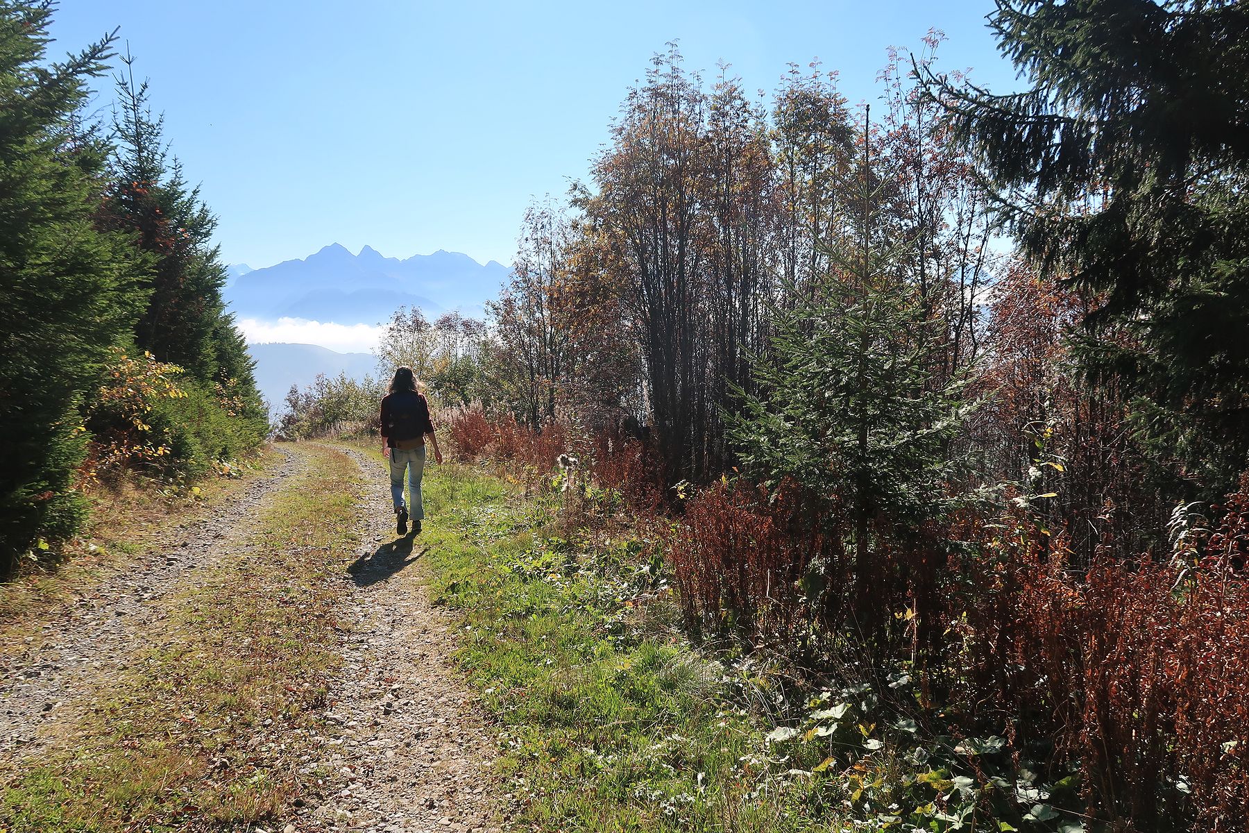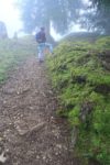 Retour dans un pâturage avec un sentier qui monte en pente régulière, toujours avec le brouillard. Cela a son charme. Nous passons dans un bosquet, l’attraction locale est la quantité de champignons, aux formes parfois curieuses. Cela met de l’animation. Nous retrouvons une route en lisière de forêt. Au loin, des tronçonneuses se font entendre. Et nous sortons enfin du stratus, ah quel plaisir. Le soleil nous réchauffe très vite. Pas à dire, le soleil fait du bien au corps et au moral.