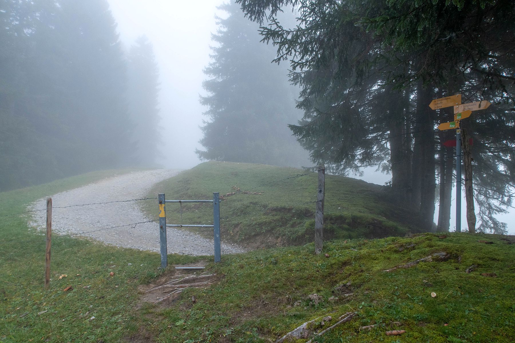 Un portail en aluminium nous fait rentrer dans la forêt du Frassy. Avec le stratus, cela crée une ambiance sympathique.