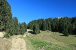 Nous filons à droite et le sentier monte dans le pâturage. Les génisses sont présentes et viennent sur nous. Toujours aussi curieuses les génisses. Une vache se tient à l’écart du troupeau et est portante.