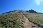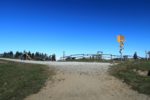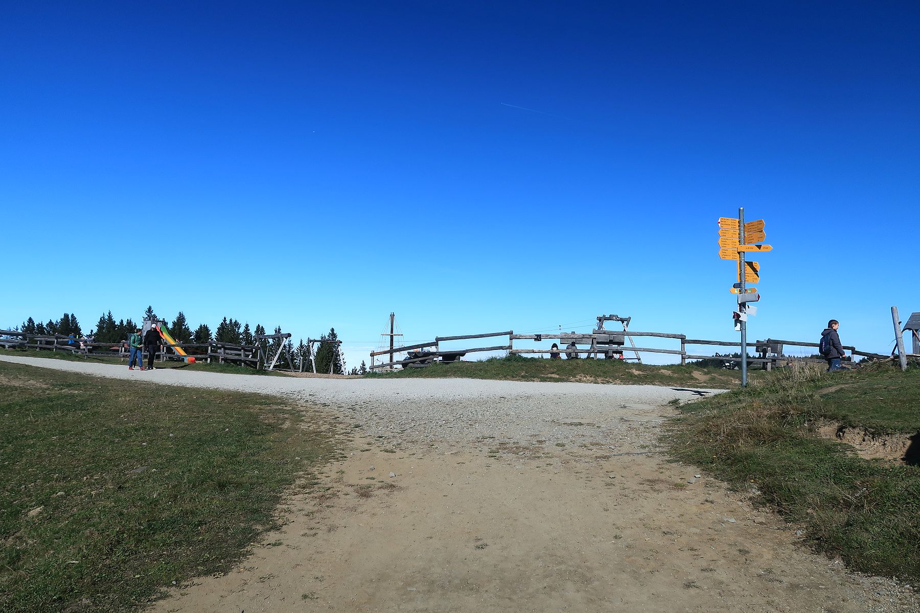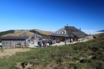 Nous rejoignons la croupe finale devant le restaurant le Chalet de la Berra. Il y a la foule des grands jours et ses odeurs de graillons. Nous montons cette croupe pour atteindre le sommet de La Berra. Une clôture en bois protège l’espace sommital avec son repère géodésique.