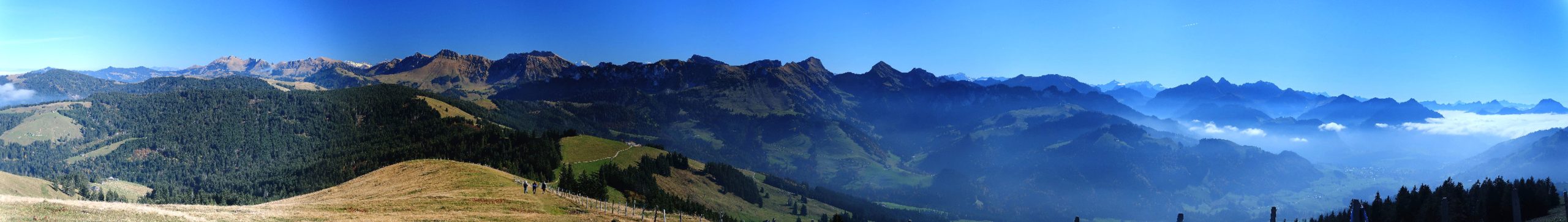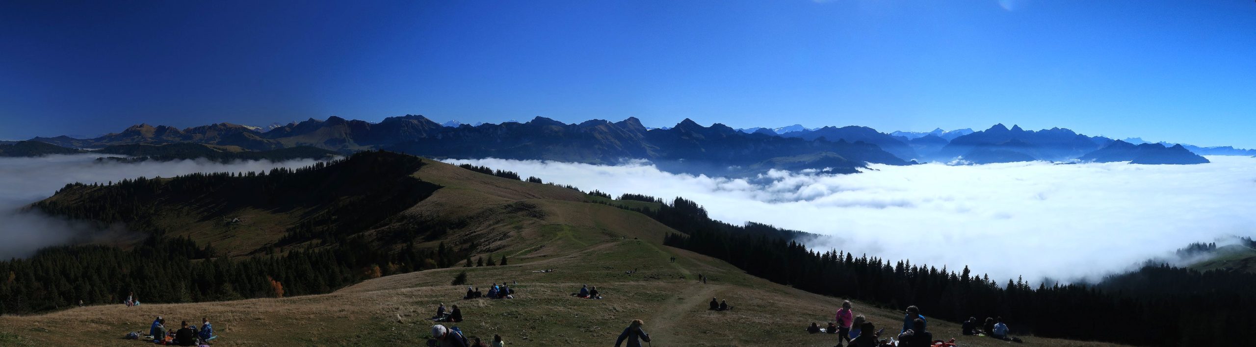Nous filons en contrebas pour notre pause picnic. Quelle cadre. Panorama à 360°. Au loin, Mont-Blanc en partie et Dents du Midi, les préalpes fribourgeoises au premier plan. Superbe. Tiens, un couple se fait une fondue avec le nouveau Kit à fondue Swiss Made. L’occasion de discuter avec eux.