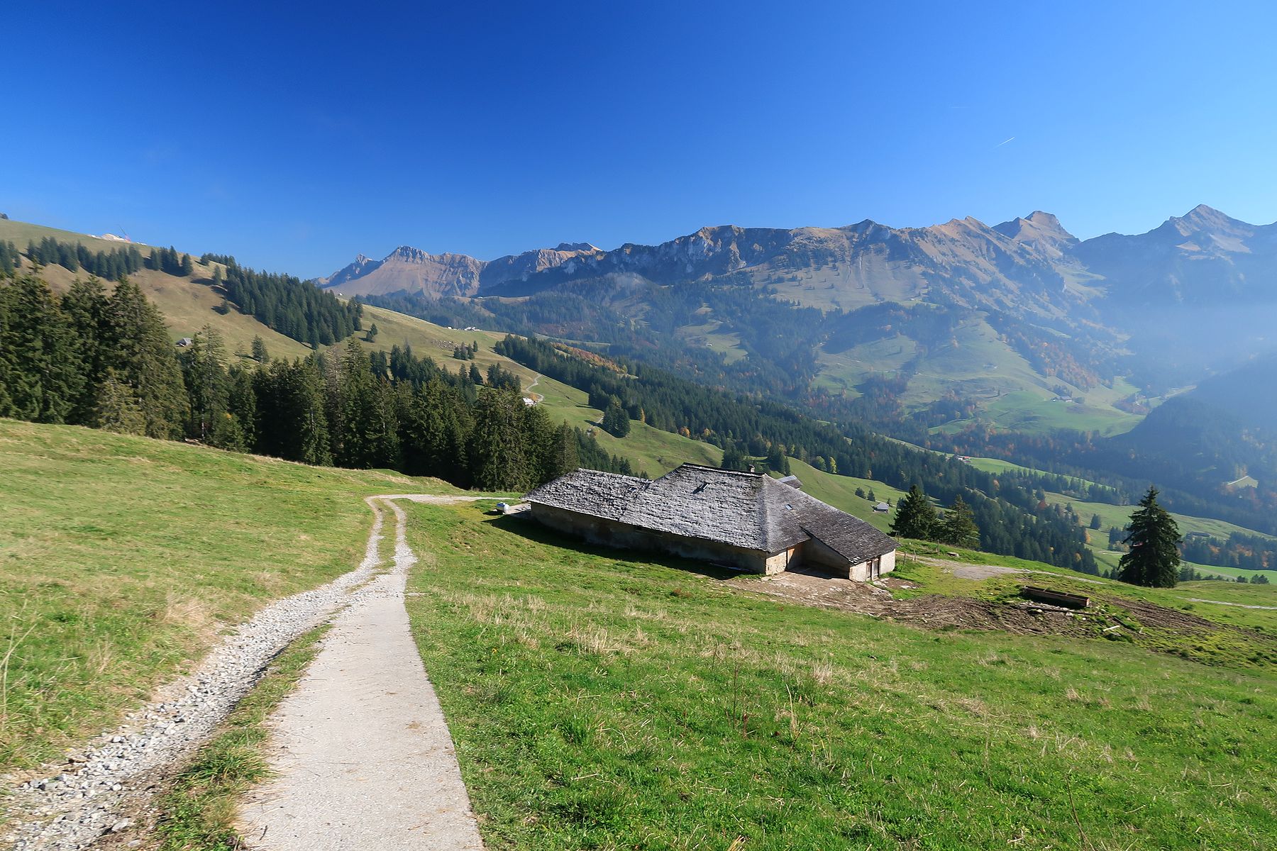 Bifurcation à gauche pour suivre une route d’alpage avec le sol partiellement en béton. C’est débonnaire. Puis le terrain se fait un peu pentu, mais c’est une route d’alpage. Nous atteignons la ferme des Botteys. Elle est fermée en cette saison.