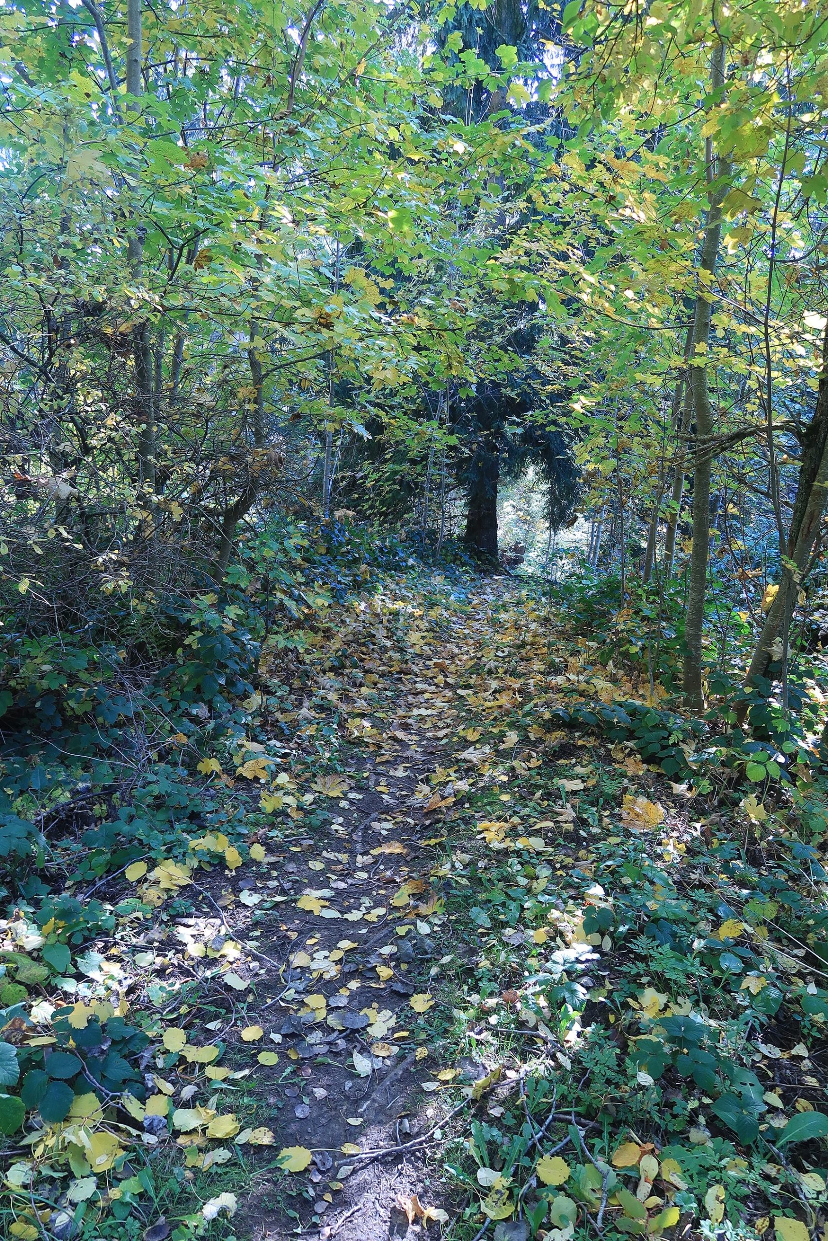 Ensuite, nous rebroussons chemin et coupons. Il y a un sentier (non mentionné par les cartes), mais marqué par des panneaux jaunes. Ce secteur a des sections humides avec les plantes idoines. Retour dans une section boisée pour un court instant. La belle surprise est de voir que le stratus n’est plus présent, sinon au loin.