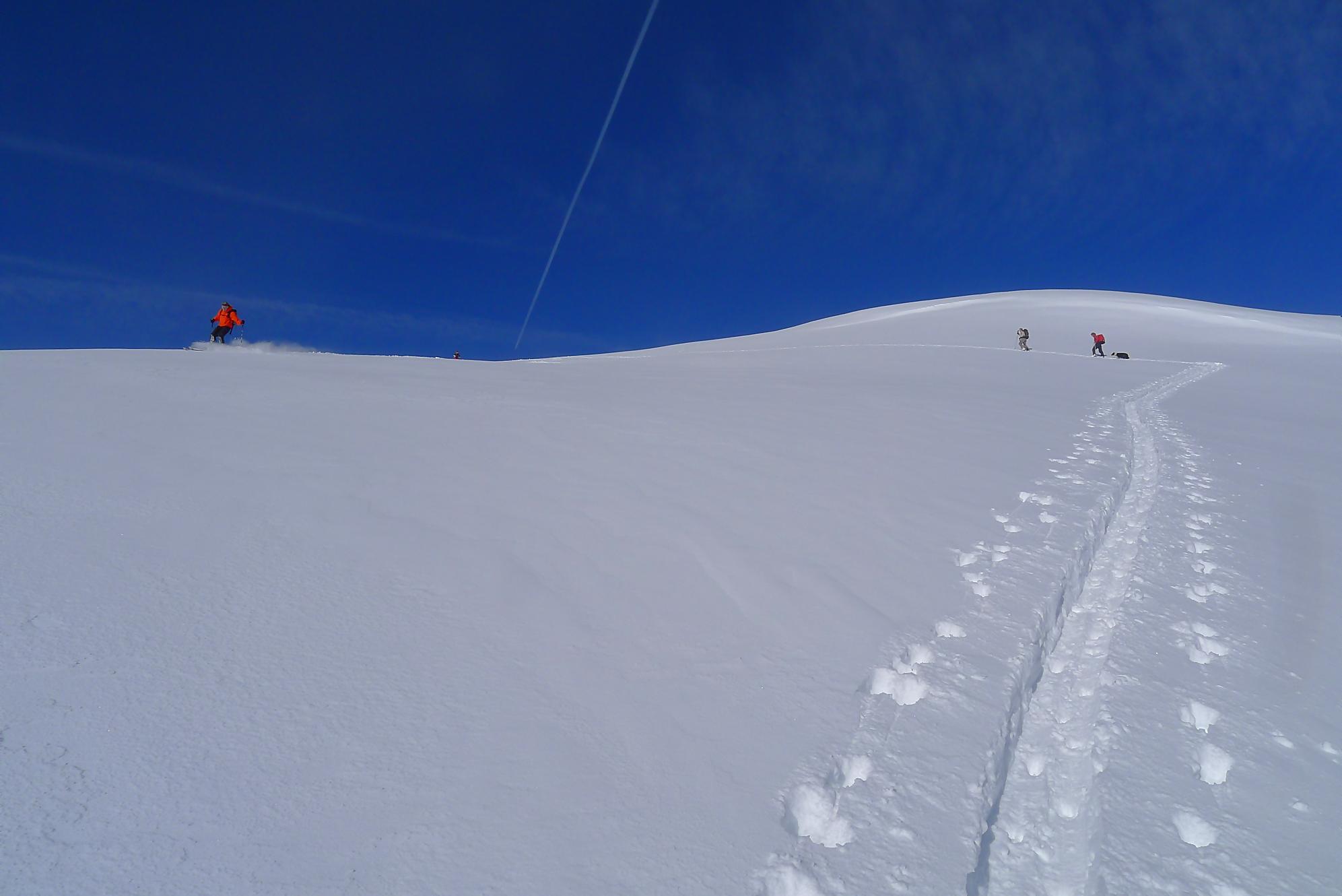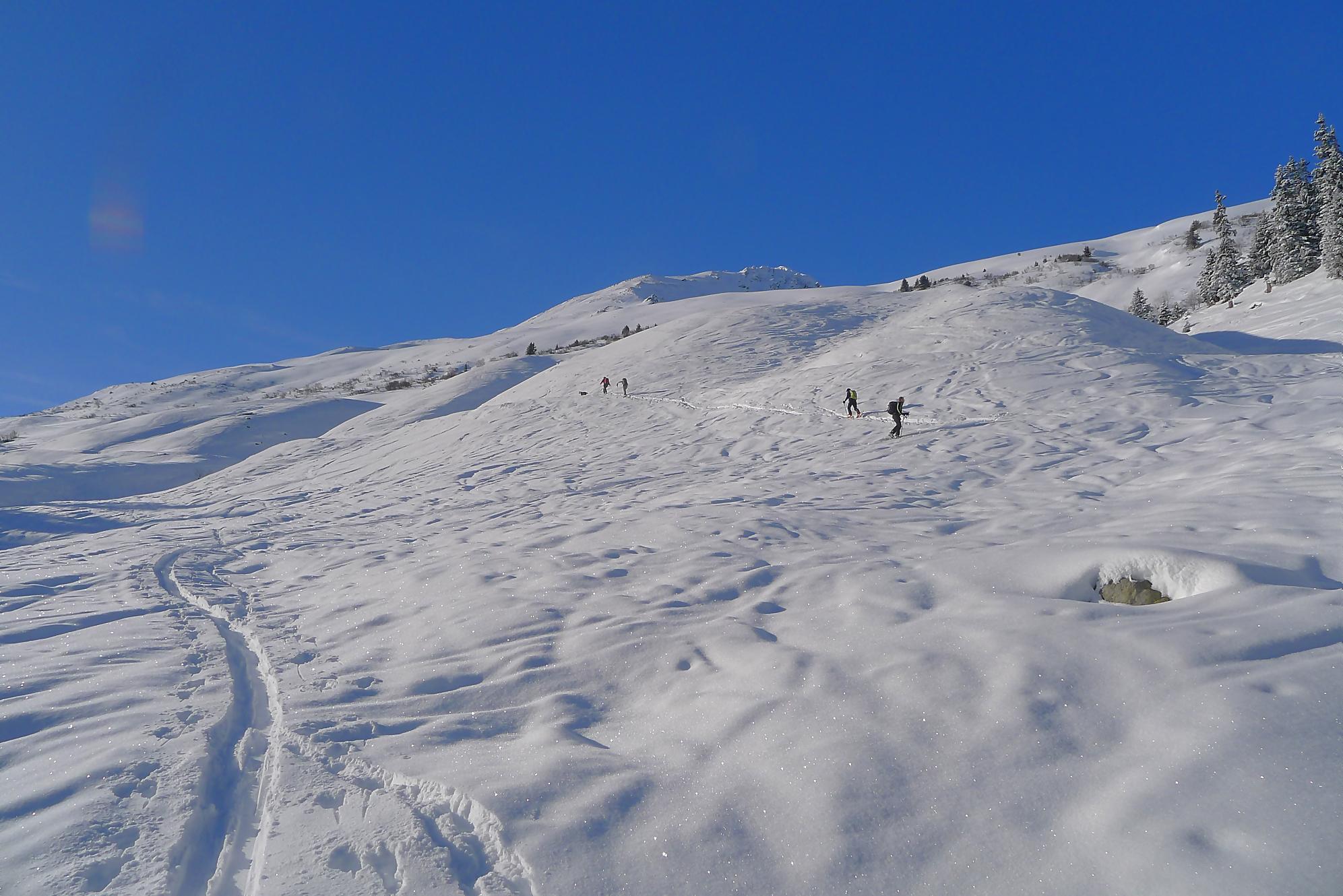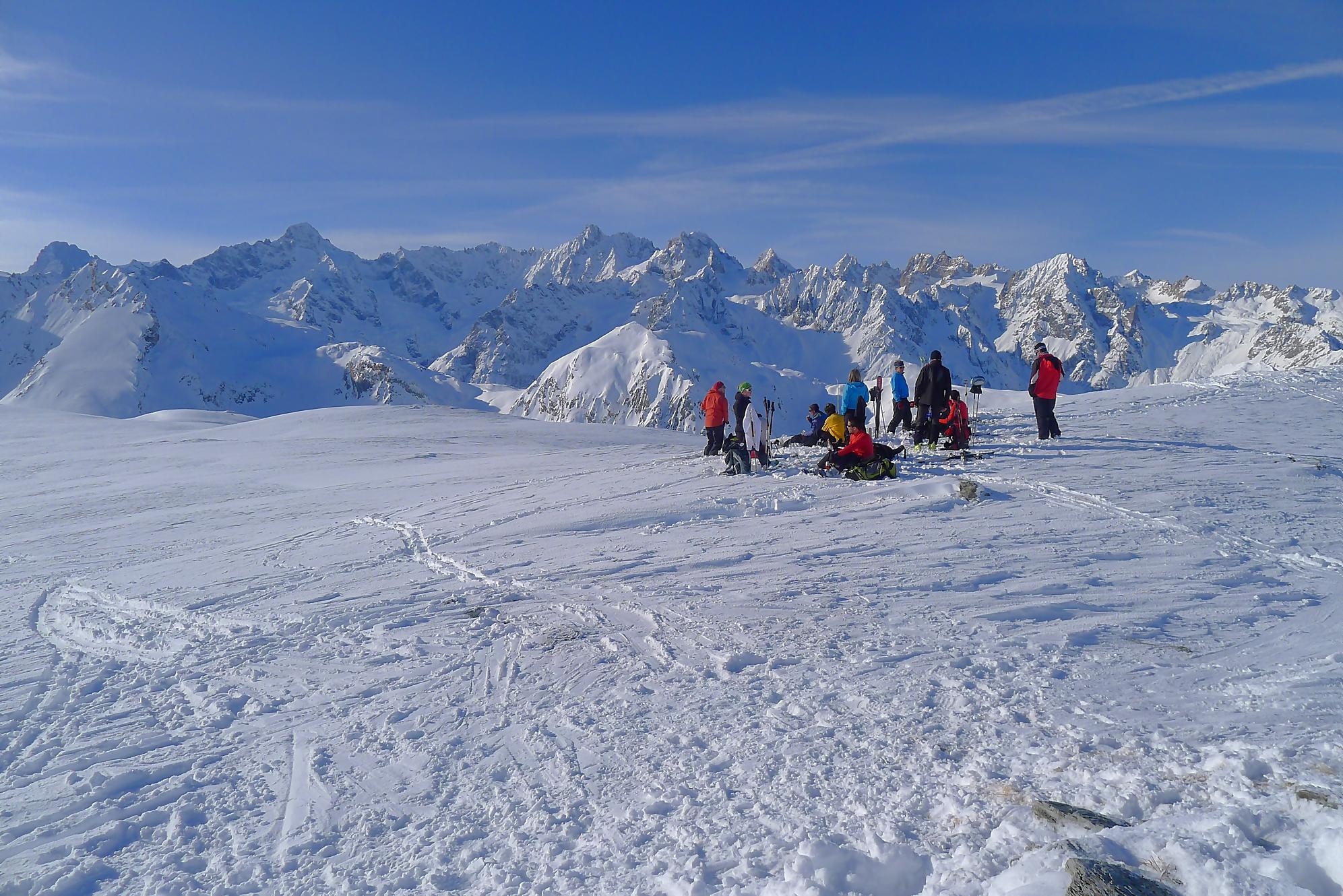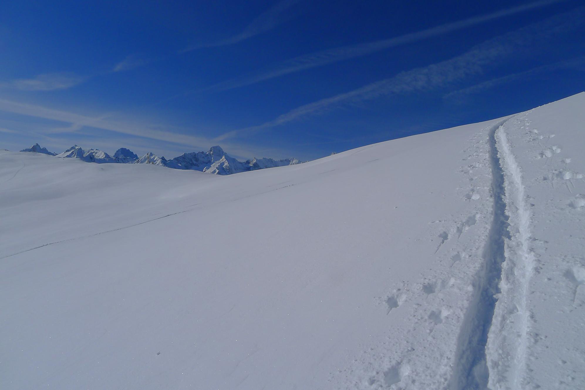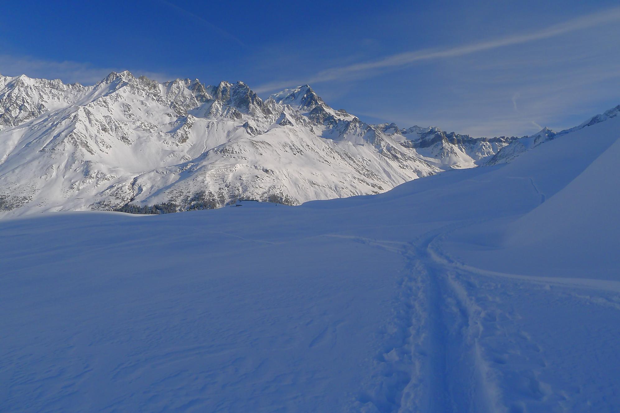 Une petite pause sur le plateau puis descente à l’ombre pour traverser un ruisseau et repartir en montée au soleil dans la Chaux de Champ Long. C’est assez tranquille car la pente est inférieure à 30°. On rejoins sans soucis le vaste plateau sommital de Crêta de Vella (2519m). Le panorama est très agréable, nous sommes entourés de quelques 4000m et le paysage ratisse un peu en Italie, la France et la part du lion est en Suisse. La température est de -10°c, mais sans vent et au soleil, ce fut très agréable.