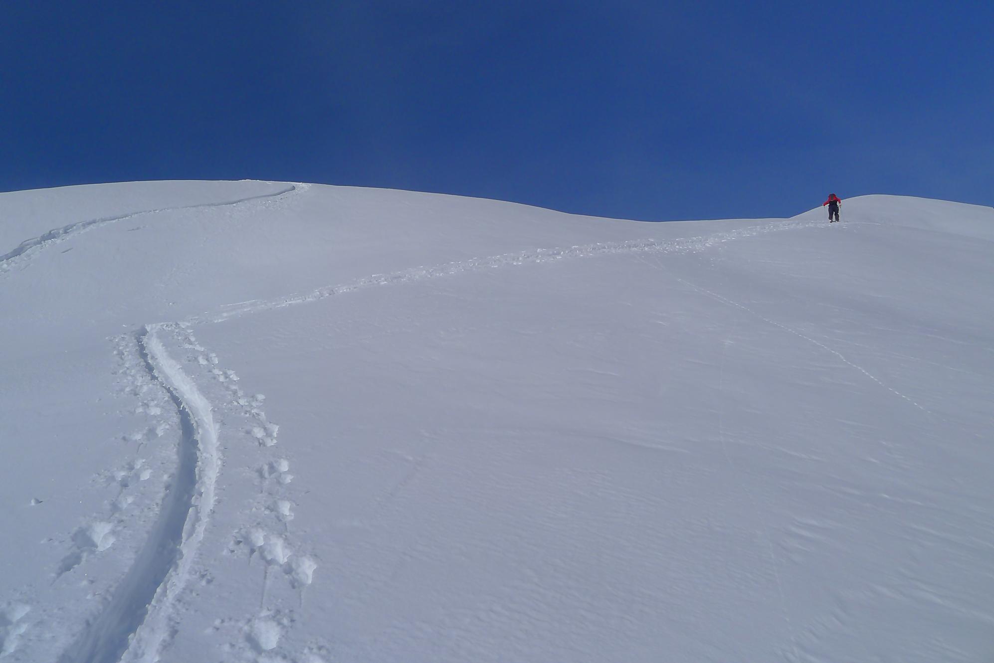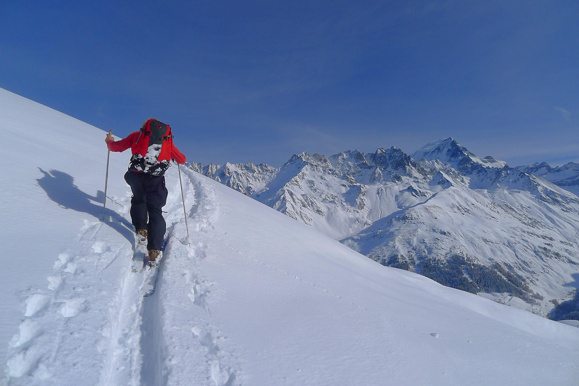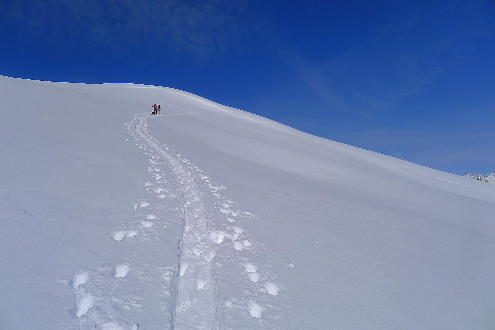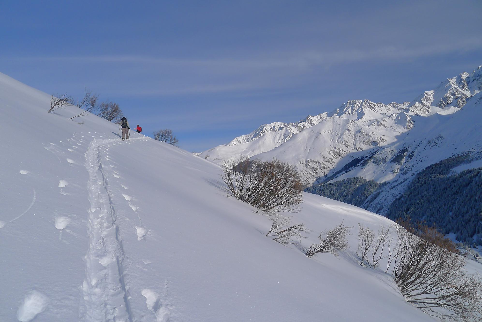Une petite pause sur le plateau puis descente à l’ombre pour traverser un ruisseau et repartir en montée au soleil dans la Chaux de Champ Long. C’est assez tranquille car la pente est inférieure à 30°. On rejoins sans soucis le vaste plateau sommital de Crêta de Vella (2519m). Le panorama est très agréable, nous sommes entourés de quelques 4000m et le paysage ratisse un peu en Italie, la France et la part du lion est en Suisse. La température est de -10°c, mais sans vent et au soleil, ce fut très agréable.
