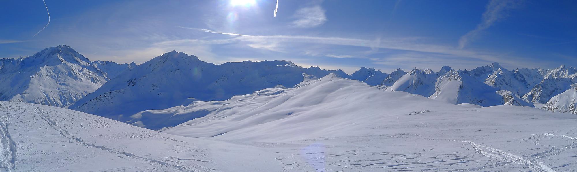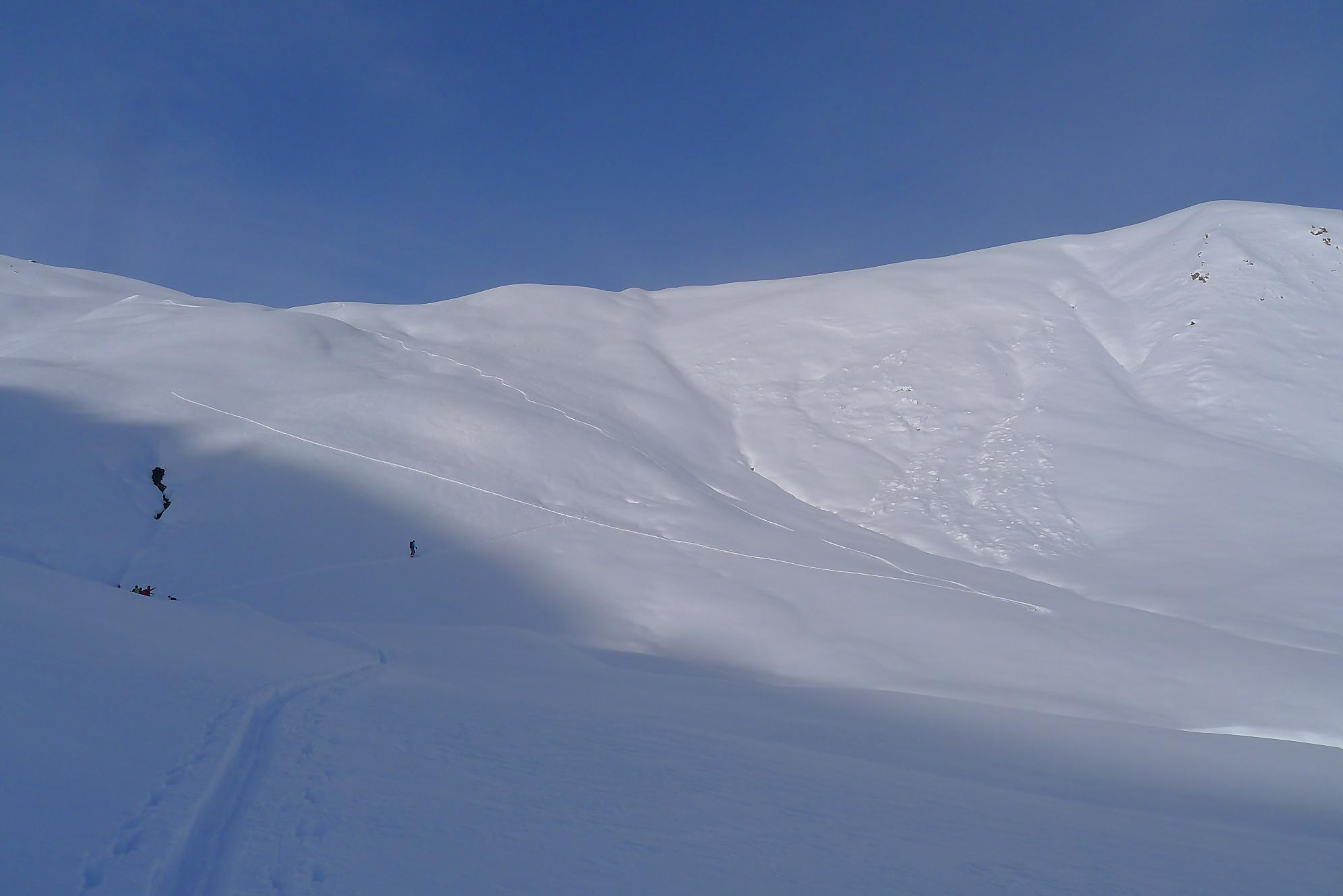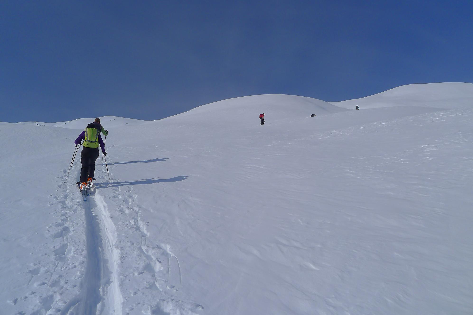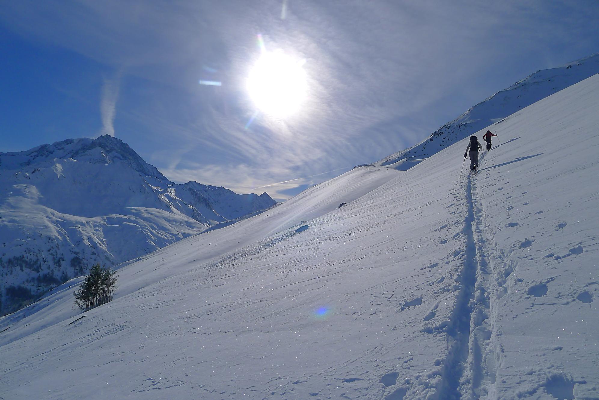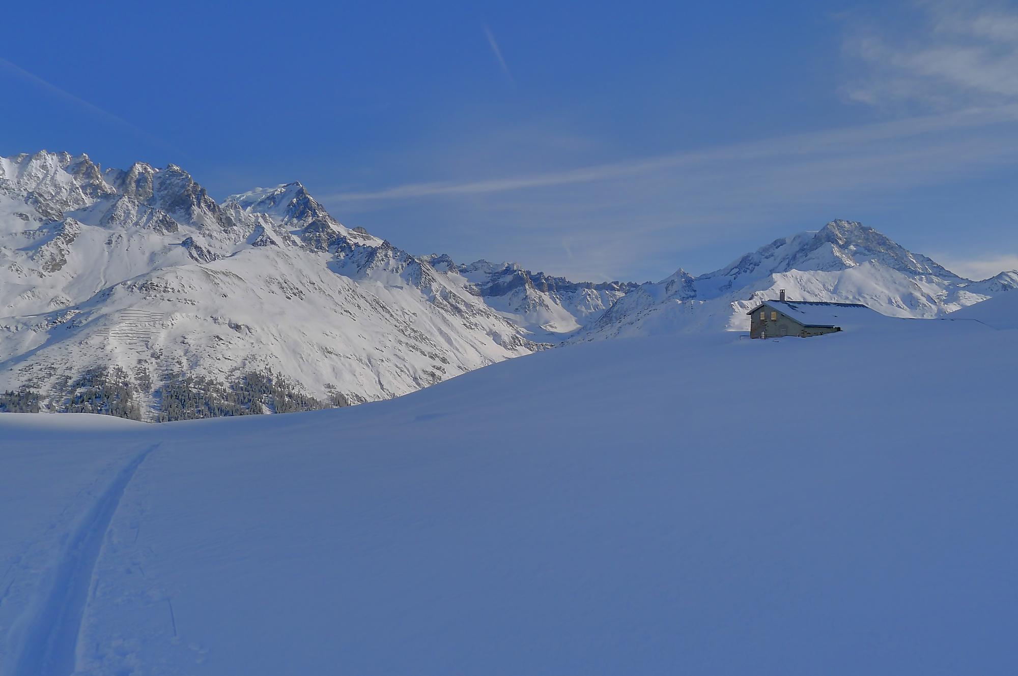Une petite pause sur le plateau puis descente à l’ombre pour traverser un ruisseau et repartir en montée au soleil dans la Chaux de Champ Long. C’est assez tranquille car la pente est inférieure à 30°. On rejoins sans soucis le vaste plateau sommital de Crêta de Vella (2519m). Le panorama est très agréable, nous sommes entourés de quelques 4000m et le paysage ratisse un peu en Italie, la France et la part du lion est en Suisse. La température est de -10°c, mais sans vent et au soleil, ce fut très agréable.