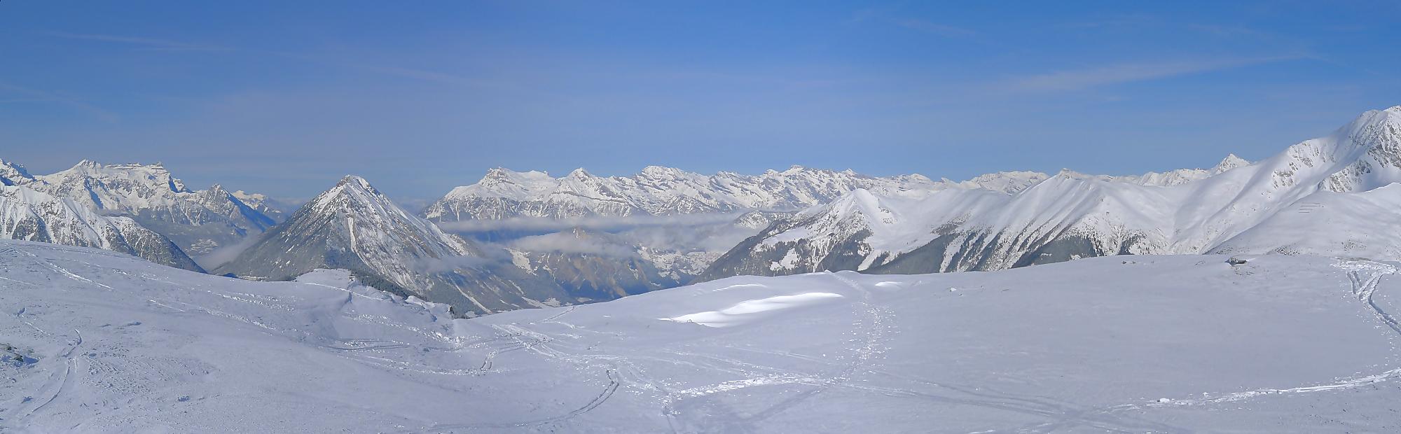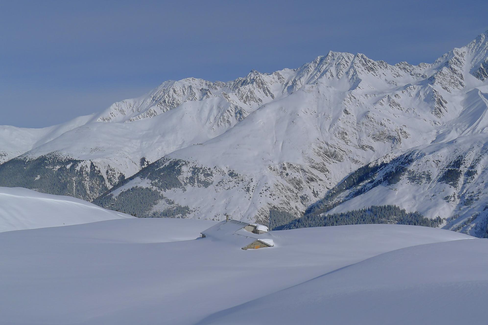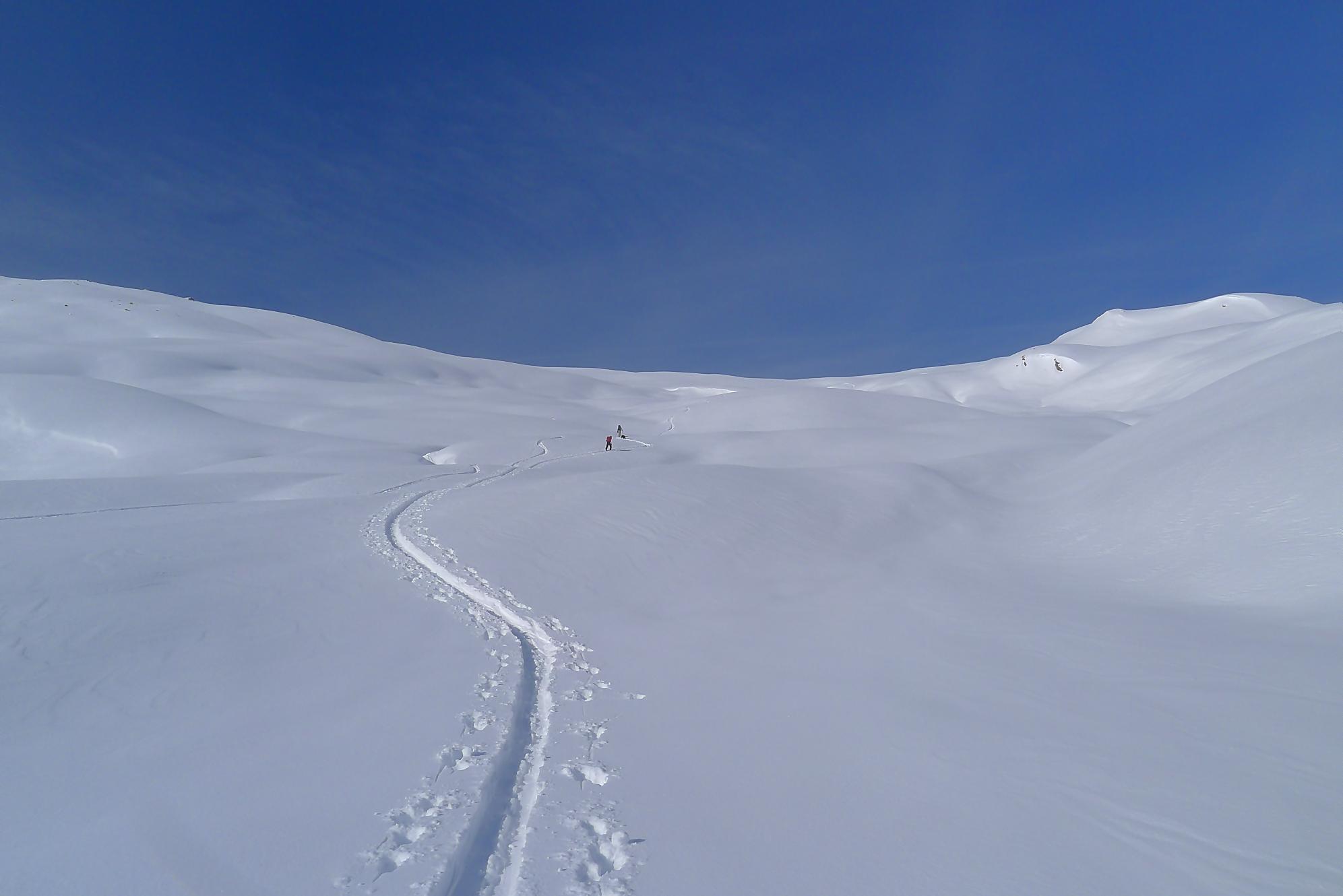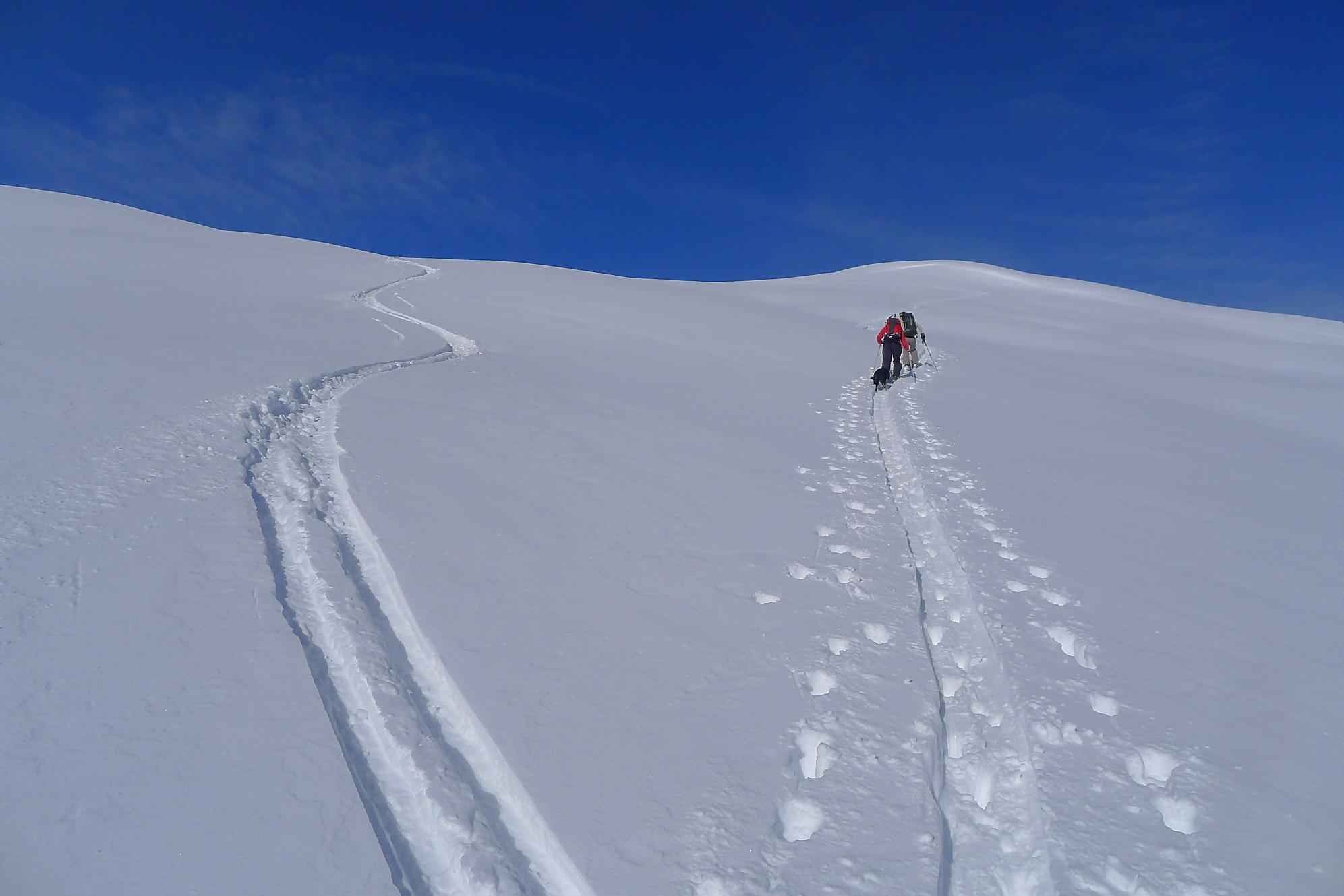 Une petite pause sur le plateau puis descente à l’ombre pour traverser un ruisseau et repartir en montée au soleil dans la Chaux de Champ Long. C’est assez tranquille car la pente est inférieure à 30°. On rejoins sans soucis le vaste plateau sommital de Crêta de Vella (2519m). Le panorama est très agréable, nous sommes entourés de quelques 4000m et le paysage ratisse un peu en Italie, la France et la part du lion est en Suisse. La température est de -10°c, mais sans vent et au soleil, ce fut très agréable.