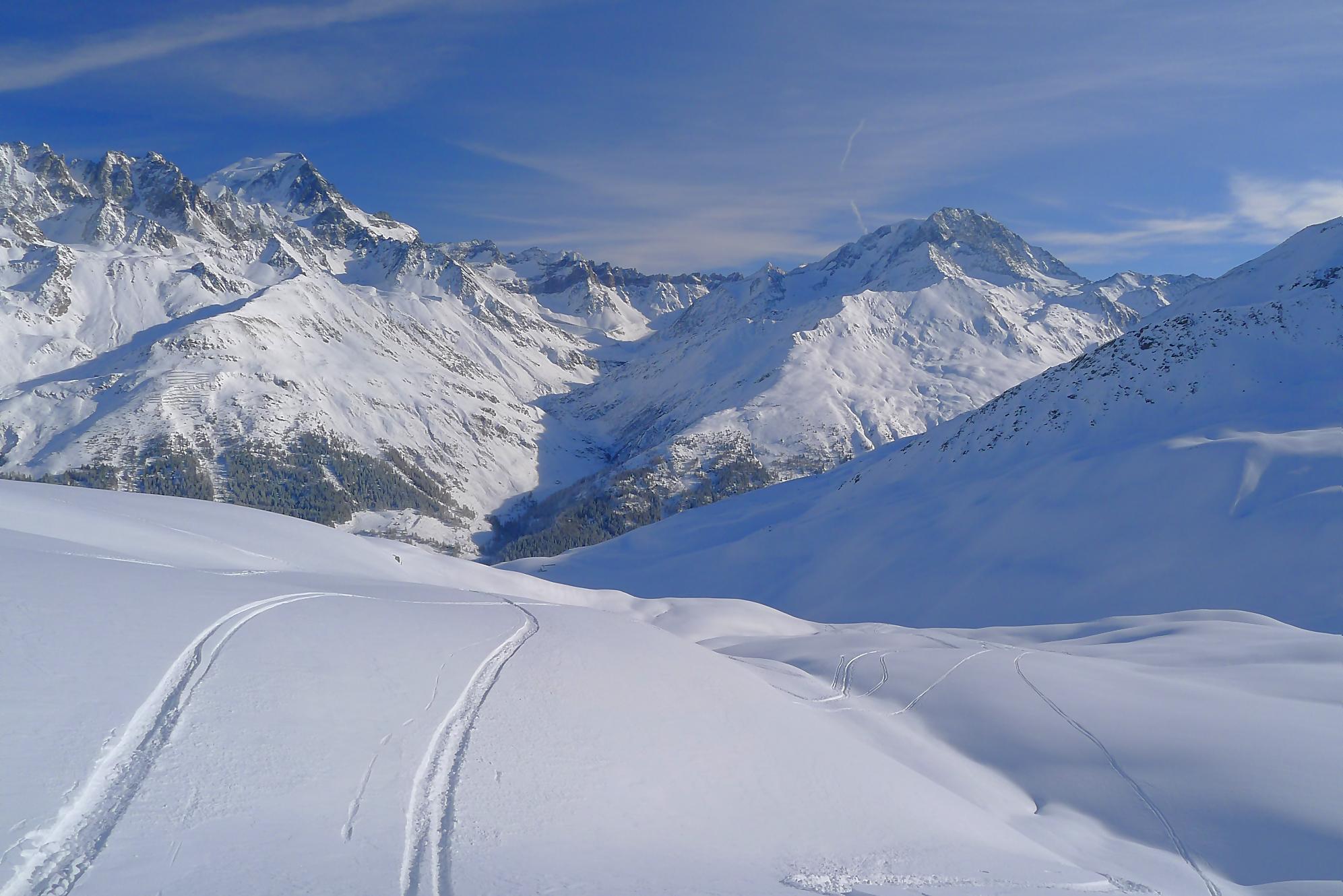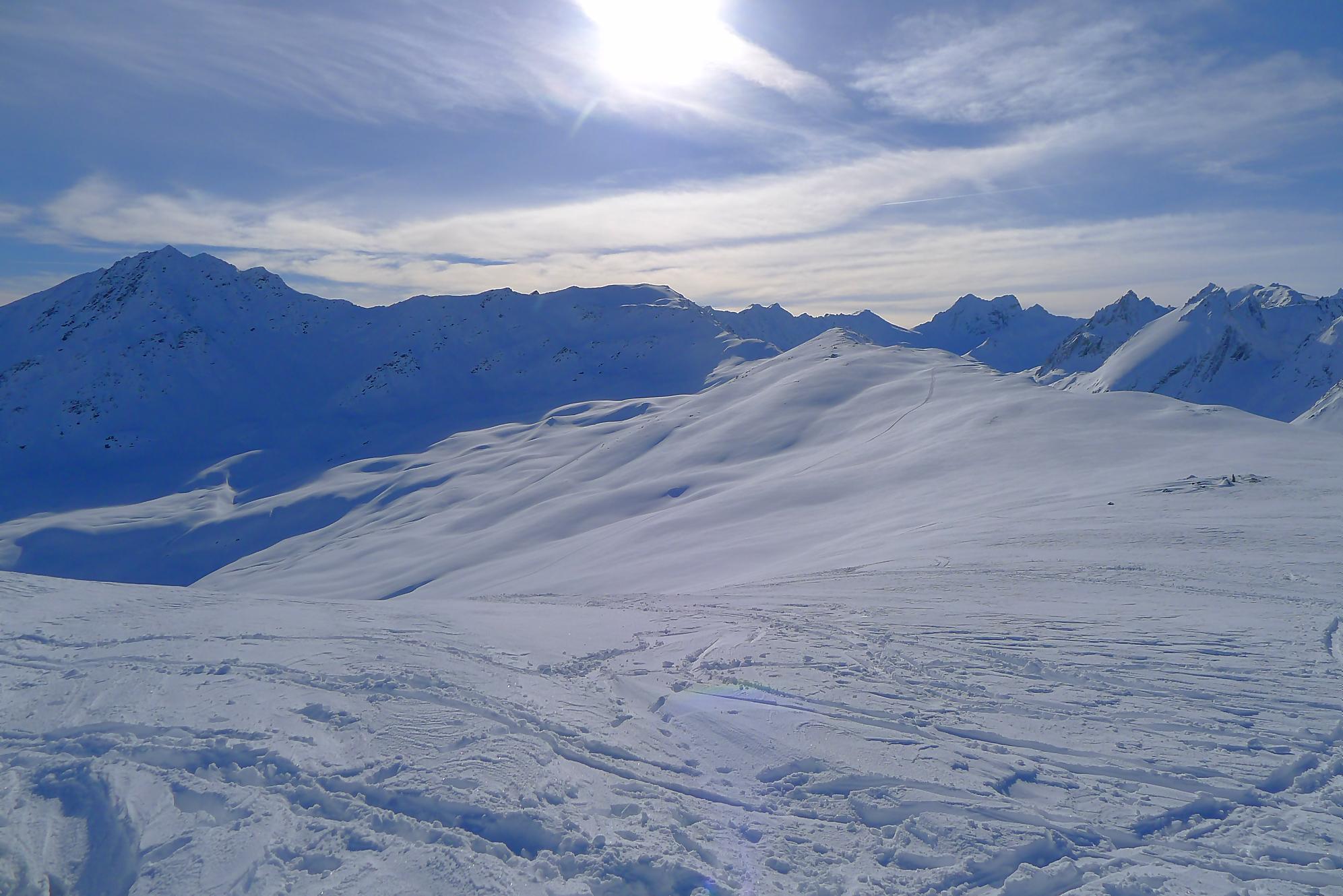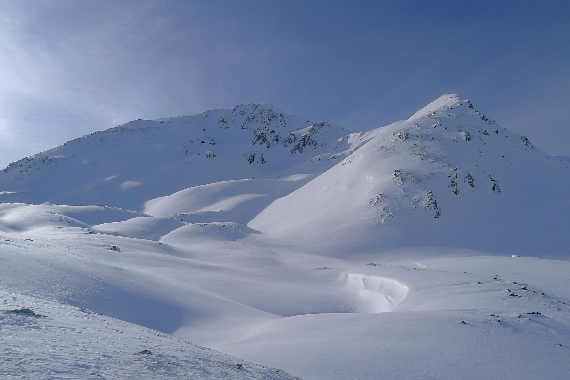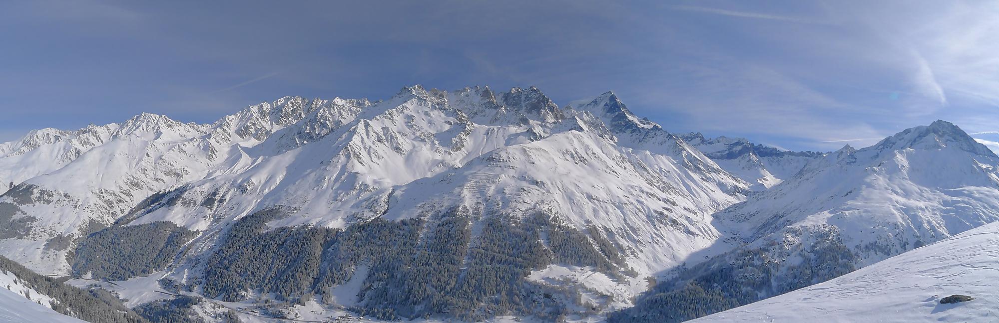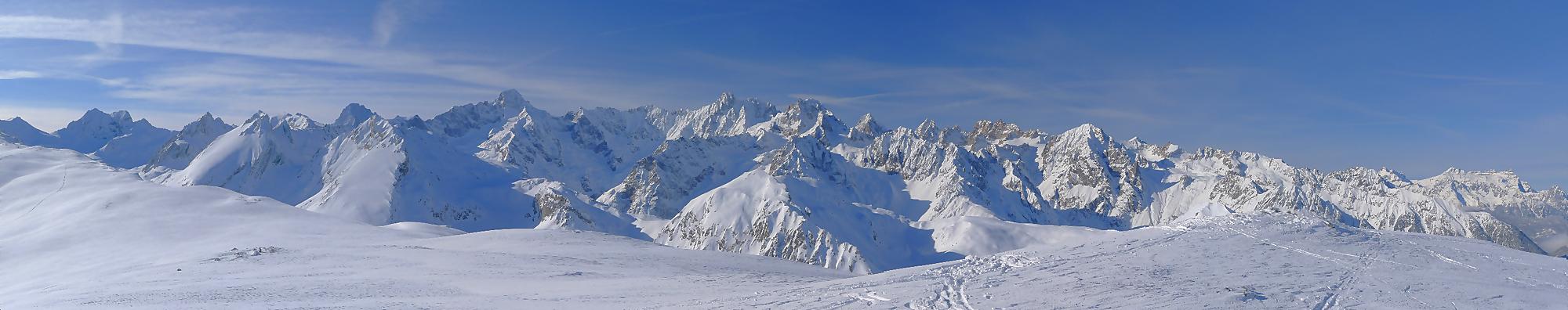 Une petite pause sur le plateau puis descente à l’ombre pour traverser un ruisseau et repartir en montée au soleil dans la Chaux de Champ Long. C’est assez tranquille car la pente est inférieure à 30°. On rejoins sans soucis le vaste plateau sommital de Crêta de Vella (2519m). Le panorama est très agréable, nous sommes entourés de quelques 4000m et le paysage ratisse un peu en Italie, la France et la part du lion est en Suisse. La température est de -10°c, mais sans vent et au soleil, ce fut très agréable.