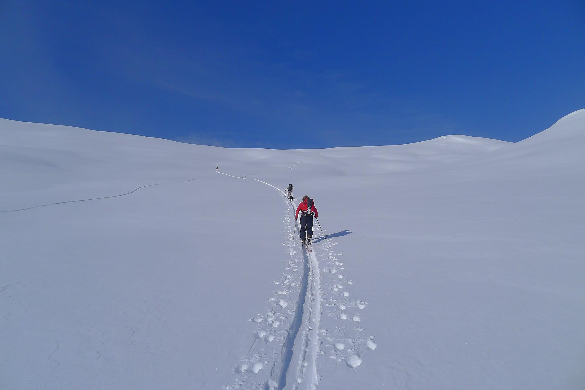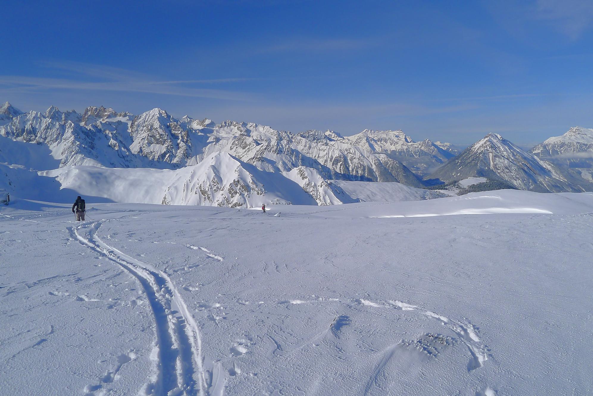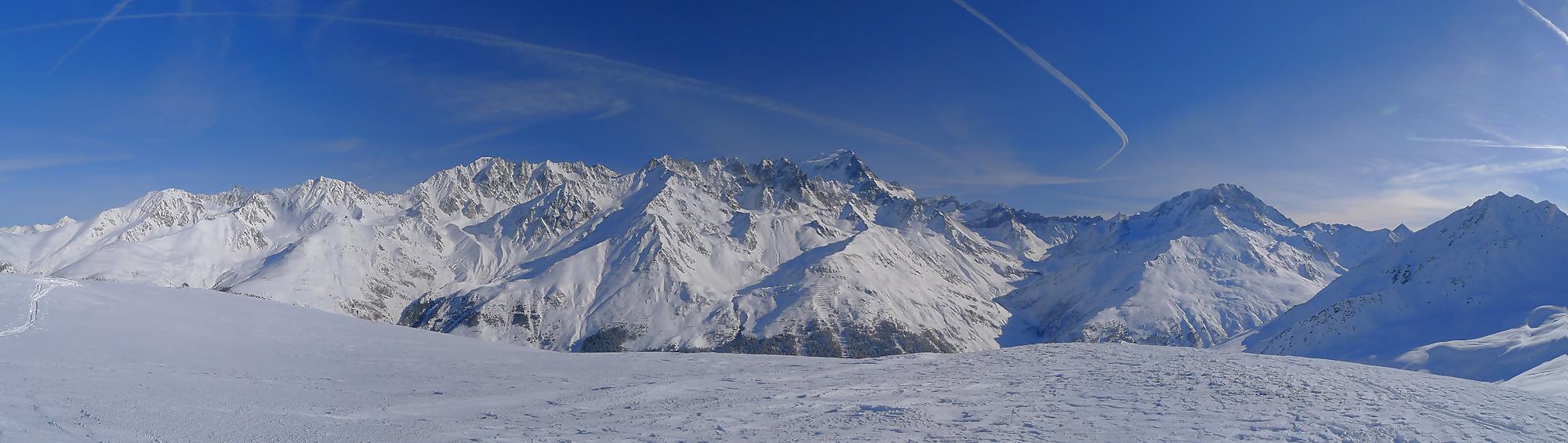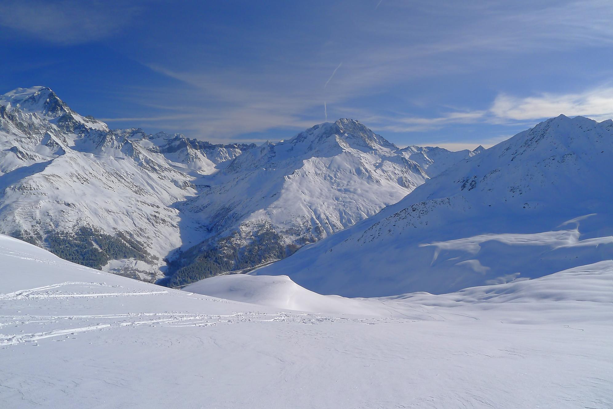 Une petite pause sur le plateau puis descente à l’ombre pour traverser un ruisseau et repartir en montée au soleil dans la Chaux de Champ Long. C’est assez tranquille car la pente est inférieure à 30°. On rejoins sans soucis le vaste plateau sommital de Crêta de Vella (2519m). Le panorama est très agréable, nous sommes entourés de quelques 4000m et le paysage ratisse un peu en Italie, la France et la part du lion est en Suisse. La température est de -10°c, mais sans vent et au soleil, ce fut très agréable.